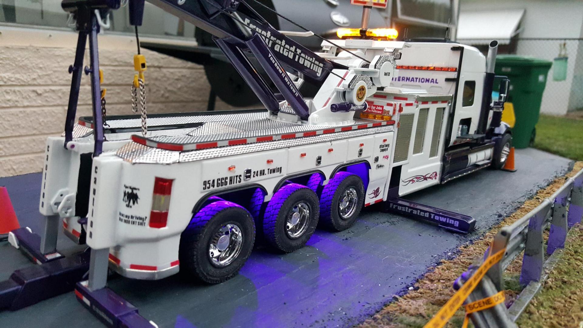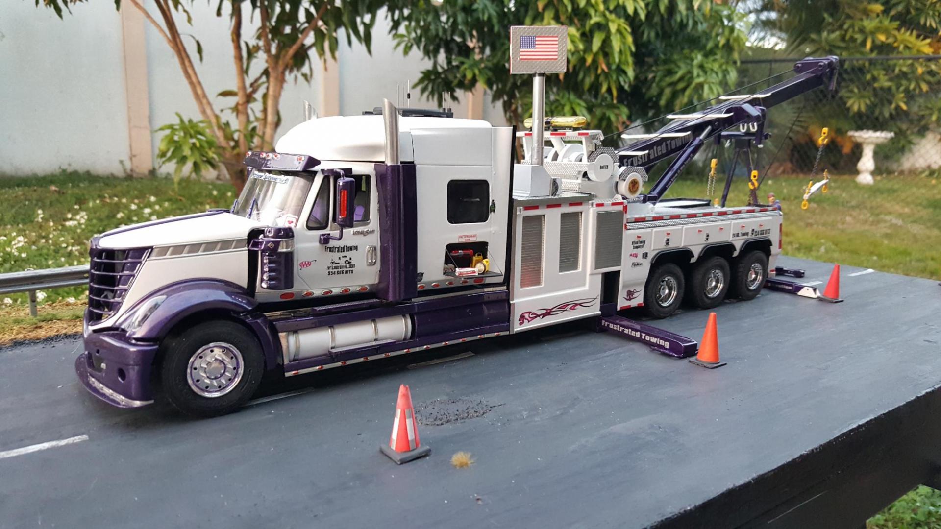 There is so much to this truck, I will try to get it all in. Kits:Moebius International Lonestar (Stretched)Revell Can Do Wrecker body (Modified)Figure is from INdustrial MechanicaGaurd rail is from ItaleriPaint:Plastikote PrimerTamiya Pure WhiteTamiya Pearl ClearTestors PurpleValejo black and purplesRichie El Jeffry Insane clear coatLights:Interior has 1 LED 9 Purple LEDS under the truckYEllow flasherNIghtscanWheels and Tires:All the tires and the front wheels are from Moluminum Jamie RahmoellerSpikes where added Interior:Everything but the kitchen sink. Including Nike box from Dig Derange Decals:I made all the Frustrated towing decals on an Alps printer.The Skulls are from a Revell impala kitMore info to come Lots Of Pictures