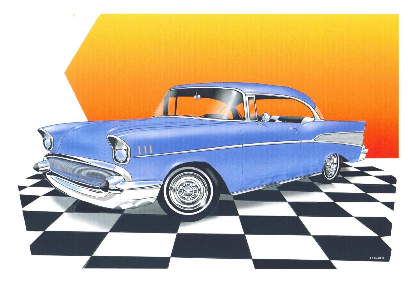 I noticed that no one has posted here for a while ,so I thought I would share a memory and post some digital artwork. Let's go back to about 1964 . AMT had released the first (and maybe the best) version of the '57 Bel Air. I was 12 years old ,and I knew how I wanted to build this. Unfortunately , I had budget restrictions - A 25cents a week - Yes, a shiny new quarter - allowance didn't go far, even then. Anyway,I shaved off the side trim,filled in the hood 'scoops' and removed the hood and deck emblems. Did I mention I was on a budget? My brother was working on a Pontiac at the time,and he painted the Chevy for me. Pontiac engine light metallic blue. Yes,engine paint.. A nice ,flat,grainy engine paint. Oh well. I had a set of Ala Kart wheels ,and skinny whitewalls to put on it,so that helped a little. The 409 ,with the supercharger was installed. I loved the chrome suspension on this. The interior had the seat inserts painted dark blue with my little,shaking hands,plus the little alligator on the rear package shelf. Oh,and I used the Buick grille. Such was my masterpiece. I don't remember what happened to it,but it must have gotten thrown out at some time. That's the way of youth. Fast forward to present day , well,a few years ago,and I created this using PSP7. This was the image that was in my childish brain. What I wanted it to look like. Except for the side trim - I don't know what I was thinking then. Live and learn,I guess. I hope you like it.