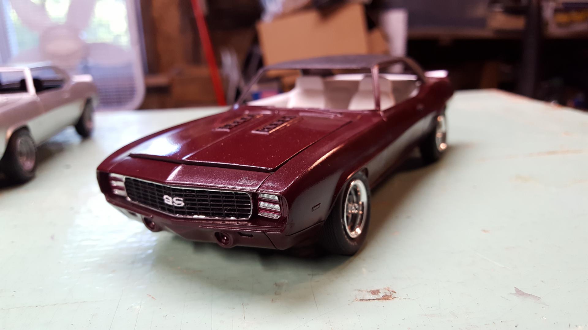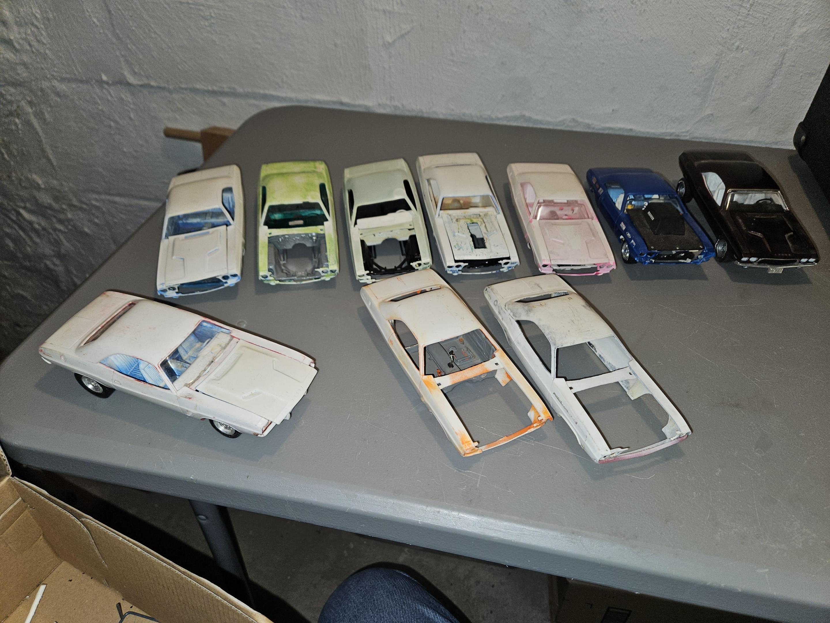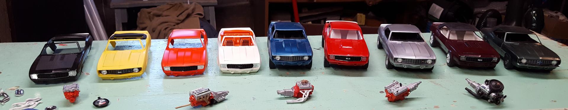 New approach- took all the Revell '69 Camaros I had accumulated off the shelf and pretty much started them all at once - Black RS/SS convert, Yellow SS convert, Hugger Orange RS Z/28, Pace Car convert, Blue Yenko SC, Red Baldwin Motion, Silver Z/28, Maroon RS/SS396, Green ZL-1