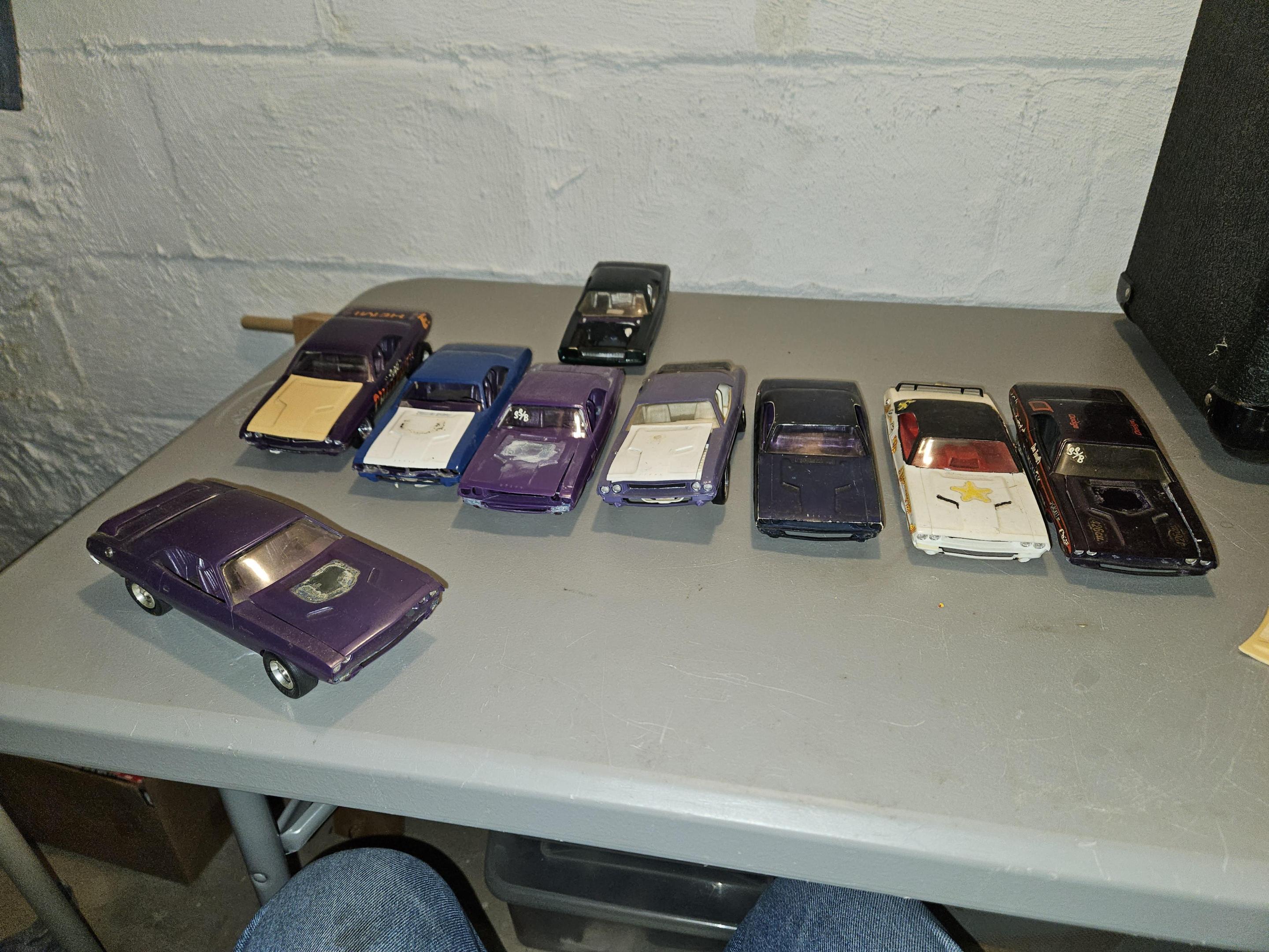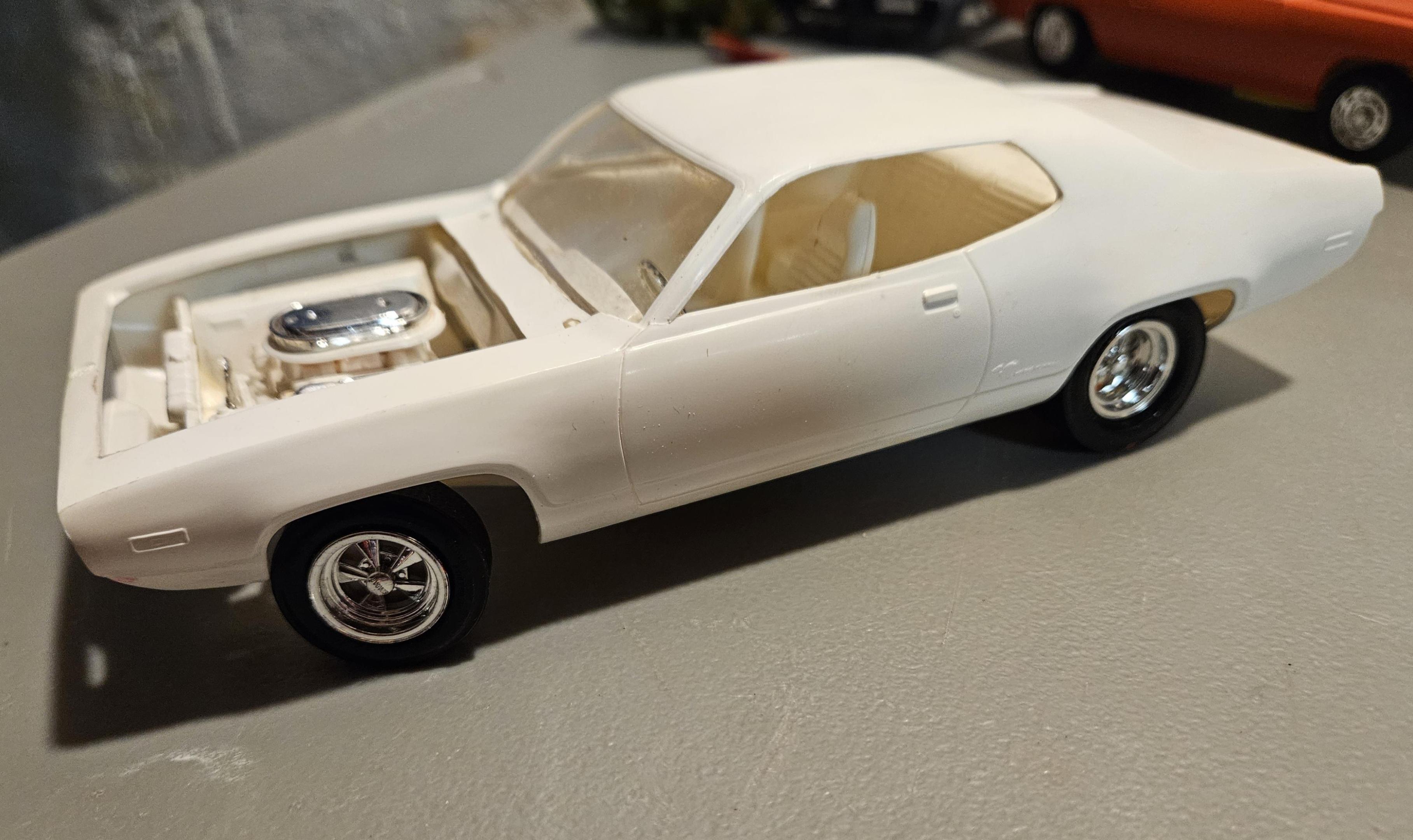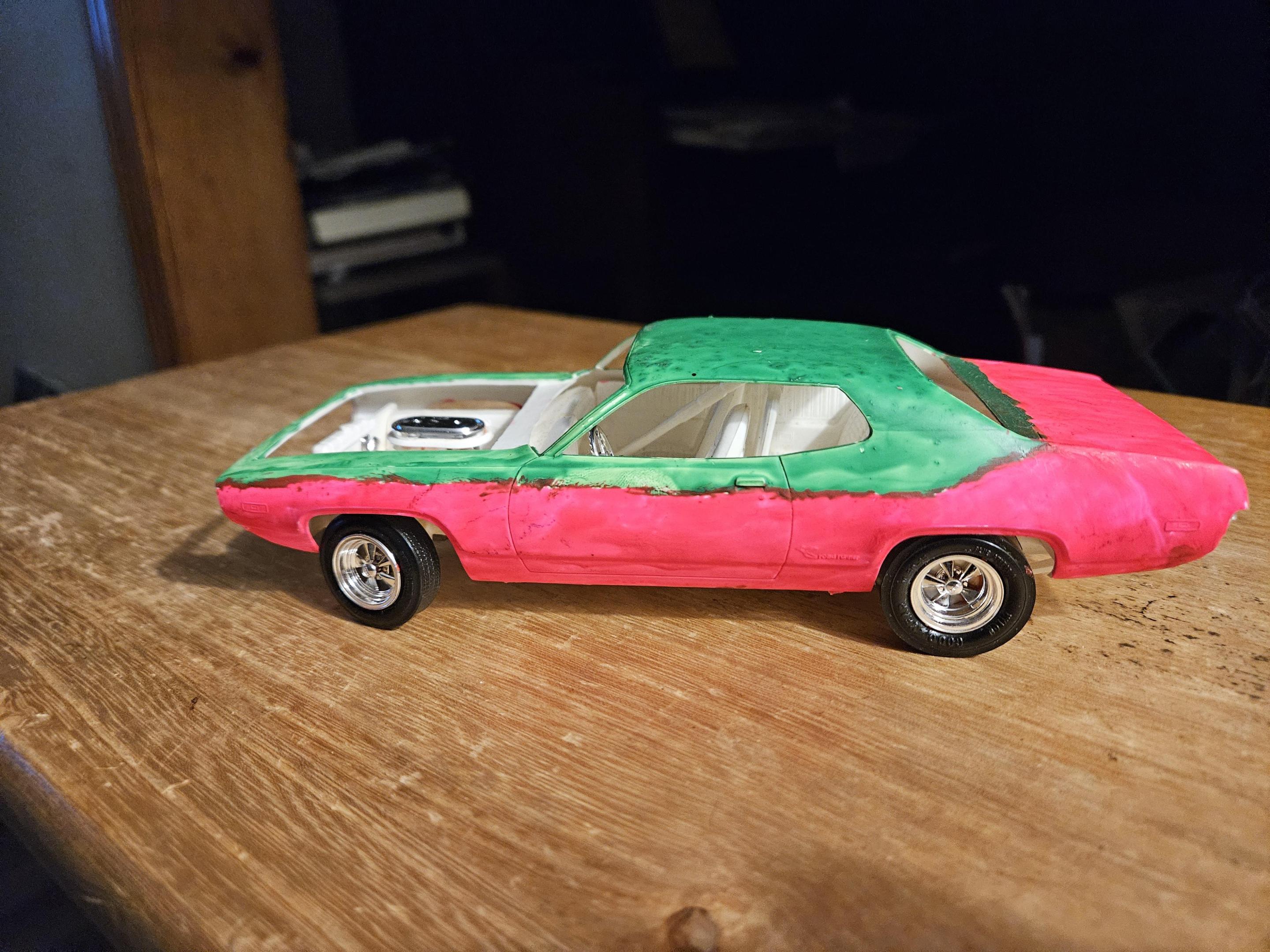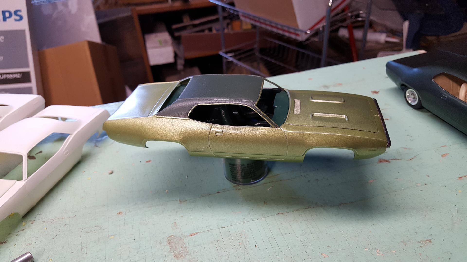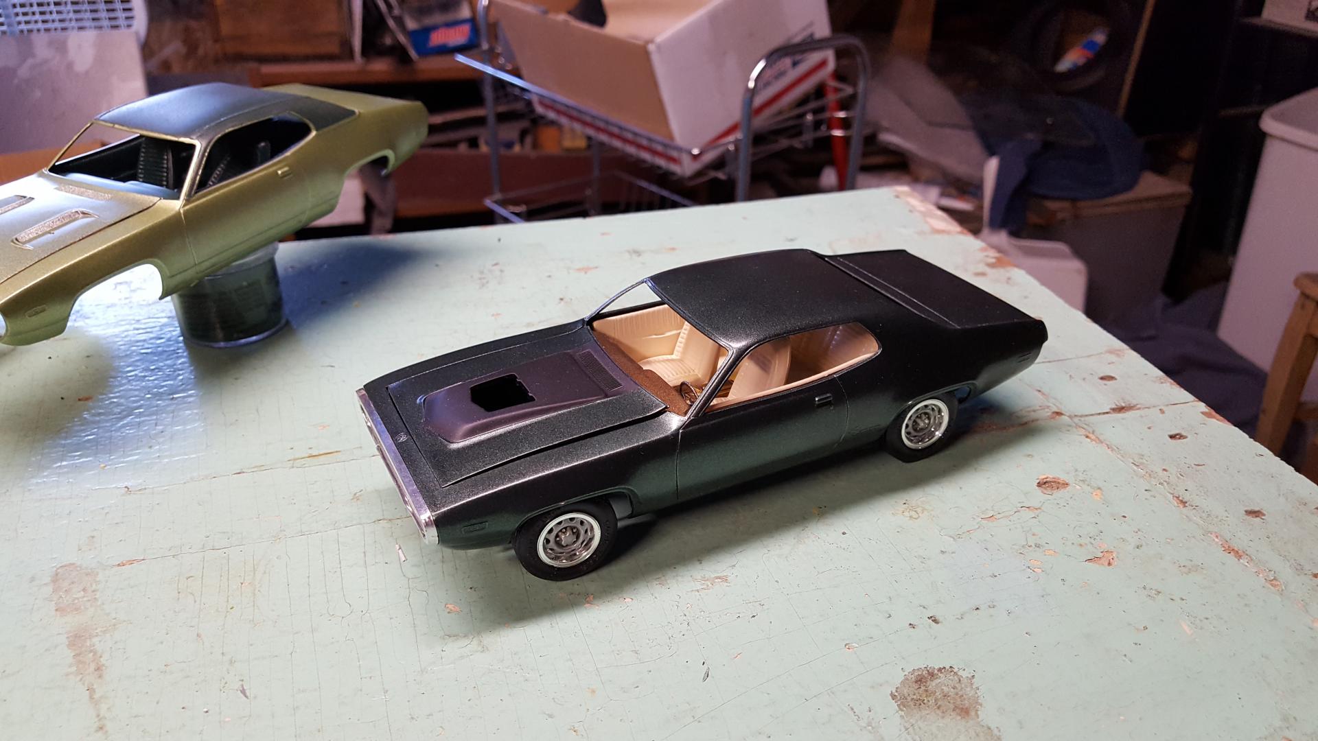 Mock ups of a couple in progress MPC '72 Road Runners..... Using AMT Charger chassis for each, planning on gold strobe stripe, 440 4 speed and Dana from Revell 69 Charger for dark green- 340 4 speed and magnum road wheels on light green. Looks like I made top trim a bit wide