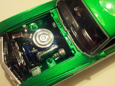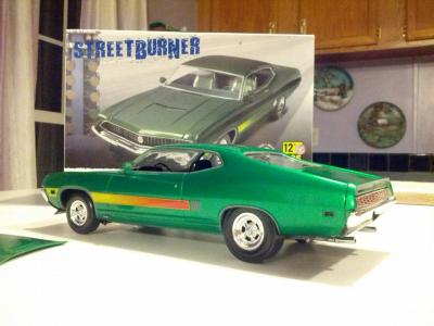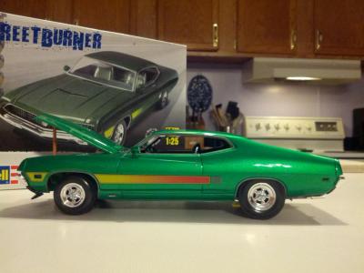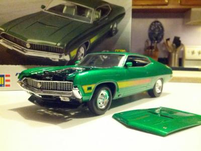Hey guys. Just completed the Revell '70 Ford Torino. I was really excited about building this after Model Round-Up annonced this kit. I airbrushed the body with metallic green and several coats of clear. The kit did have several minor fitting issues that were a little aggrevating, but where relatively easy to overcome. First off, the directions wanted you to cut holes in the chassis to connect the muffler. The rear leaf springs absolutely will not fit into the slots provided if you assemble them by the directions. I had to reverse the direction of them, which then misaligned the passenger tires in the rear wheel-well. I then had to heat the rear axle to properly position the center of the hub. The holes in the wheels for the axle hubs were too small and had to be trimmed. The grille does not want to line up correctly on the front end due to the housing that goes around it. And the chrome door handles had so much excess flash around them that they crumbled in my hands when trying to remove it. The metal trim that goes on the car bends very easy and is very challenging to position on the car. It would take a better builder than my skills to pull off positioning the rocker panel trim. I only used the tailight screen and grille badge. The rest, I stayed away from. Seemed like a recipe to really piss me off. I'm pretty happy with the way it turned out, although it could have been better. I just took my time on it, working on the kit here and there a little at a time over a month. That seemed to work out better for my patience. Thanks for looking.