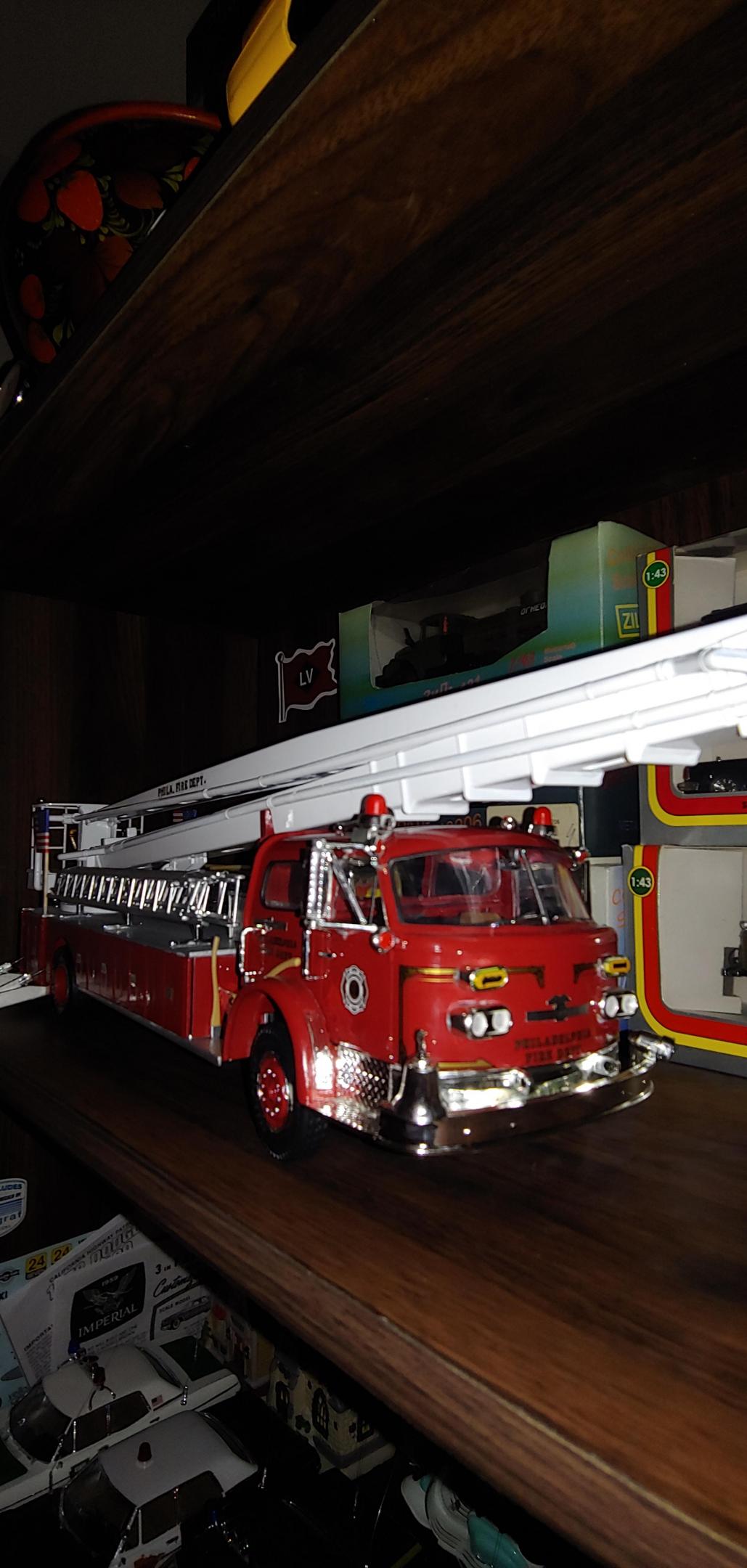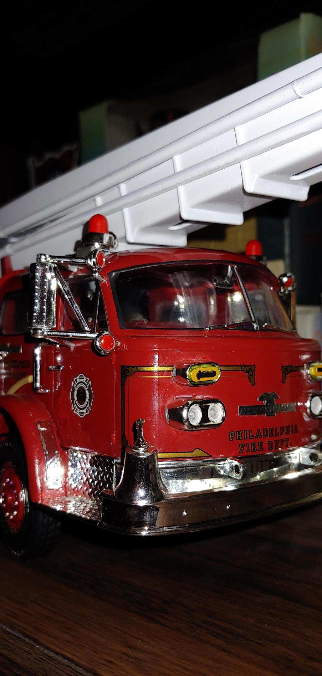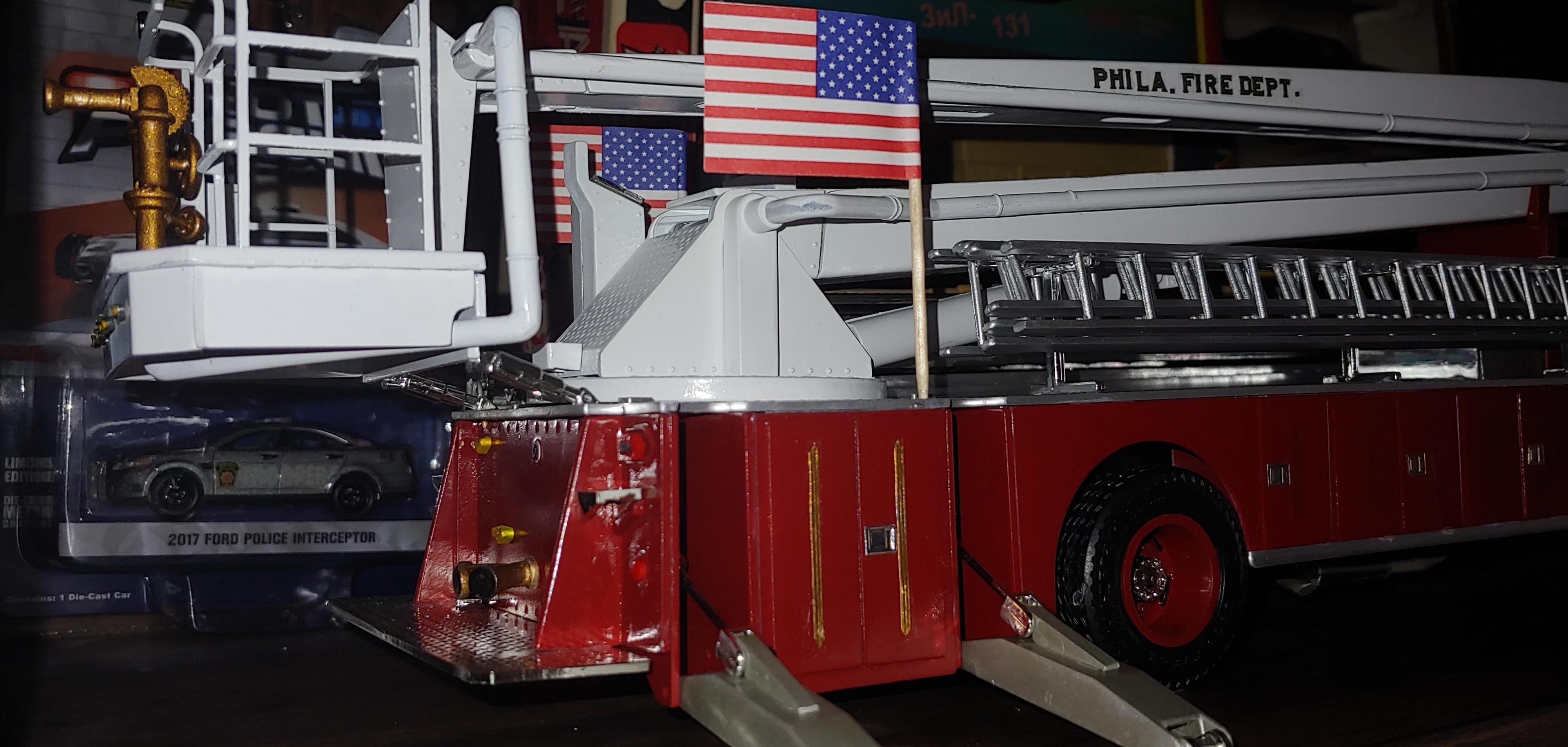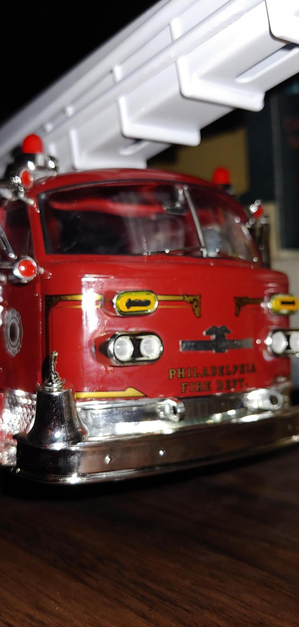 Took about a month to finish all box stock and rustoleum paints as well as testors to airbrush small parts, very hard kit in terms of fitment I did not glue the cab or anything not many parts had mounting points so I made them with a small drill and copper wire. The basket brackets would not glue on otherwise. Decals are done letter by letter I did my best but I know they are a little twisty. The smaller phila decals are custom and fall apart in seconds but I still got them on. Perhaps it's not entirely historicaly accurate, I certainly wish there was more fire truck choices. The German ones are gonna be my next build.