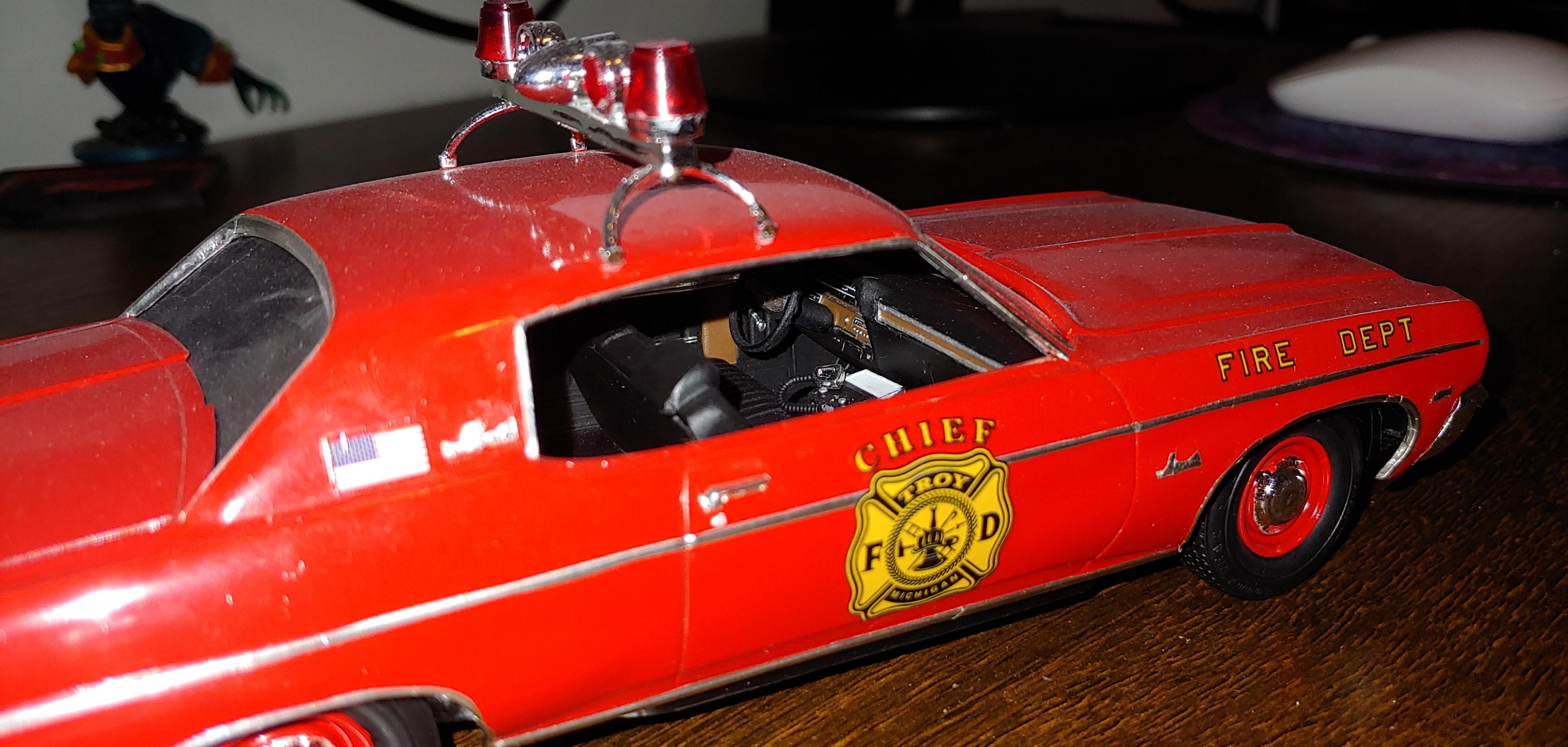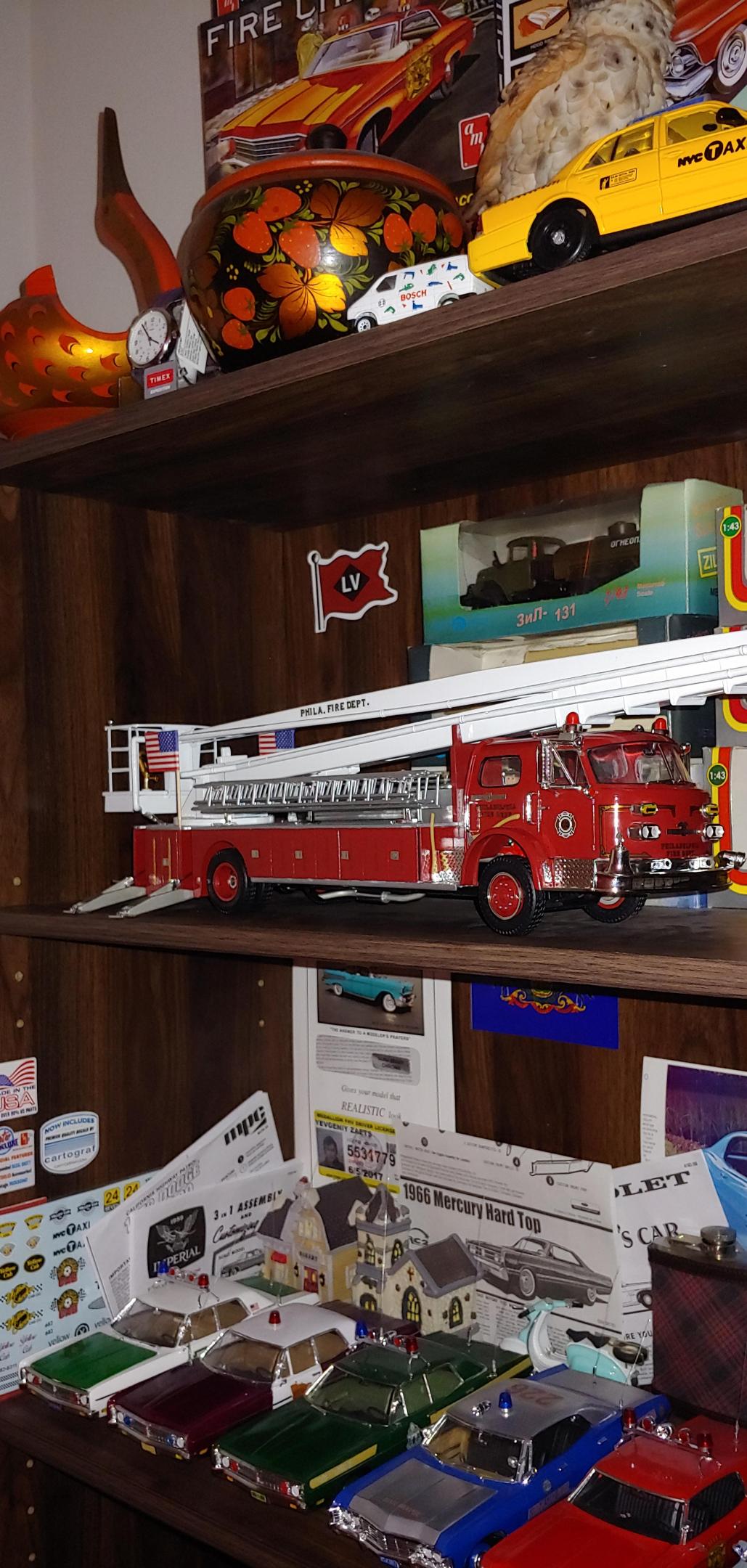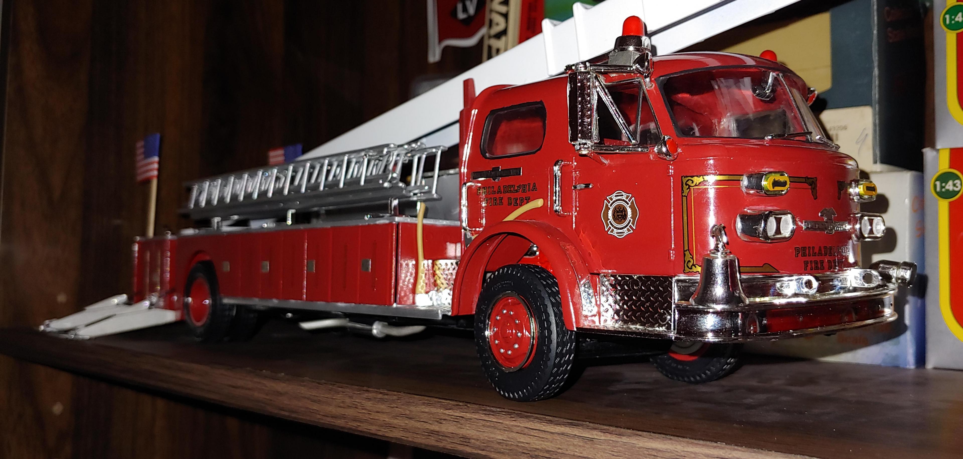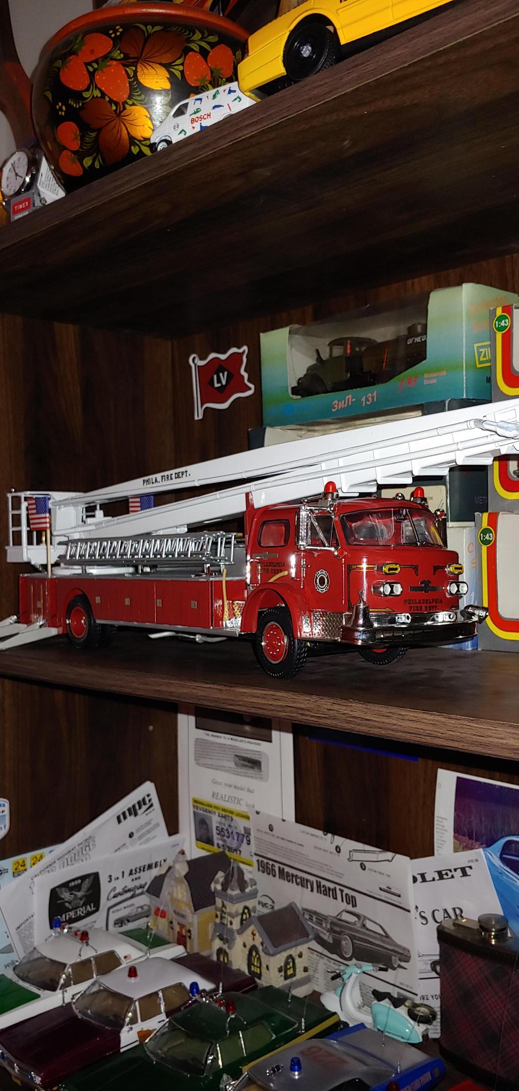 Took about a month to finish all box stock and rustoleum paints as well as testors to airbrush small parts, very hard kit in terms of fitment I did not glue the cab or anything not many parts had mounting points so I made them with a small drill and copper wire. The basket brackets would not glue on otherwise. Decals are done letter by letter I did my best but I know they are a little twisty. The smaller phila decals are custom and fall apart in seconds but I still got them on. Perhaps it's not entirely historicaly accurate, I certainly wish there was more fire truck choices. The German ones are gonna be my next build.