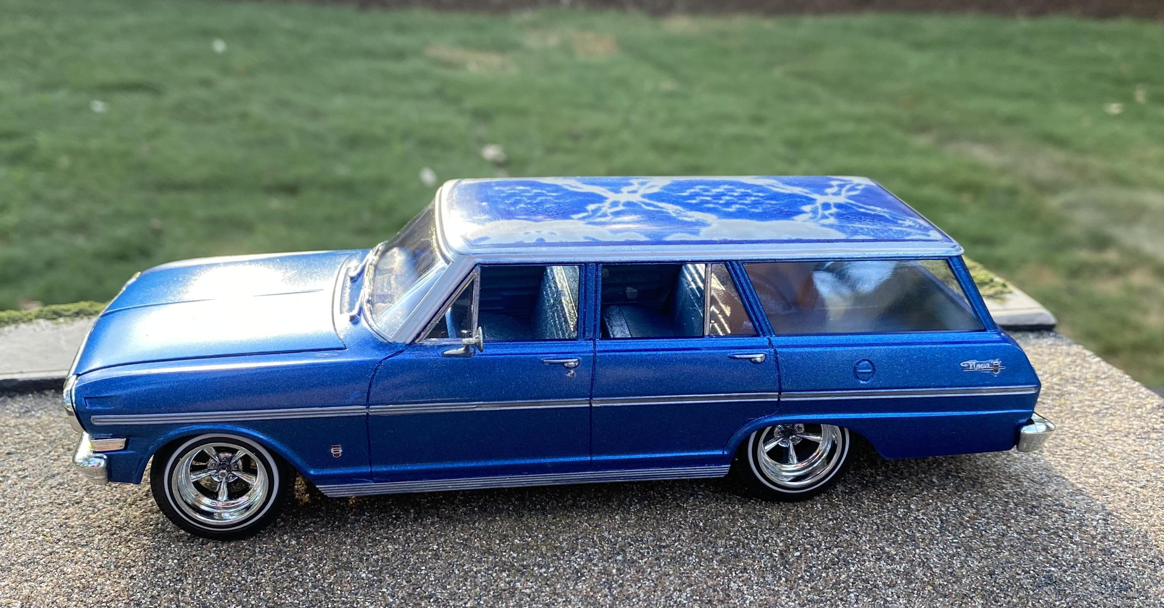 It took me longer than I intended but this was a fun little build. Ever since this kit came out I thought it would make a good lowrider. Astro mags from Pegasus but otherwise OOB. I wanted to play with the lace effect on the roof. It’s not perfect between my overpolishing and repeated masking jobs but it looks the part.
