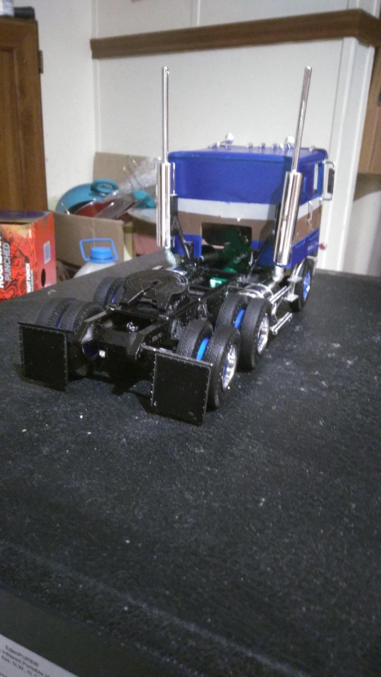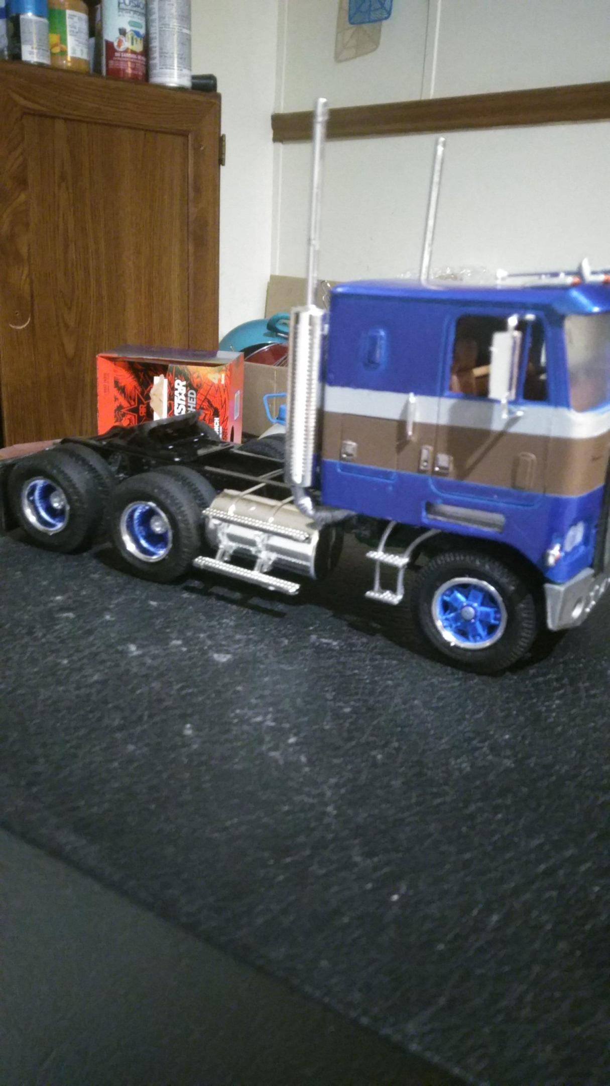 This Diamond Reo shines better than she did before. Ok sorry about that old song reference. What we have here is a resin Diamond Reo cabover. Probably not gonna see many of these with the closing of Keystone's. As you can see it's three different colors. The blue is Testors Star Spangled Blue, the gray is actually a fluke in where the tape was wider than I thought so the primer stripe was born. The brown is Tamiya dark earth. The frame engine and wheels are from a GMC Astro 95. The tanks are from an Italeri Australian Western Star.