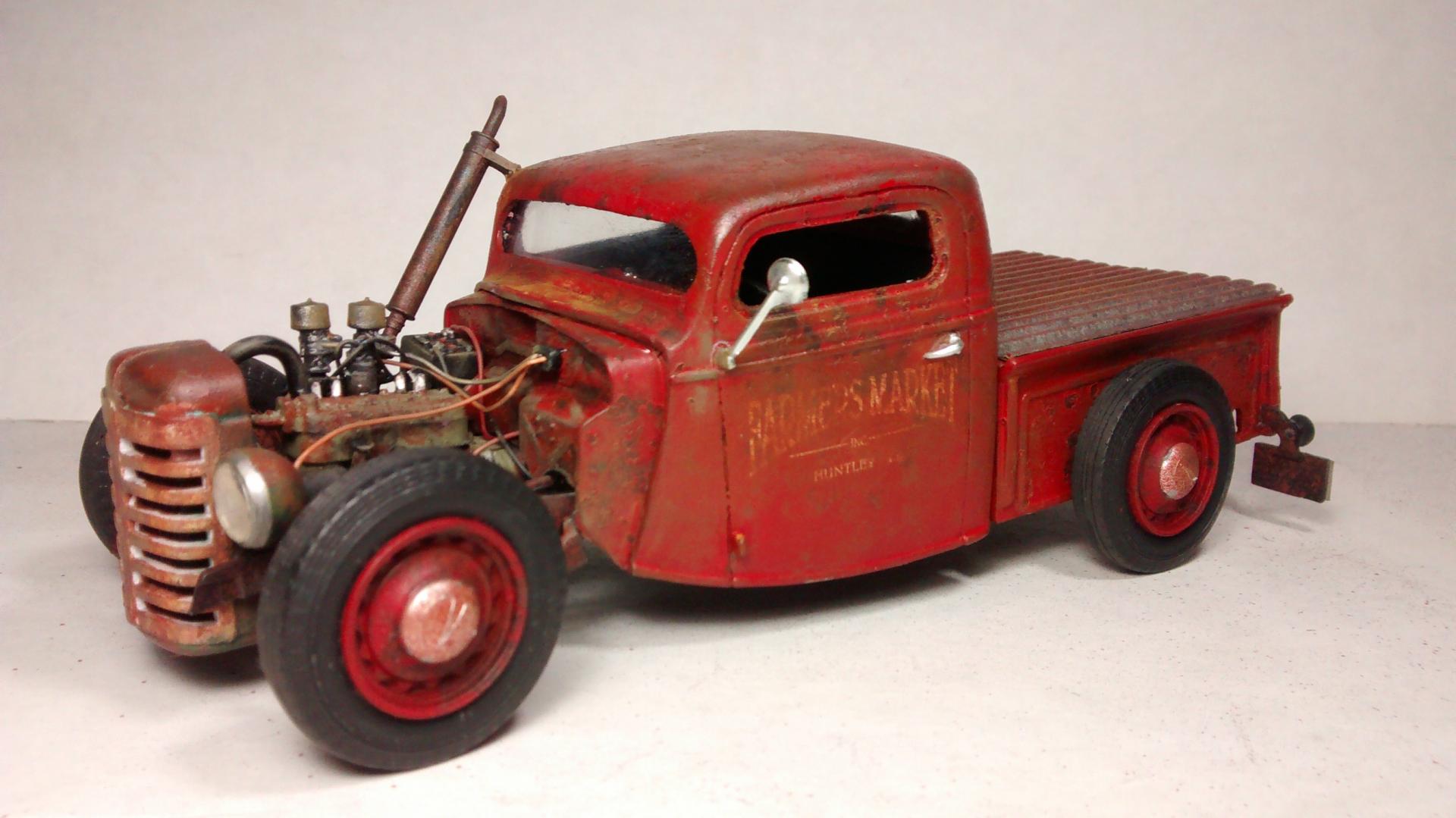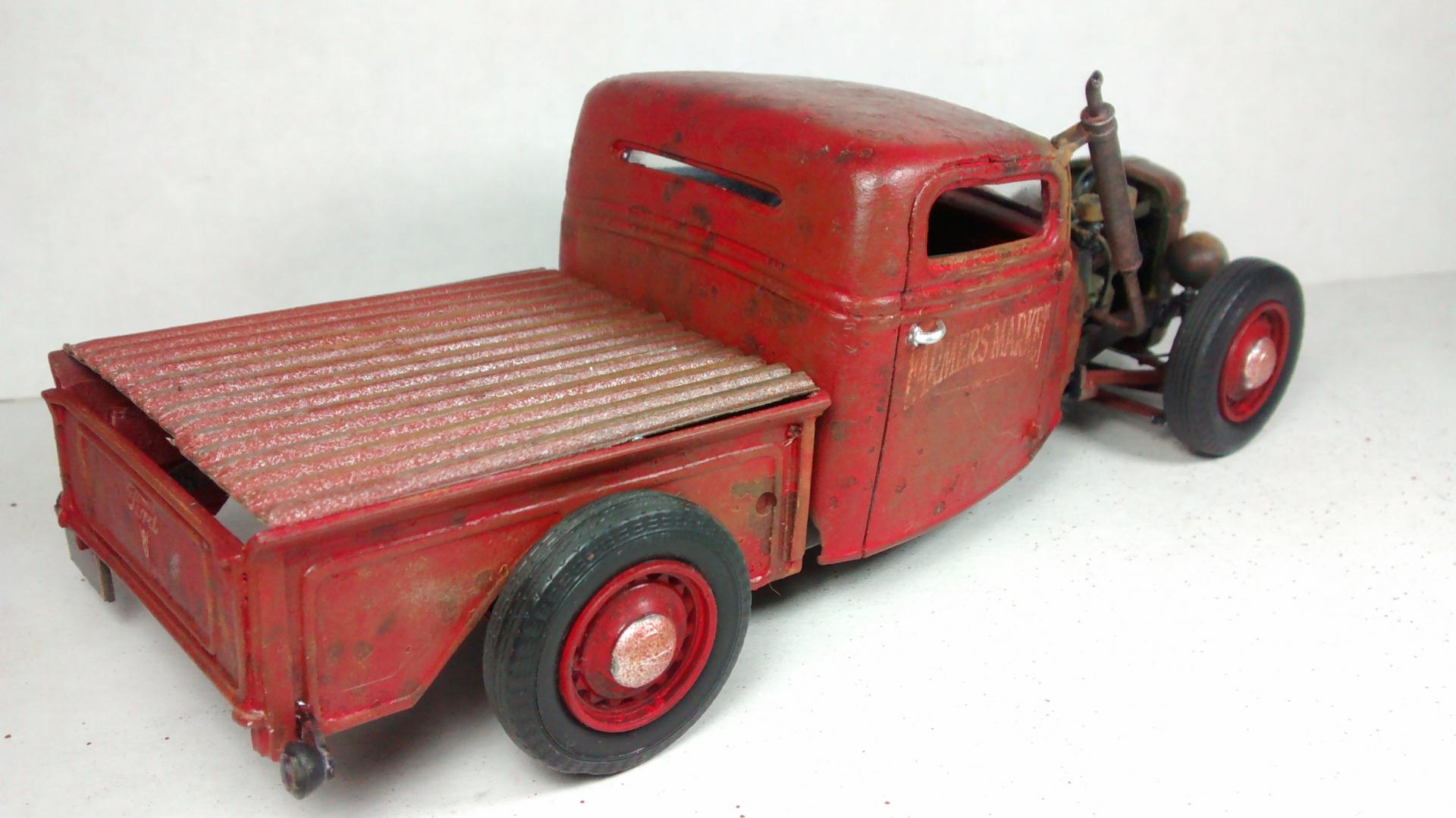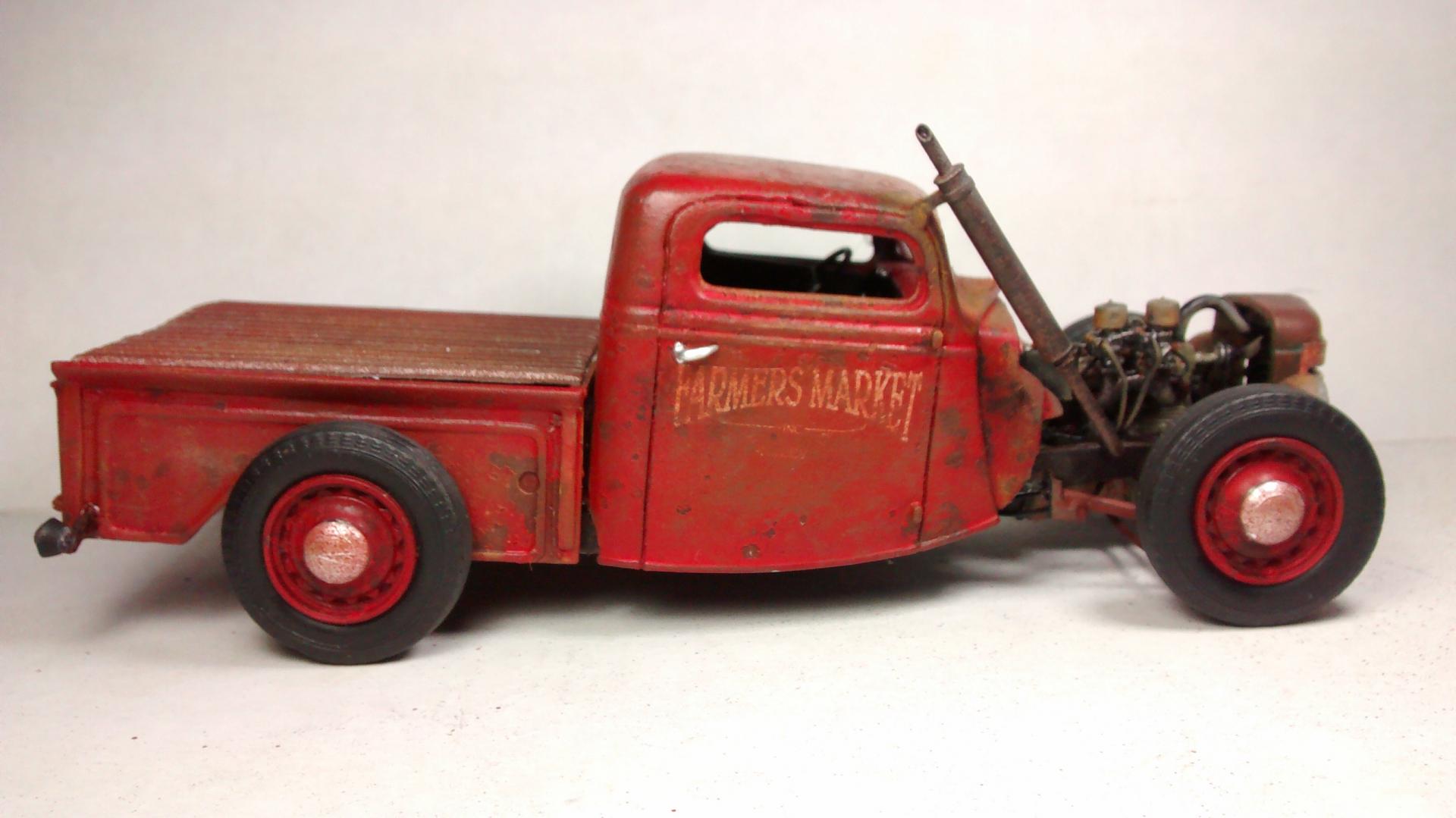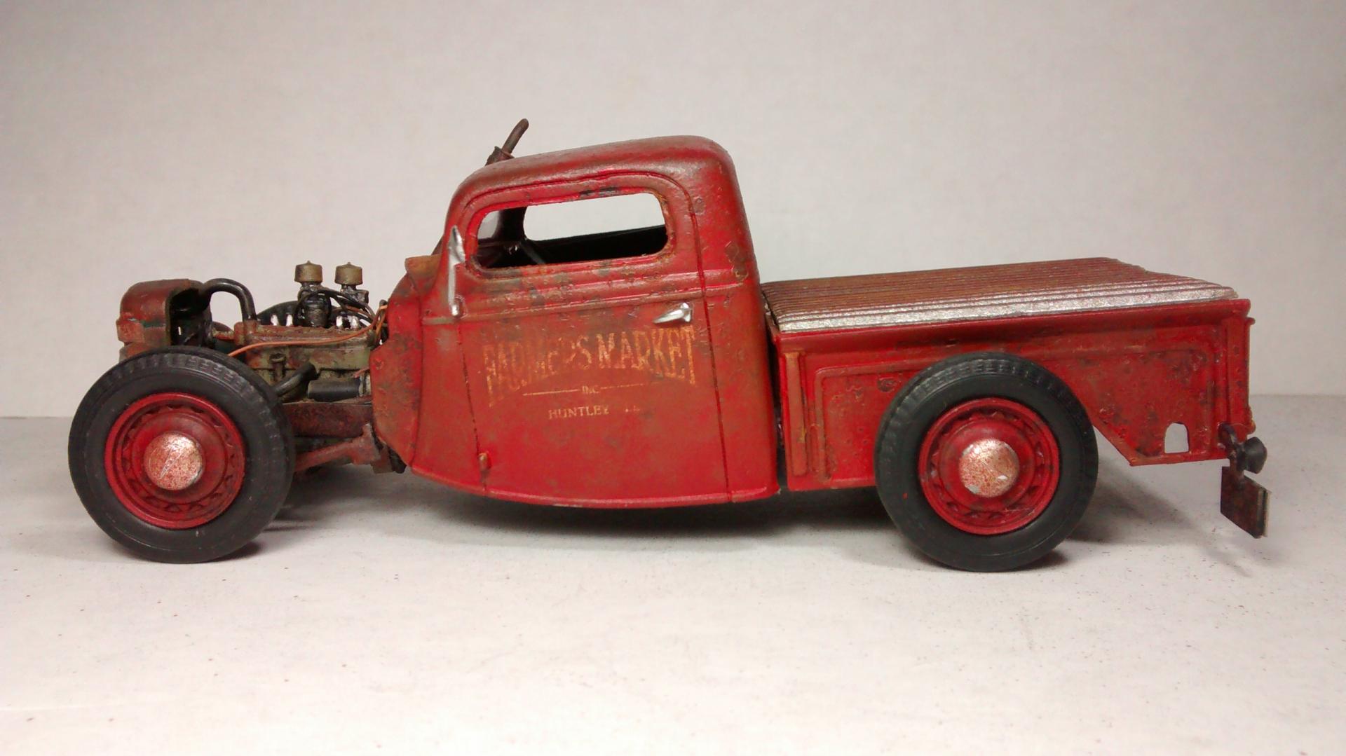 This project was recently done for a "rat" group build. It started out as Revell's 37 Ford pickup, then slowly morphed into the build you see here. The idea was that a farmer left his old pickup in a barn for parts after buying himself a nice, new '56 to use for the next twenty years. Fast forward to the present day, his grandson asks what he's going to do with that old, stripped down pickup that Frank the barn cat has been using as a litter box. After explaining that he wants to learn to do custom body work, his grampa gives him the go ahead to start chopping it up in the garage. Armed with nothing more than a cutting wheel, torch, and welder, he starts chopping into the old wreck using tips from some old magazines for guidance. We'll start with the easy stuff, bobbing the box. After a quick confidence boost, he decides to try channeling the body, z'ing the frame, and the last daunting task of chopping the top. With all of that hard work behind him, it would be a shame to not get it running. The only problem is, the V8 found it's way into a tractor back in '54. Luckily, there is an old engine from a 29 Ford pickup stashed away in the corner of the barn, and all it needs is an intake. The old 4 banger is hardly a speed machine, but an old two carb intake from a swap meet should make a bit of difference. Now for the finishing touch... the grill. Since the old painted lettering survived over the years, and the truck was his grandfather's trusty pickup for two decades, the grandson decided to pay tribute to his grandfather's farming heritage by sticking a grill from an Oliver tractor up front and a piece of old tractor shed on the box for a bed cover. Turns out Gramps isn't a fan of the lack of leg and headroom, but seeing what used to be his pride and joy back on the road after 60 years and his grandson's hard work pay off was enough to put a big smile on an old man's face.