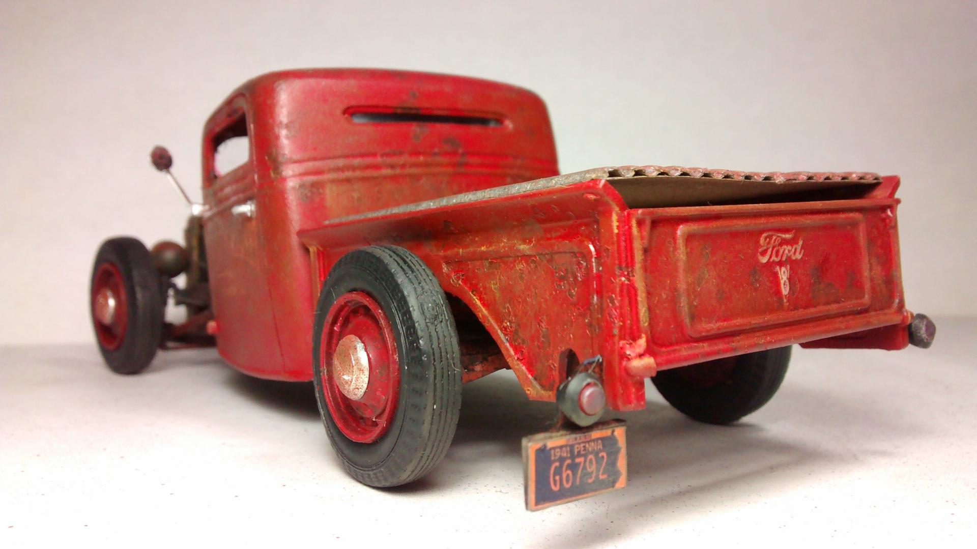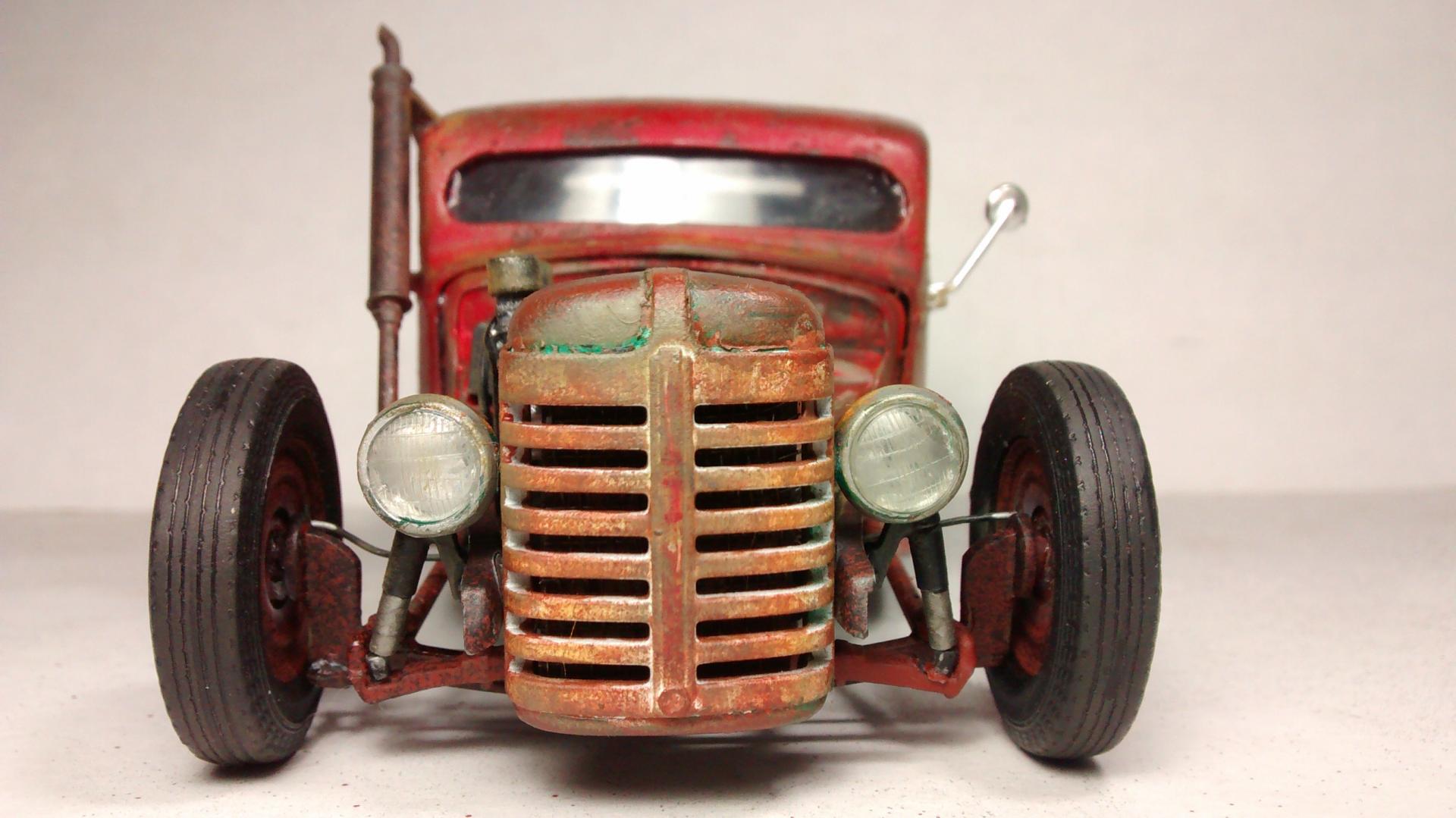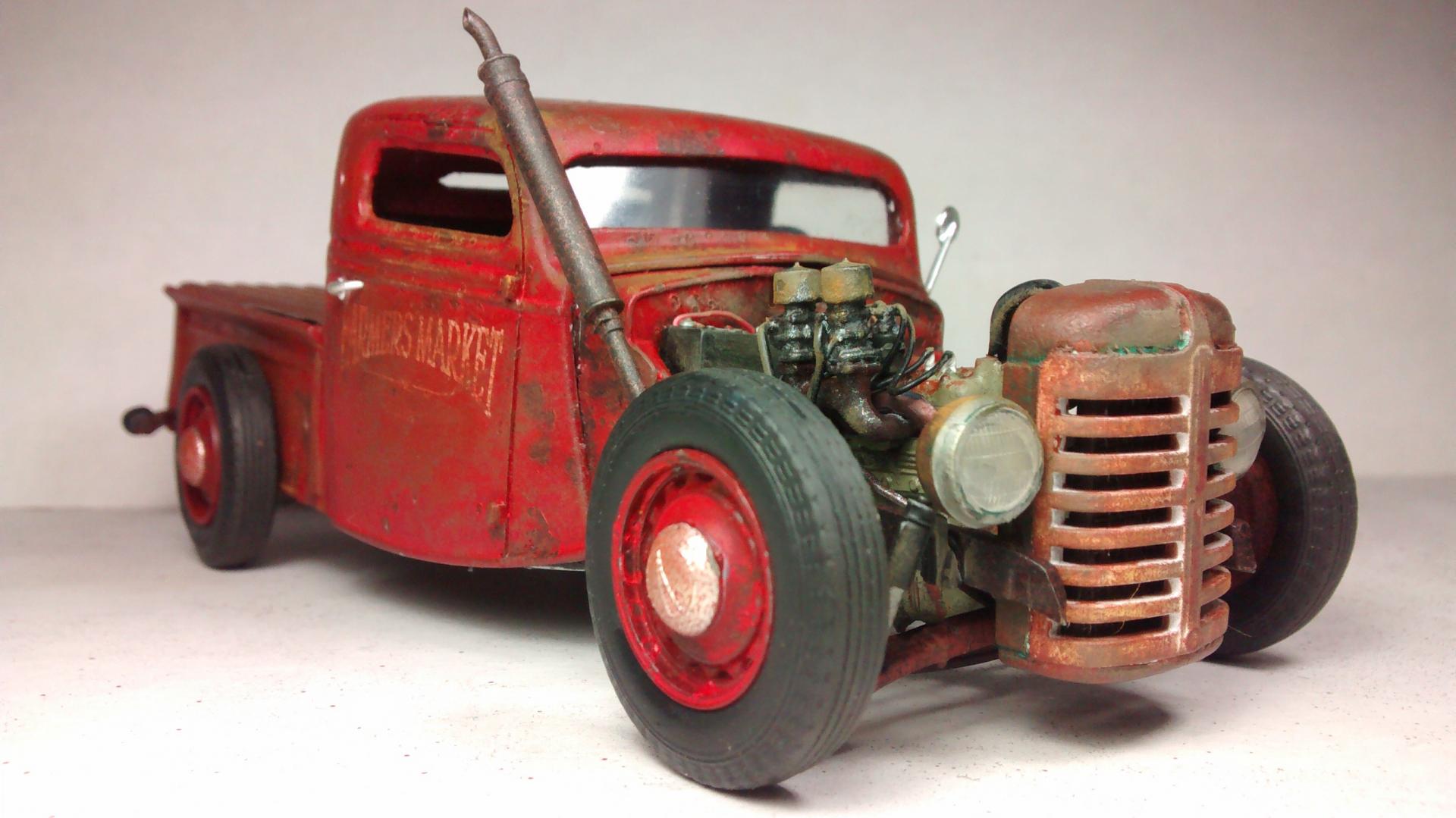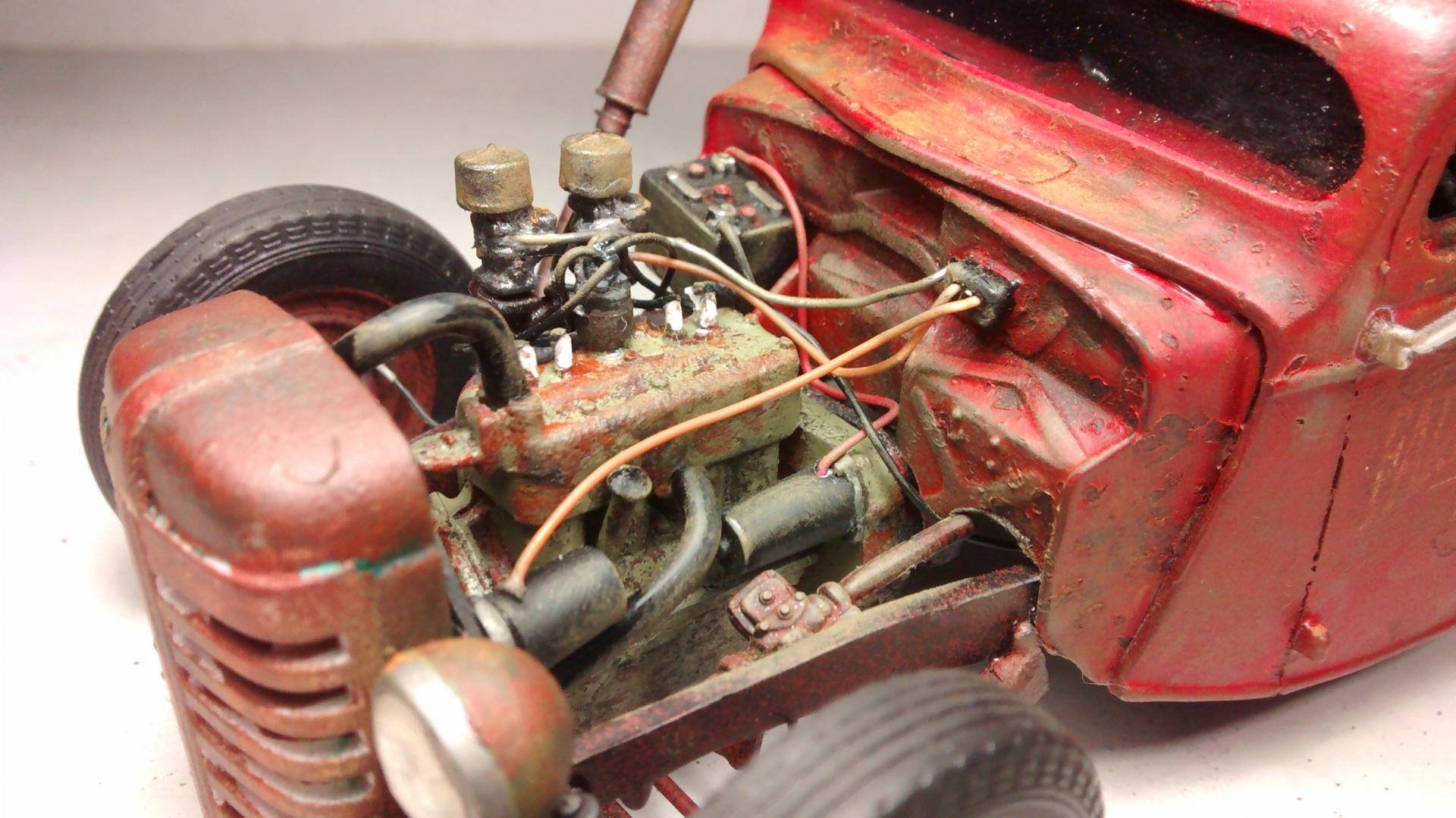 This project was recently done for a "rat" group build. It started out as Revell's 37 Ford pickup, then slowly morphed into the build you see here. The idea was that a farmer left his old pickup in a barn for parts after buying himself a nice, new '56 to use for the next twenty years. Fast forward to the present day, his grandson asks what he's going to do with that old, stripped down pickup that Frank the barn cat has been using as a litter box. After explaining that he wants to learn to do custom body work, his grampa gives him the go ahead to start chopping it up in the garage. Armed with nothing more than a cutting wheel, torch, and welder, he starts chopping into the old wreck using tips from some old magazines for guidance. We'll start with the easy stuff, bobbing the box. After a quick confidence boost, he decides to try channeling the body, z'ing the frame, and the last daunting task of chopping the top. With all of that hard work behind him, it would be a shame to not get it running. The only problem is, the V8 found it's way into a tractor back in '54. Luckily, there is an old engine from a 29 Ford pickup stashed away in the corner of the barn, and all it needs is an intake. The old 4 banger is hardly a speed machine, but an old two carb intake from a swap meet should make a bit of difference. Now for the finishing touch... the grill. Since the old painted lettering survived over the years, and the truck was his grandfather's trusty pickup for two decades, the grandson decided to pay tribute to his grandfather's farming heritage by sticking a grill from an Oliver tractor up front and a piece of old tractor shed on the box for a bed cover. Turns out Gramps isn't a fan of the lack of leg and headroom, but seeing what used to be his pride and joy back on the road after 60 years and his grandson's hard work pay off was enough to put a big smile on an old man's face.