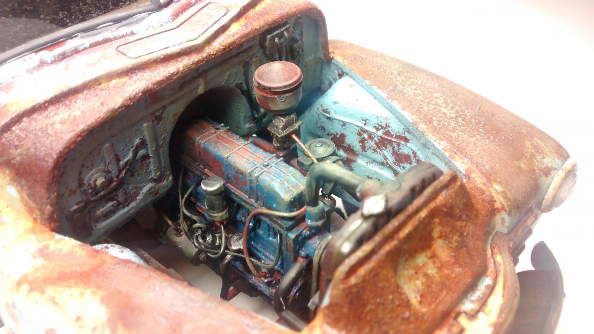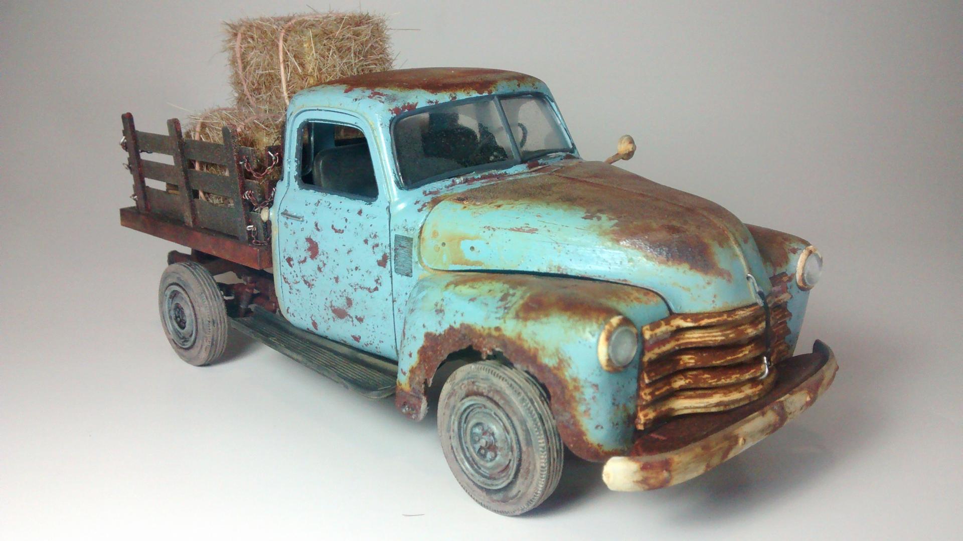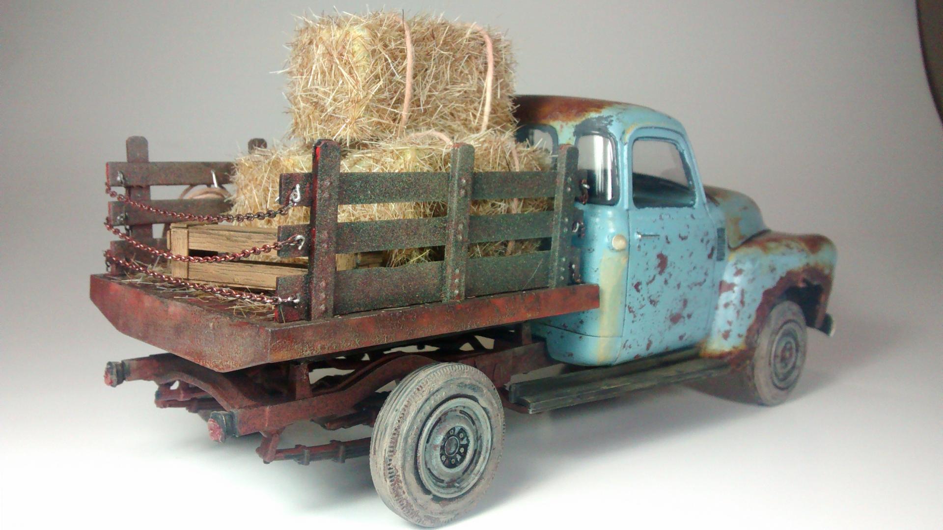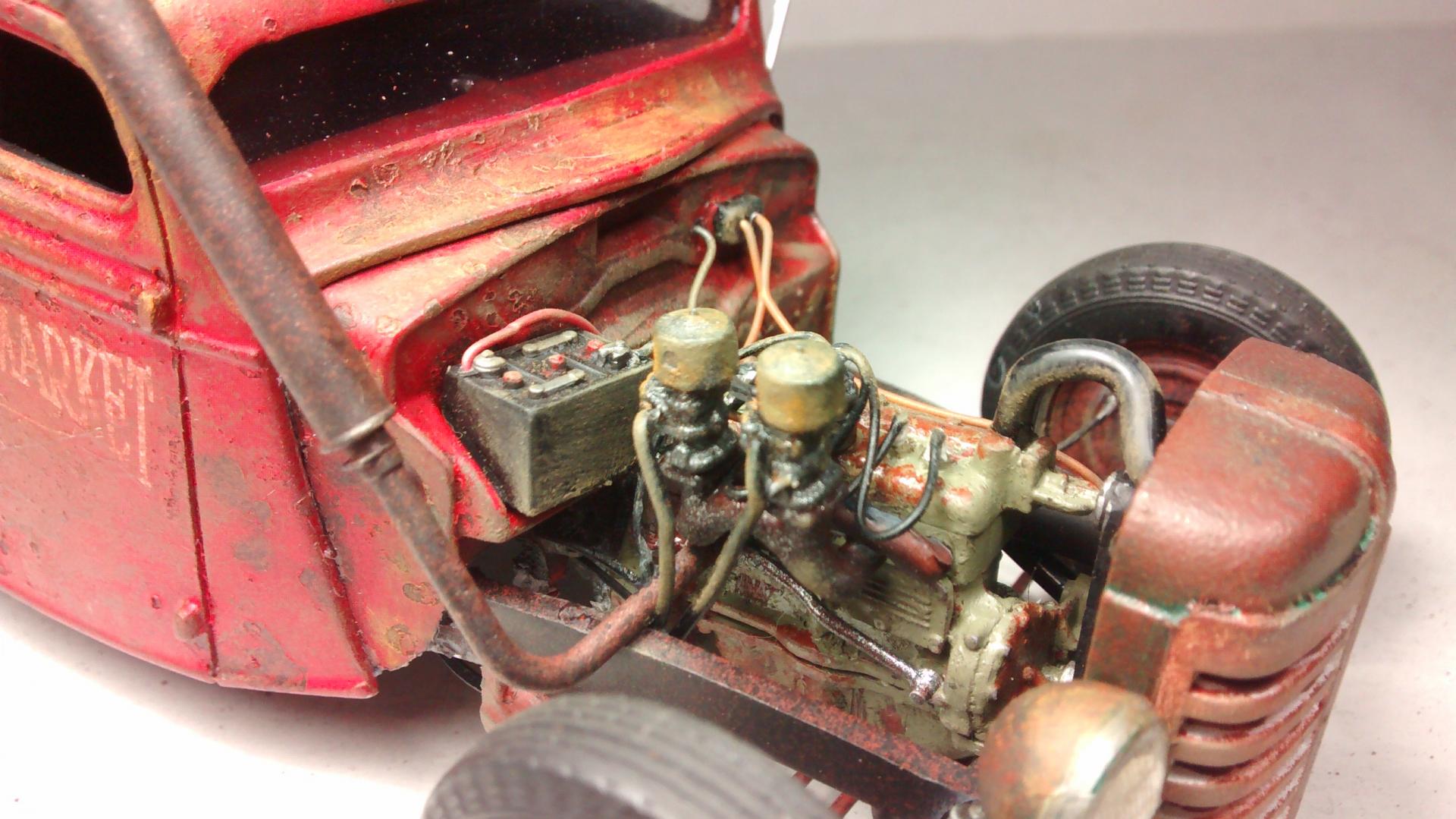 This project was recently done for a "rat" group build. It started out as Revell's 37 Ford pickup, then slowly morphed into the build you see here. The idea was that a farmer left his old pickup in a barn for parts after buying himself a nice, new '56 to use for the next twenty years. Fast forward to the present day, his grandson asks what he's going to do with that old, stripped down pickup that Frank the barn cat has been using as a litter box. After explaining that he wants to learn to do custom body work, his grampa gives him the go ahead to start chopping it up in the garage. Armed with nothing more than a cutting wheel, torch, and welder, he starts chopping into the old wreck using tips from some old magazines for guidance. We'll start with the easy stuff, bobbing the box. After a quick confidence boost, he decides to try channeling the body, z'ing the frame, and the last daunting task of chopping the top. With all of that hard work behind him, it would be a shame to not get it running. The only problem is, the V8 found it's way into a tractor back in '54. Luckily, there is an old engine from a 29 Ford pickup stashed away in the corner of the barn, and all it needs is an intake. The old 4 banger is hardly a speed machine, but an old two carb intake from a swap meet should make a bit of difference. Now for the finishing touch... the grill. Since the old painted lettering survived over the years, and the truck was his grandfather's trusty pickup for two decades, the grandson decided to pay tribute to his grandfather's farming heritage by sticking a grill from an Oliver tractor up front and a piece of old tractor shed on the box for a bed cover. Turns out Gramps isn't a fan of the lack of leg and headroom, but seeing what used to be his pride and joy back on the road after 60 years and his grandson's hard work pay off was enough to put a big smile on an old man's face.