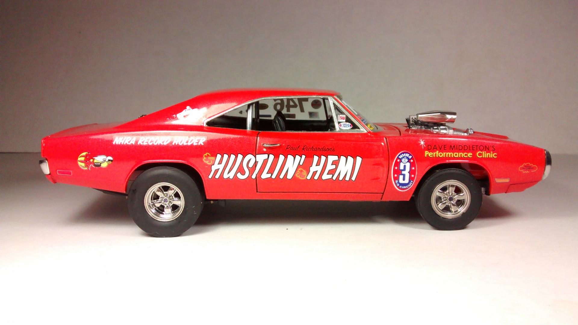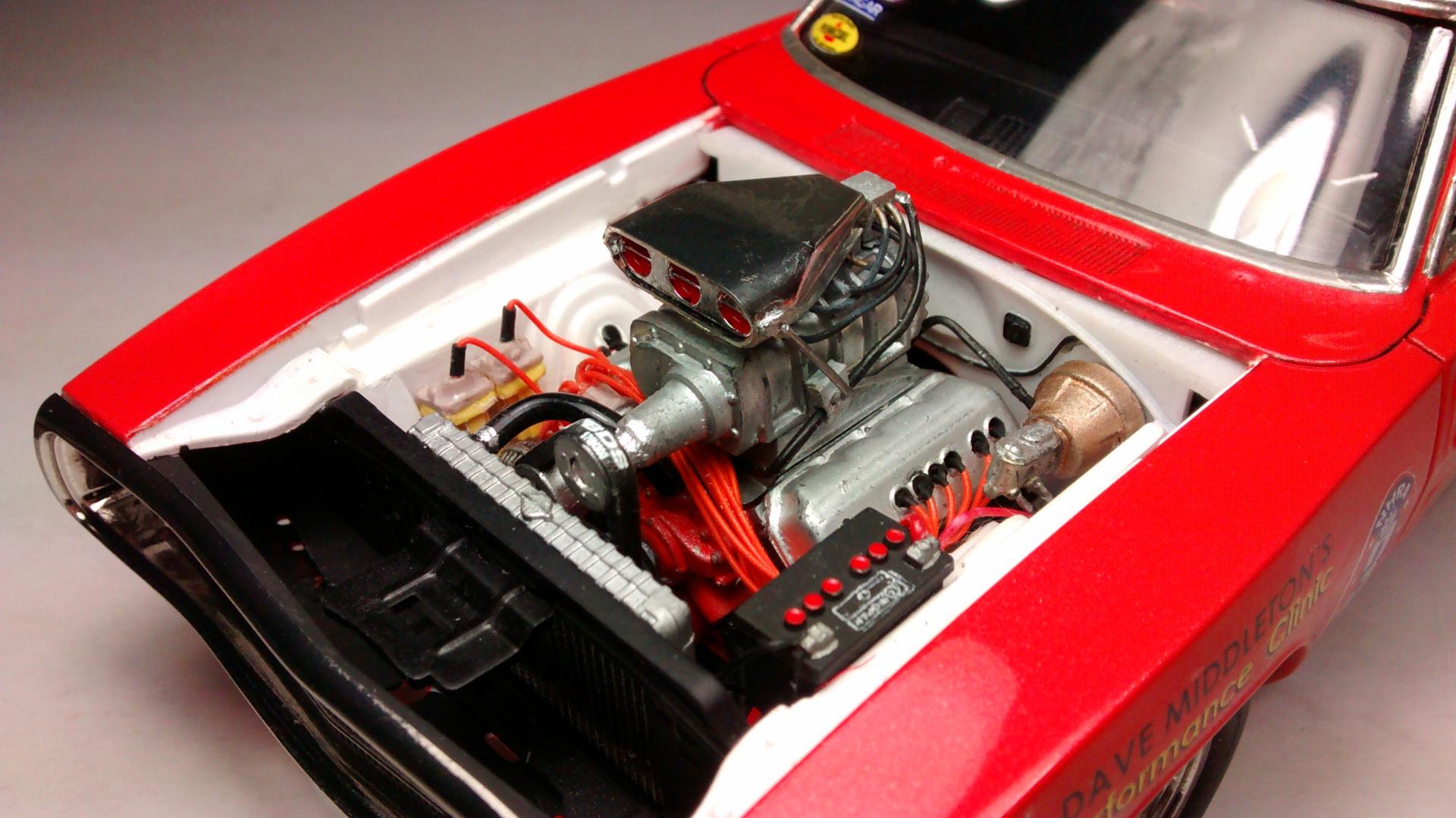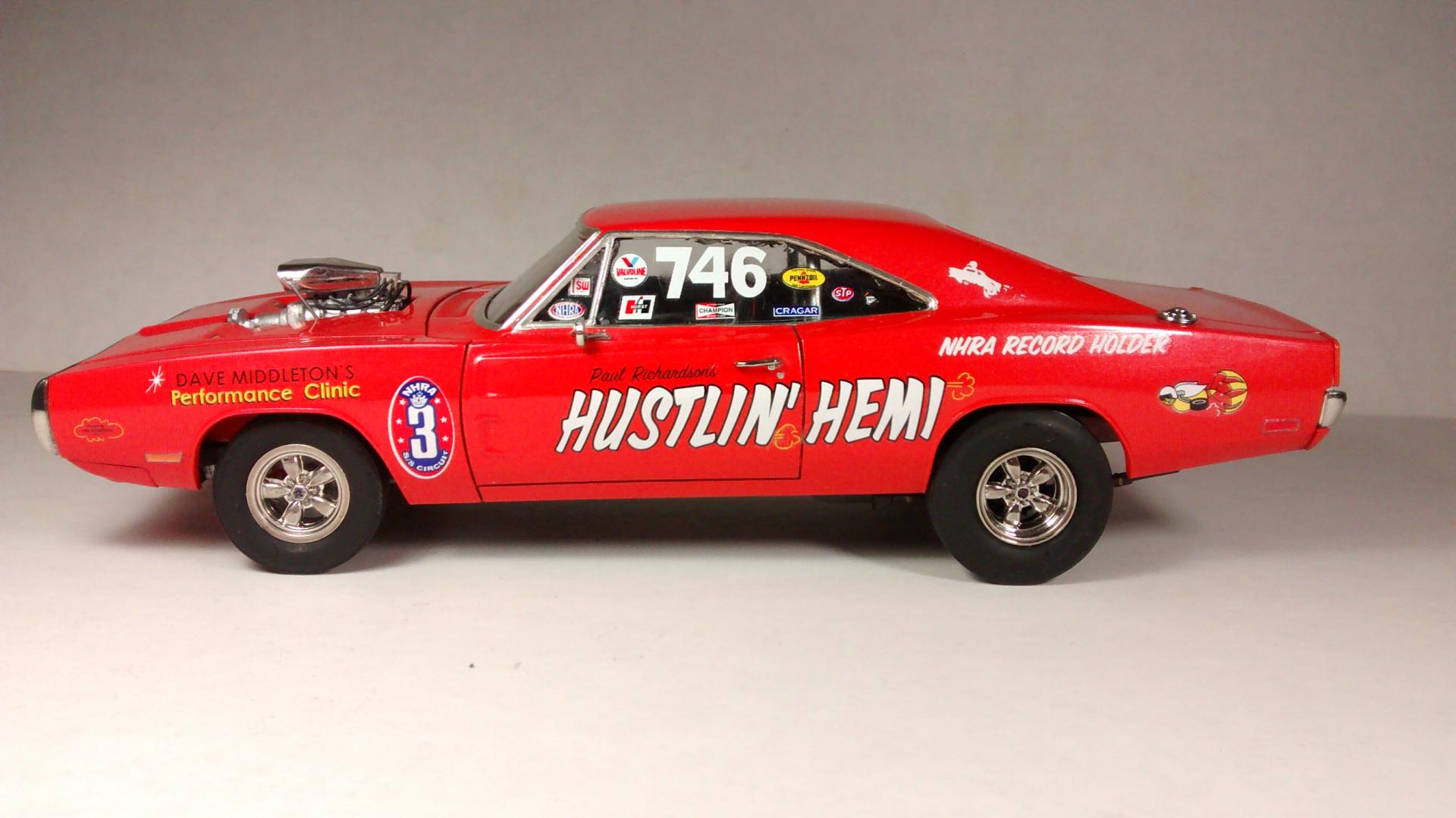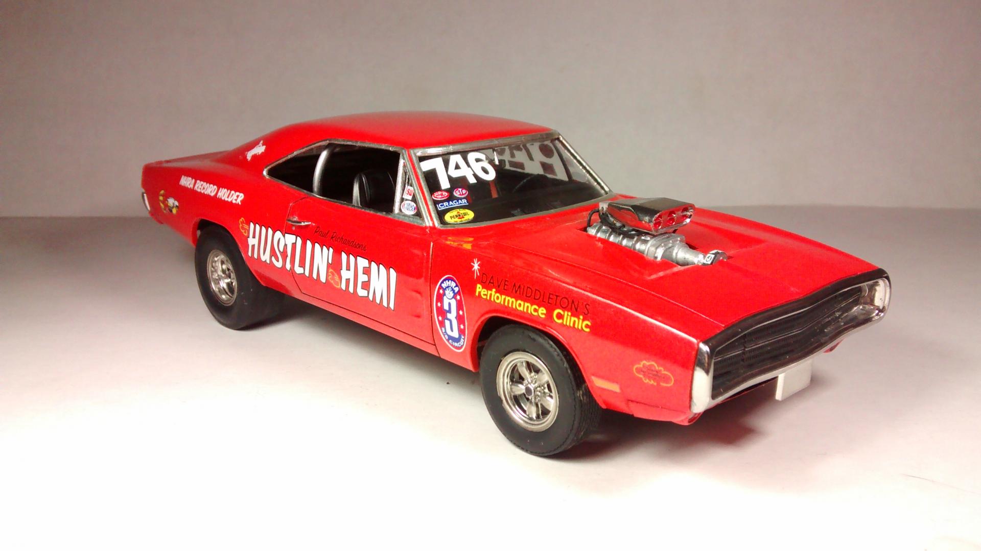 This one started off as the Revell F&F 70 Charger, but took on a new role as the famous Hustlin' Hemi Dart's bigger, supercharged brother. I have a thing for "what if" track cars. Anyway, aside from your standard extra detailing, mods are pretty sparse on this one. I'm one of those types that actually enjoys wiring, so a dual plug Hemi for my first Mopar muscle build was a no-brainer. MAD supplied the valve covers, distributors, and coils to make it happen. The alternator had to be moved to clear the new wiring setup, so a piece of plastic rod was used to extend the pulleys a bit and Detail Master's provided a new alternator and tensioner bracket. Harnesses were made from Tamiya tape colored with a sharpie and some homemade "buckles" were made using bits of plastic. The color is MM Hemi orange with Duplicolor clear and Valspar satin black interior. Slixx beautiful Hustlin' Hemi decals finish her up. Hope you like it and thanks for looking!