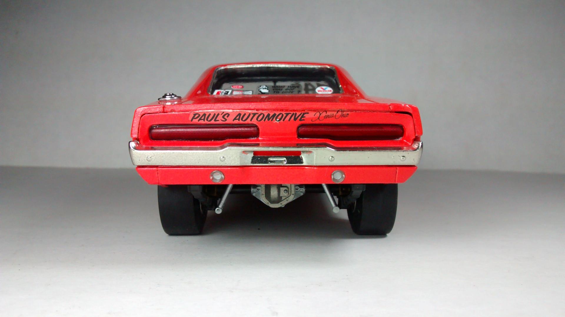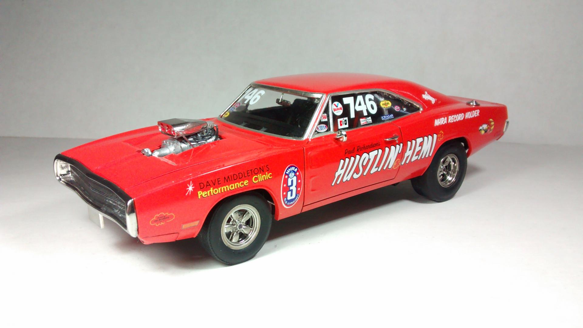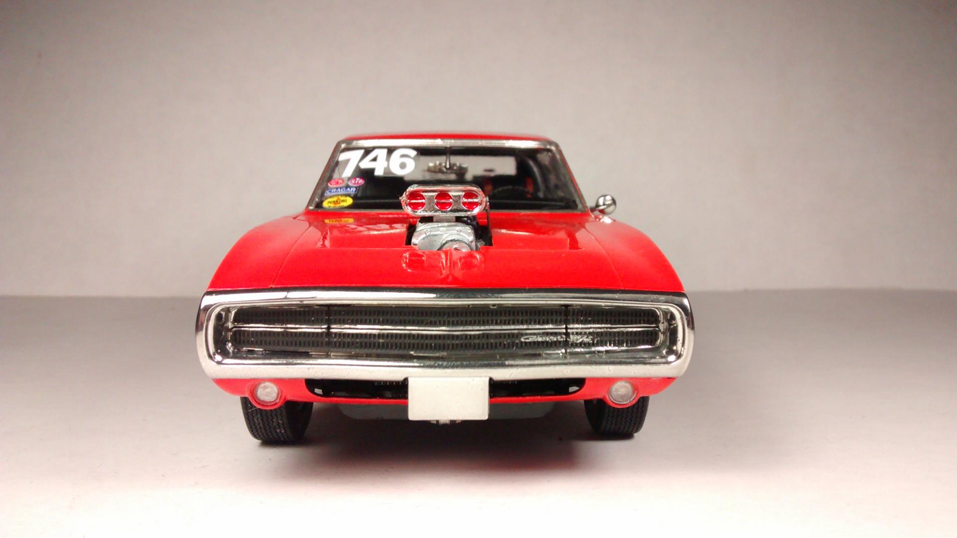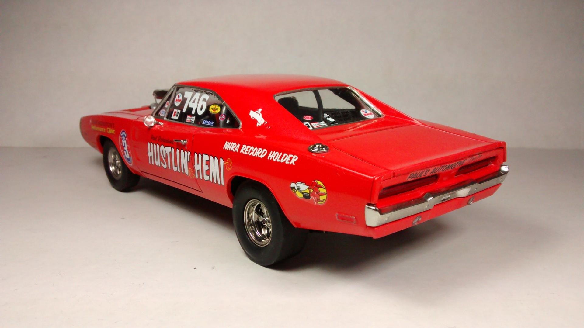 This one started off as the Revell F&F 70 Charger, but took on a new role as the famous Hustlin' Hemi Dart's bigger, supercharged brother. I have a thing for "what if" track cars. Anyway, aside from your standard extra detailing, mods are pretty sparse on this one. I'm one of those types that actually enjoys wiring, so a dual plug Hemi for my first Mopar muscle build was a no-brainer. MAD supplied the valve covers, distributors, and coils to make it happen. The alternator had to be moved to clear the new wiring setup, so a piece of plastic rod was used to extend the pulleys a bit and Detail Master's provided a new alternator and tensioner bracket. Harnesses were made from Tamiya tape colored with a sharpie and some homemade "buckles" were made using bits of plastic. The color is MM Hemi orange with Duplicolor clear and Valspar satin black interior. Slixx beautiful Hustlin' Hemi decals finish her up. Hope you like it and thanks for looking!