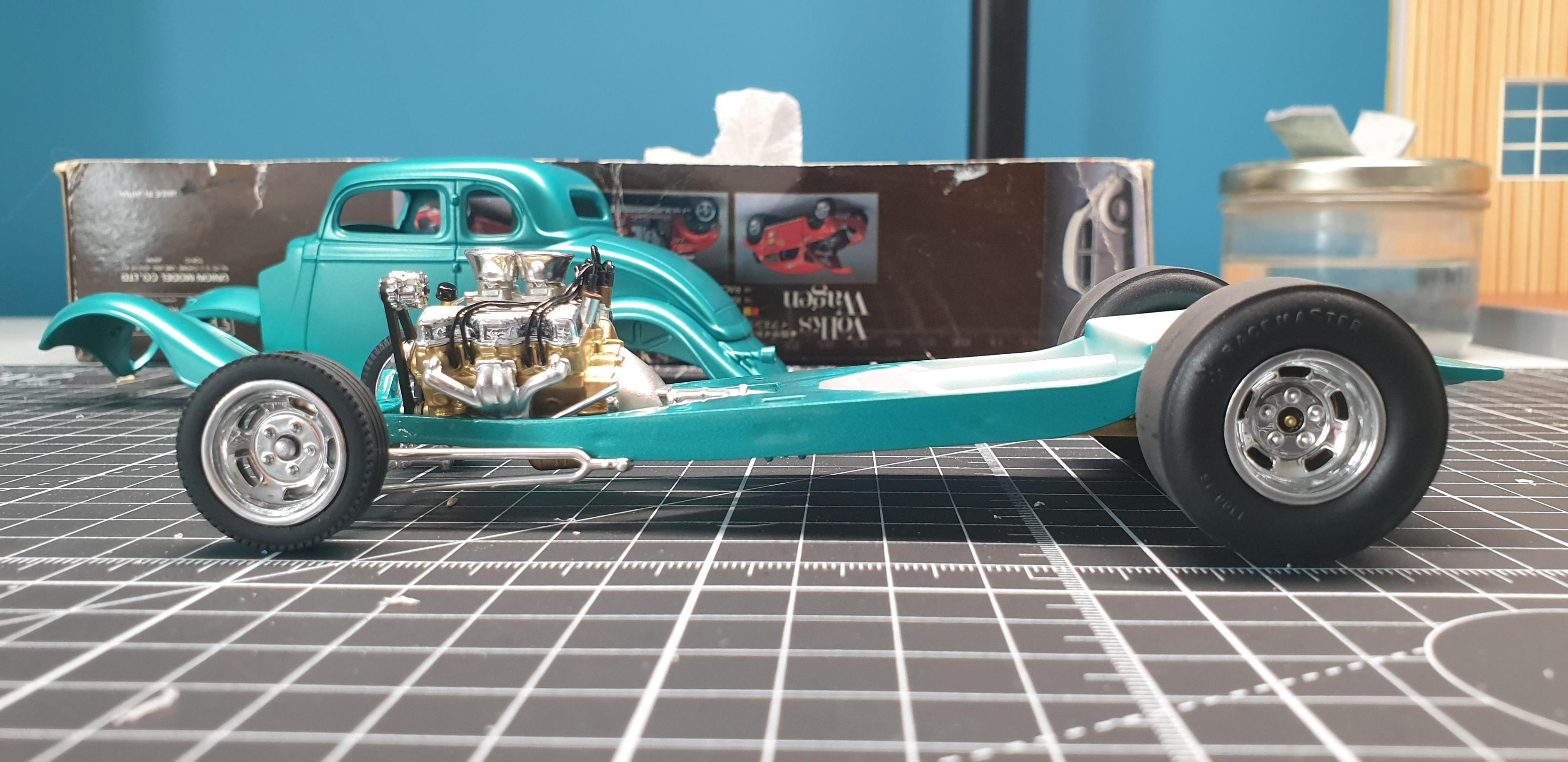 Here's my latest completed build. AMT 34 Ford with a Drag City Casting chopped body. Chasis set up with Revell 32 Ford front end and a quick change rear from the Atlantis yellow fever and a 409 from the Revell 62 Impala. Wheels are from 3D scale parts with the front tyres from the yellow fever and the rears from the Revell Dodge Dart. Paint is GM Turquoise metallic. Thanks for looking Lee