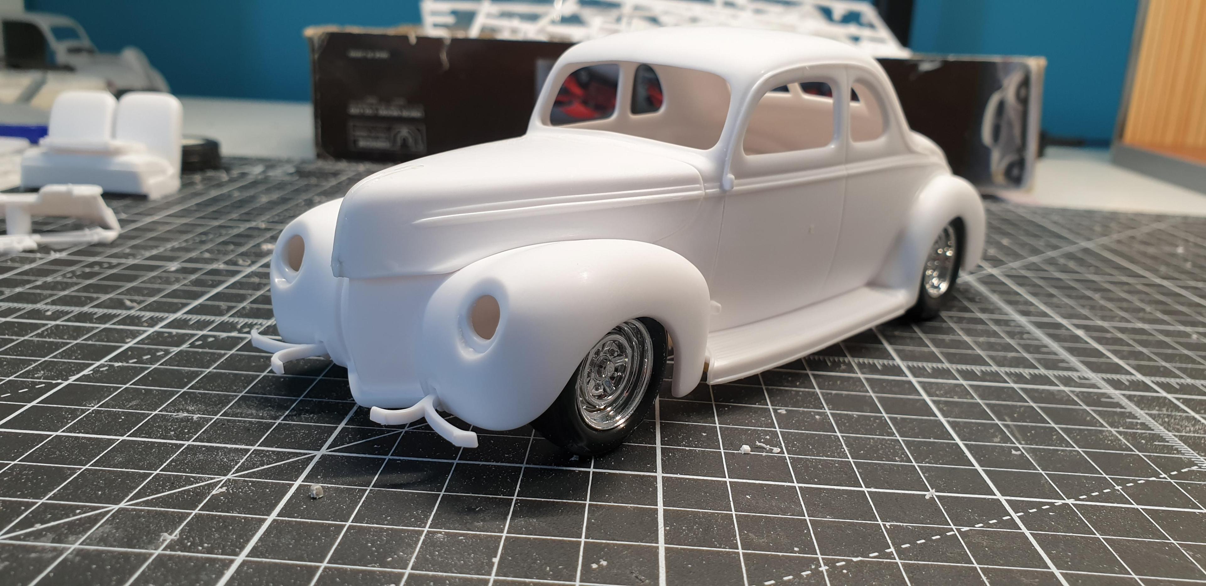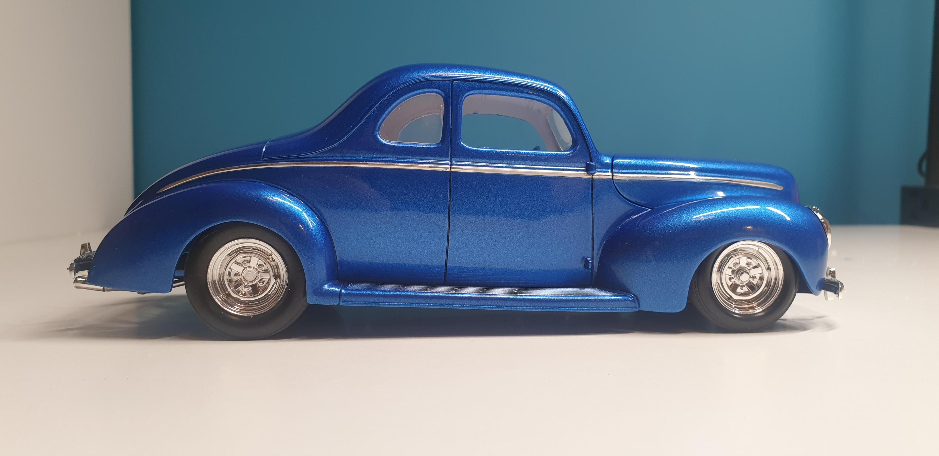 He is my completed Revell 40 Ford coupe. Cleaned up the body by removing the handles badges and smoothed the nose. Lowered it a bit more and added the wheels from the Revell 49 Mercury. I also fitted the triple carb set up from the Revell 32 Ford sedan. Paint is Tamiya metallic blue Thanks for looking Lee