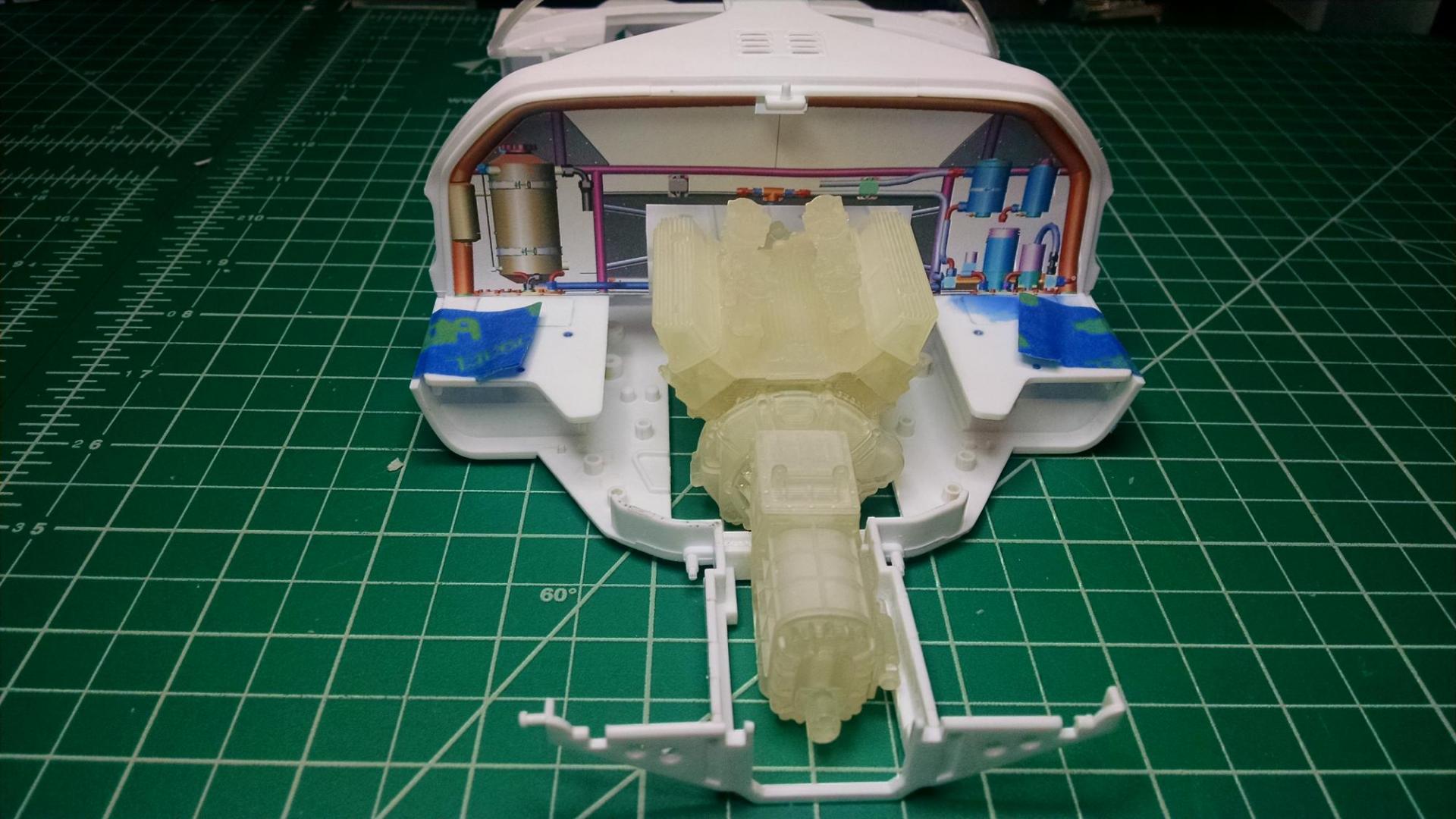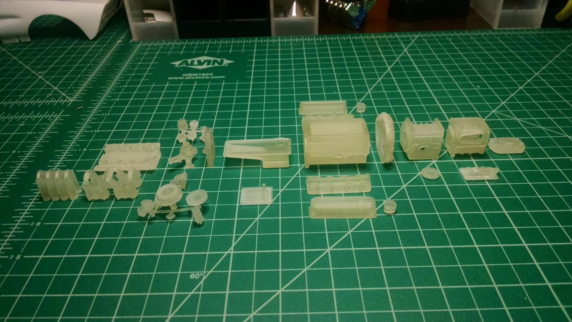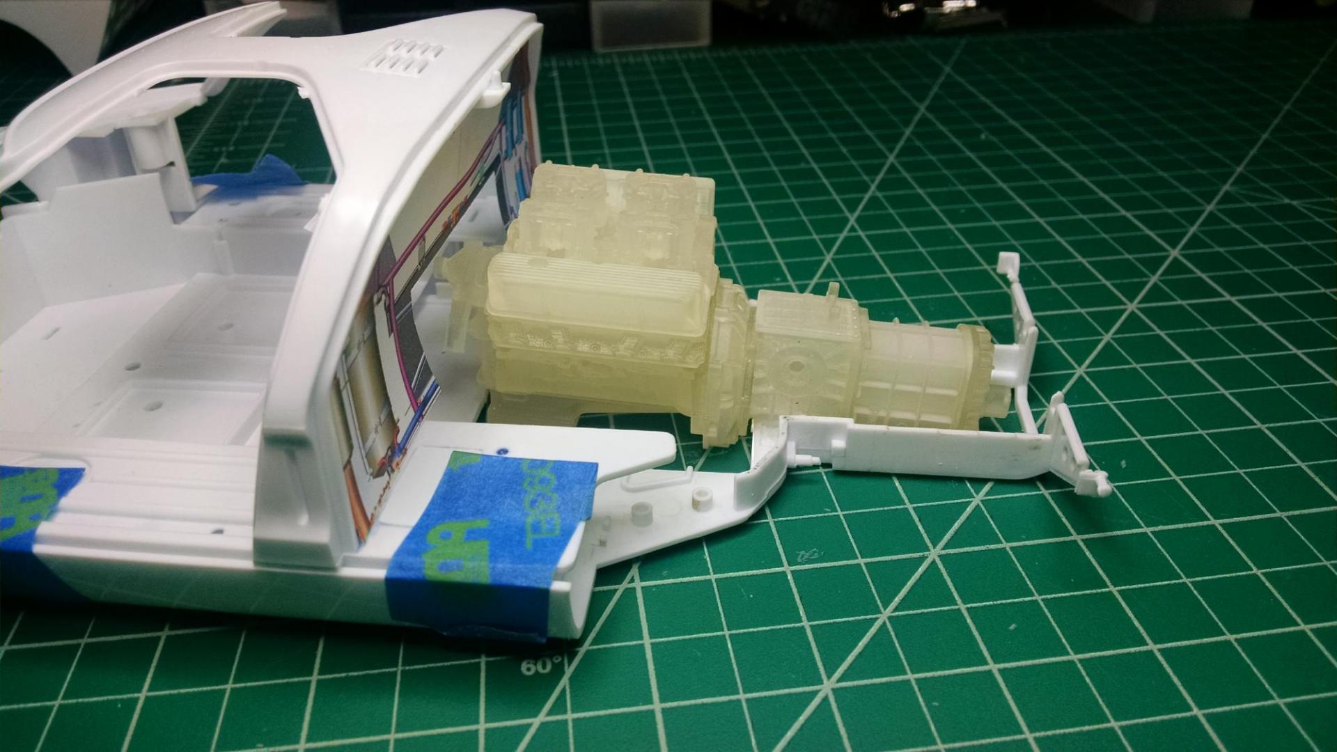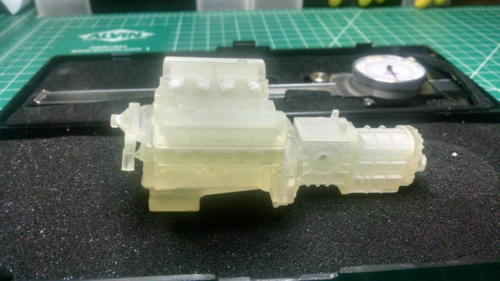 Thanks, geetee66, Funkychicken and superbike-shaun for your encouraging comments and direction to the sizing chart! Glad I'm inspiring people. Even though most people don't have AutoCad 3D at home like me, there's a TON of stuff out there you can buy, although pretty pricy. Got my engine in last weekend. Ford 427 side-oiler with quad Weber carbs and ZF transaxle. Bought from TDR Innovations, he sells his stuff through Shapeway but has his own site for viewing and has a bunch of cool stuff, very detailed and accurate down to the mounting bosses for the engine mounts! Tim is a great guy to work with, willing to go the extra mile to get you the correct size parts you need. I've got it temp glued with white Elmers for test fitting in the chassis. The 3D computer snaps look like a fantasy until you get the parts in hand :-) More food for thought, I draw on the computer, print it on paper, cut it out and tape it on the actual model like in the pics below to make sure things fit before printing in 3D. Gives me a good idea if things are the correct scale too. More to come soon, I've got more parts in process at the printers. -