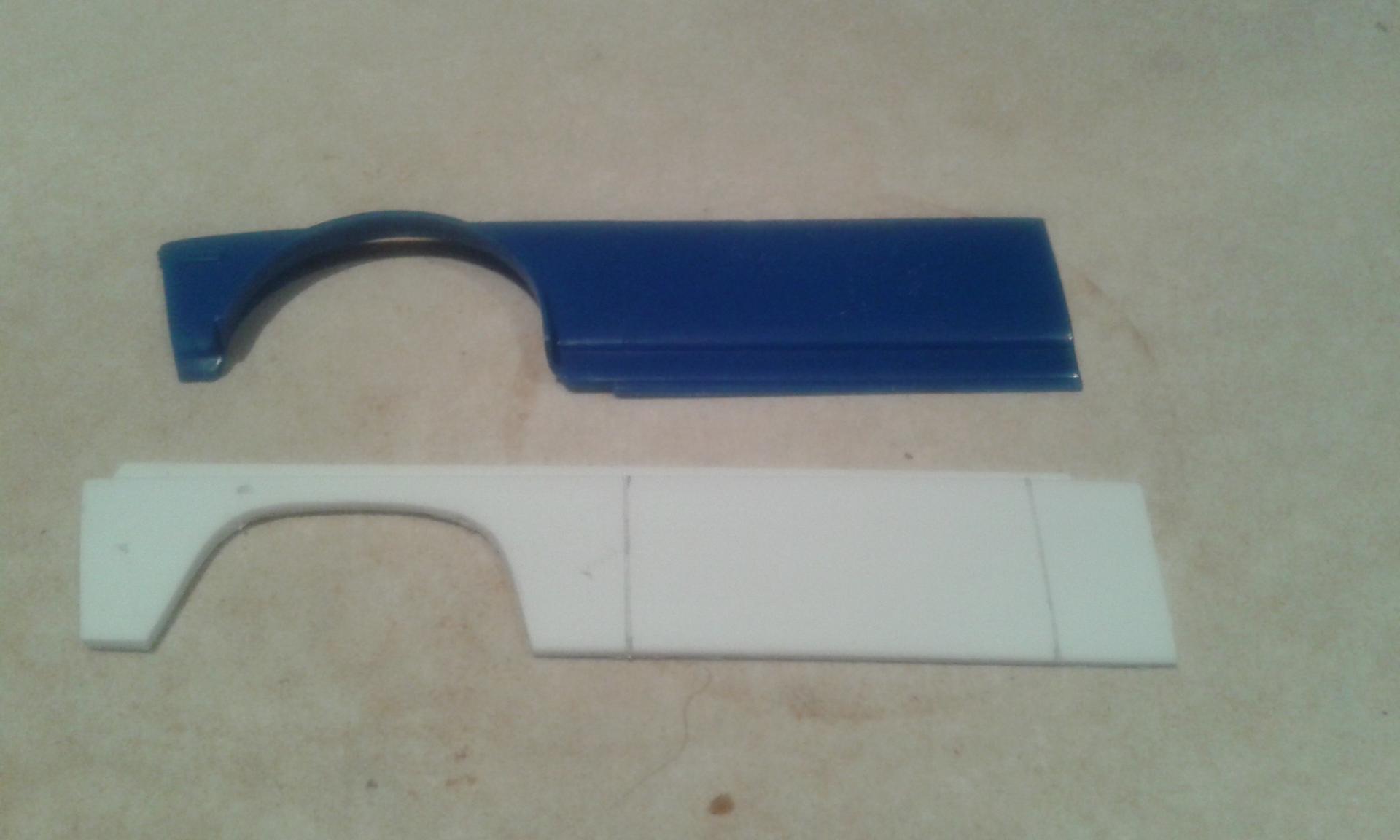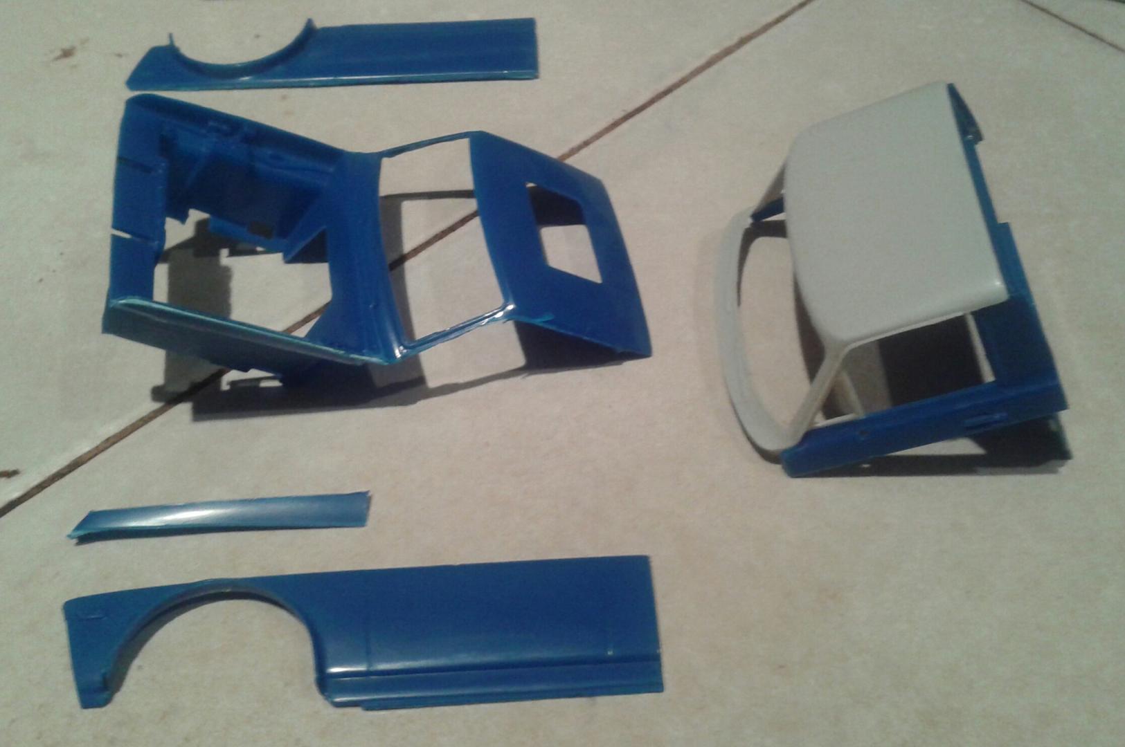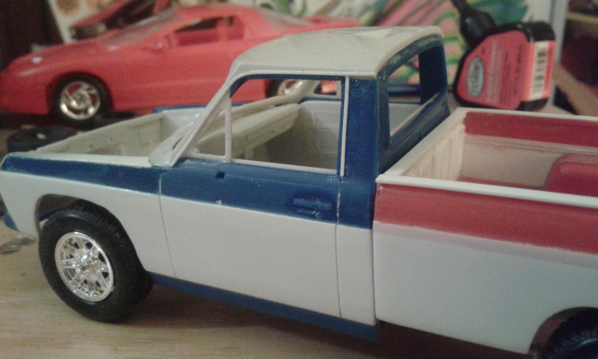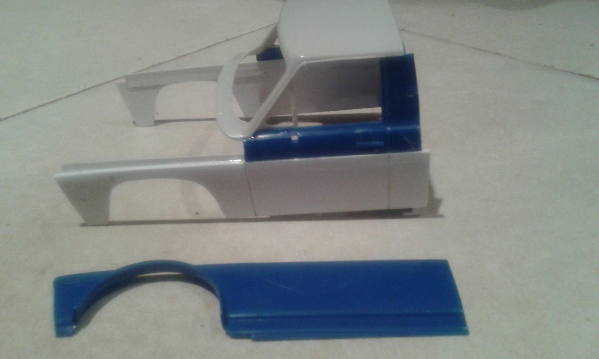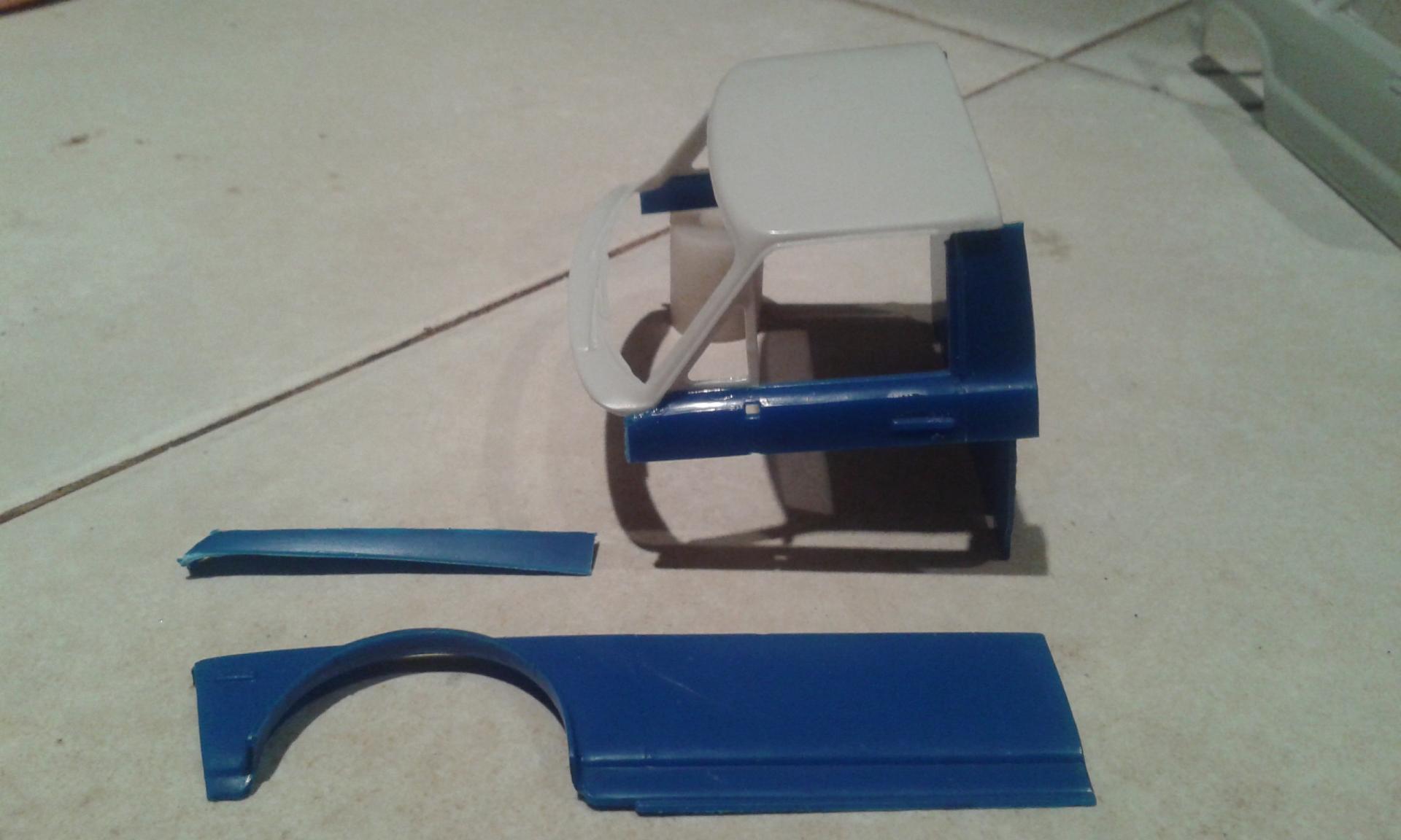 I've been piddling around with this idea for a while. I've always wanted to make the Revell "Fun Truckin'" Courier stock, but the chopped cab had me stumped. Until I realized the 79 cab still had the stock windshield and basic dimensions. I also figured out that both cabs can be combined to complete the look I want, sooo..... The side panels are simply made from sheet plastic, as it's easier to cut simple rectangles from that, than to try to fix the kit pieces. I used the wheelwell from the AMT Courier as a template for the wheel opening. Blue parts are the Revell kit, grey parts are the AMT kit and white parts are sheet plastic. Then I cut out the hood scoop area and replaced it with sheet plastic. I built up the stock frame from the AMT kit and used the well under the hood for detail and to align the chassis. Notice how the AMT interior is a perfect fit for the new cab. And it pretty much represents the stock interior of the real truck too.