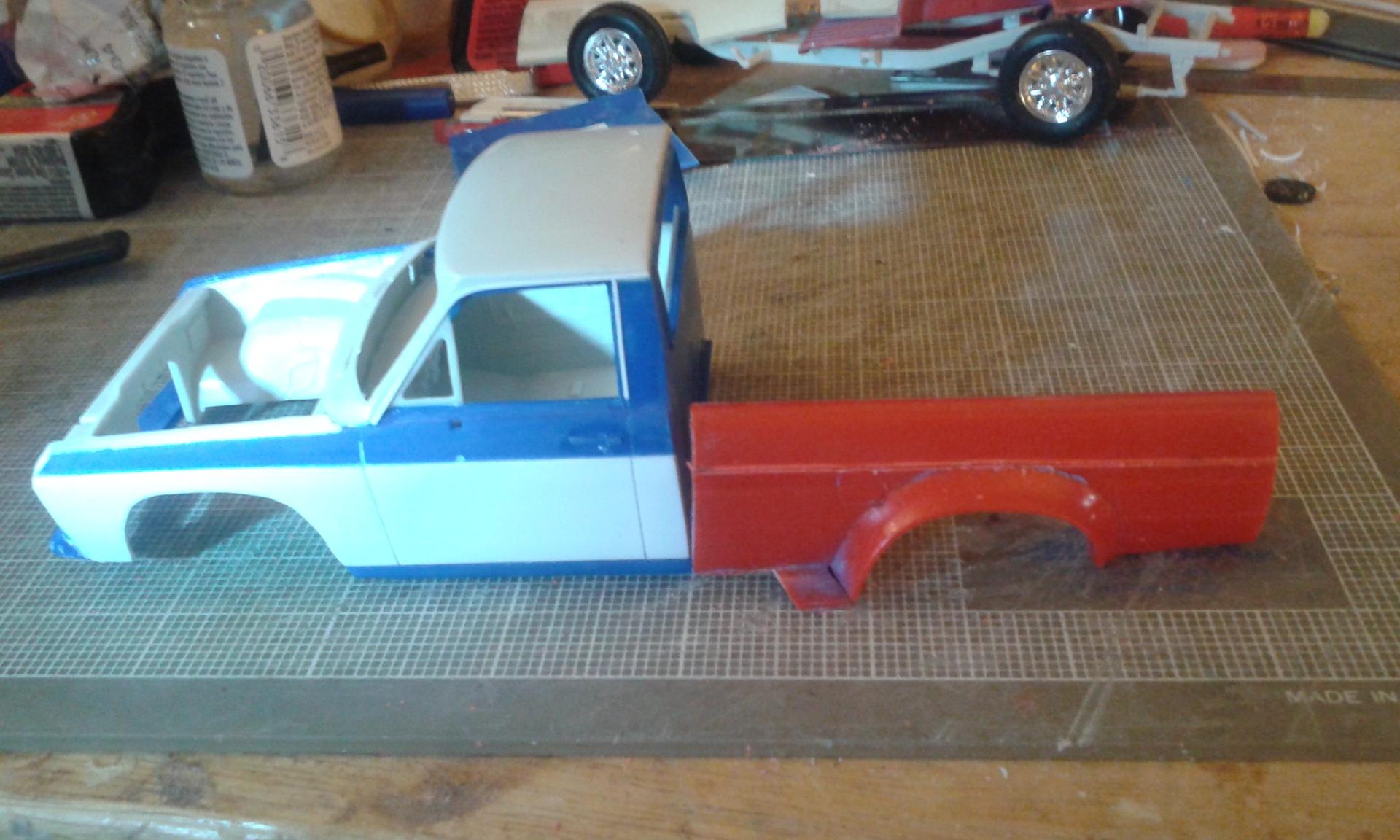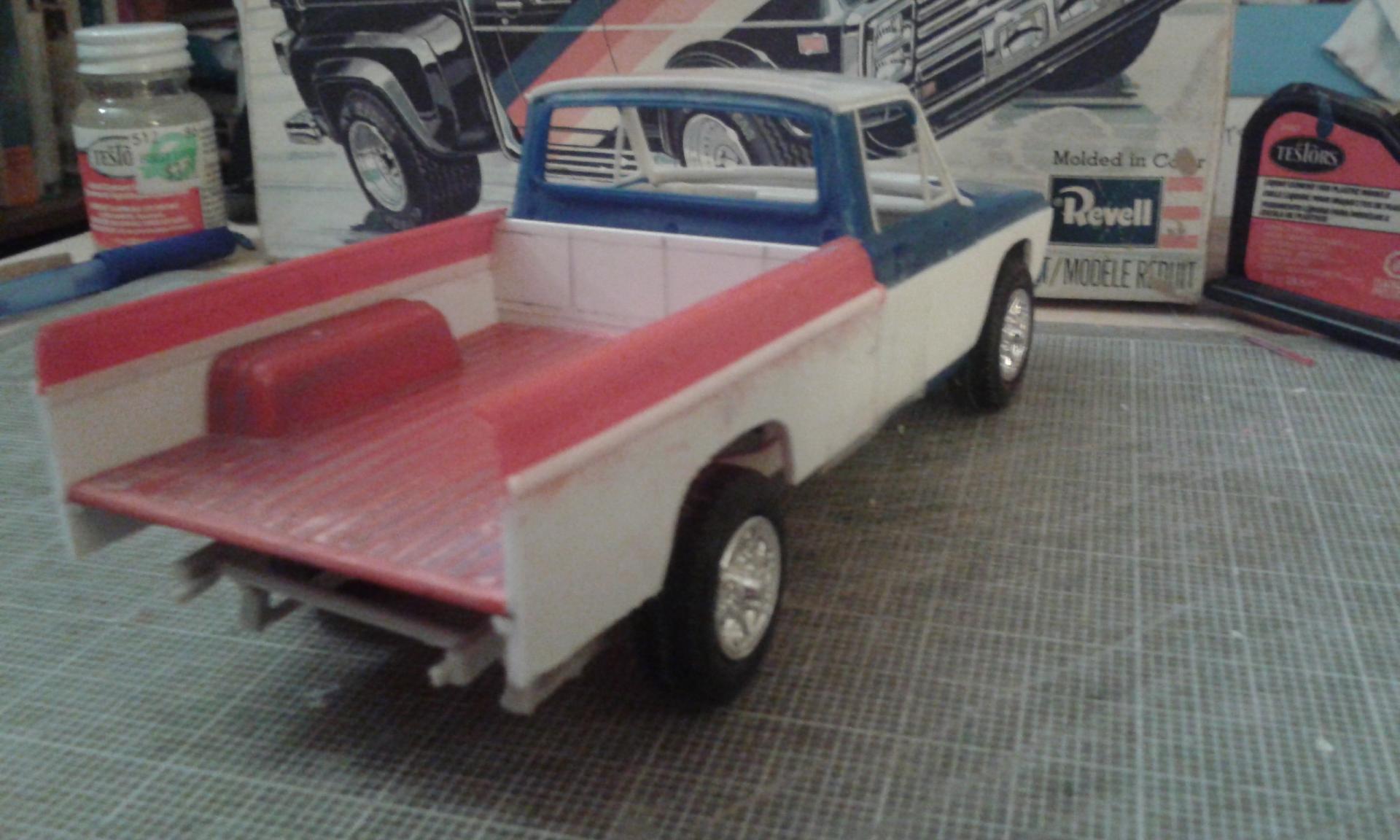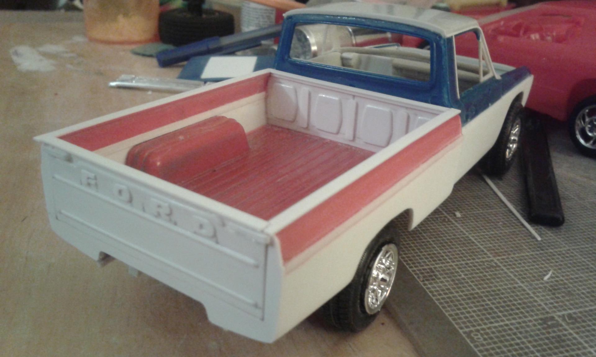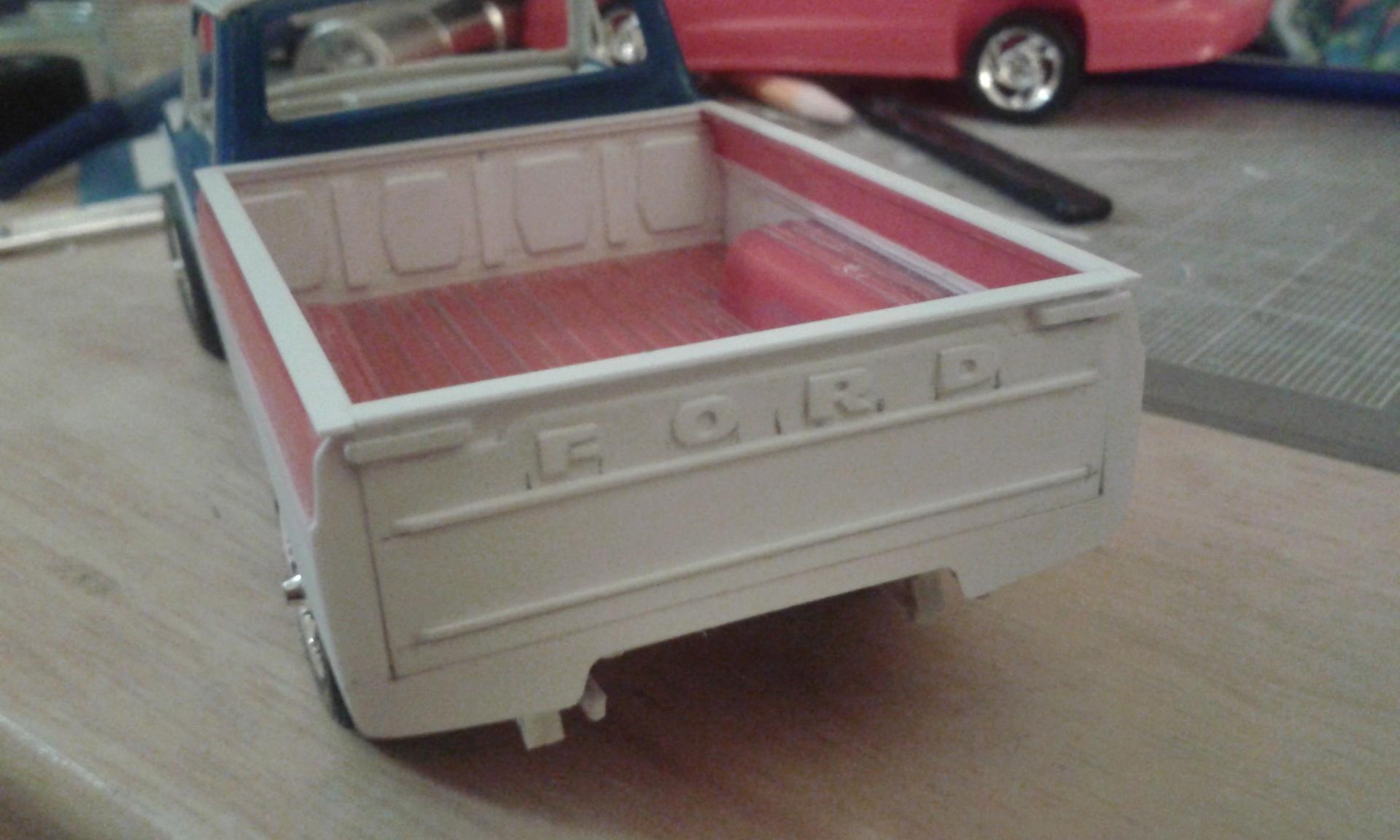 Next up was figuring out how to make the stock fleetside bed. Which alluded me until I happened to find a Dodge D50 box laying around. I sized it up and found it had the perfect curve to the back of the cab, and the bed floor. I used more sheet plastic to finish the sides, tailgate and bulkhead. The red areas are from the D50. I had to cut the hexagon shapes on the bulkhead and the FORD letters on the tailgate from scratch. Color may end up mustard yellow, pastel blue or olive green - all stock colors, I haven't decided yet. Comments? -