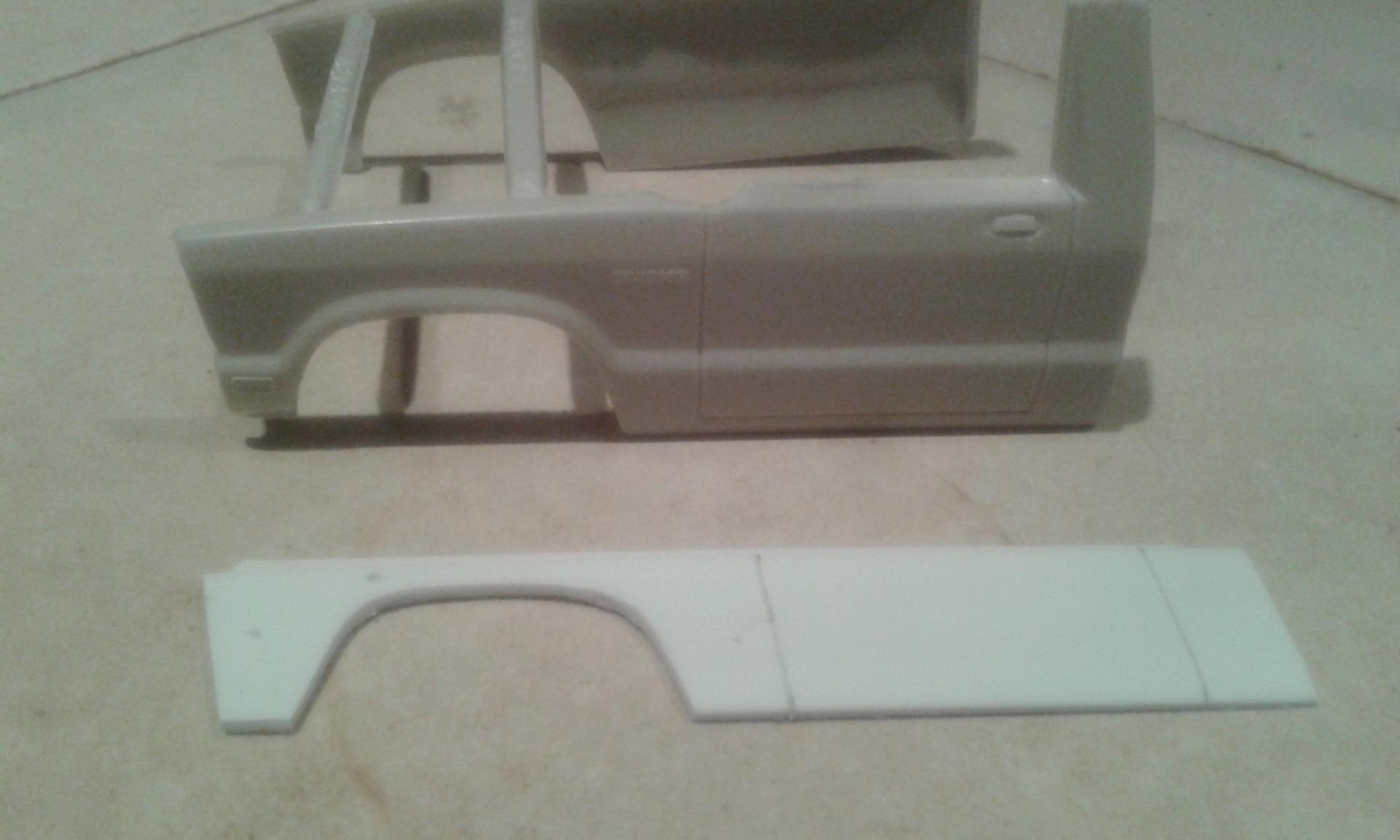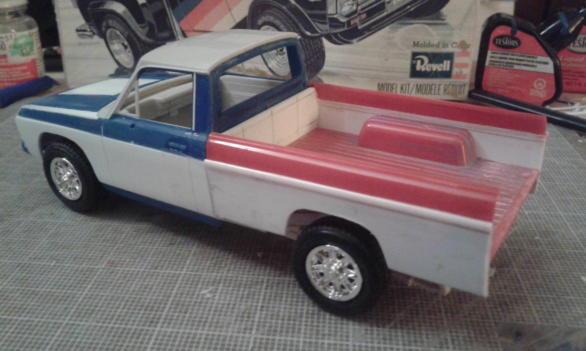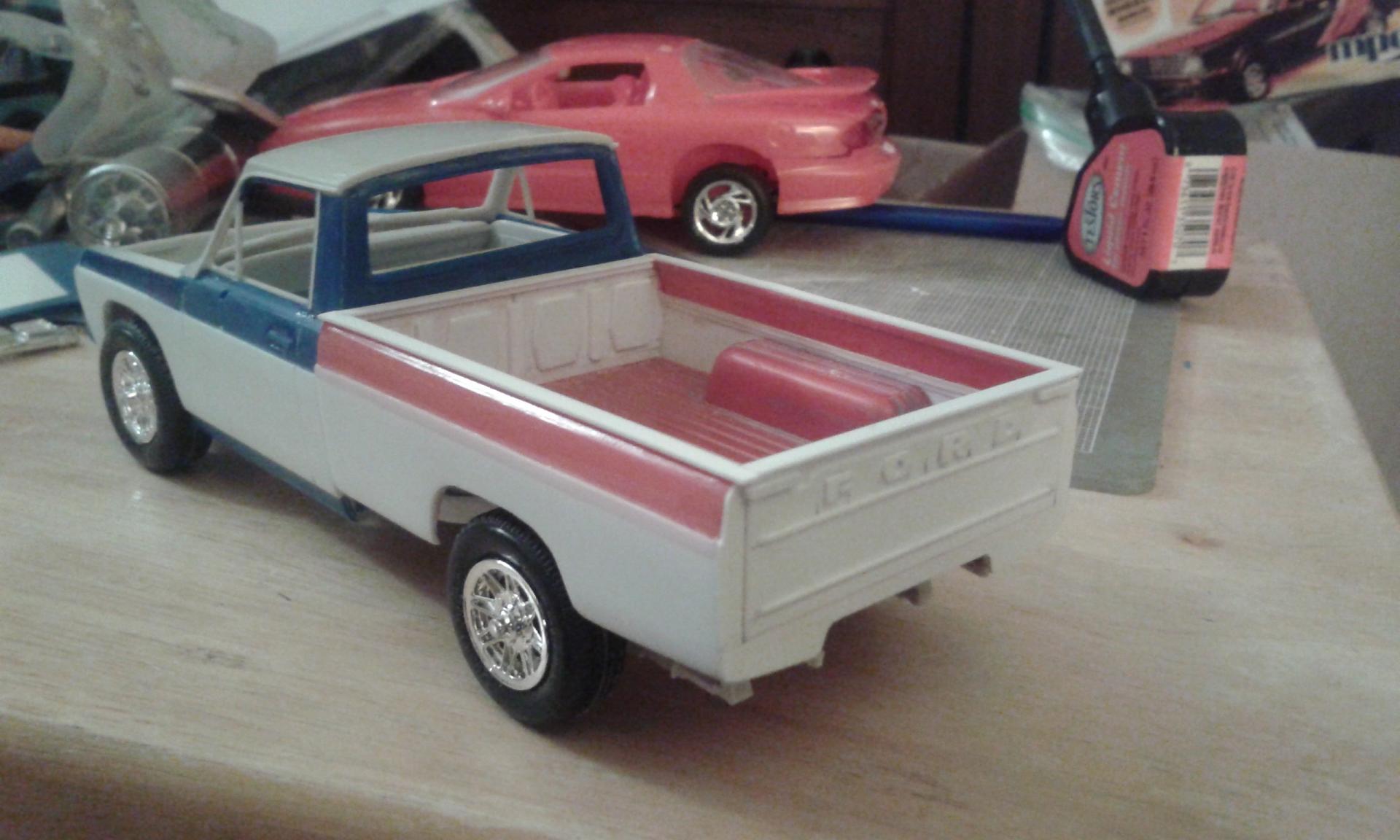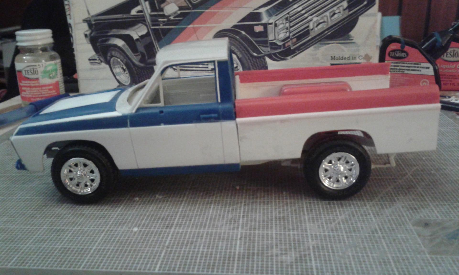 Next up was figuring out how to make the stock fleetside bed. Which alluded me until I happened to find a Dodge D50 box laying around. I sized it up and found it had the perfect curve to the back of the cab, and the bed floor. I used more sheet plastic to finish the sides, tailgate and bulkhead. The red areas are from the D50. I had to cut the hexagon shapes on the bulkhead and the FORD letters on the tailgate from scratch. Color may end up mustard yellow, pastel blue or olive green - all stock colors, I haven't decided yet. Comments? -