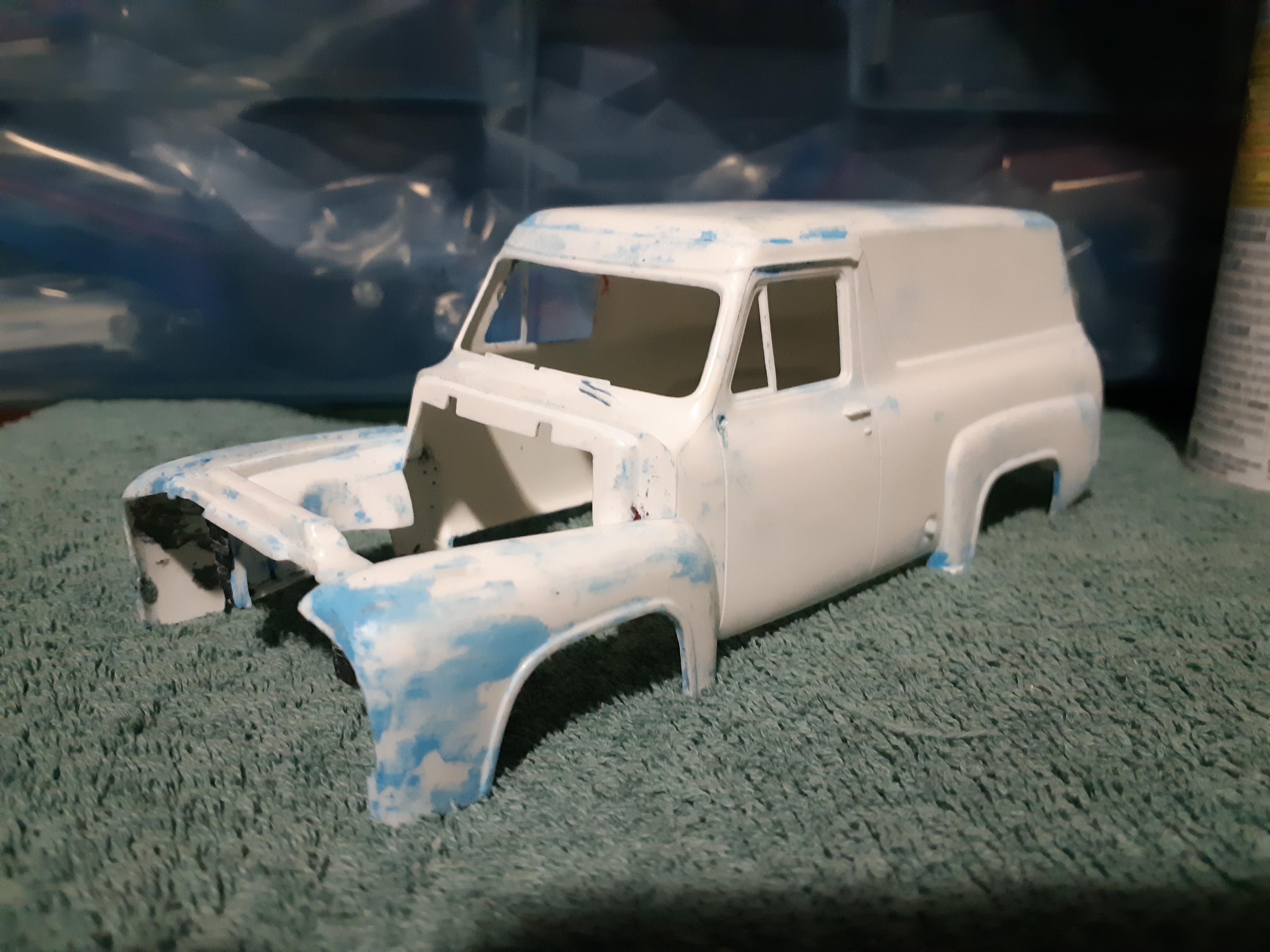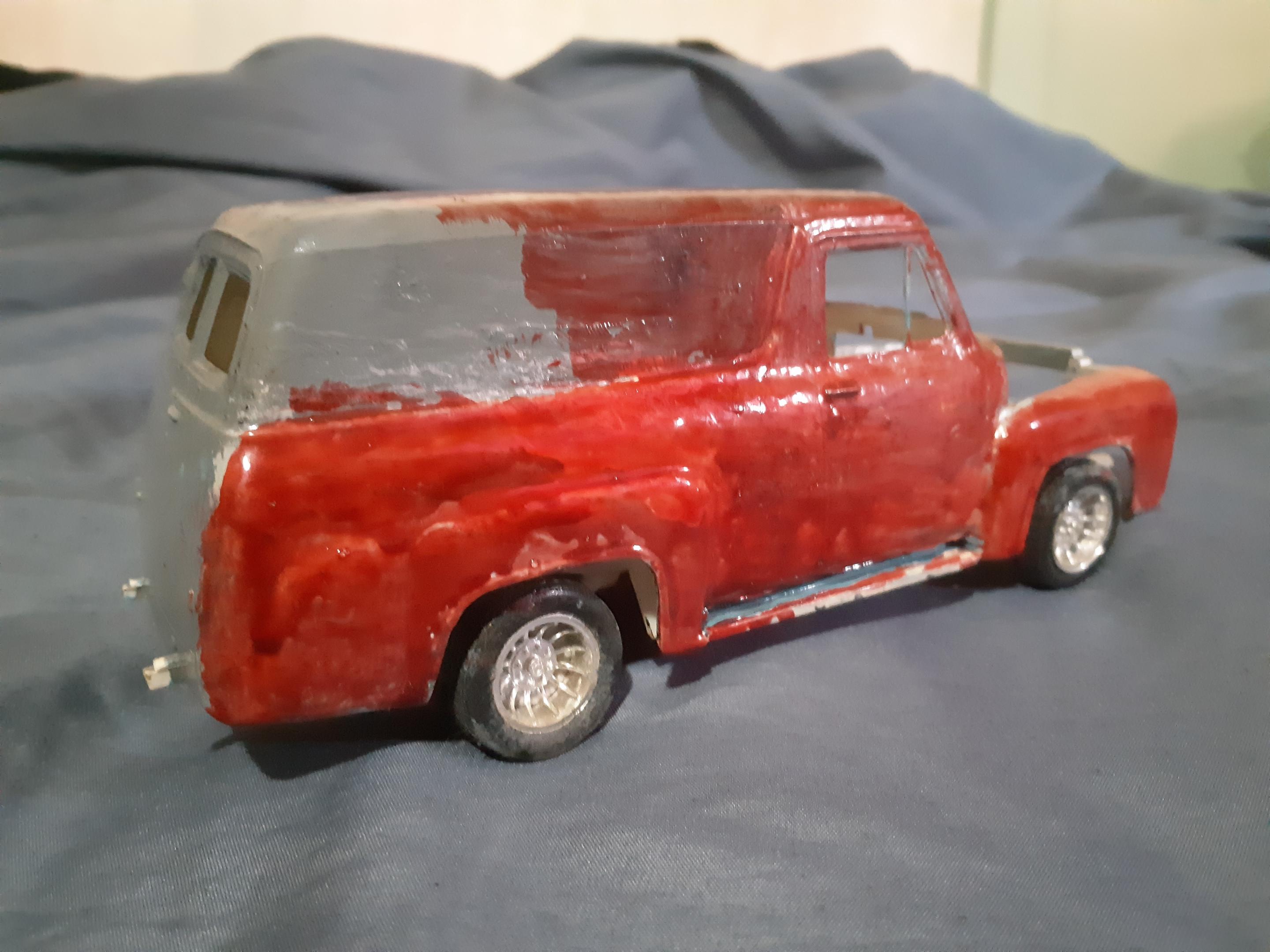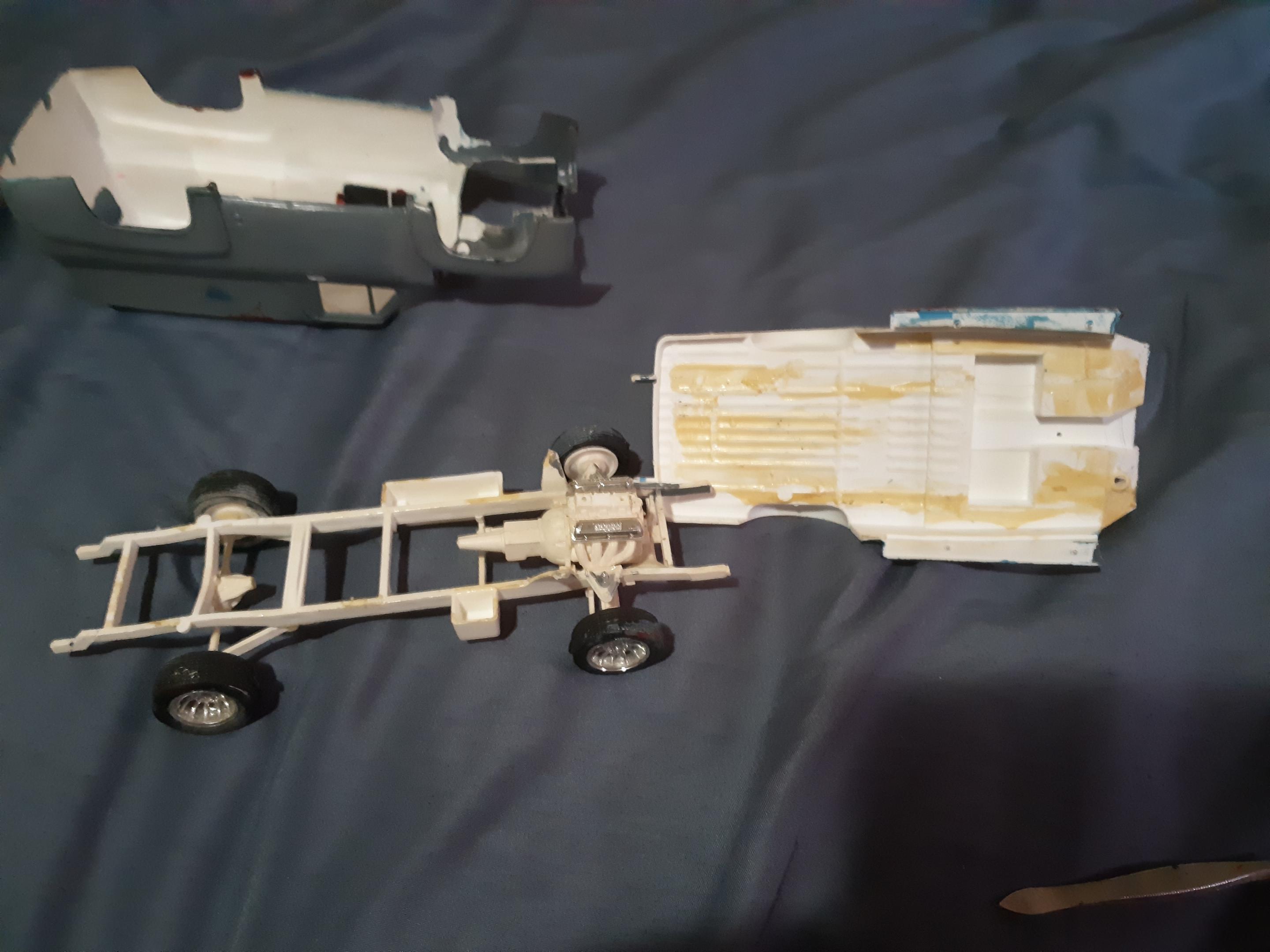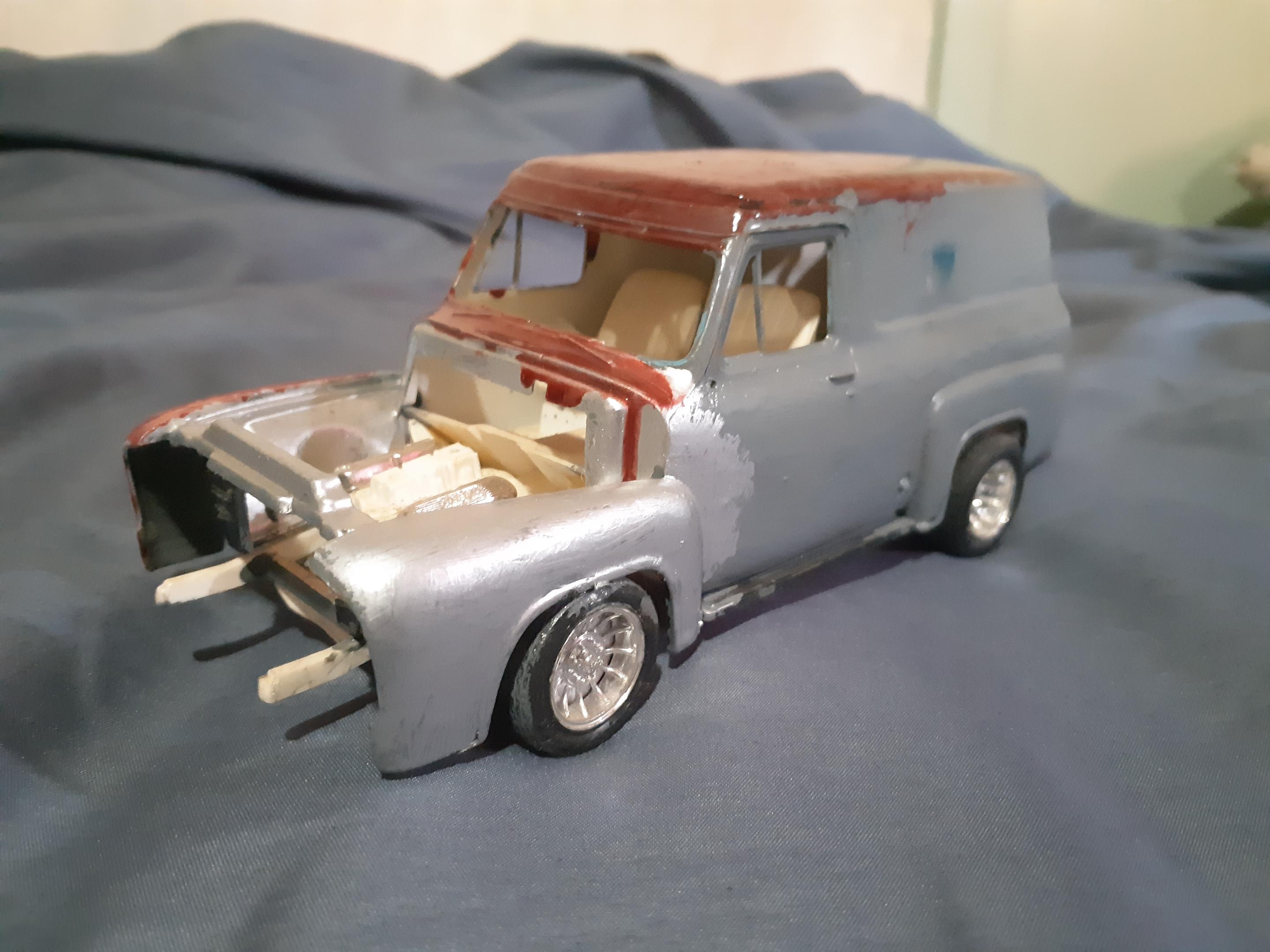 Since my last build didn't go according to plan got looking through my stuff that needed rebuilt and decided to try restoring a 1955 Ford Panel truck. Missing some pieces so I'll be raiding a 55 Ford F-100 and my parts box. Starting off going to try pulling everything apart, whoever built this before used a "generous" amount of glue to attach everything.