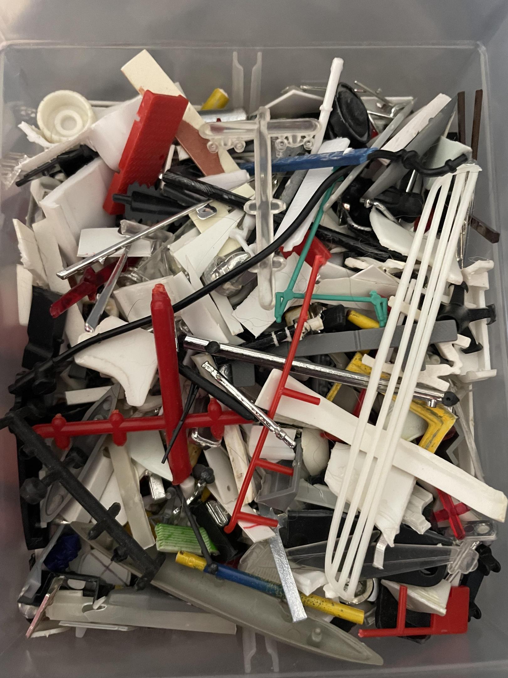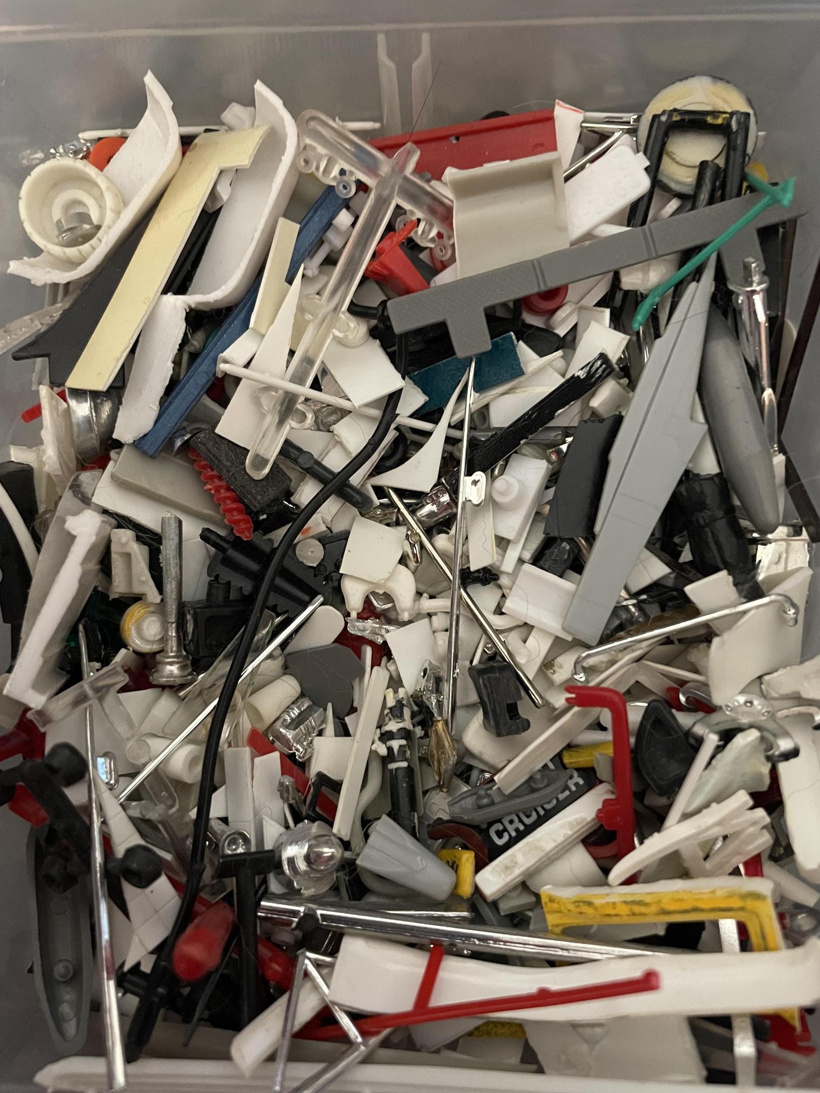 This is one thing that has come in handy on almost every build, I strongly recommend to keep a scrap bin for cutoffs and other misc small parts! Sometimes you want to scratch something that may be tough to do with styrene strips/rod, or sometimes you need a piece of certain size or thickness to fill in a gap or hole, this bin has been a great source of pieces for many random things that I have done on builds!