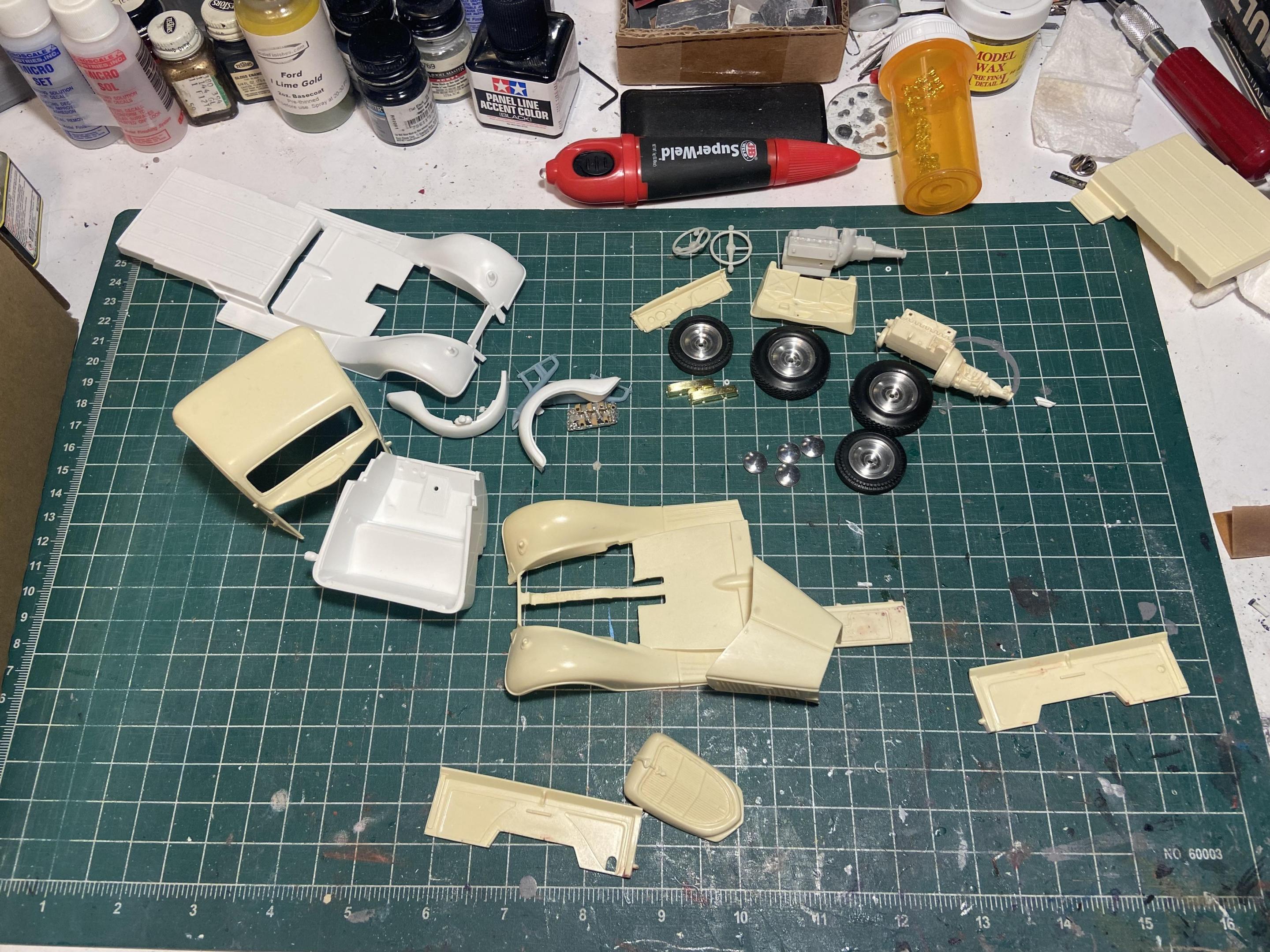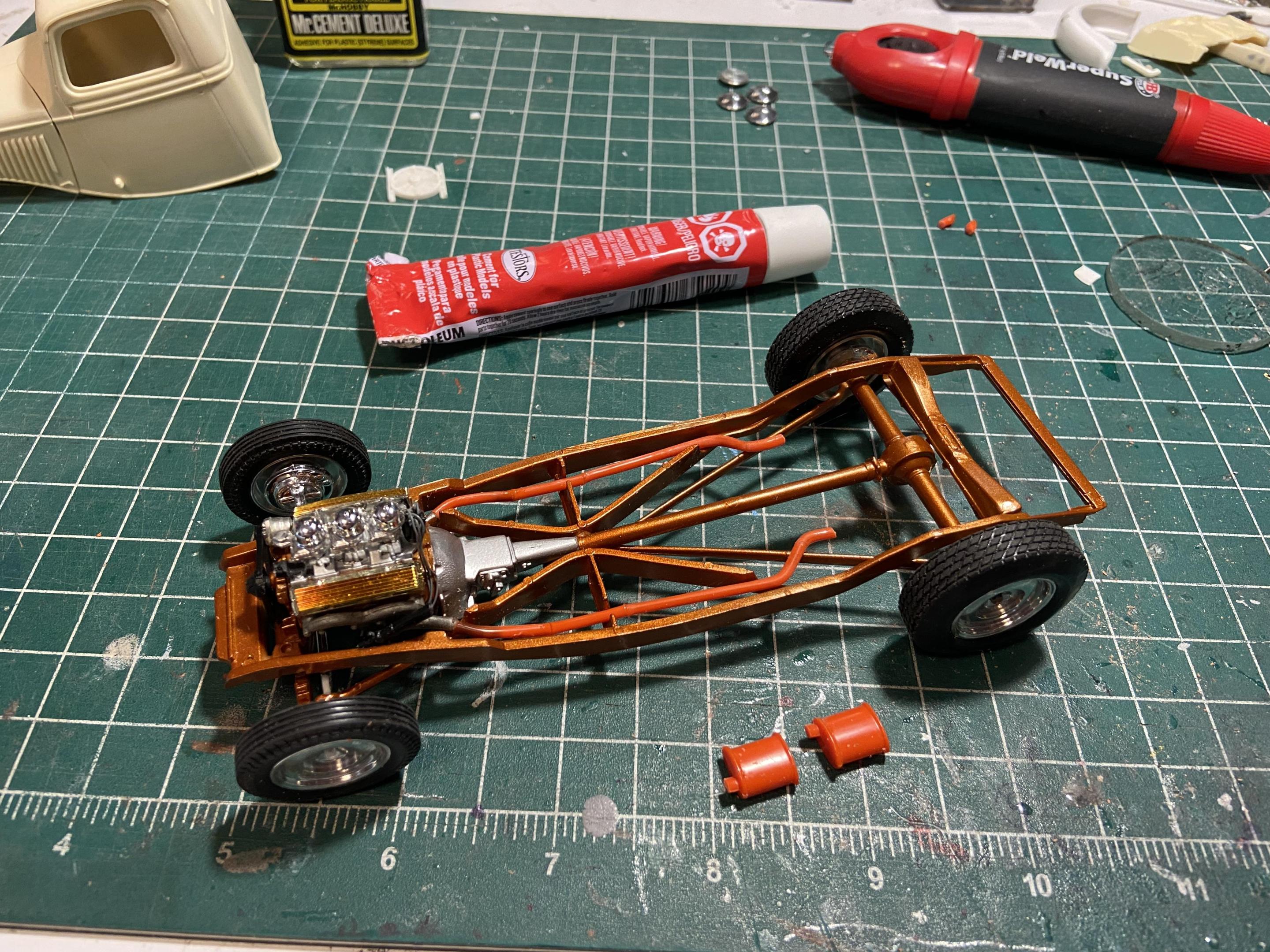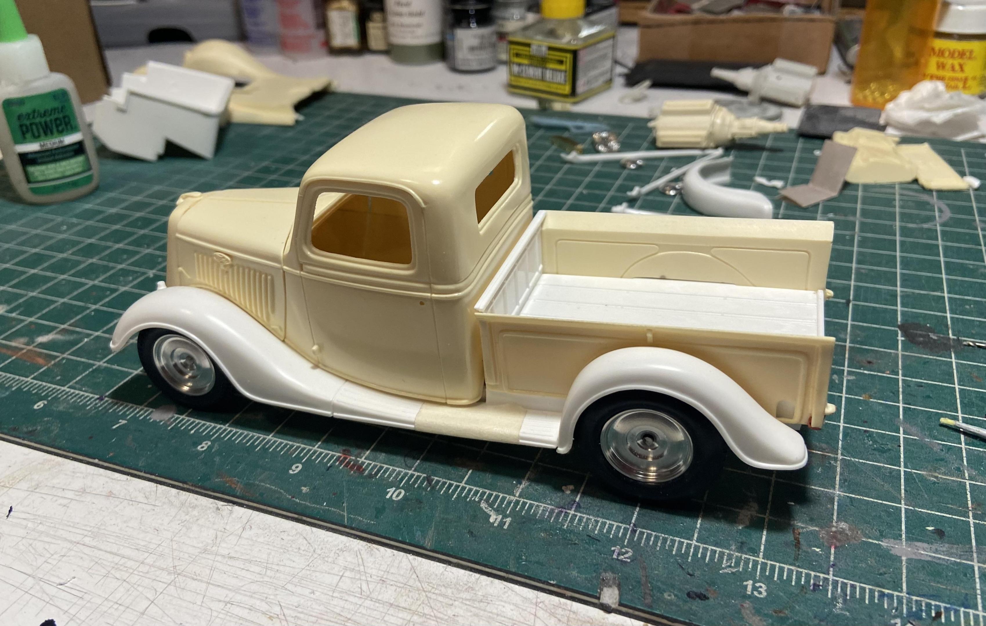This truck is done, so here is a one page build thread. This project was started by Brad Norgaard, a member of our club who passed away last year. This truck was in the early stages on his bench, so I took it on to send it over the finish line. We will never know exactly how Brad wanted to do it, but the parts selection in the tote told part of the story. So, there I was. Seen here are the basics, an AAM resin transkit to convert the Revellogram '37 Ford pickup into a '35. I never knew this kit existed. I supplied the '37 kit. Tote contained a small block Chevrolet engine with a 4 speed, Dancing Bear aluminum wheels. Tires are on their site pictured with the wheels, so they probably came from them too. I elected to use the original kit fender/floor/bed unit instead of the resin, as the resin was cracked and required more body work. The only difference was the bed - a bit shorter on a '35, an easy mod. I erased the spare tire recess in the right running board and sketched the ribs back in with Evergreen strip. No recess, recess. First mock-up with ride height dialed in. Chassis almost done. I used a Revell '32 front drop axle and de-arched the '37 spring and the height turned out well. Split wishbone. I flattened the rear crossmember and raised it in the chassis to lower the rear. I don't know where the engine came from, but probably the '55 Chevy truck kits. Manifold, triple Rochesters, and air cleaners were in a medicine bottle in the tote. Several manifold setups were there, I chose this one. Valve covers were also in the tote, I added Tamiya clear orange between the ribs. Exhaust is modified '70 Mustang with shortened mufflers, ram horn manifolds were from my parts stash. Driveline/chassis paint is Tamiya Metallic orange. I made the wheels roll by adding axle retainers under the hub caps. Interior - resin '35 dash, shortened column with parts stash steering wheel, custom mixed flocking. I threw some pleats on the seat and gauge decals in the cluster. Paint is Tamiya Racing White. Body is Tamiya Brilliant Orange, AKA McLaren orange, over Tamiya fine gray primer. I was going for a Creamsicle look. First fit to the chassis.