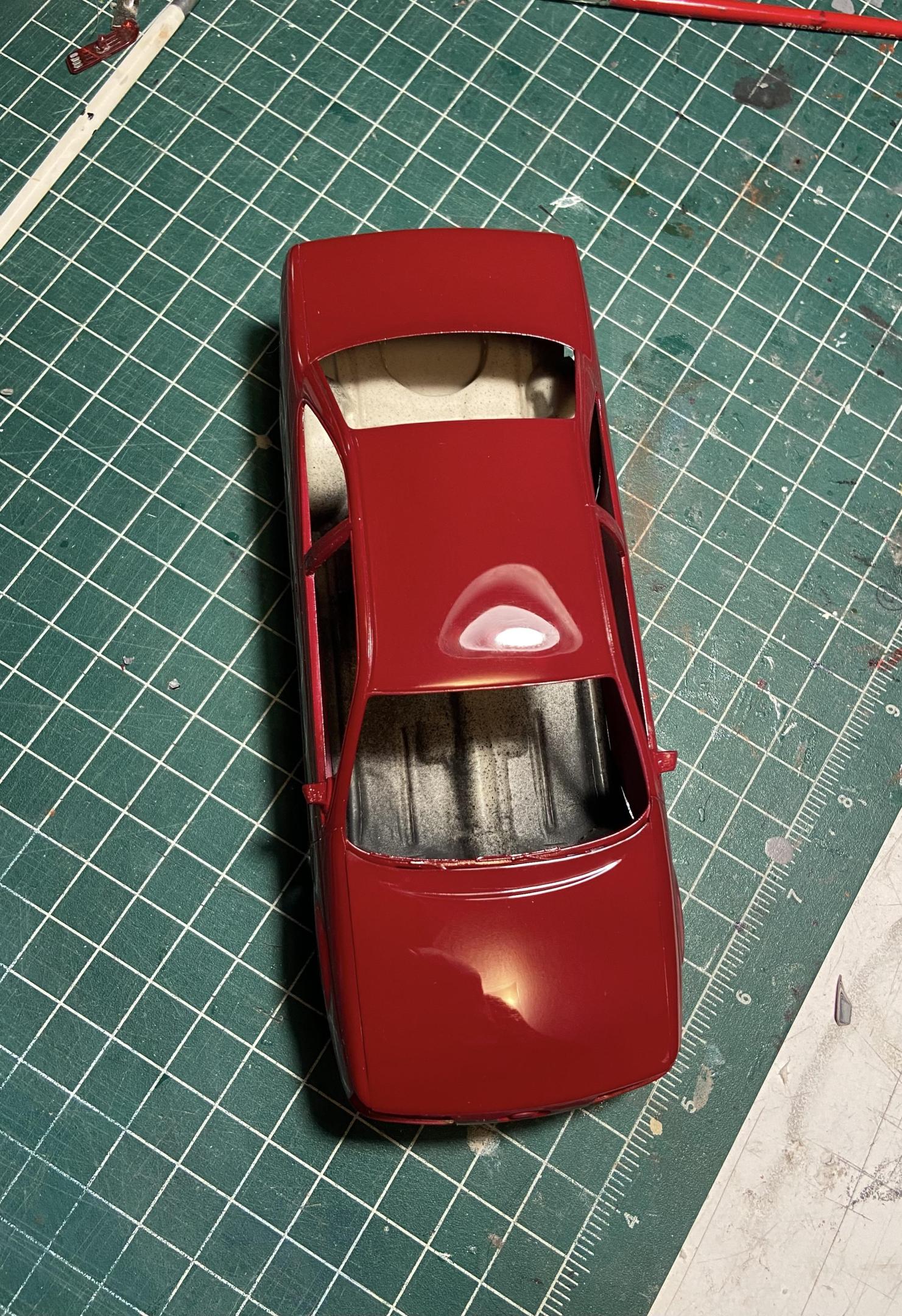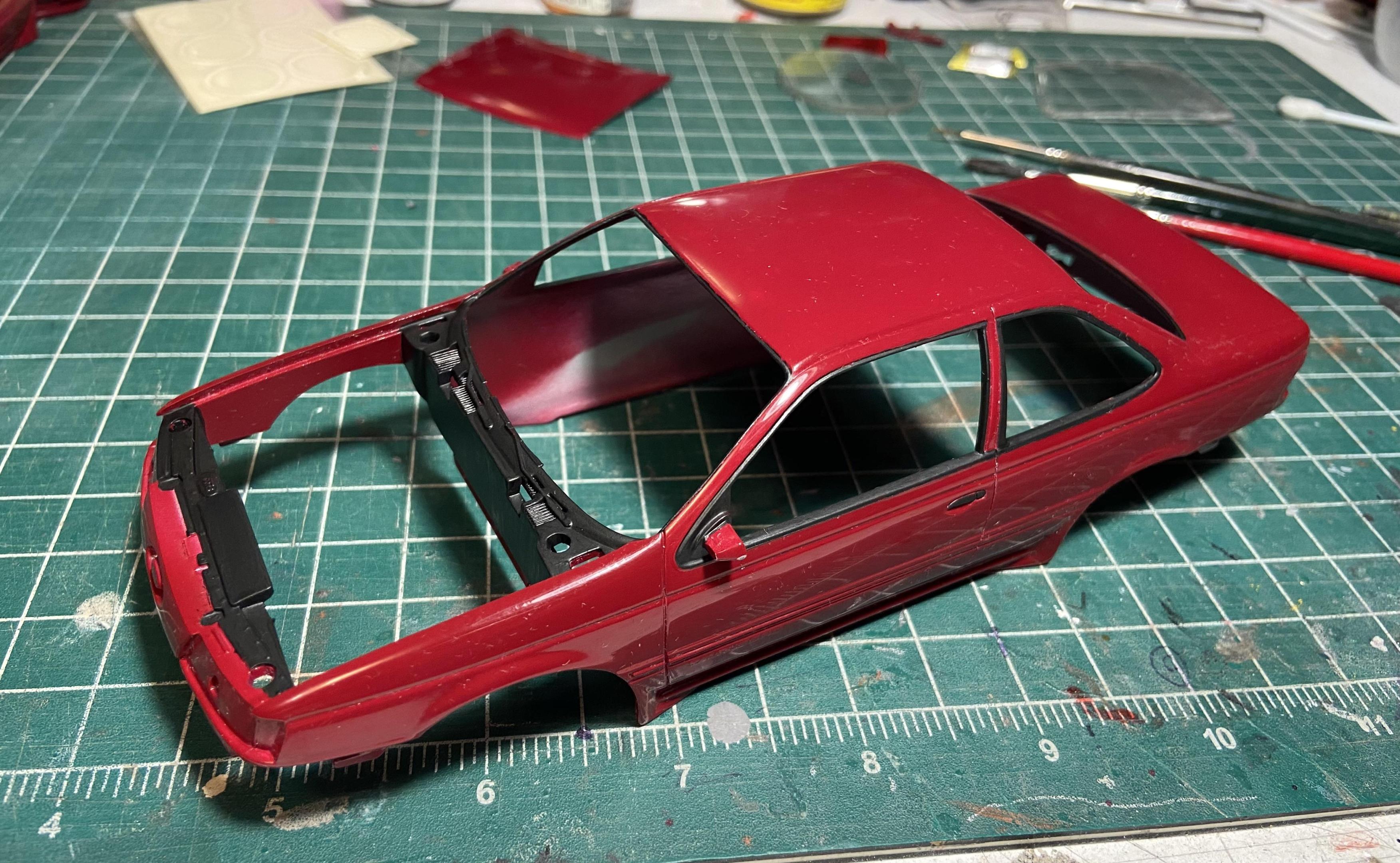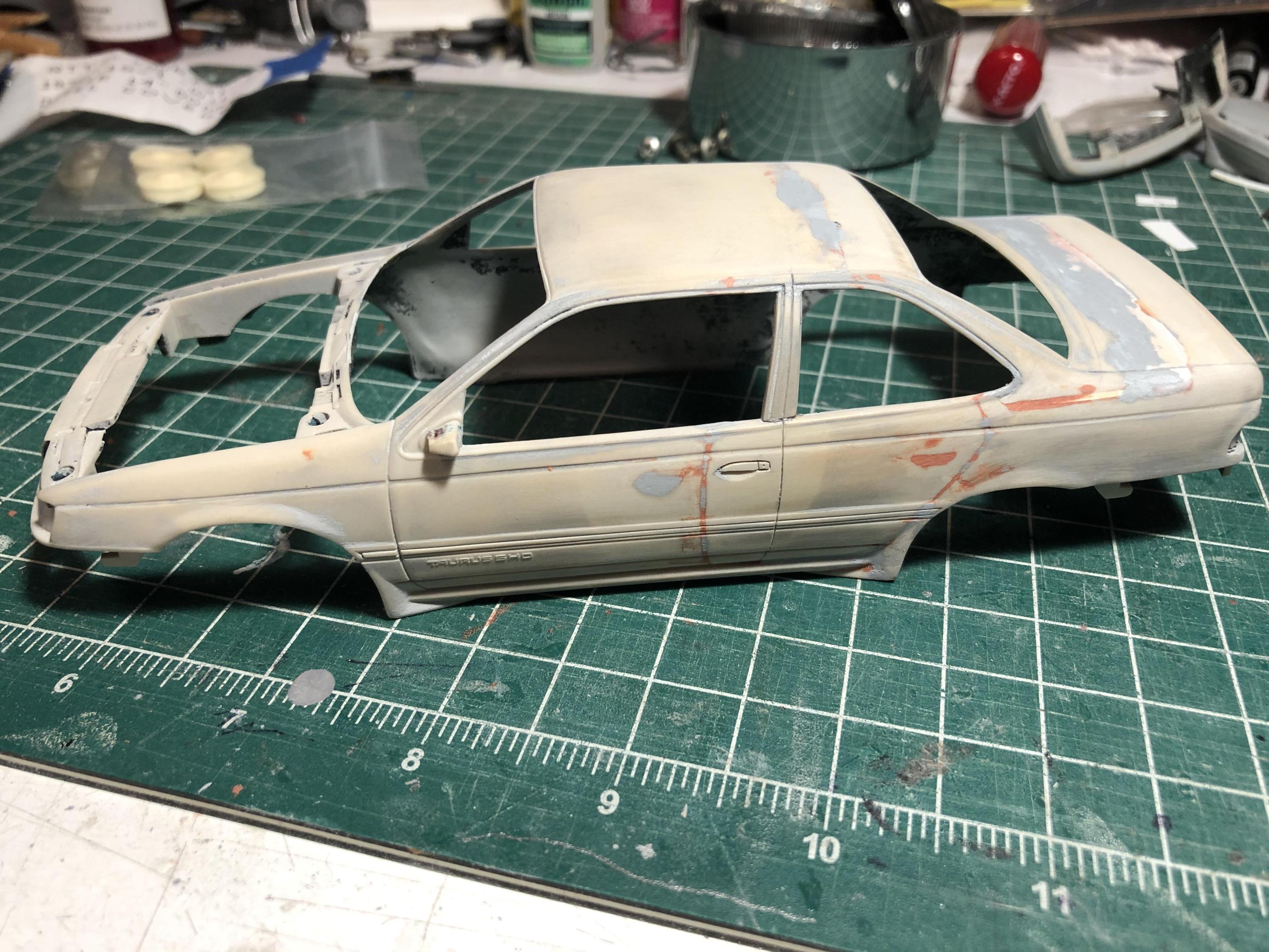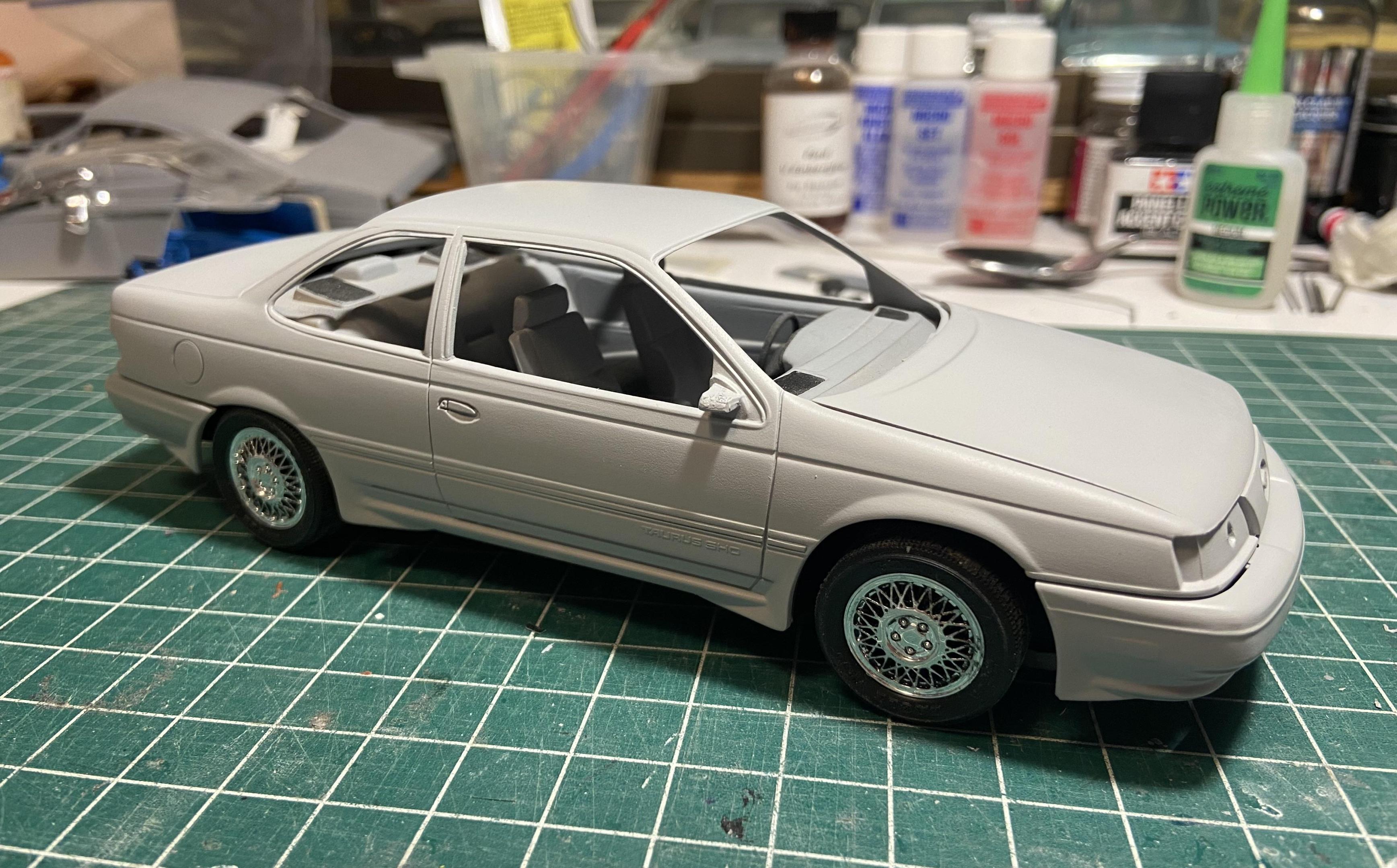 Once upon a time, Ford decided that it was going to offer the baddest 4 door sedan in all the land. People laughed out loud. They delivered. People stopped laughing. It was a different world back then, but the SHO with it's Yamaha engineered 3 liter V6 was the business, and the sedan arms race started then and there. In those days, the model companies released new models at the same time as the new cars, and AMT dropped their very nice, promo based kit on the market while the cars were filing into the dealer show rooms. I went to the local Phoenix Toys R Us and got the new kit the first day they had it, back when TRU stocked model kits... and existed. I dove right in, originally intending to build it box stock. Like that ever happens. I looked at the well executed body and I thought to myself "I wonder how this would look as a 2 door coupe?" About like this. The only surviving photo of the original build showing what I did; re-scribed door lines to 2 door configuration, moved the posts back, eliminated the rear most stationary glass posts. But there was a problem, the 1/4 windows were too big, it reminded me of a Volvo 242 in that way. What now? I decided to move the C pillars/rear window/back of the roof line forward to make the windows and roof smaller and the trunk lid longer to bring it it into proportion. I shortened the interior shell to match the new green house length, and that was pretty much that. I painted it in some sort of Testors maroon, possibly Model Master, and called it done. I took it to the club meeting, the theme that month was Customs. Only a couple of guys picked up on what was done, others guessed that it was a Thunderbird or a Tempo. When word got out, it won the plaque that day, the same day the above photo was taken. But a few weeks after that, tragedy struck. Sort of. I used 3M spot putty, AKA red lead, back in those days, and as I was in such a hurry to get this car done for the meeting, I didn't allow enough time for the putty to cure - and it shrunk everywhere, revealing all the door lines, the trunk surgery, everything. I was bummed. So I stripped it down, began to reapply the filler, got frustrated and bored, and put it in a box - for 33 years. Fast forward a year and change ago, and the subject of the SHO coupe came up in a discussion with a club member, so I dug around and found it (for reasons unknown) in a '64 Galaxie box. I started fooling around with it, and before too long, the body work was finished once again - in Tamiya filler, no more red lead. The idea this time around was to do what I wanted to do back in the day, paint it in the factory 2F Currant Red, one of three colors offered on that car in '89. I didn't know anything about air brushes then, that came later, and getting factory colors was difficult and expensive. I called Scalefinishes and Jameston set me up with a bottle, not offered on his site, but he will make you up about any color you need for no extra charge, because that's how he rolls. I painted the body and cleared it with Tamiya TS-13, decanted and airbrushed. Masked and sprayed the black trim.