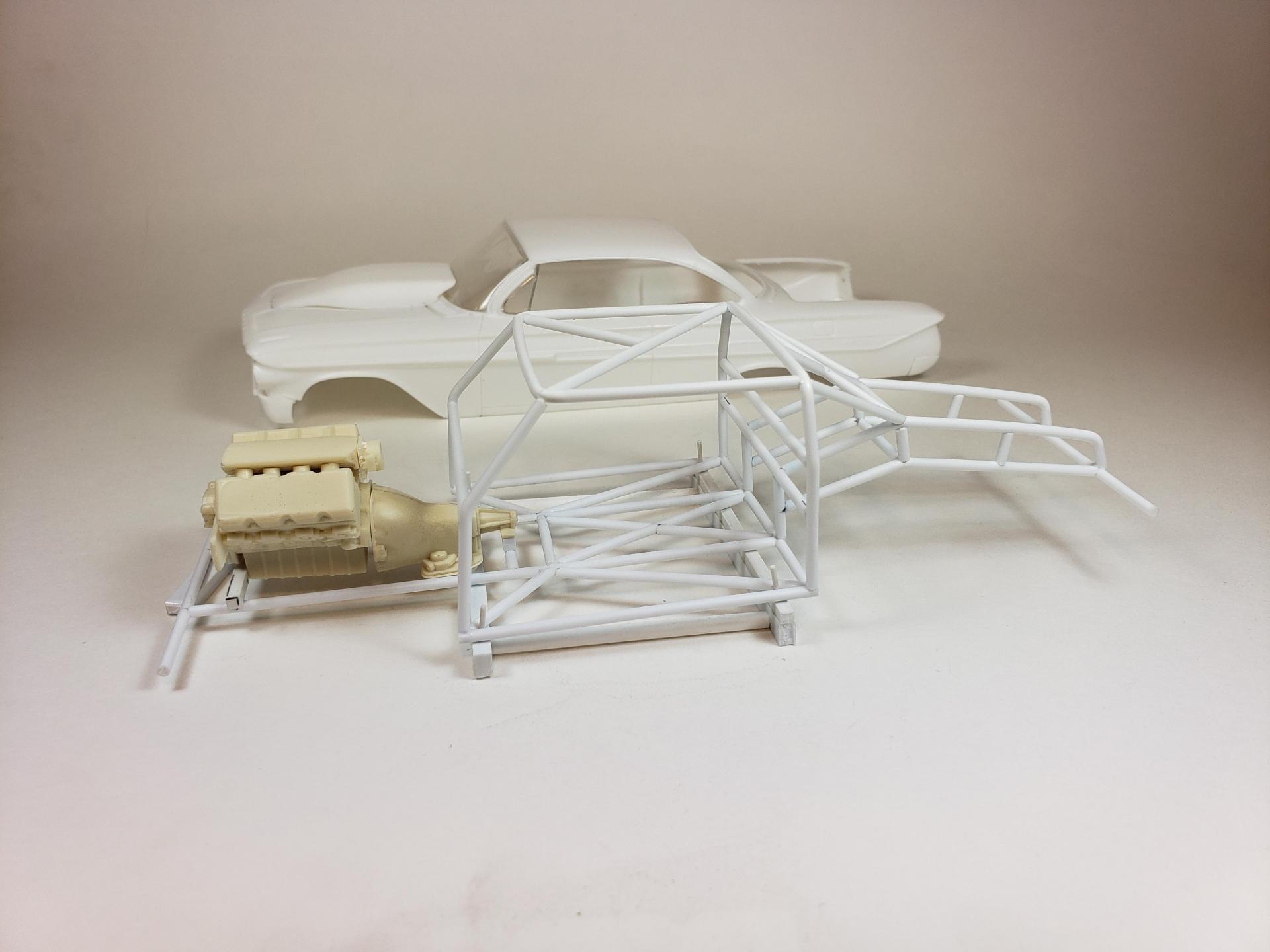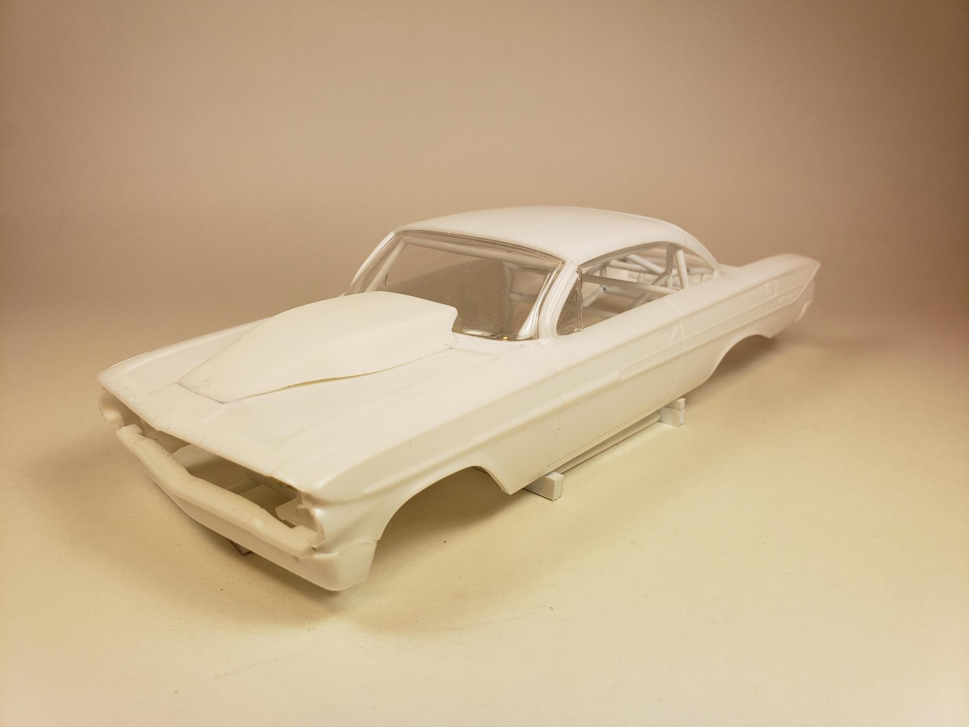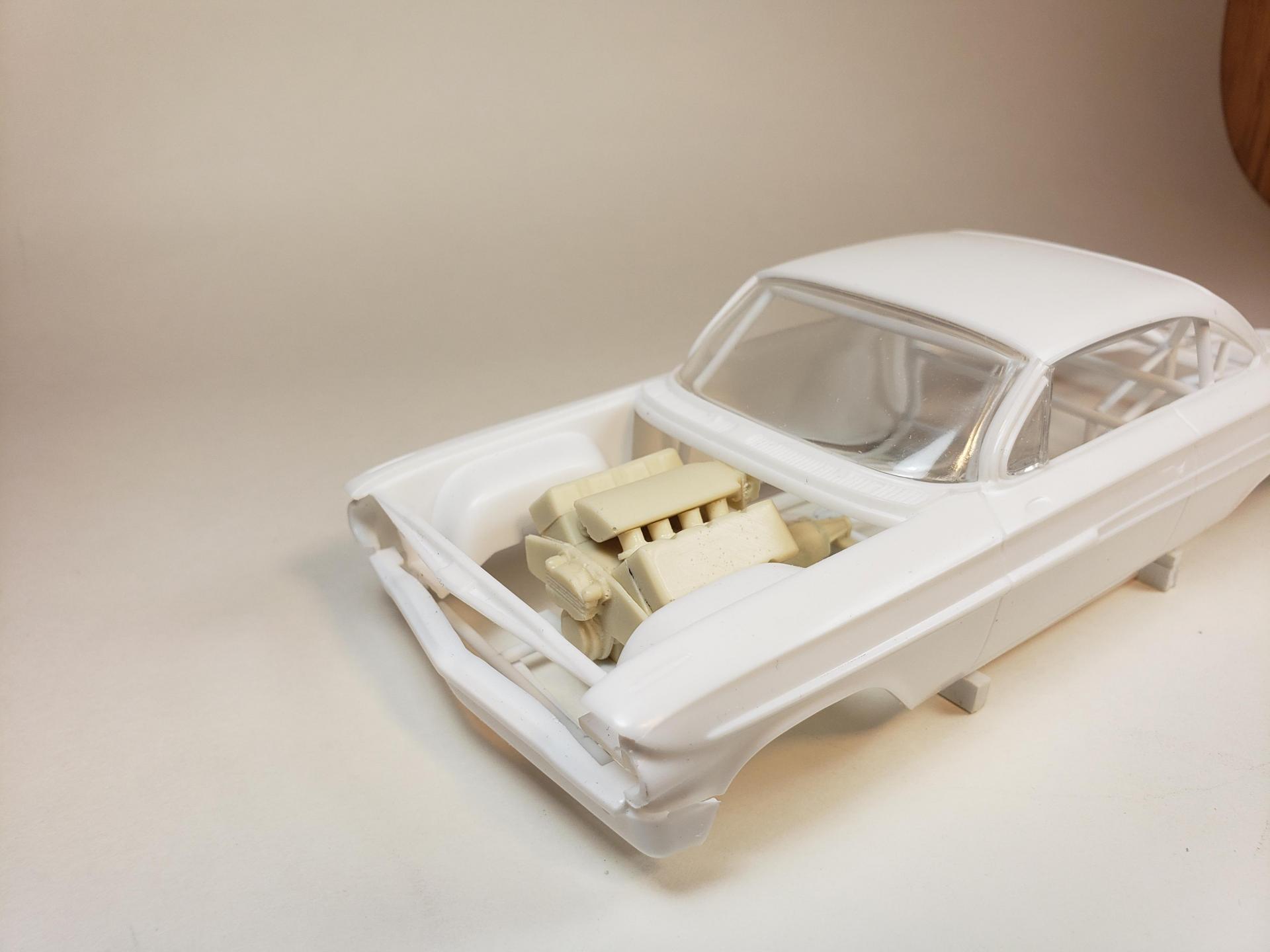 hello all! small update set the engine in place (temporarily) to set up the turbos, firewall and front rails. may move the engine back a bit depending how where the turbos and piping set. also cut a turbo scoop from a resin hood and fitted to the impala hood still a little work to go but I'm liking the look. engine is a sonny's 932 powergide trans. thanks for looking -