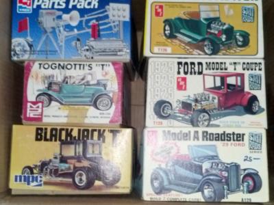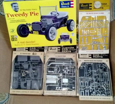 Getting back into some hot rod modeling I am trying to find the best / most accurate parts to build a '50's to early '60's T bucket model in 1/25th scale. I have been out of the hobby for some time, but I have been digging through my stash and I realized I do have a wide selection of parts and kits to work from. In my stash: Revell Vintage Parts Pack T Bucket Chassis - complete Vintage Parts Pack '23 T Bucket body - complete Vintage parts Pack Speed Equipment - complete New Reissuse Roth's Tweedie Pie Butterra Chassis T Sedan and Phaeton - well detailed but too new for my current tastes for a chassis AMT Vintage Street Rod Series '23 T Full Fendered Roadster - complete Vintage Street Rod Series '25 Tall T Coupe - complete Various Double T kit parts and model - built-ups Parts Pack Drag T Chassis MPC Tognotti's T Show Rod - Started but no paint - some sub assemblies BlackJack T Street Rod Any suggestions? I want to do something like Tommy Ivo's T or the Kookie Car to early 50's in style and maybe a Rat Rod. I am impatiently waiting for my local shop to get in the double T kit and the '25T fruit wagon kits. Online dealers maybe cheaper but the shipping makes them more expensive IMO. What do you think of the suspension from the '29 A truck from Revell? Some pics of my sta-a-a-a-sh!