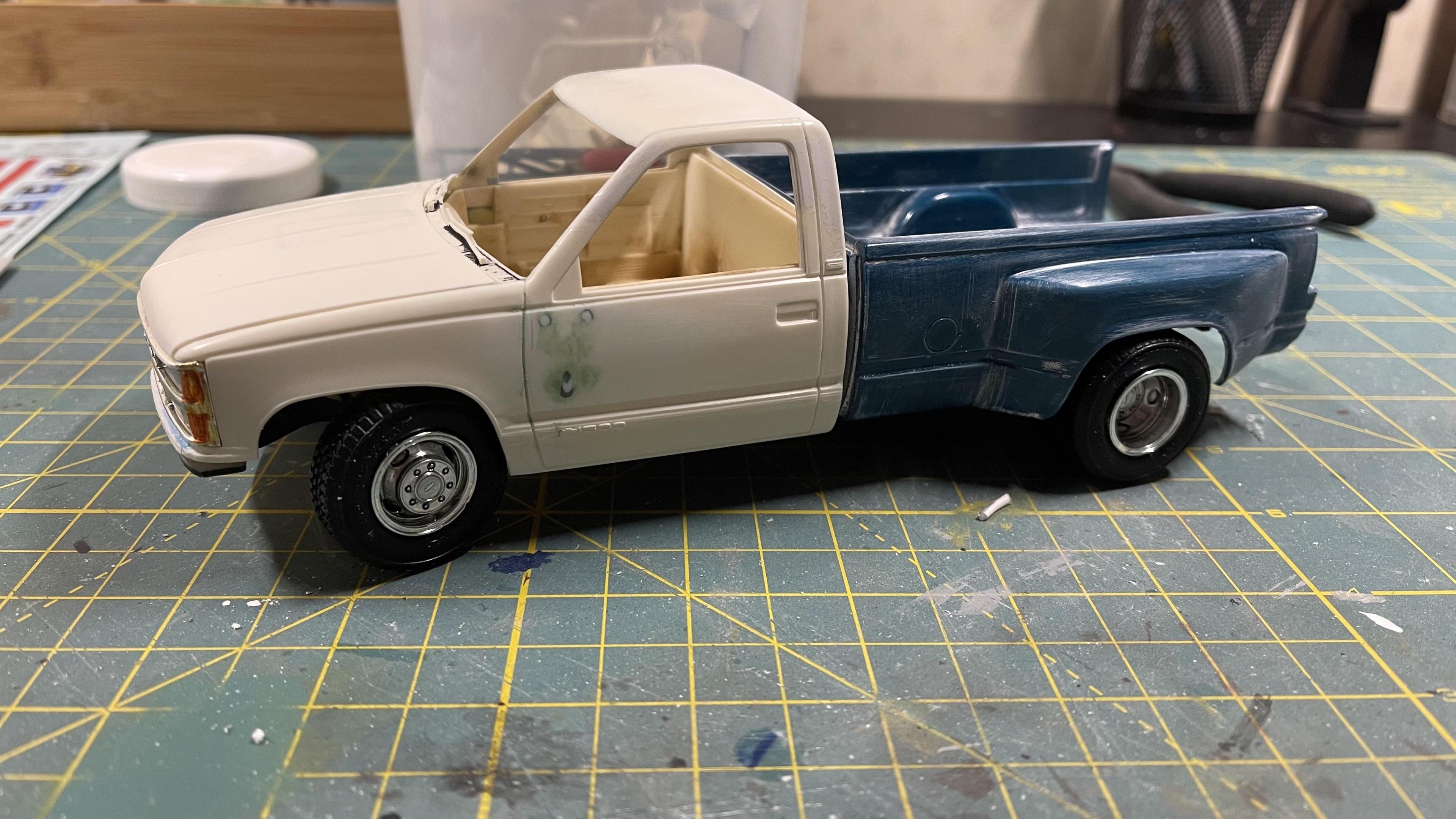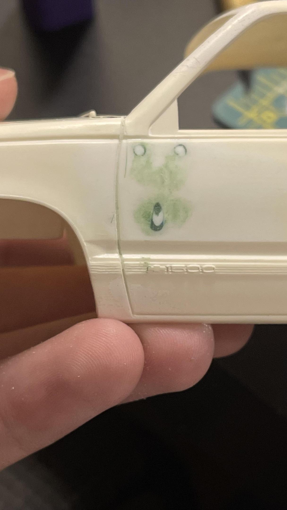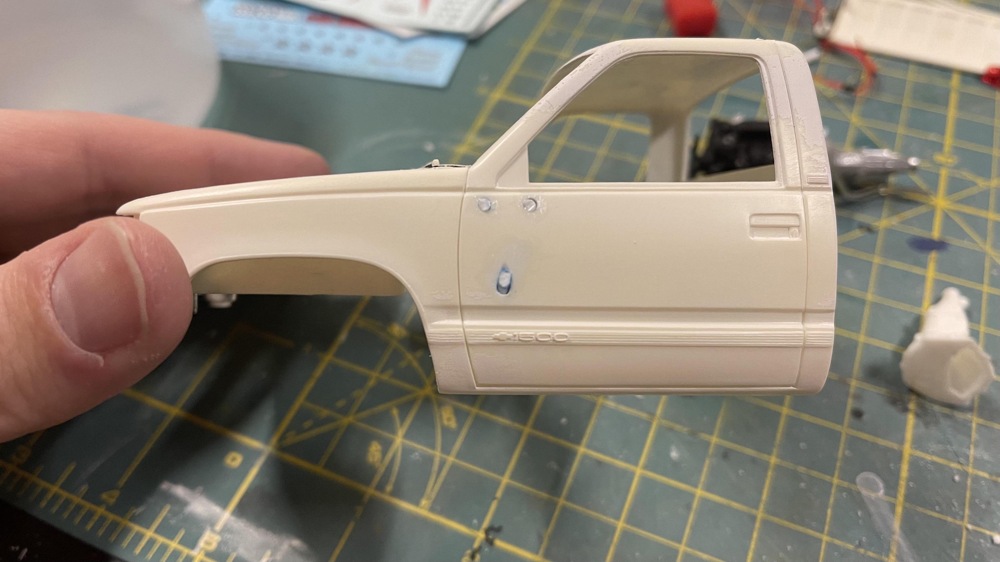 I wanted to build a nice work truck for my model fleet and garage diorama. I have a soft spot for GMT400 pickups (I wish they would re-release these kits!) so naturally this was an easy choice for a build. So here we go.. I had this built-up that I did several years ago. It was ok. So I stripped it clean. Here it is stripped and all laid out. The chassis won't need modified, so I left that alone. I can weather over all of that anyways. I am planning on ditching the kit motor and using a resin 5.9 Cummins from Trailer Trash Kustomz. I would like to paint the truck red, but think a navy blue would look good as well. The kit decals are pretty rough, so i purchased some new decals from Rays Decals. Looking forward to getting them. I'll try to scratch build some tool boxes for the bed. I had added some poorly scratch built tow mirrors to the first build and they left some large holes in the doors. I had to fill those right away! I filled them with styrene rod first... And a little bit of putty and sanding... There it sits now.