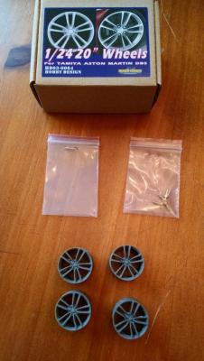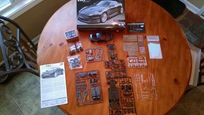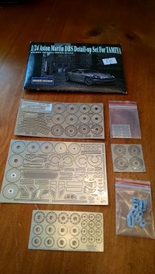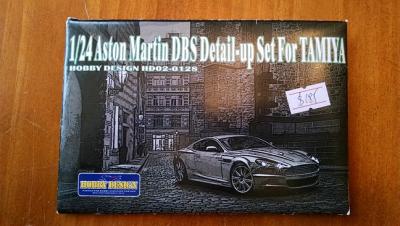 Hi guys. With my R-33 nearly wrapped up, I'm going to be working on my next model, Tamiya's Aston Martin DBS. However, I'm not only in love with the DBS (and it's evil sister, the DBR9S) but specifically, the Carbon Black Edition. It sported a gorgeous black paint (typically, I HATE black paint jobs, they hide the beauty of the car), special gloss black diamond turned wheels, and enough carbon fiber trim to resink the Titanic. Anyway, away we go! the rims will need cleaning up AND after test fitting the tires, the rims are not only too wide, but they are not big enough for the rubber. There is just a very small gap between rim and tire, it's hardly noticeable, but it does allow some "play" in the tire and rim. SO, I will have to attach a piece of styrene around the rim to widen its diameter. four nasty mold lines dominate the sides of the car. Thankfully, the rear ones run down the B pillar and across the ducktail spoiler, the front ones run down the A pillar and into the headlight assembly. Those'll have to go! and for the PE, Hobby Design. And the whole build: Not pictured is the Scale Motorsport 1/24 twill weave carbon fiber sheets.