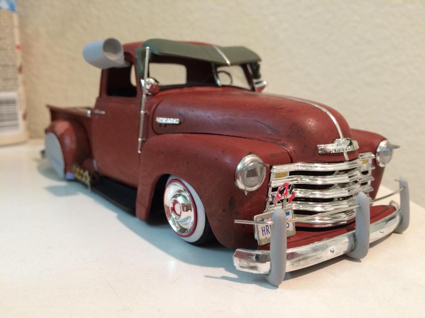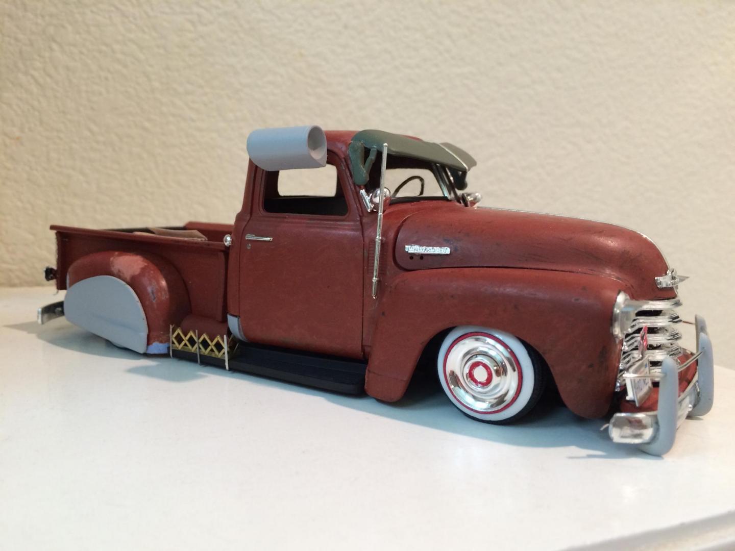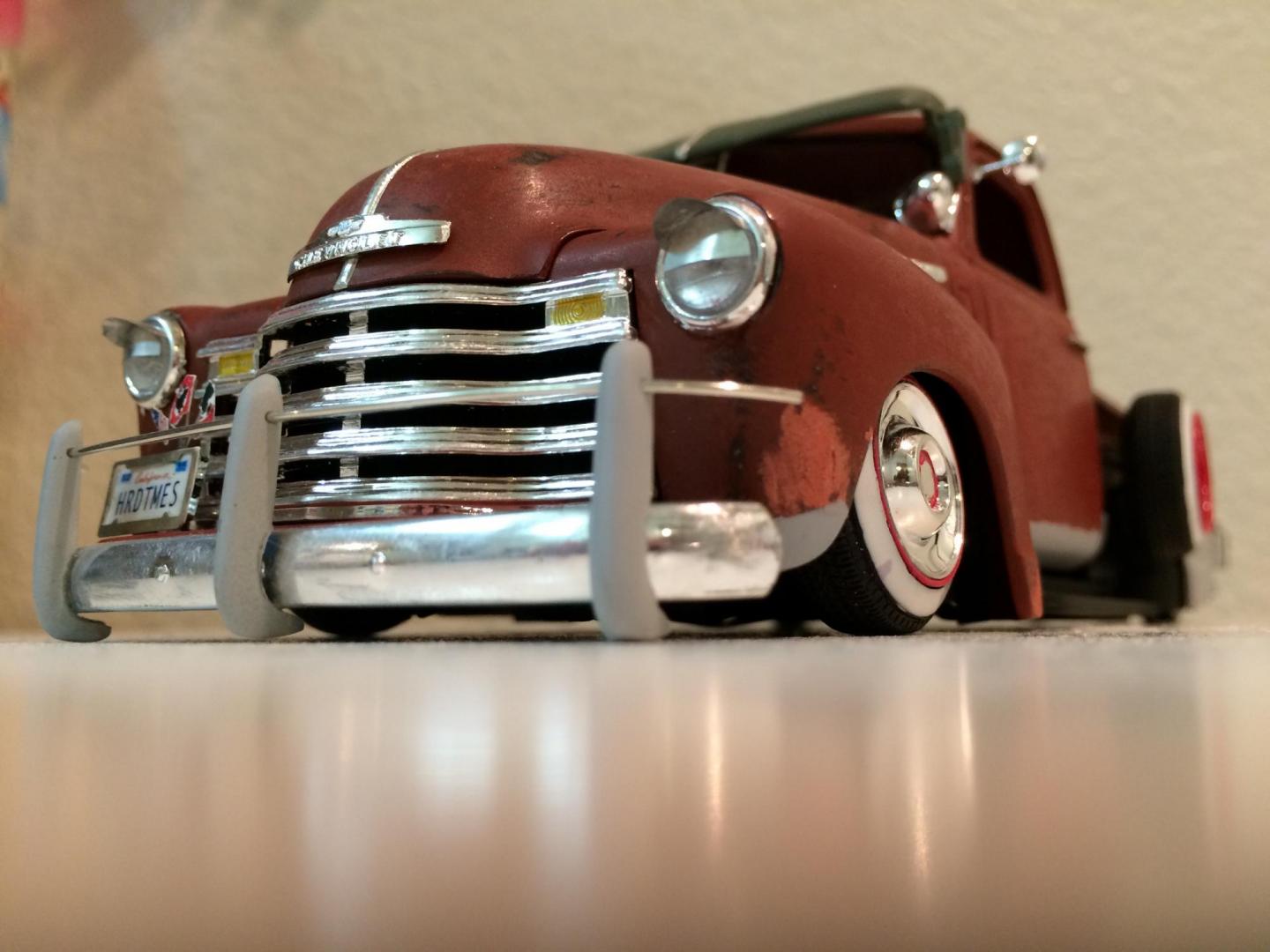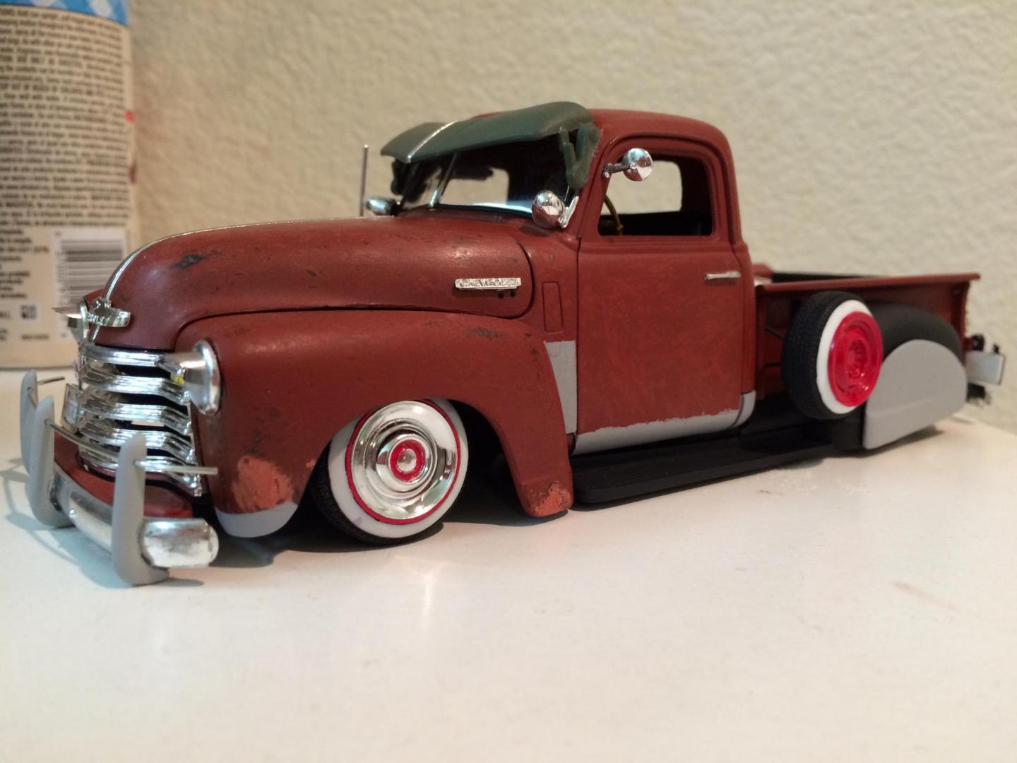 Here is a 1950 Chevy Truck that i built as a work in progress truck/daily. I've seen a couple 1:1s like these and decided why not build one, but for some reason i think this one took longer to build then one those that i've built with full paint and gloss! Red primer with touch ups and bondo spots, custom made spare tire fender and spare tire carrier, dropped stock suspension, custom made 560 white walls, custom made from bumper cattle guard, custom made step board luggage carrier, and a bunch of other misc items.