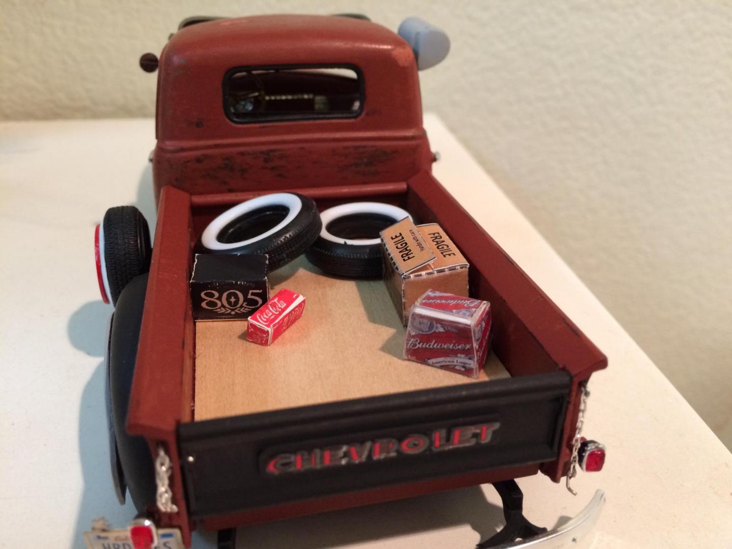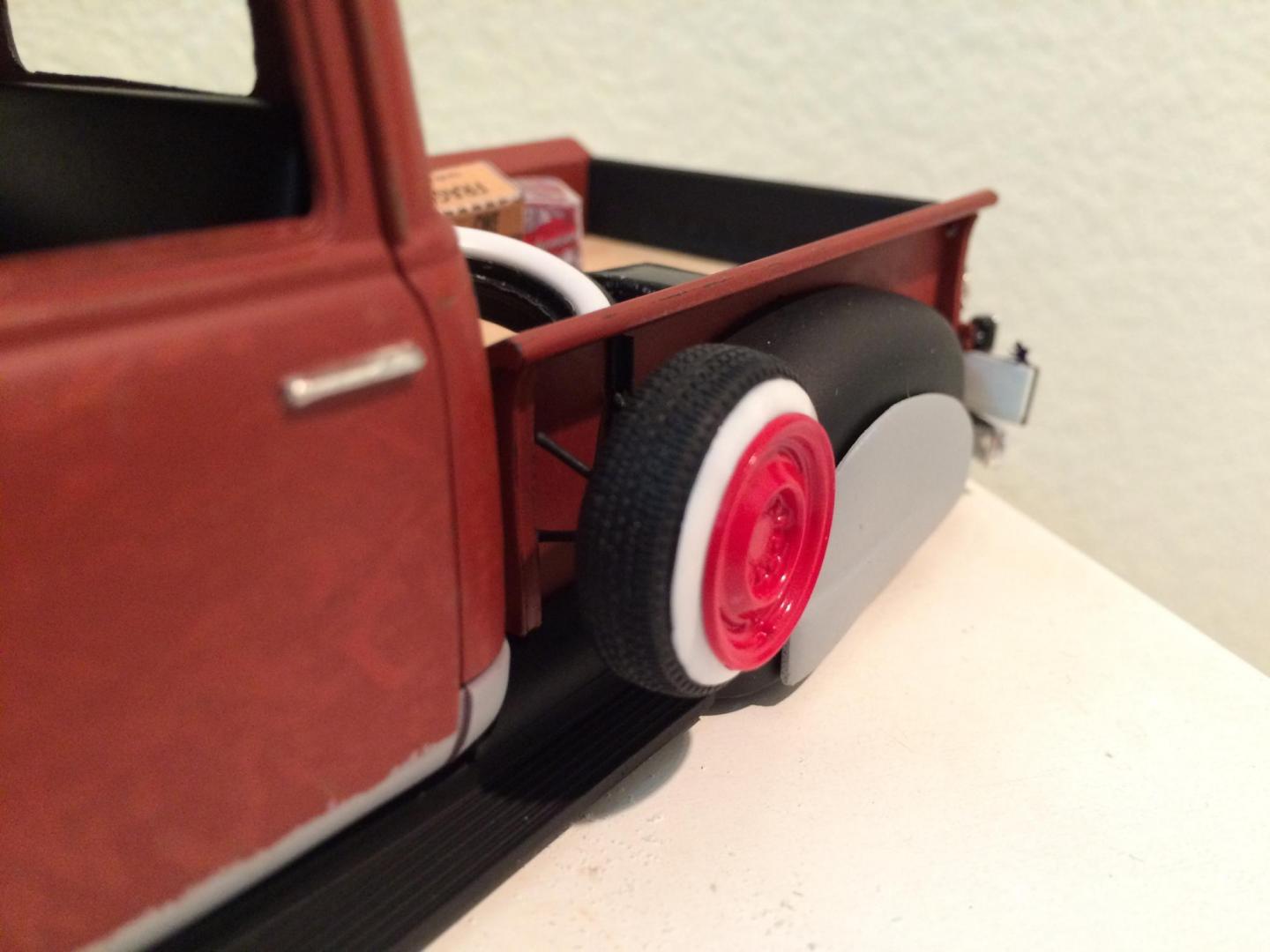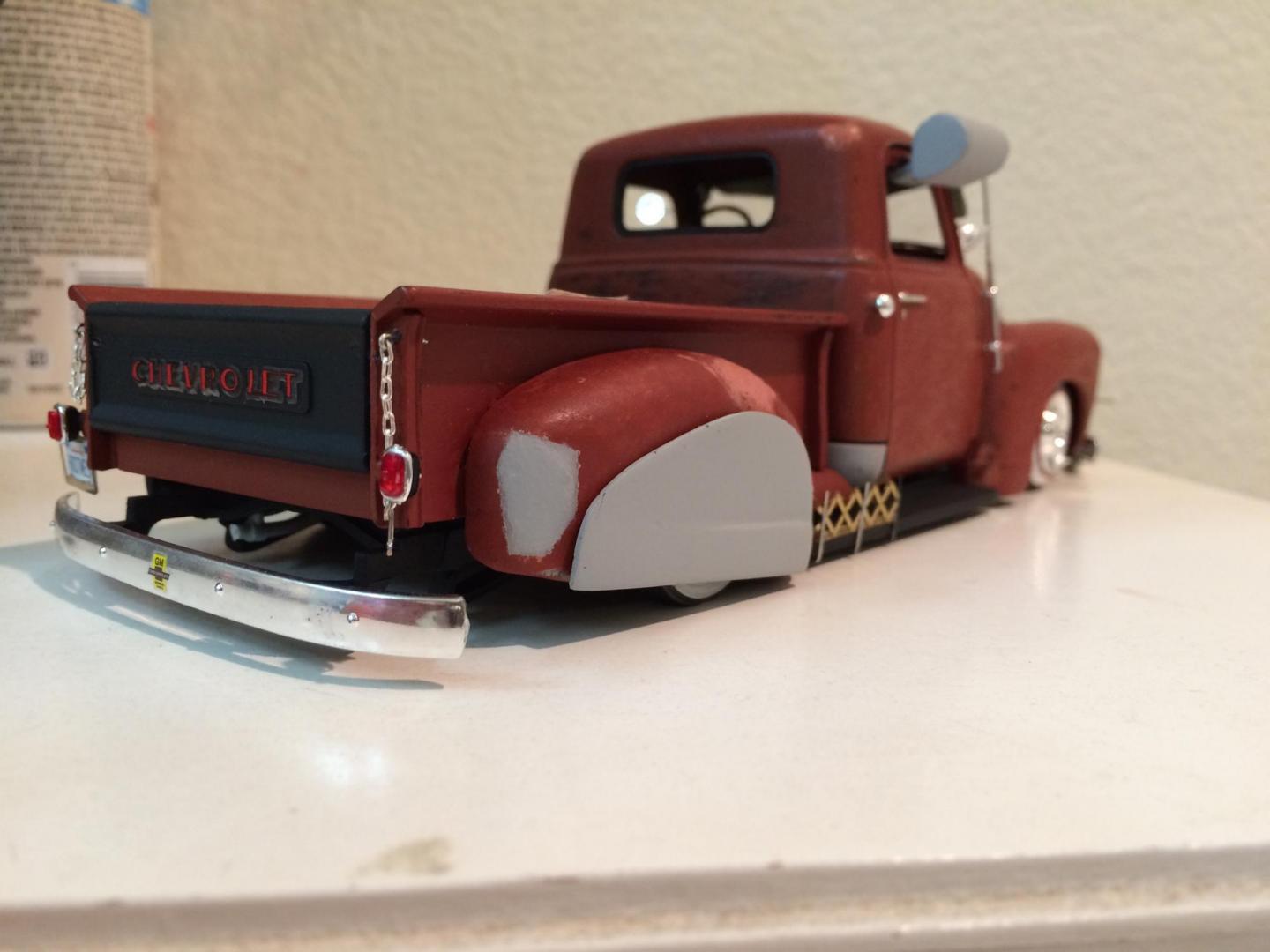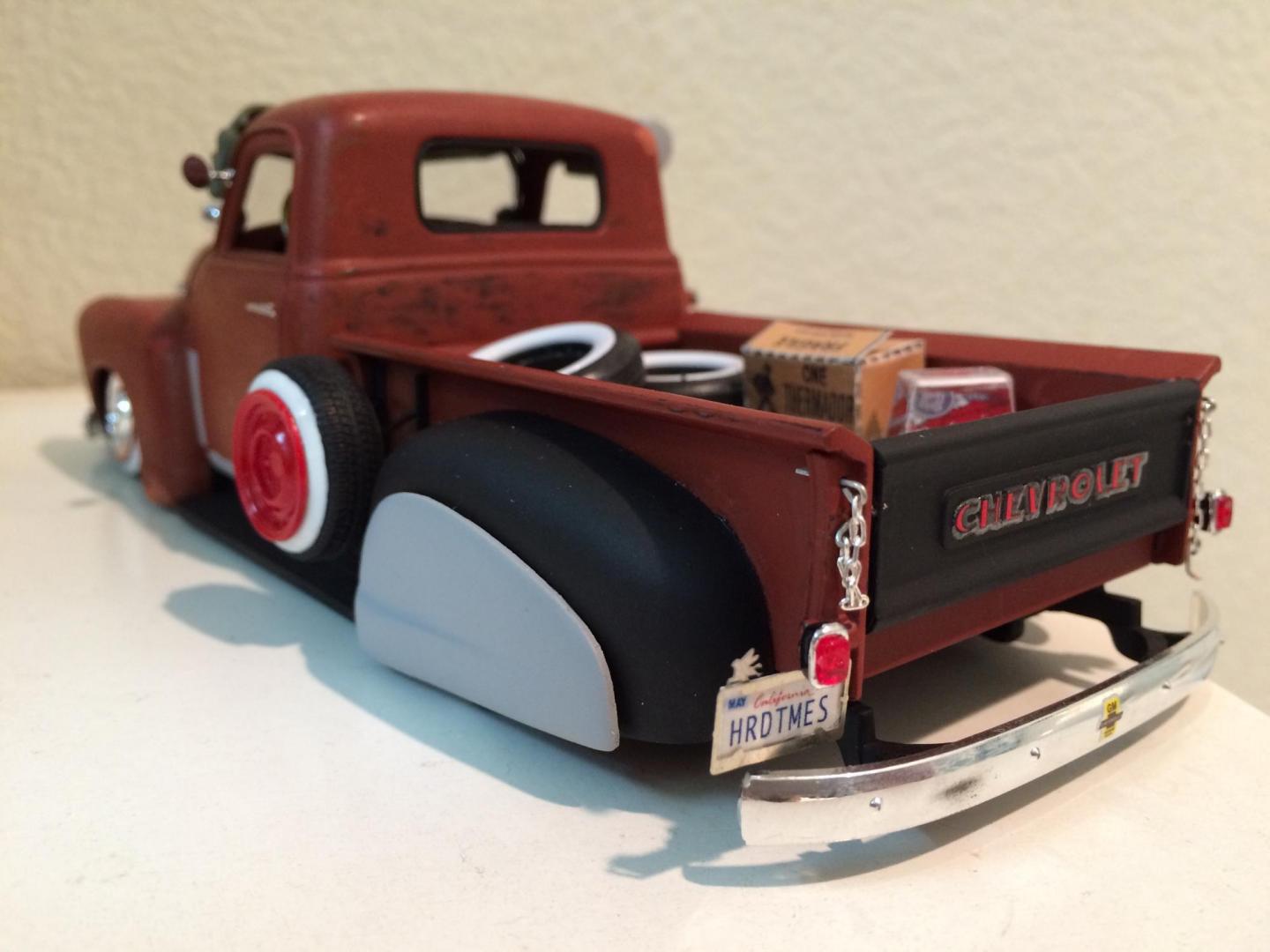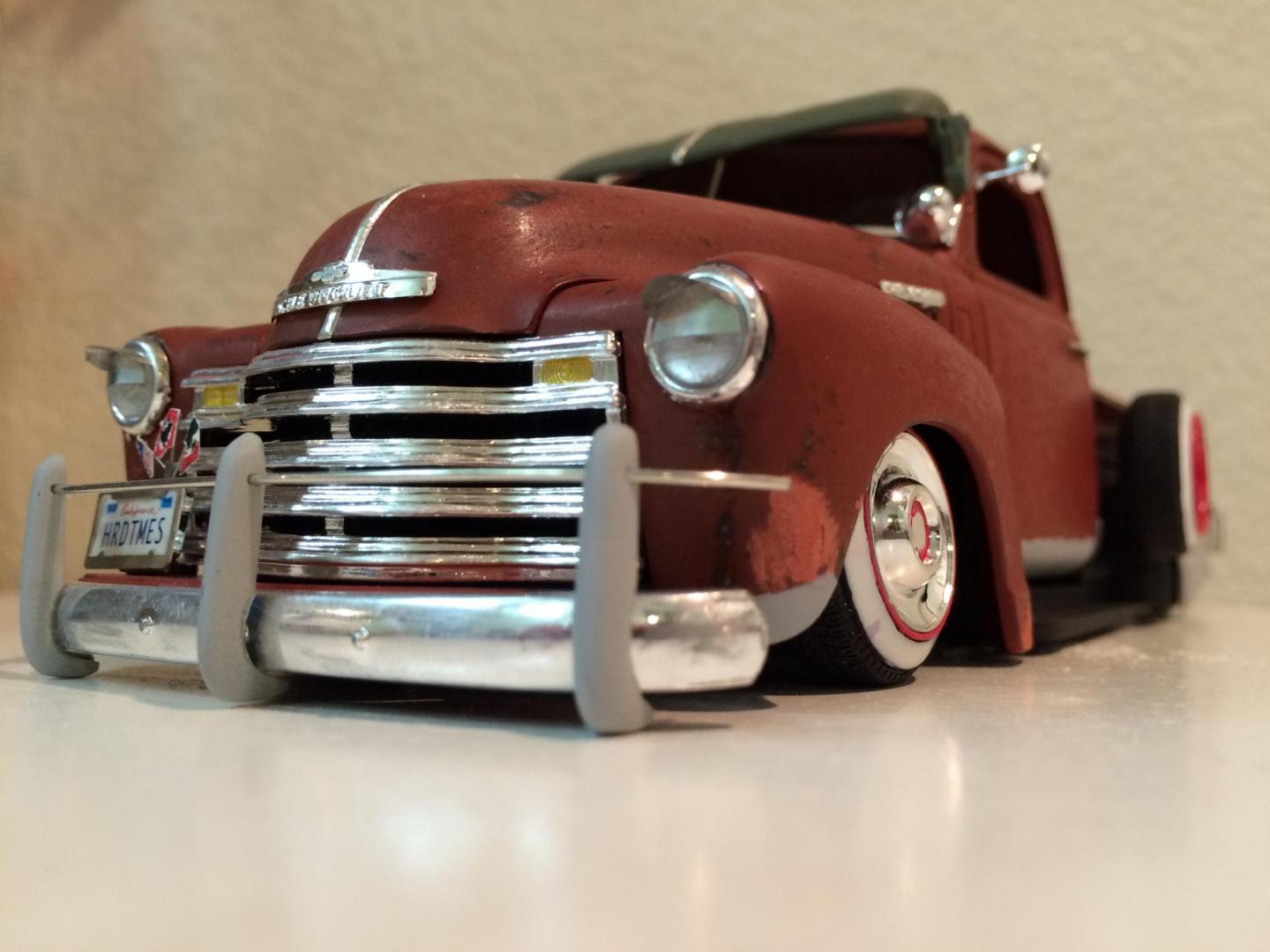 Here is a 1950 Chevy Truck that i built as a work in progress truck/daily. I've seen a couple 1:1s like these and decided why not build one, but for some reason i think this one took longer to build then one those that i've built with full paint and gloss! Red primer with touch ups and bondo spots, custom made spare tire fender and spare tire carrier, dropped stock suspension, custom made 560 white walls, custom made from bumper cattle guard, custom made step board luggage carrier, and a bunch of other misc items.