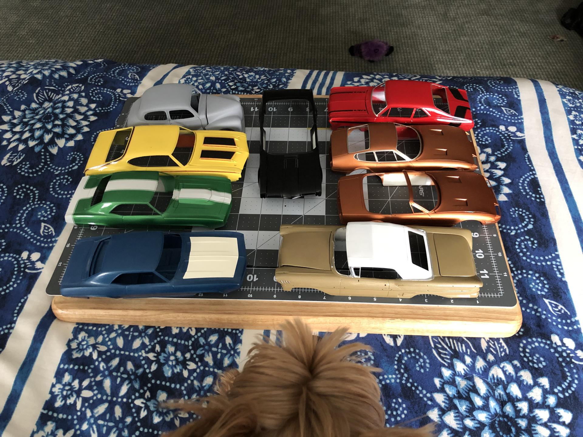 OK everyone, I came up a little idea on choosing my next bring out your dead project. The 1970 Monte finished up pretty quick. So it’s time to choose a second one for this round. Below are some pictures of potential candidates. Whatever project gets the most votes by Wednesday 6pm eastern will be my next “gitter done” ?? #1 1958 Impala convertible This will be a replica of my father’s first car. The 58 Chevy is very near and dear to me. Here are a couple of pictures of dad’s car. #2 1969 Camaro This one is another family car. My mom drove a 69 Camaro in the mid 70s. Here is a picture of mom’s car. #3 1968 Hurst Olds convertible This one is not really too long dead. I started the conversion on this after I finished at the 69 Hurst Olds convertible a month or so ago. The question on this one would be should I do it gold or silver? I’m leaning towards gold since I already have a silver 68 hardtop. #4 1969 Baldwin Motion Camaro I painted this one around 15 to 20 years ago. The hood is glued in place so there will be no engine detail. This one is eventually to be towed by a 69 Phase lll Chevelle as part of a diorama. It also replaces the Camaro like this that I sold to Joel. #5 1970 Oldsmobile Rallye 350 This is another one that was painted at least 15 years ago. The details are of my own creation. I had bought a set from Fred Cady But was not happy with the hood decals. #6 1970 Yenko Deuce Nova This one was painted in 2008 according to my Fotki page. It’s been sitting in red paint since then. I had drawn up decals on my computer but the trunk decals weren’t long enough to wrap down to the bumper. I adjusted the decals a couple days ago and printed them out. After listening to The Model Car podcast, I picked up a can of Upol spray clear urethane they had talked about, and use this as my test subject. It worked very well. The engine and chassis are pretty much done for this one too so really wouldn’t take much time to finish it up. #7 1971 Ferrari Daytona coupe and spider These are a two-for. The chassis and engines are pretty much done too. But these are very intricate kits by Fujimi. #8 1948 Austin This will be a replica of my friends car. And I will be giving it to him when it’s done. Unfortunately I’ve had it over a year. So there you have it! Eight projects to choose from. Please only vote once. I will tally up the votes Wednesday night! Please cast your vote in this thread.