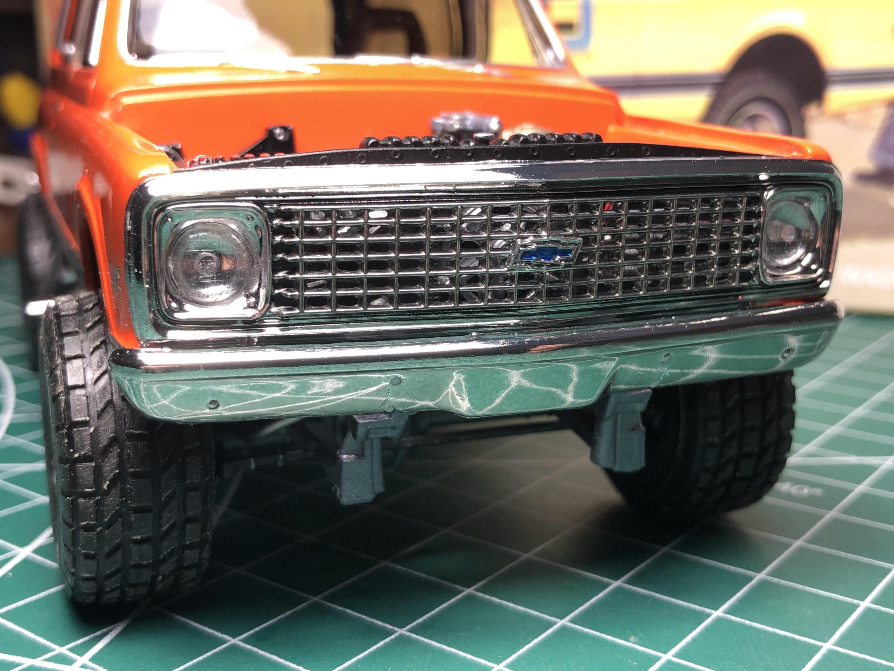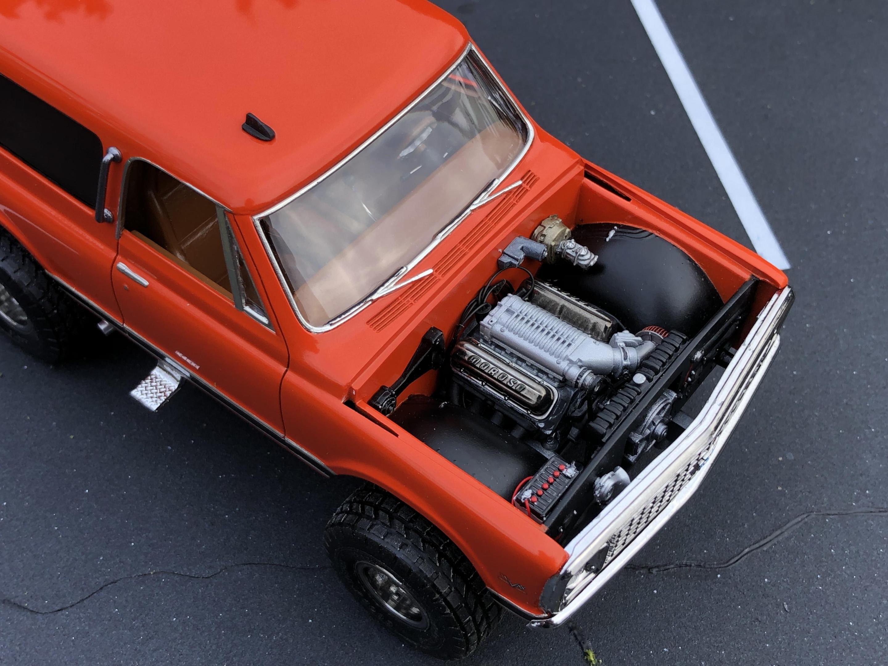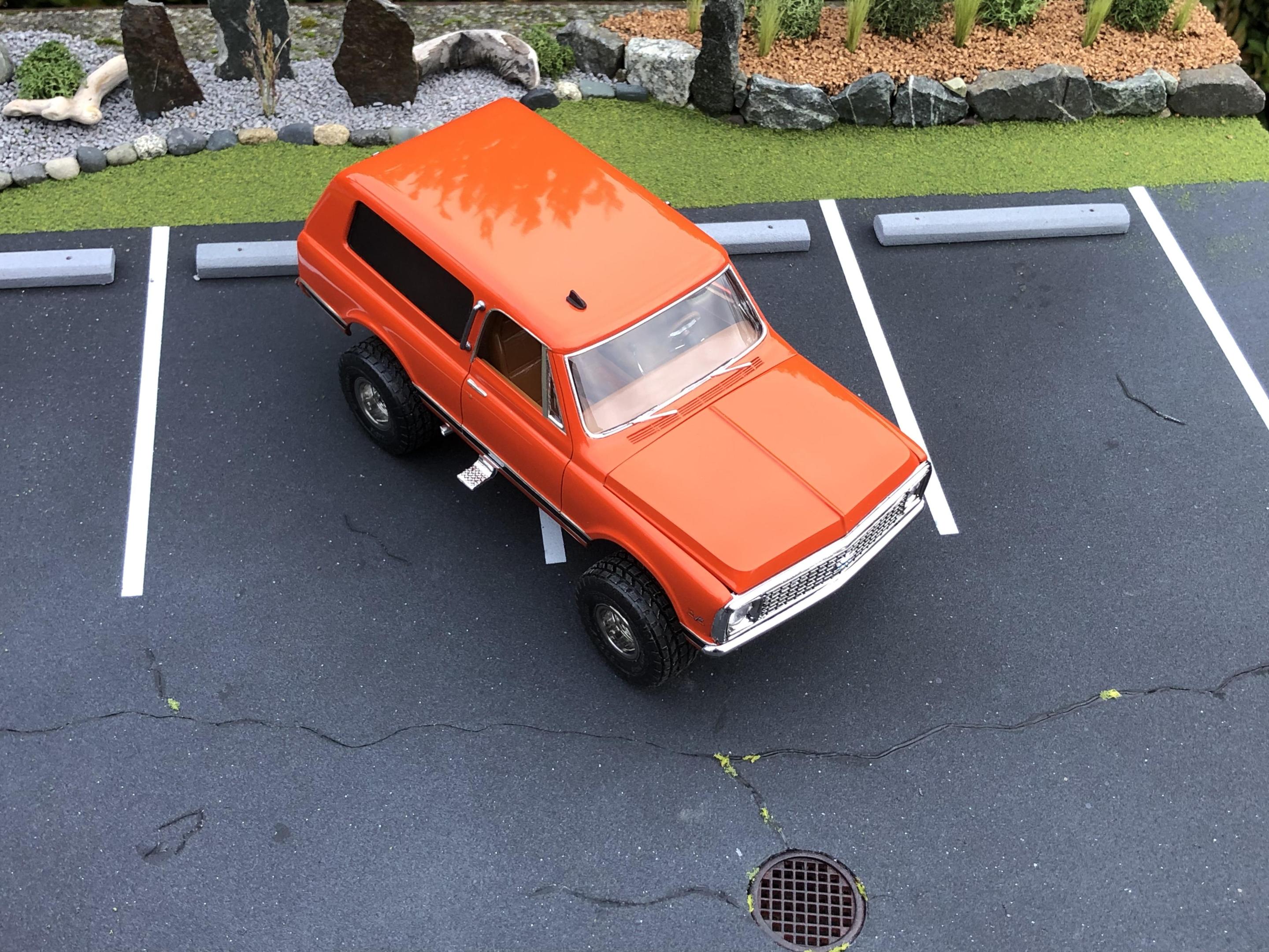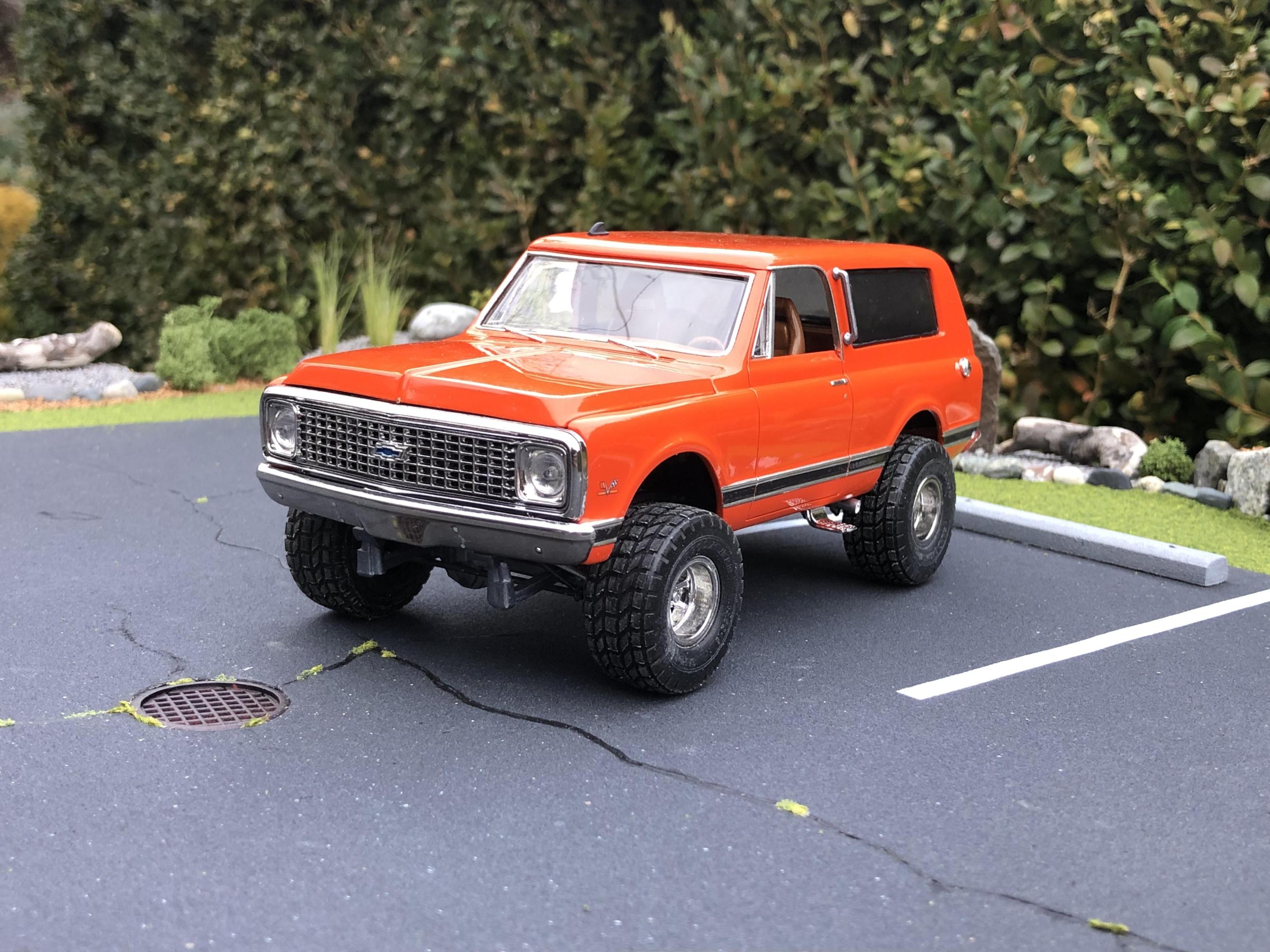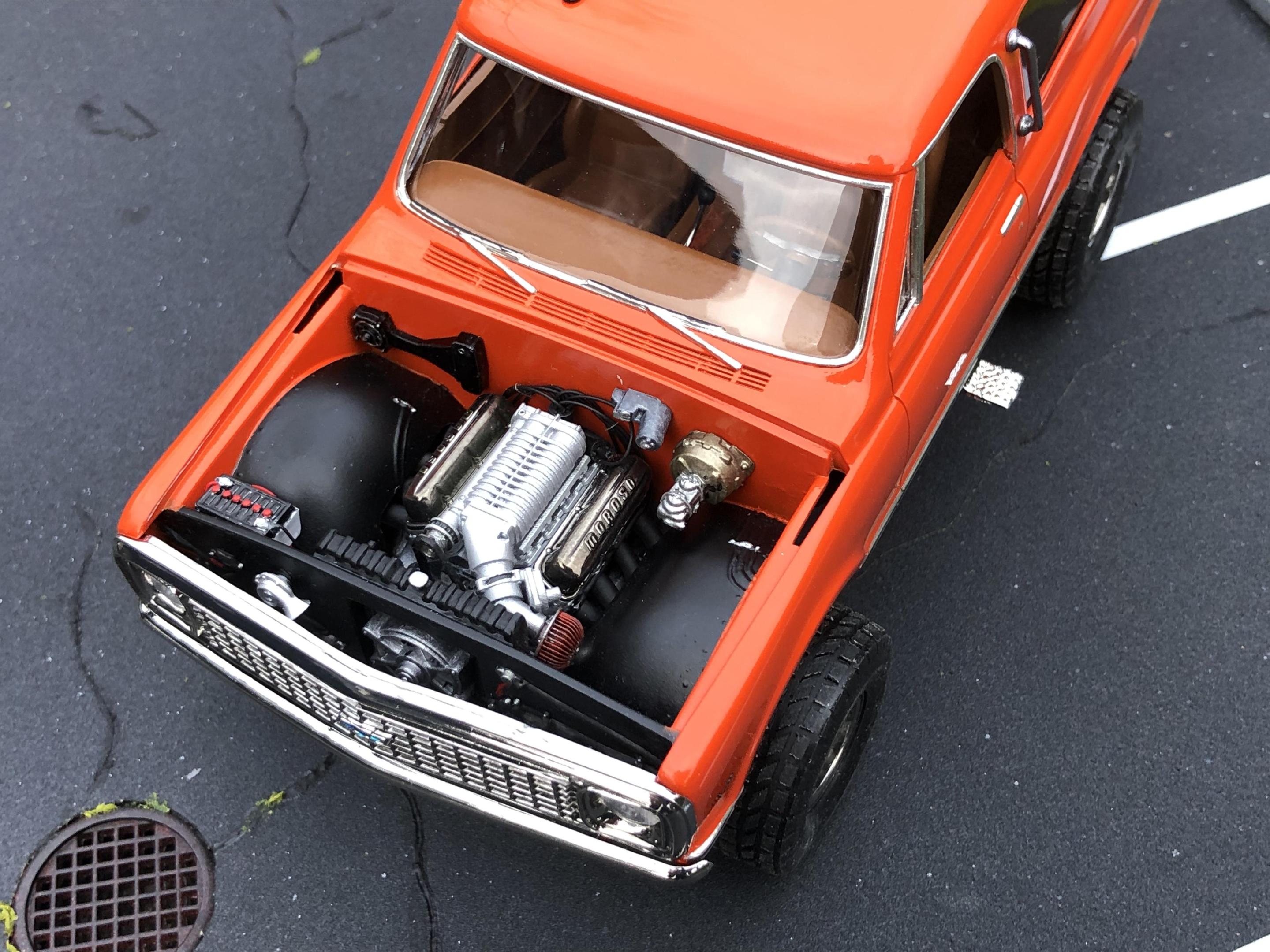 Hello fellow builders, Well, I finally finished this one. The kit has several short comings, I addressed the ones that bothered me most, but didn’t get too carried away. The intent was make some improvements, and end up with a decent shelf model. I used the axles, leaf springs, and some other parts from the deserter kit. The tires are Modelhaus, wheels are salvaged from the parts stash, some kit shocks as well as some from the stash. The engine has a resin whipple blower, and some detail was added in the engine compartment. The interior has parts box seats, the console from the deserter kit, wood grain decals, parts box steering wheel, pins were used for turn signal, and tilt wheel levers, added a nav screen. I added side steps from the deserter, grab handles from the stash, made a nav antenna, the grill was opened from behind. Paint is GM Hugger orange with Mr Colour clear. I’m happy with the overall look, but it’s definitely not my best work. It was built over a VERY EXTENDED period of time, so I never really found my groove. All that said, I haven’t built a 4X4 for about 40 years, so I really wanted to do something different. The next build will be back to my usual low!! Thanks for having a look, and thanks again to those that followed along with the WIP and took the time to comment. As usual, all comments welcome. Cheers, Steve