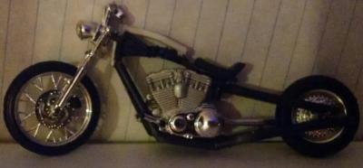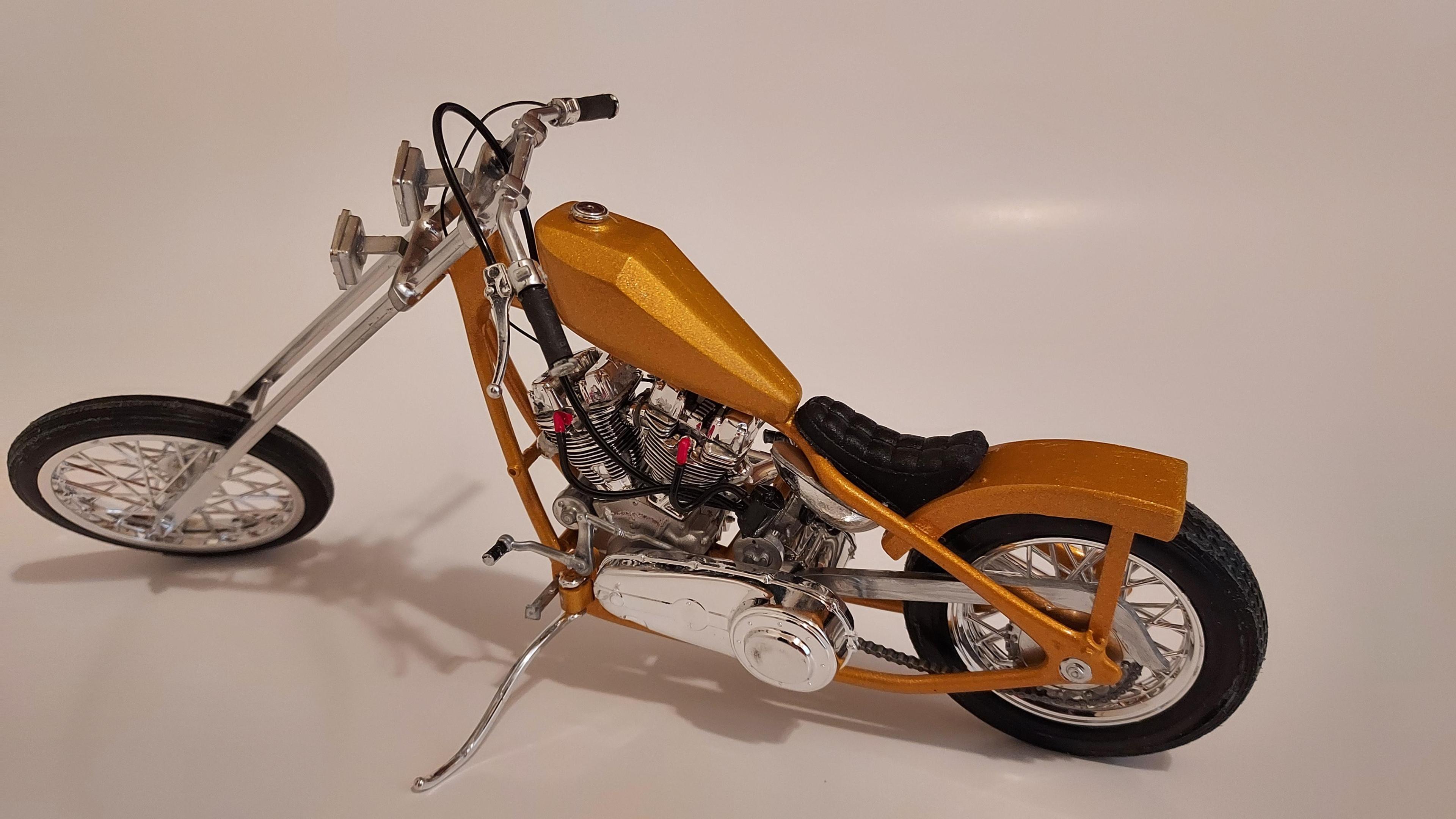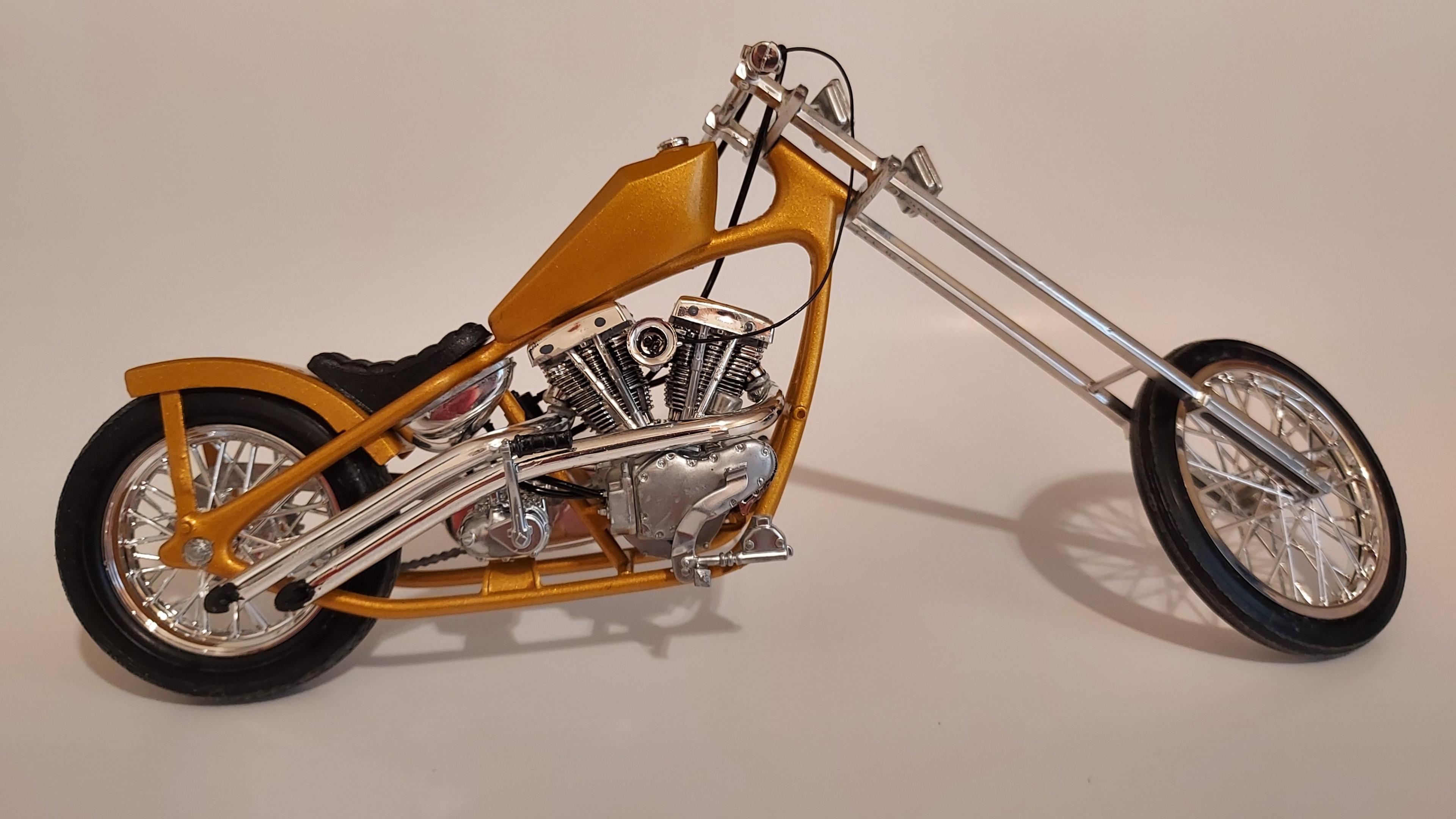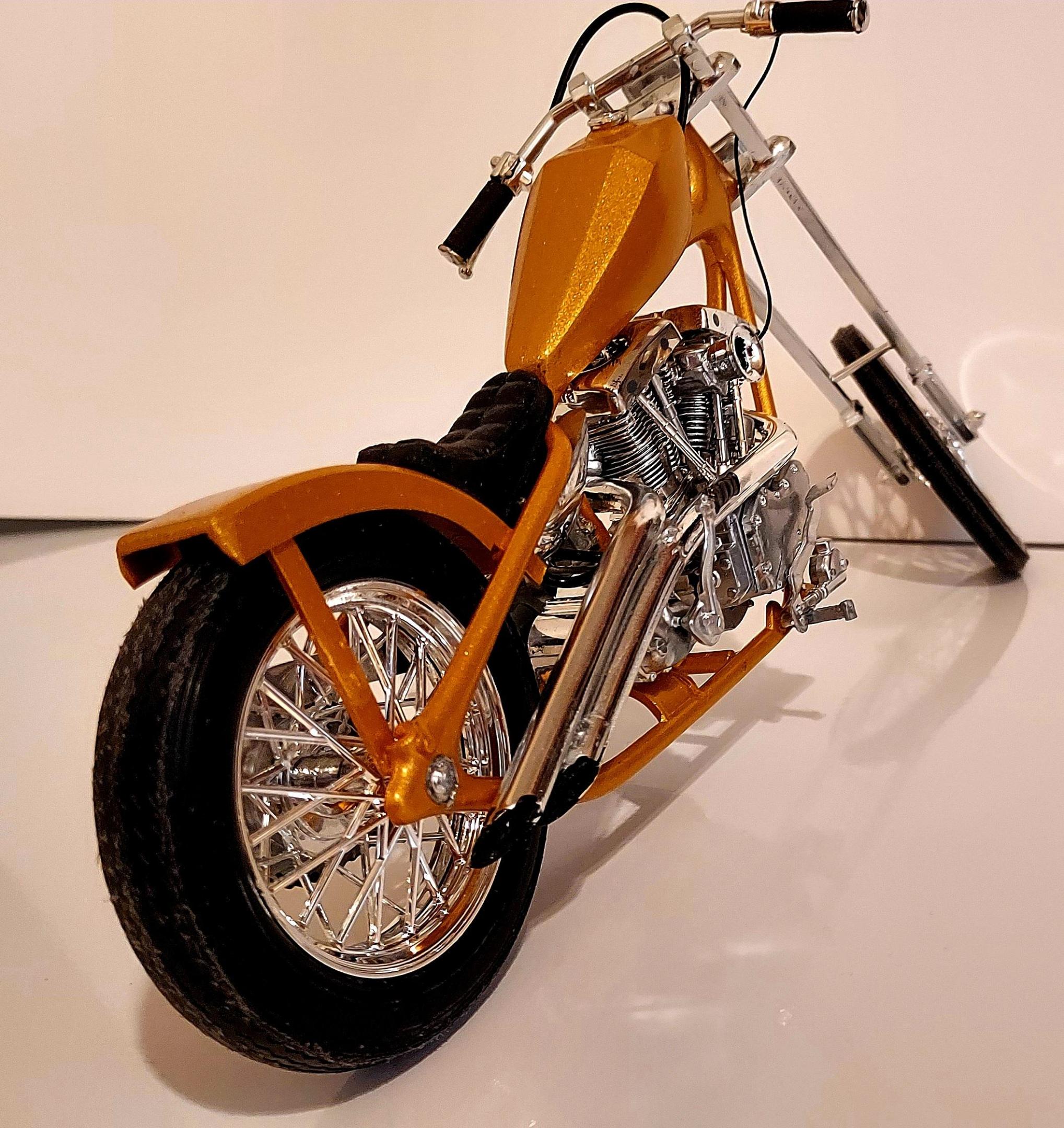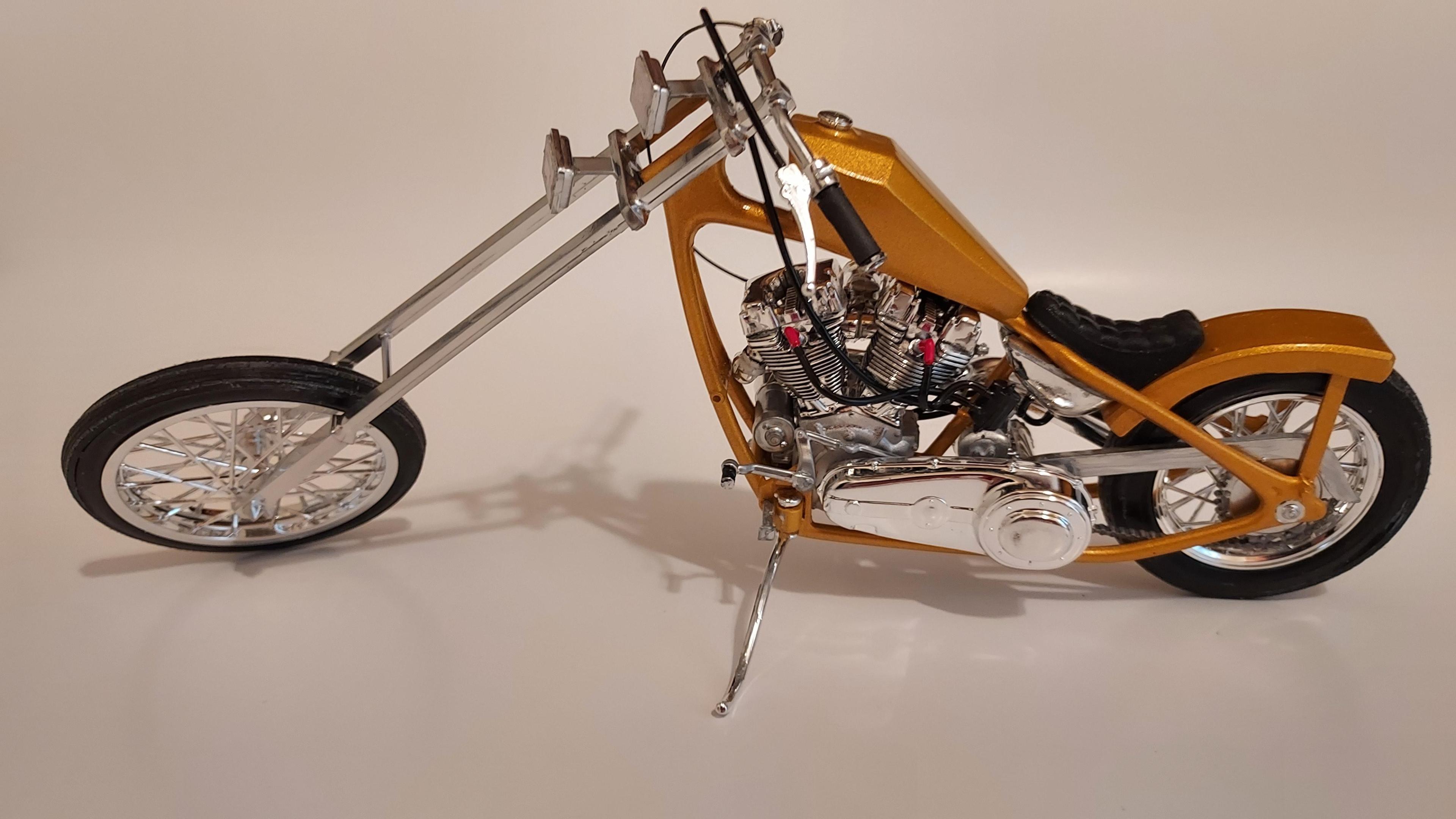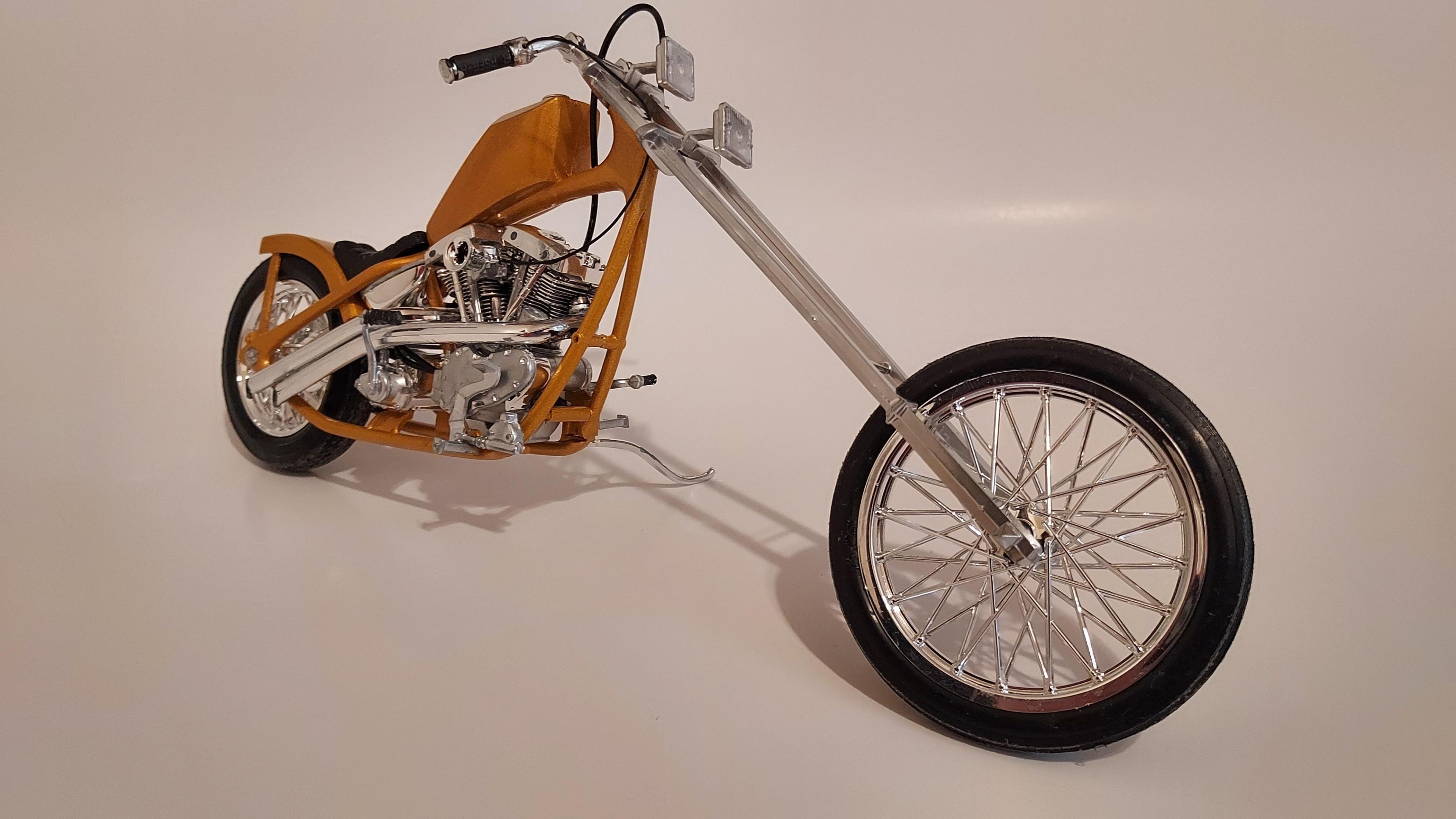 Here is the fantasy chopper that came with a Monte Carlo kit. I didn't build the car, all I wanted was the bike, LOL. So here it is, my first bike build and it is 1/25 scale.