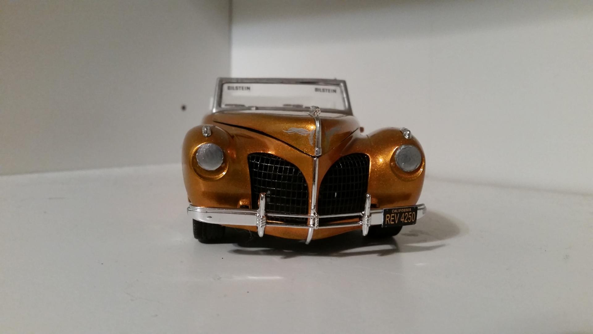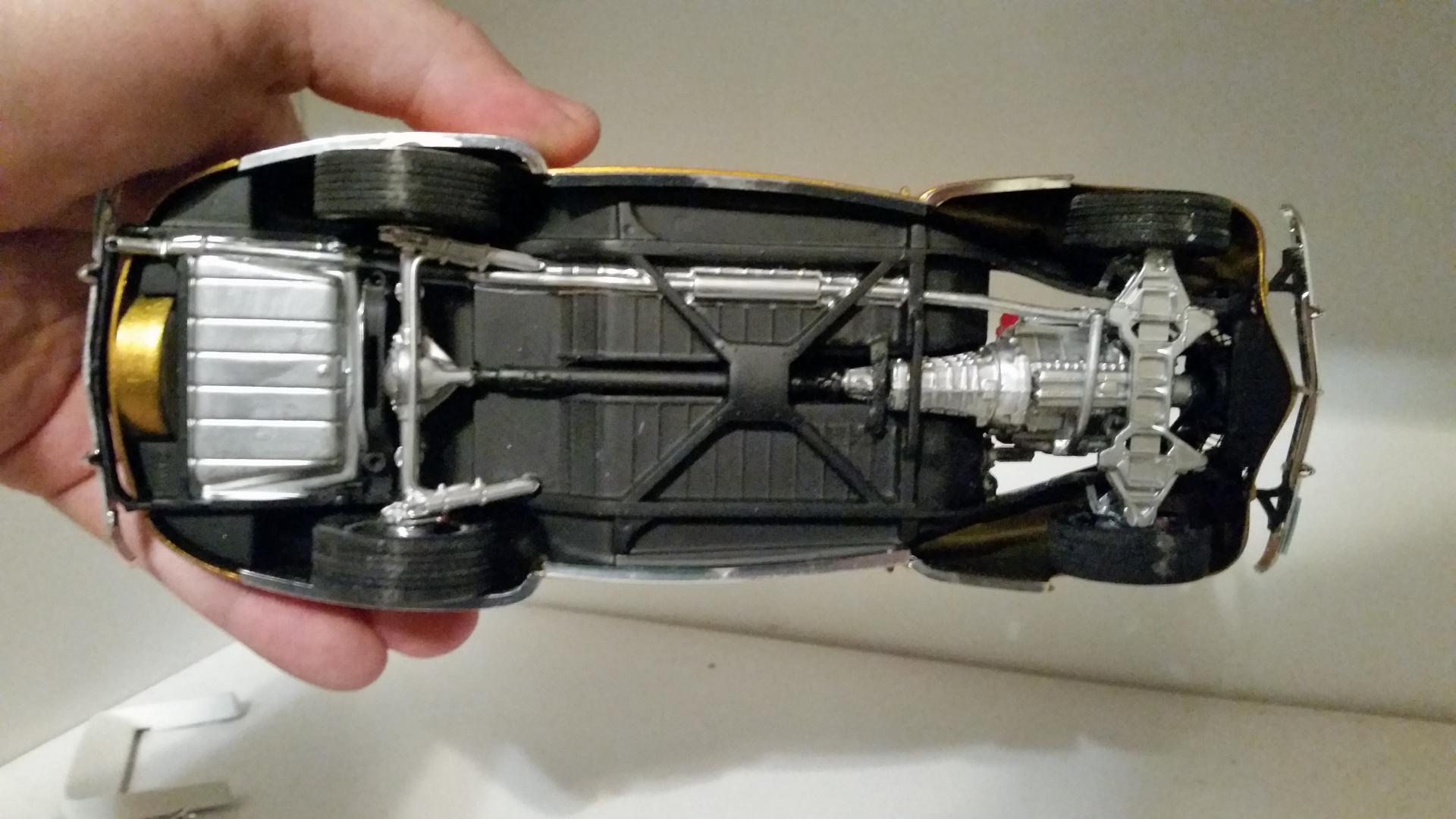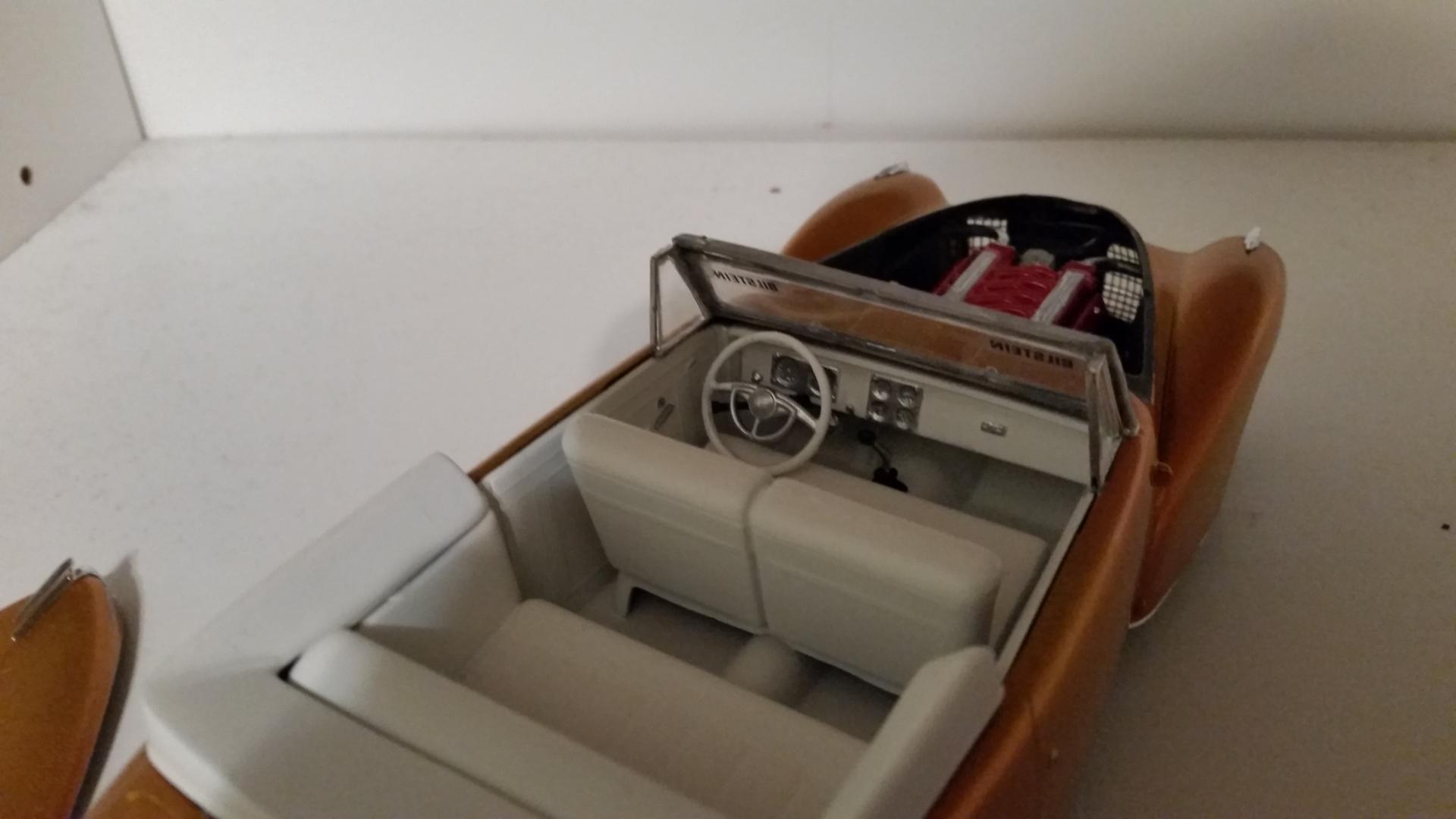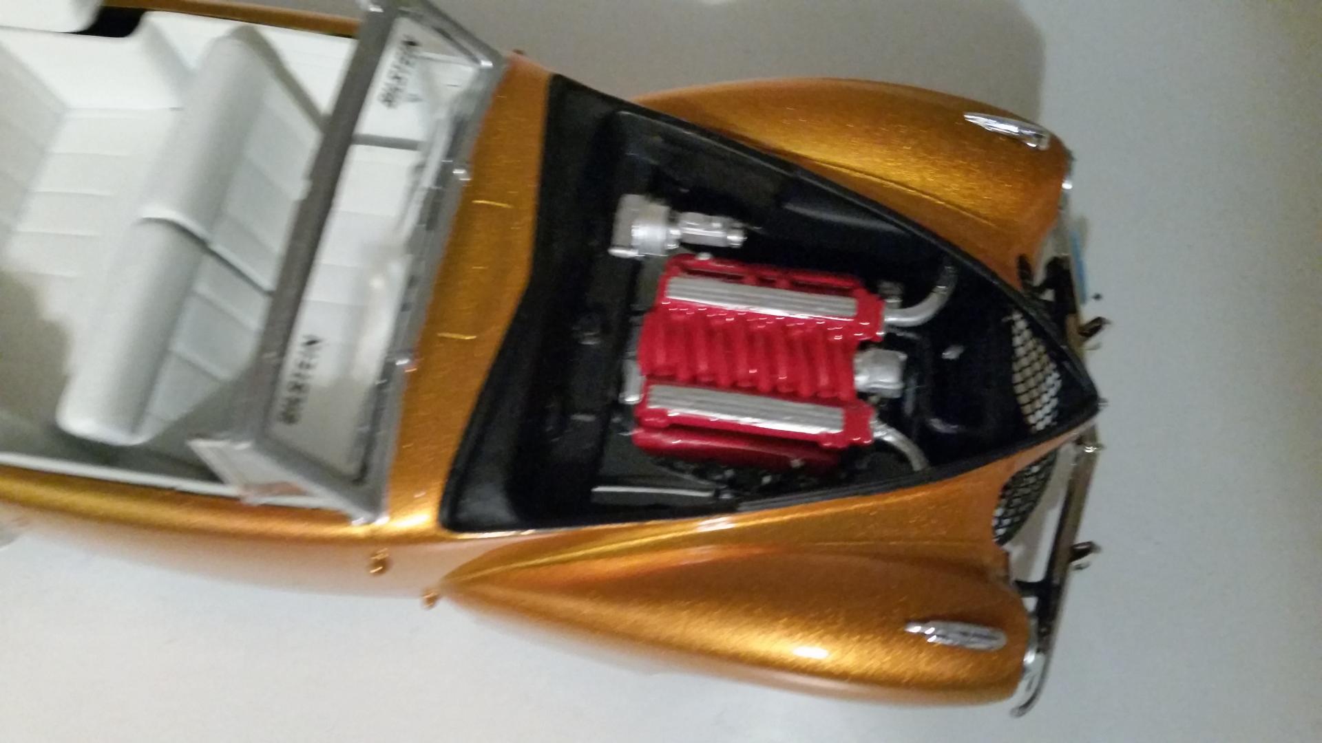 80s issue bought for a fiver (considering how rare these are), but it was started with some things glued and tons of parts missing but luckily had most of the main essential parts intact. Had to fab up grill inserts using mesh screening, headlights from a 57 Bel Air, and a parts dashboard modded and trimmed down from a AMT drag car of some sort. Most of the suspension parts were ether missing or glued to bonded mush so cooked up a C4 front suspension and rear from a Monogram Monte Carlo. The V12 flathead engine was glued to high hell and the wonky molded in v8 headers weren't appealing, so in went a Viper v10 with custom intake tubes and radiator. Wheels and Tires were from the Cali wheels issue 57 Bel-air and a 5th extra was found to act as a de-facto spare tire since the kits piece was missing. Paint is Tamiya Clear Orange over Rustoluem Aluminum cleared with future, and some tribal decals were spares from one of the 66 Impalas I built.