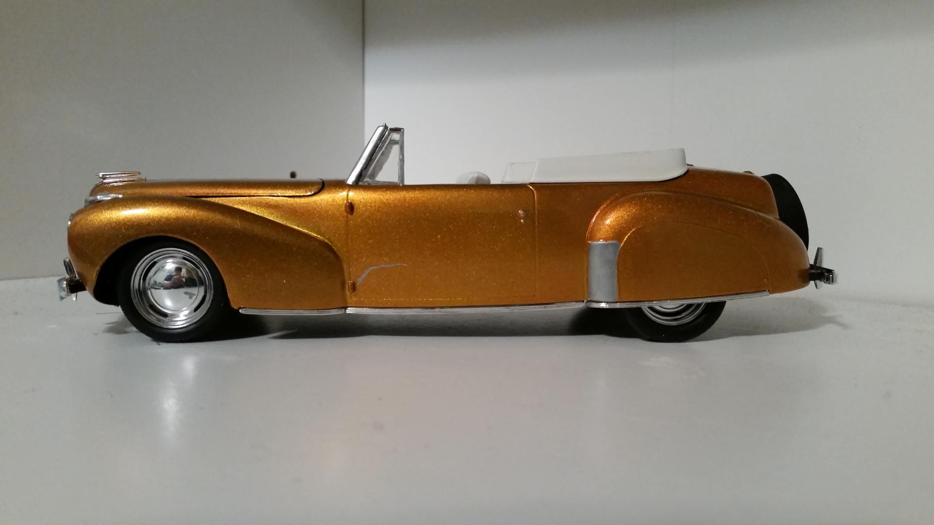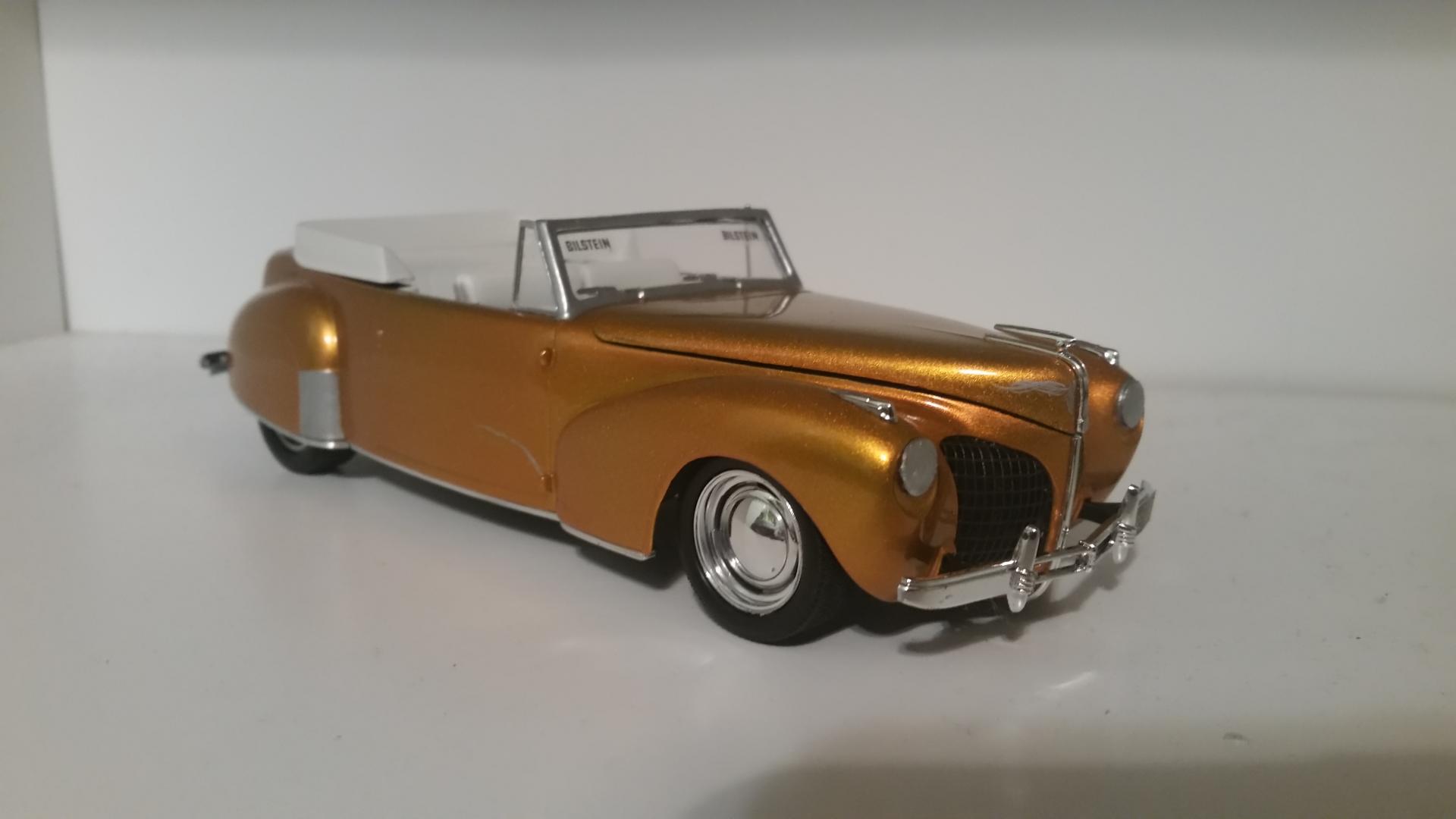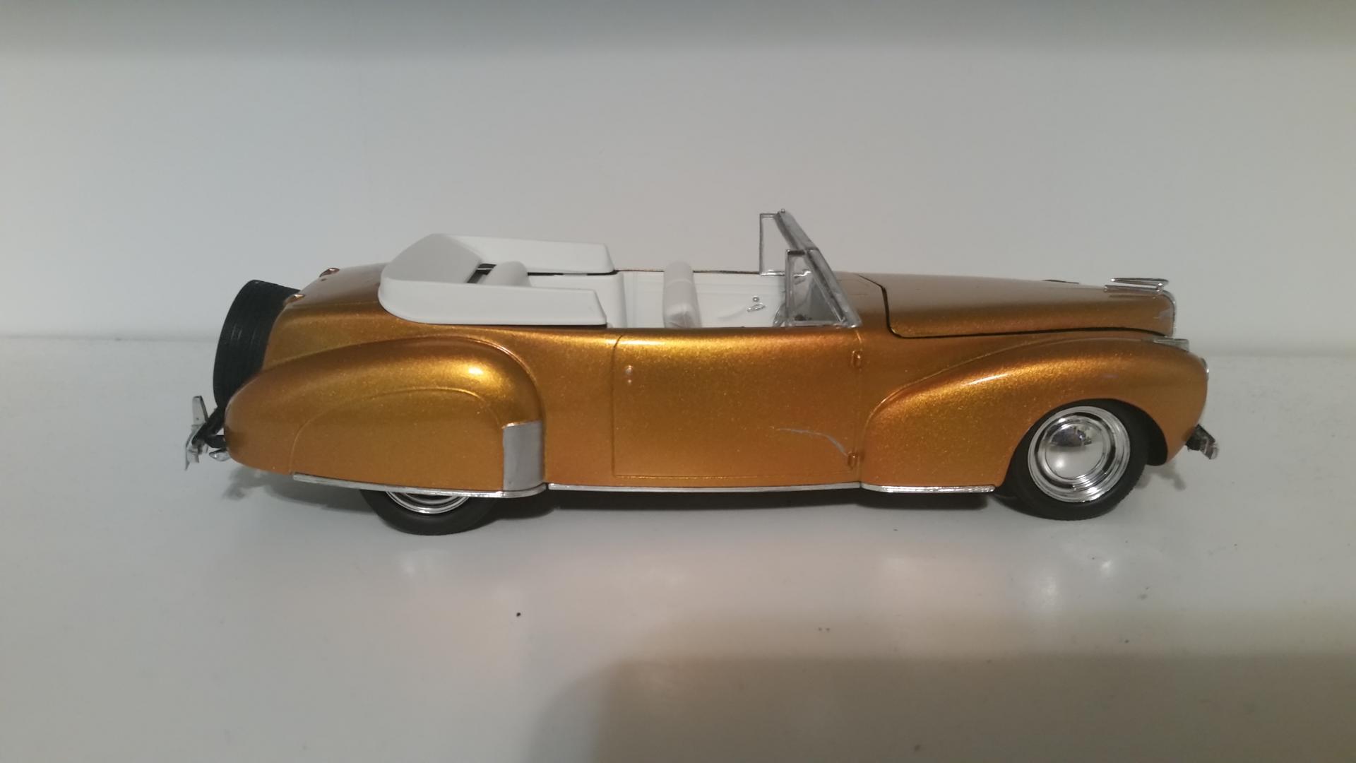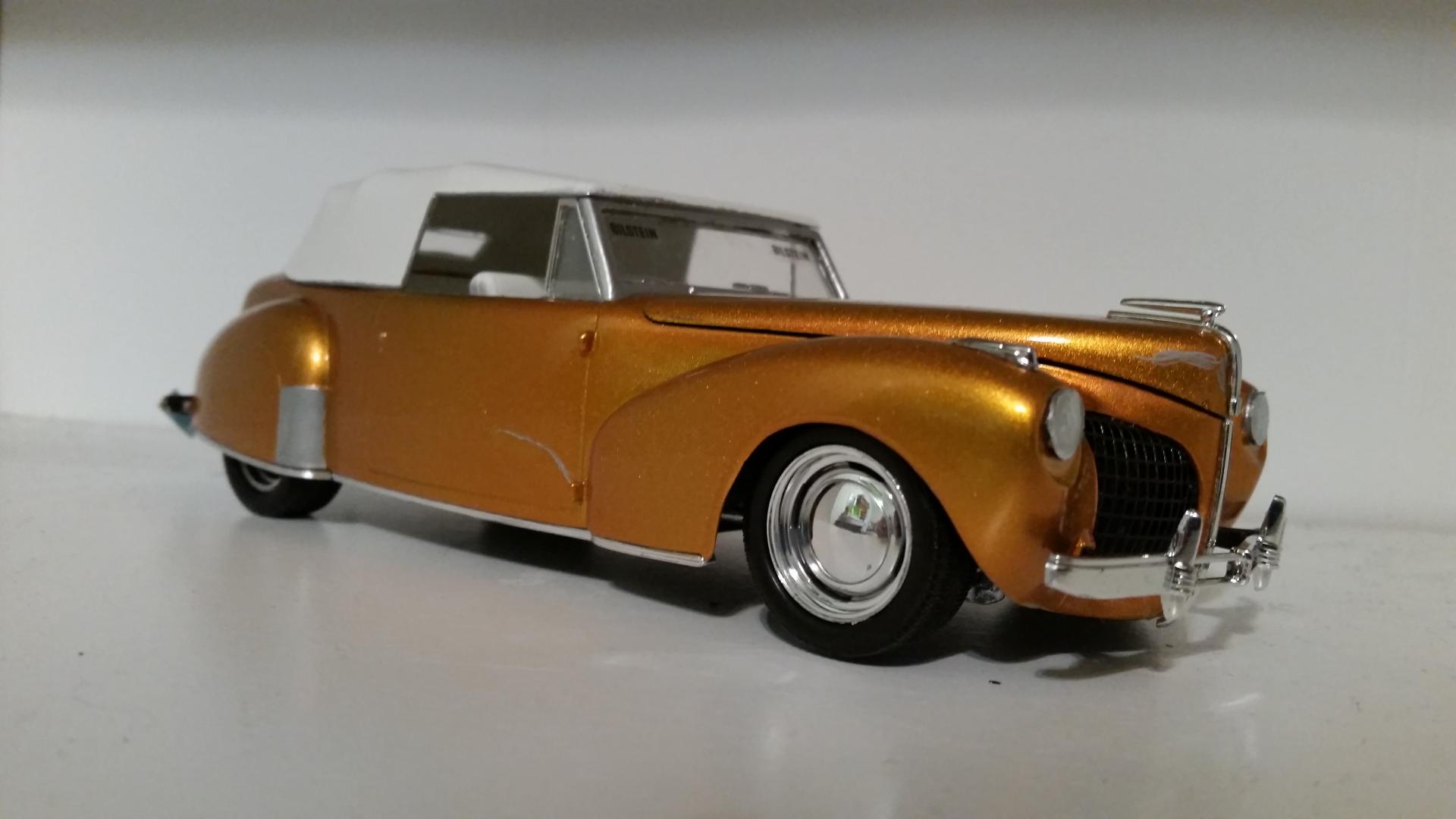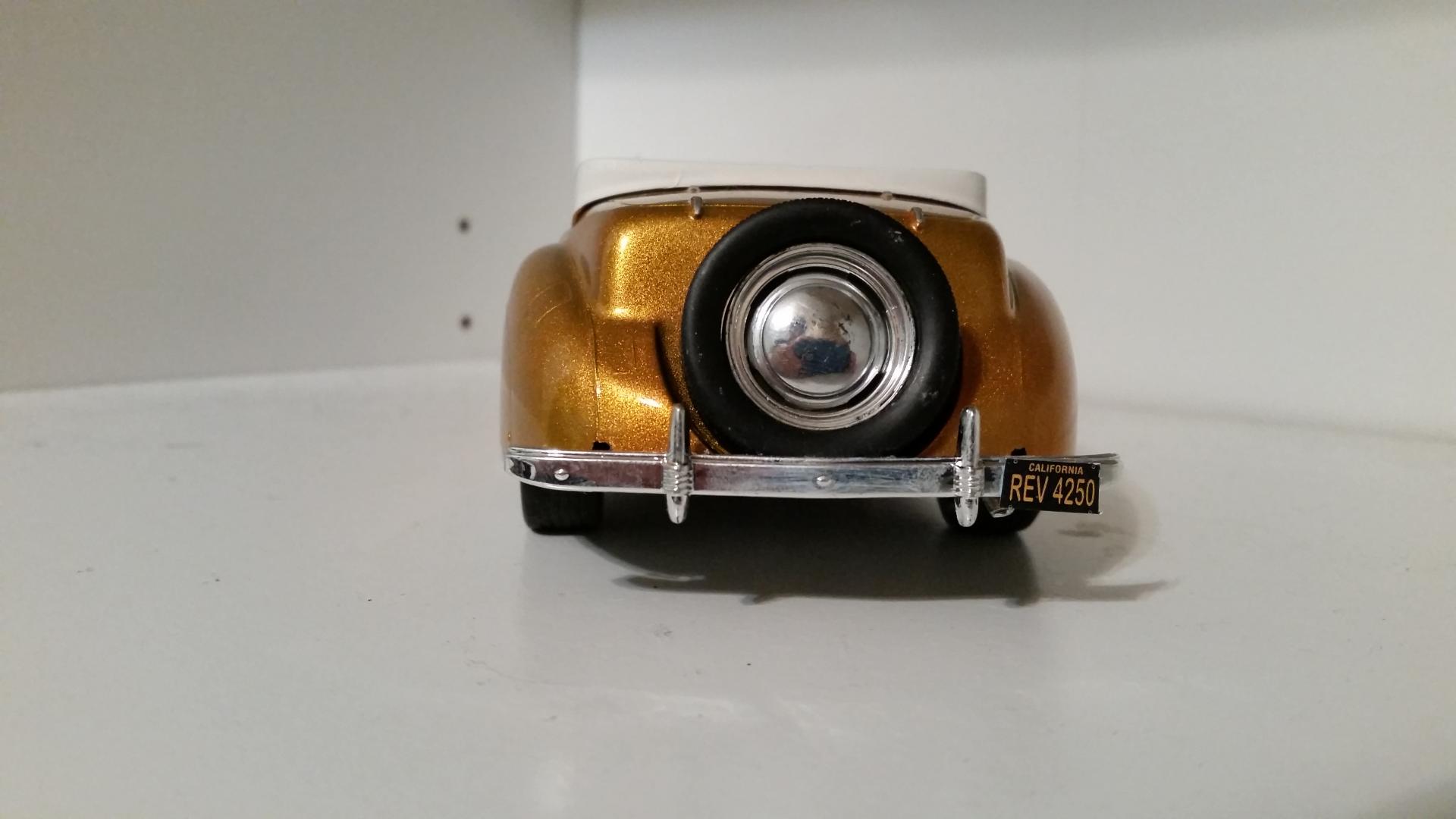 80s issue bought for a fiver (considering how rare these are), but it was started with some things glued and tons of parts missing but luckily had most of the main essential parts intact. Had to fab up grill inserts using mesh screening, headlights from a 57 Bel Air, and a parts dashboard modded and trimmed down from a AMT drag car of some sort. Most of the suspension parts were ether missing or glued to bonded mush so cooked up a C4 front suspension and rear from a Monogram Monte Carlo. The V12 flathead engine was glued to high hell and the wonky molded in v8 headers weren't appealing, so in went a Viper v10 with custom intake tubes and radiator. Wheels and Tires were from the Cali wheels issue 57 Bel-air and a 5th extra was found to act as a de-facto spare tire since the kits piece was missing. Paint is Tamiya Clear Orange over Rustoluem Aluminum cleared with future, and some tribal decals were spares from one of the 66 Impalas I built.