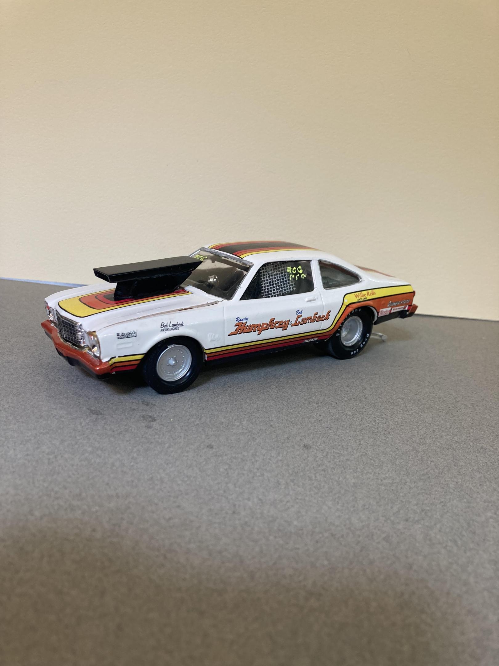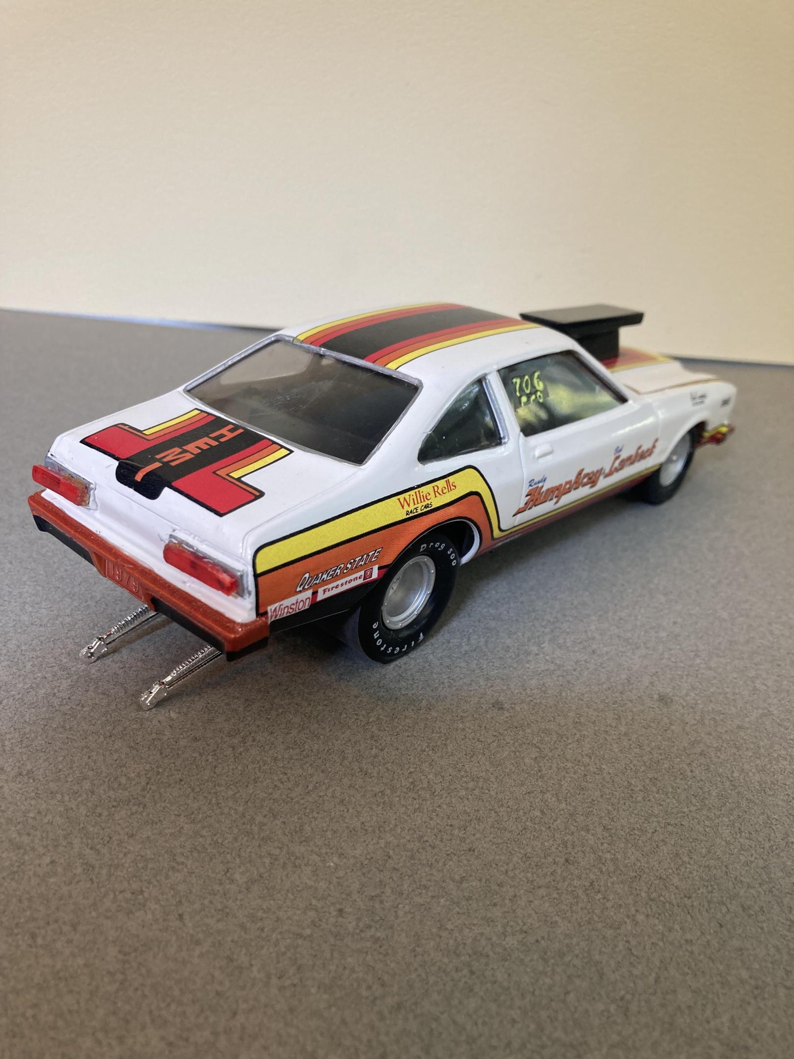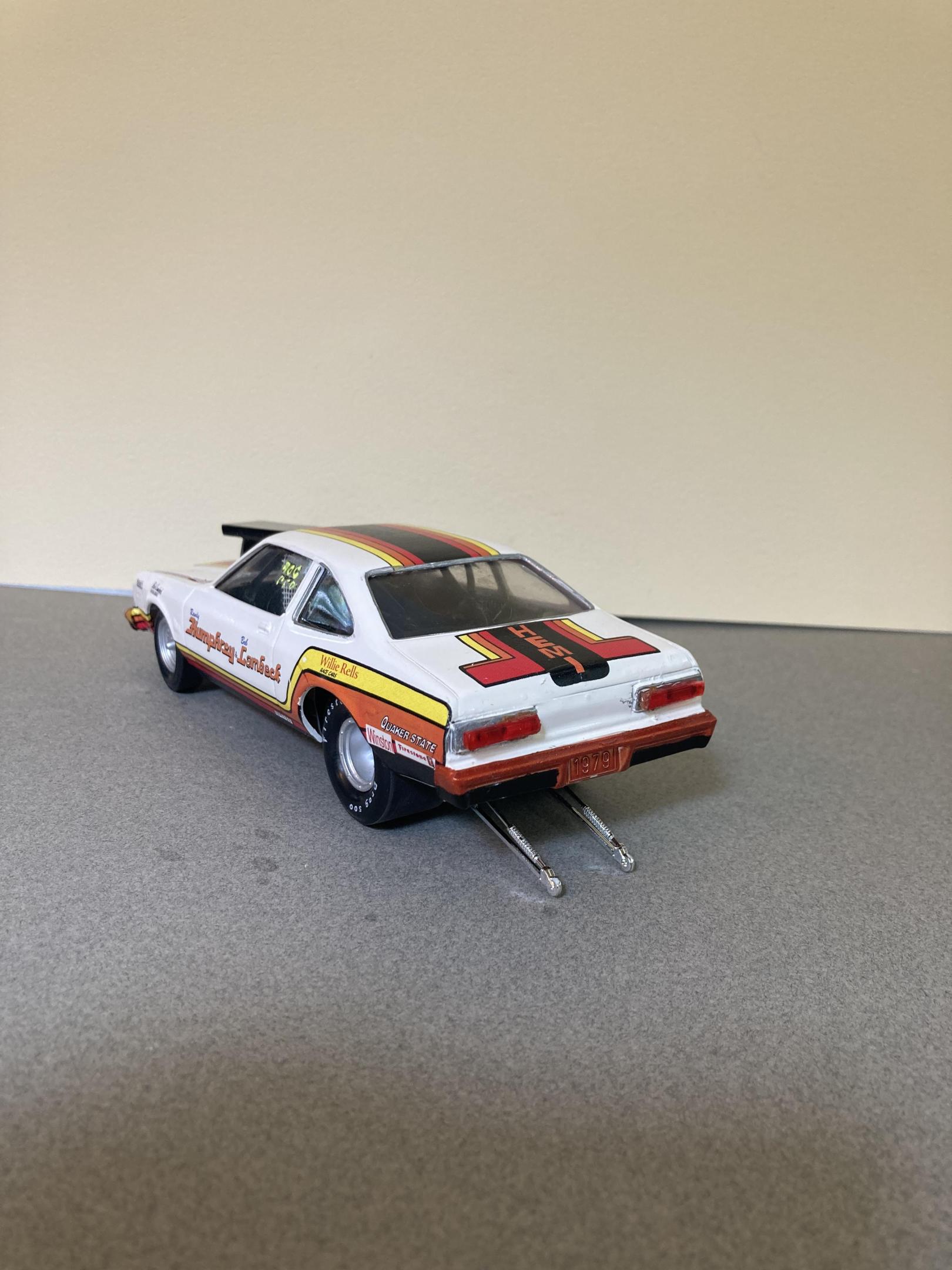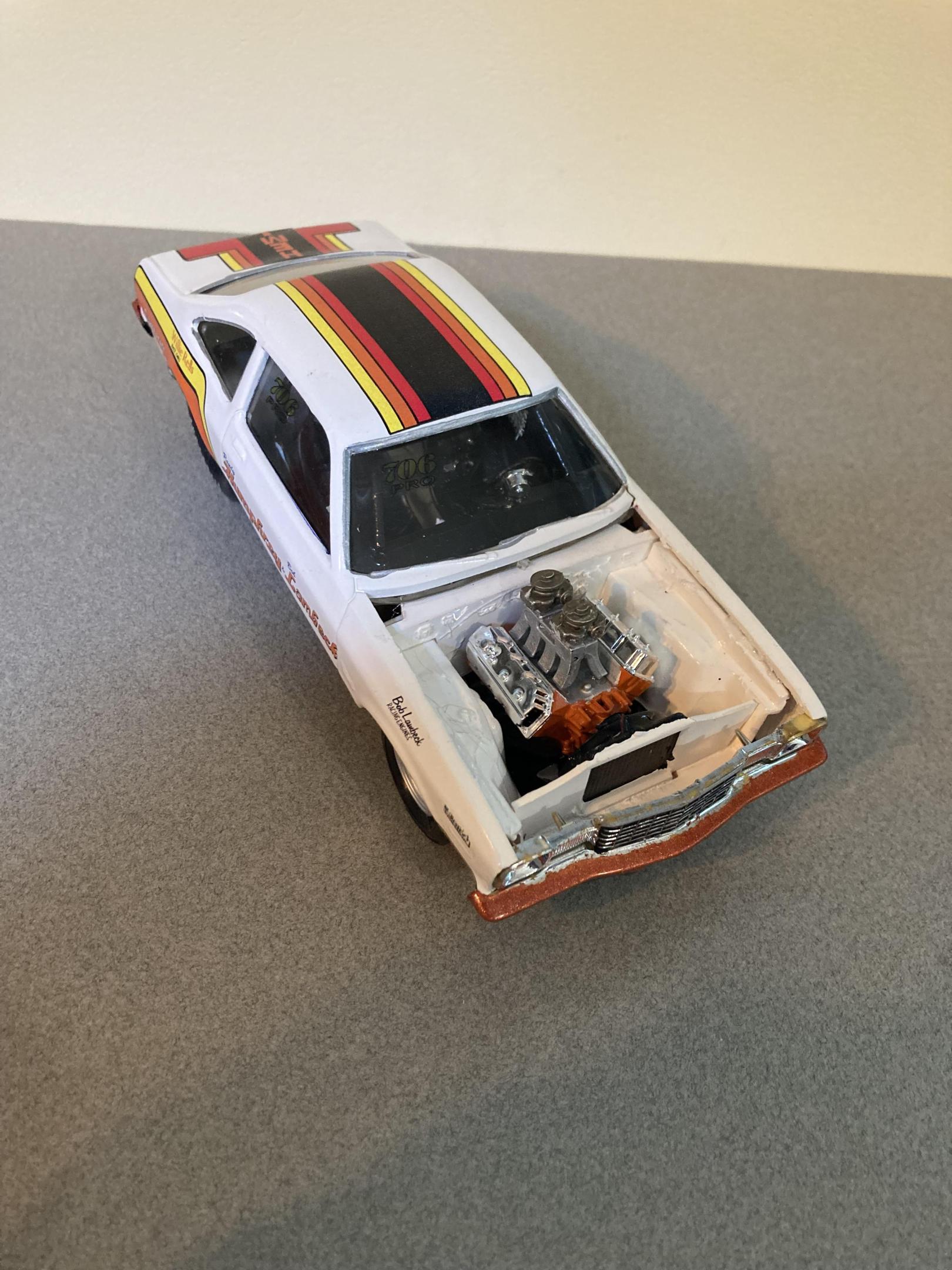 I built this from a combination of the monogram of snap kit that I found on eBay for real cheap. I used the interior and the chassis plate along with the wheels and tires from the grumpy’s toy pro stock Vega . I cobbled together a small block mopar engine from my parts box I also used the tunnel ram and carburetors from the grumpy Vega the headers are fabricated from sauder and aluminum tubing.The only body modifications made were cutting out the side window panels that were behind the door windows and adding a hood scoop also from the grumpy Vega donor kit .the chassis plate also had to be cut and shortened I made the window net from some old window screen.At some point it the future I will have to go back and add the radiator . I gave it a testors paint job of white and red enamel with star spangled blue lacquer all topped off with wet look clear. The decals came from slixx. Overall this was a very easy kit bash project Until next time thanks for looking, Mike