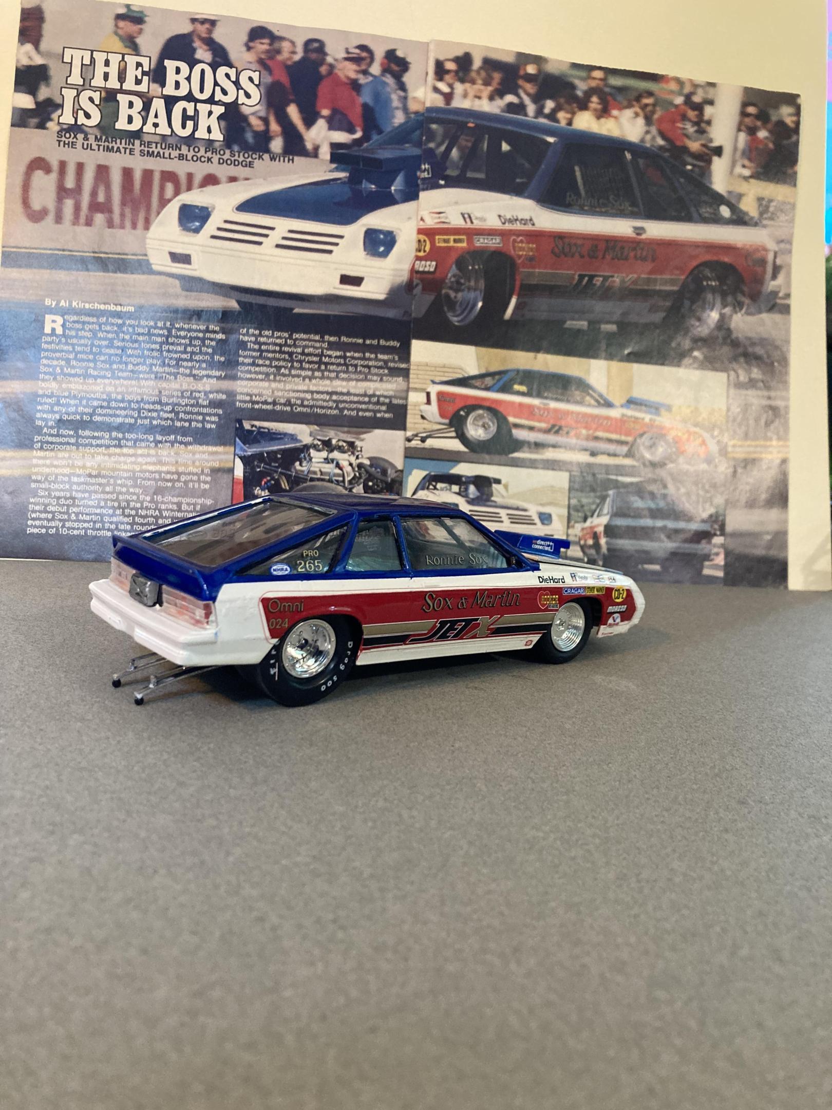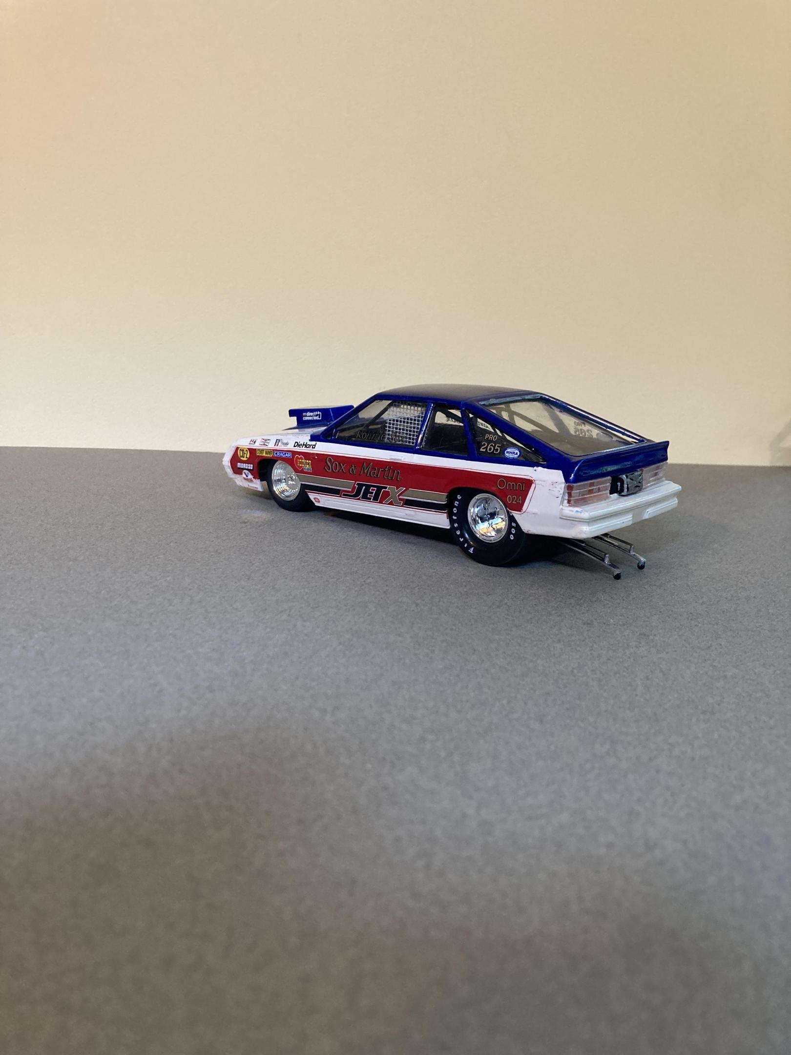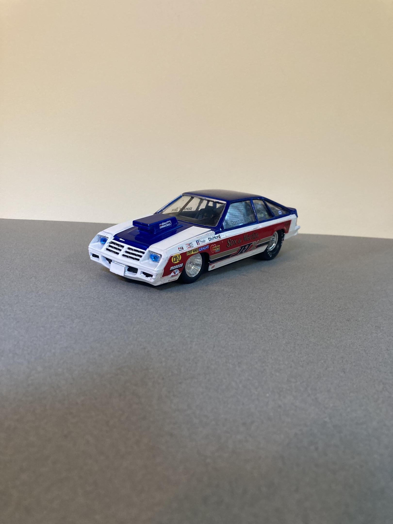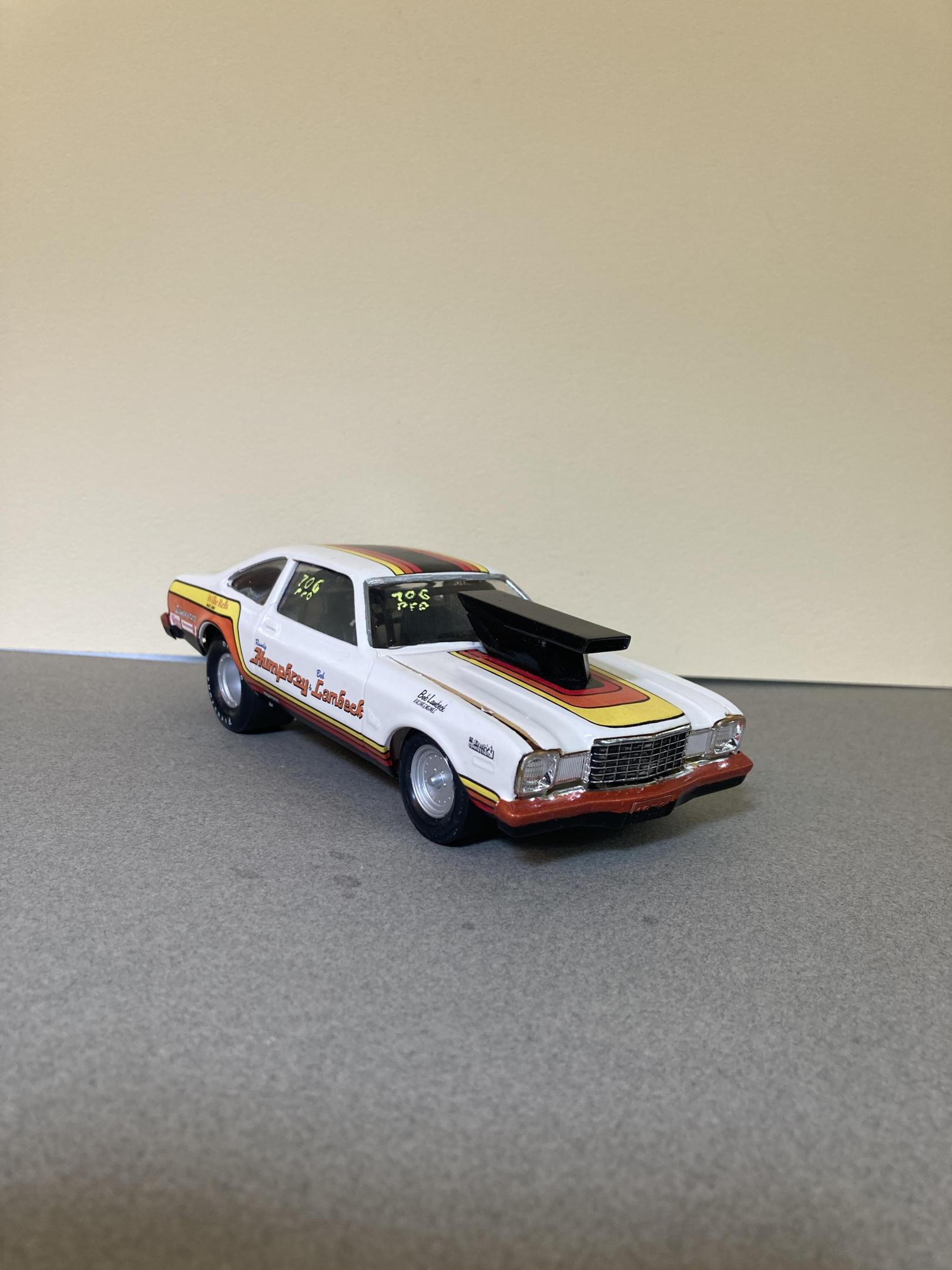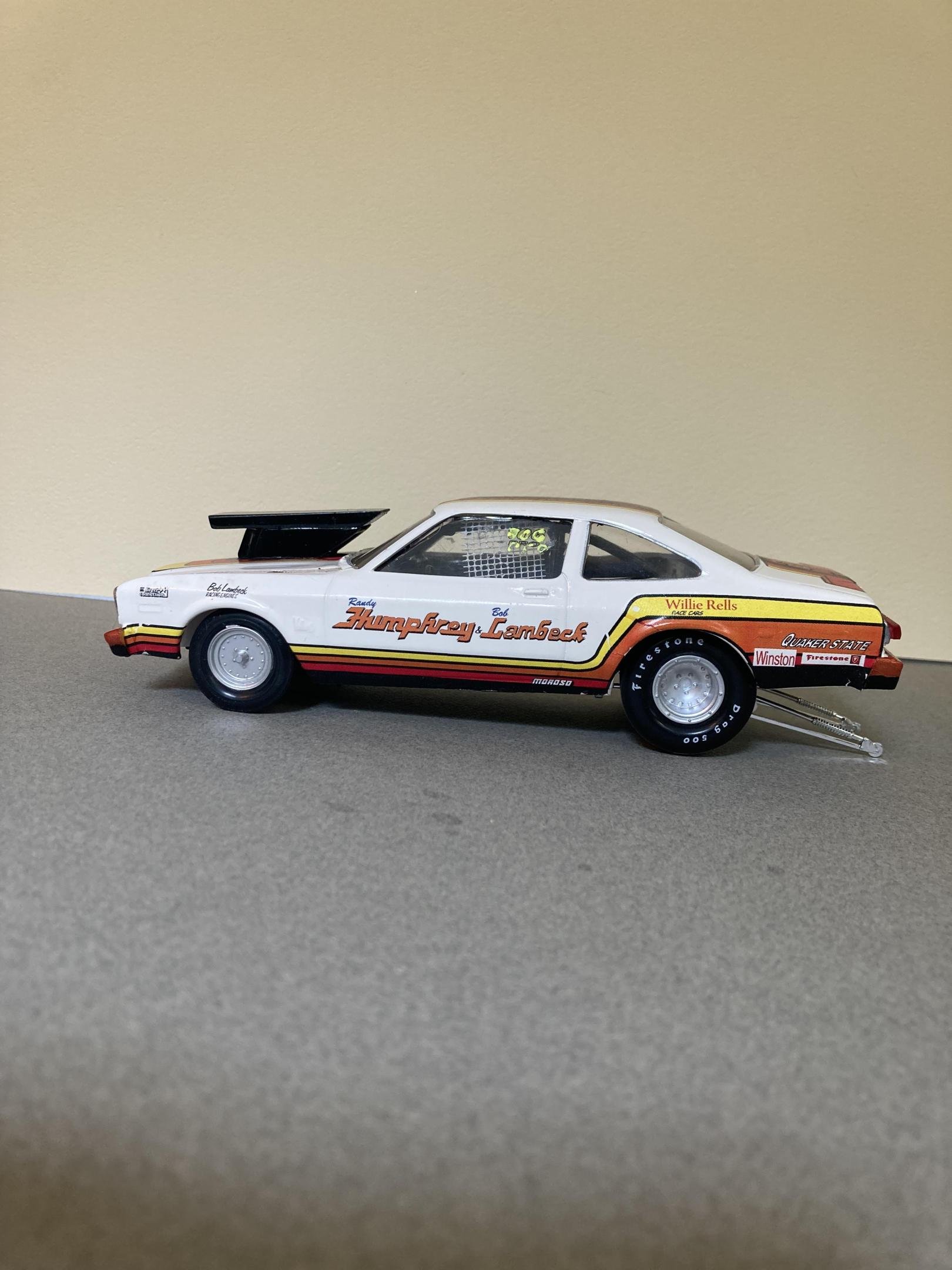 I built this from a combination of the monogram of snap kit that I found on eBay for real cheap. I used the interior and the chassis plate along with the wheels and tires from the grumpy’s toy pro stock Vega . I cobbled together a small block mopar engine from my parts box I also used the tunnel ram and carburetors from the grumpy Vega the headers are fabricated from sauder and aluminum tubing.The only body modifications made were cutting out the side window panels that were behind the door windows and adding a hood scoop also from the grumpy Vega donor kit .the chassis plate also had to be cut and shortened I made the window net from some old window screen.At some point it the future I will have to go back and add the radiator . I gave it a testors paint job of white and red enamel with star spangled blue lacquer all topped off with wet look clear. The decals came from slixx. Overall this was a very easy kit bash project Until next time thanks for looking, Mike