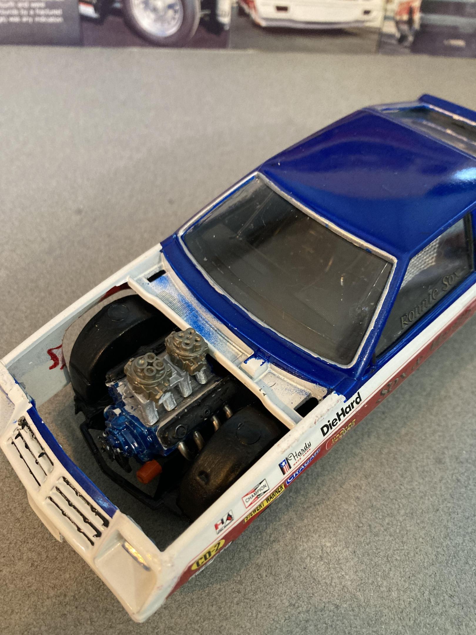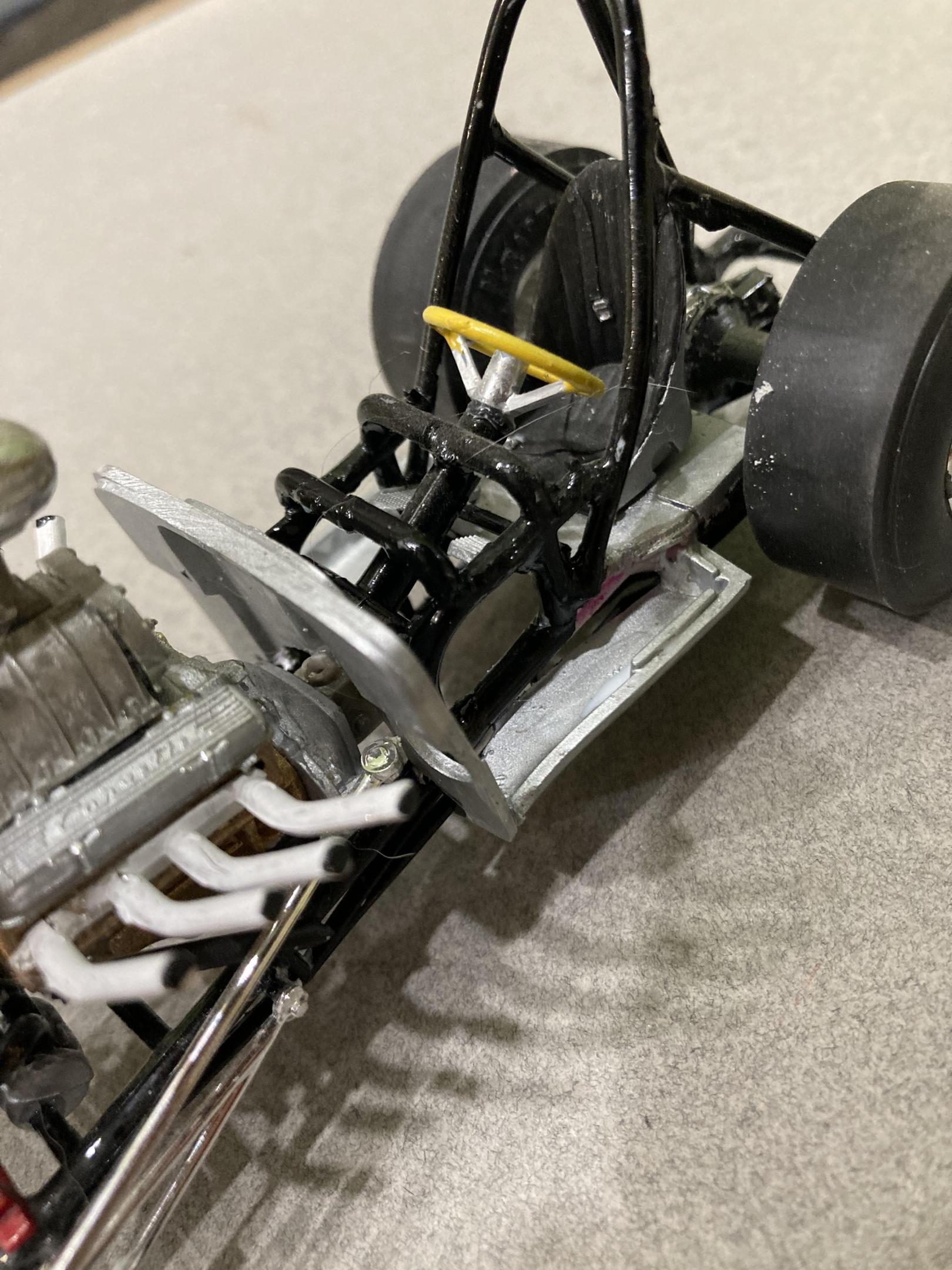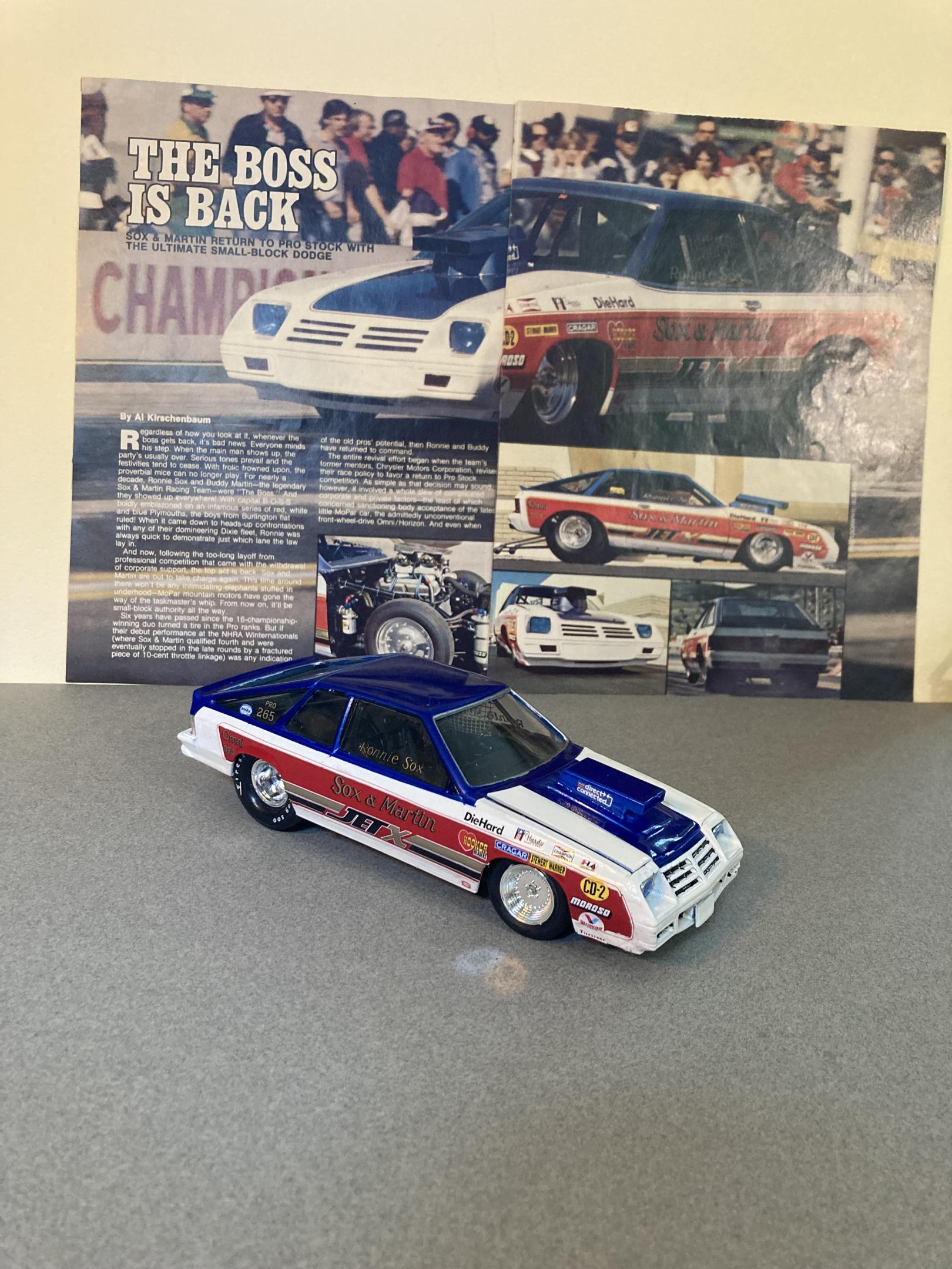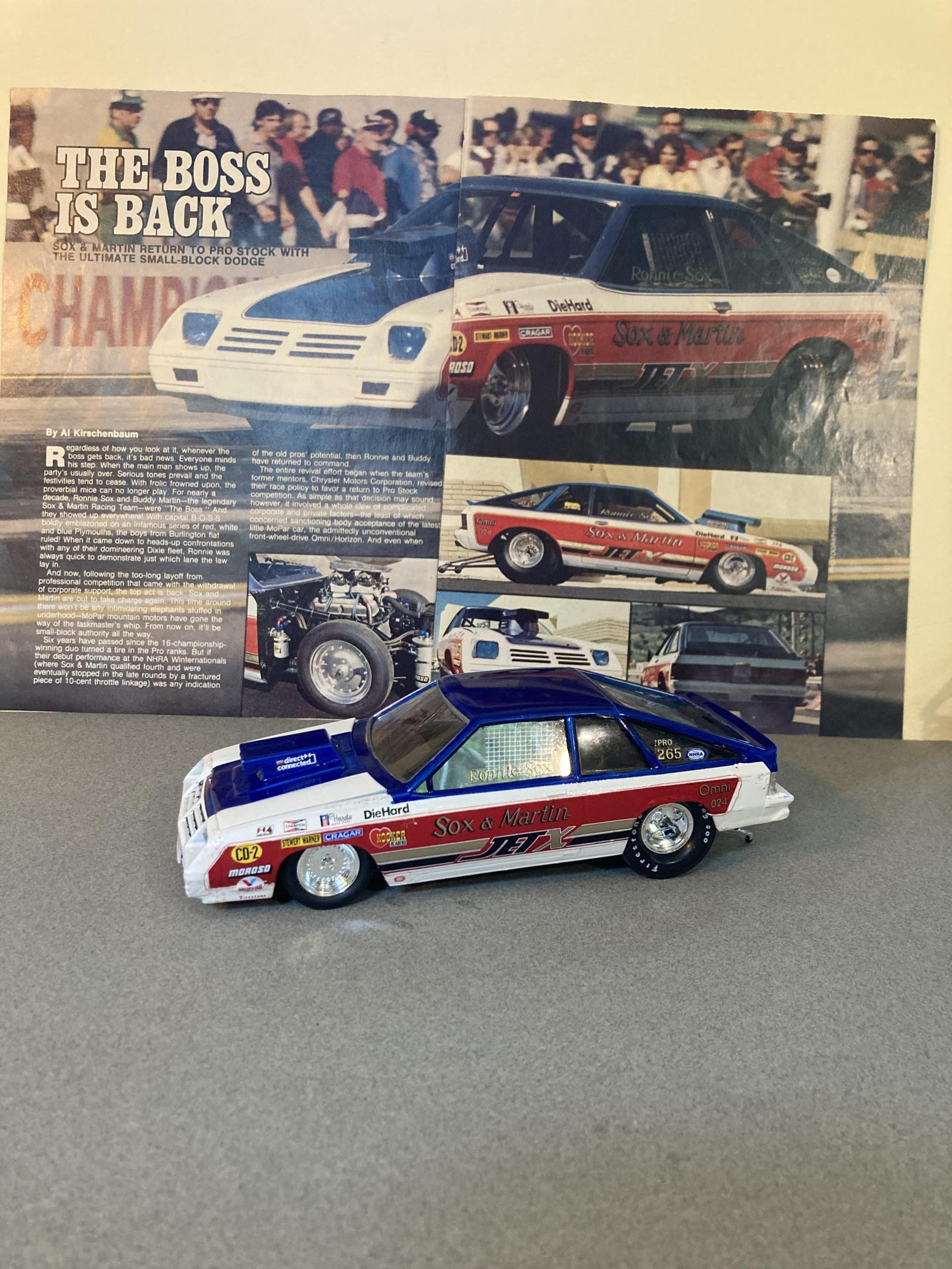 I built this from a combination of the monogram of snap kit that I found on eBay for real cheap. I used the interior and the chassis plate along with the wheels and tires from the grumpy’s toy pro stock Vega . I cobbled together a small block mopar engine from my parts box I also used the tunnel ram and carburetors from the grumpy Vega the headers are fabricated from sauder and aluminum tubing.The only body modifications made were cutting out the side window panels that were behind the door windows and adding a hood scoop also from the grumpy Vega donor kit .the chassis plate also had to be cut and shortened I made the window net from some old window screen.At some point it the future I will have to go back and add the radiator . I gave it a testors paint job of white and red enamel with star spangled blue lacquer all topped off with wet look clear. The decals came from slixx. Overall this was a very easy kit bash project Until next time thanks for looking, Mike