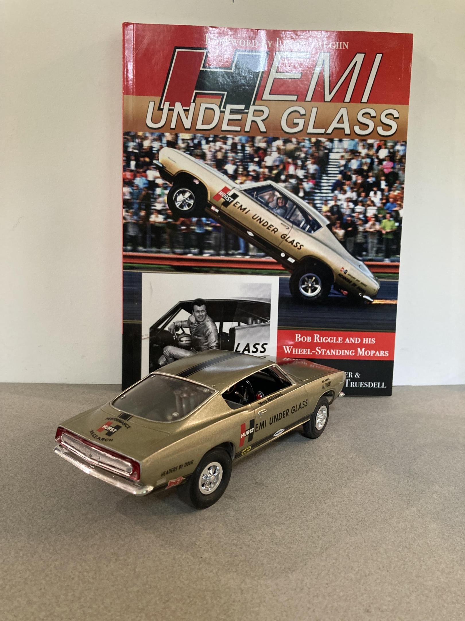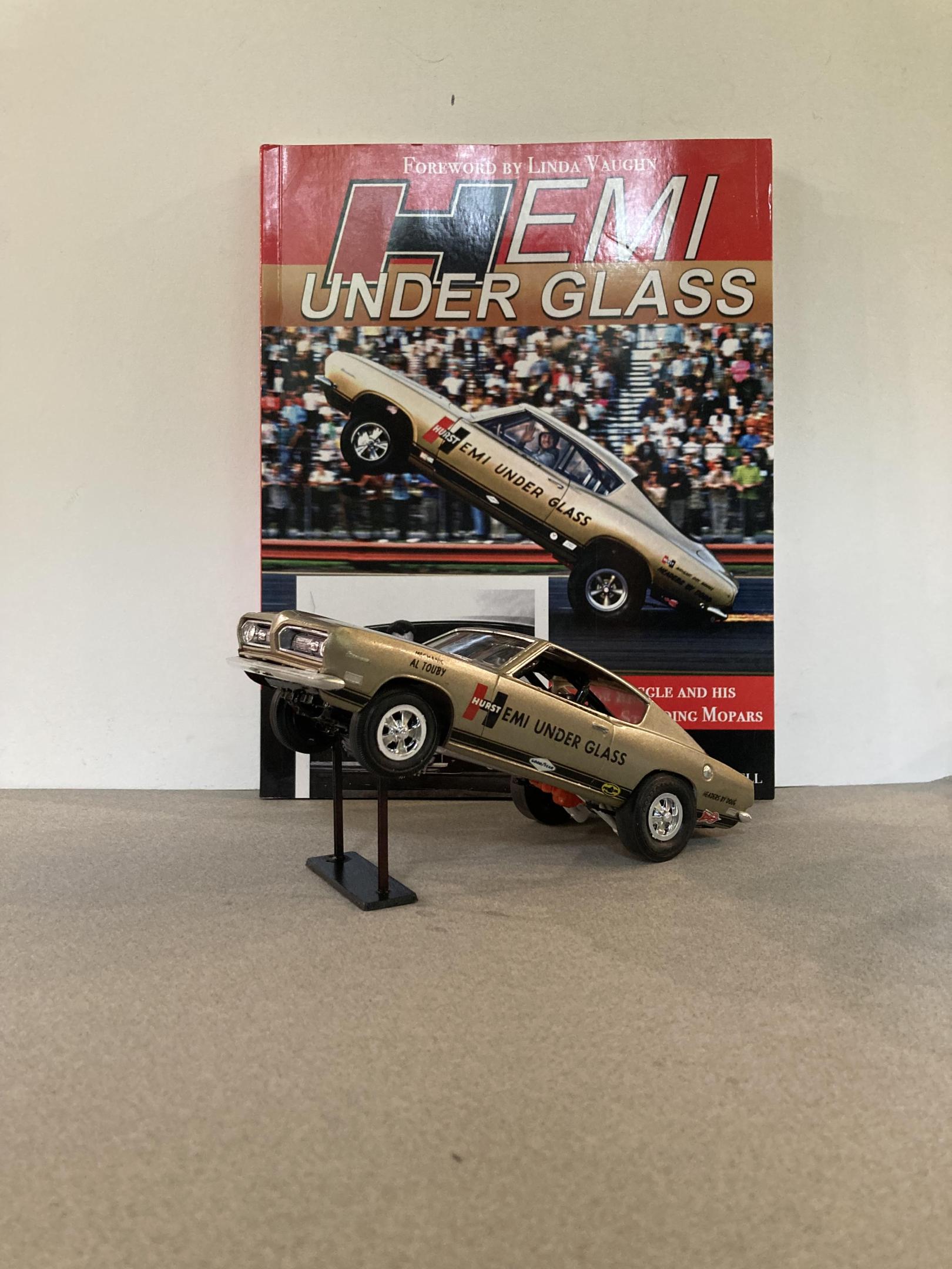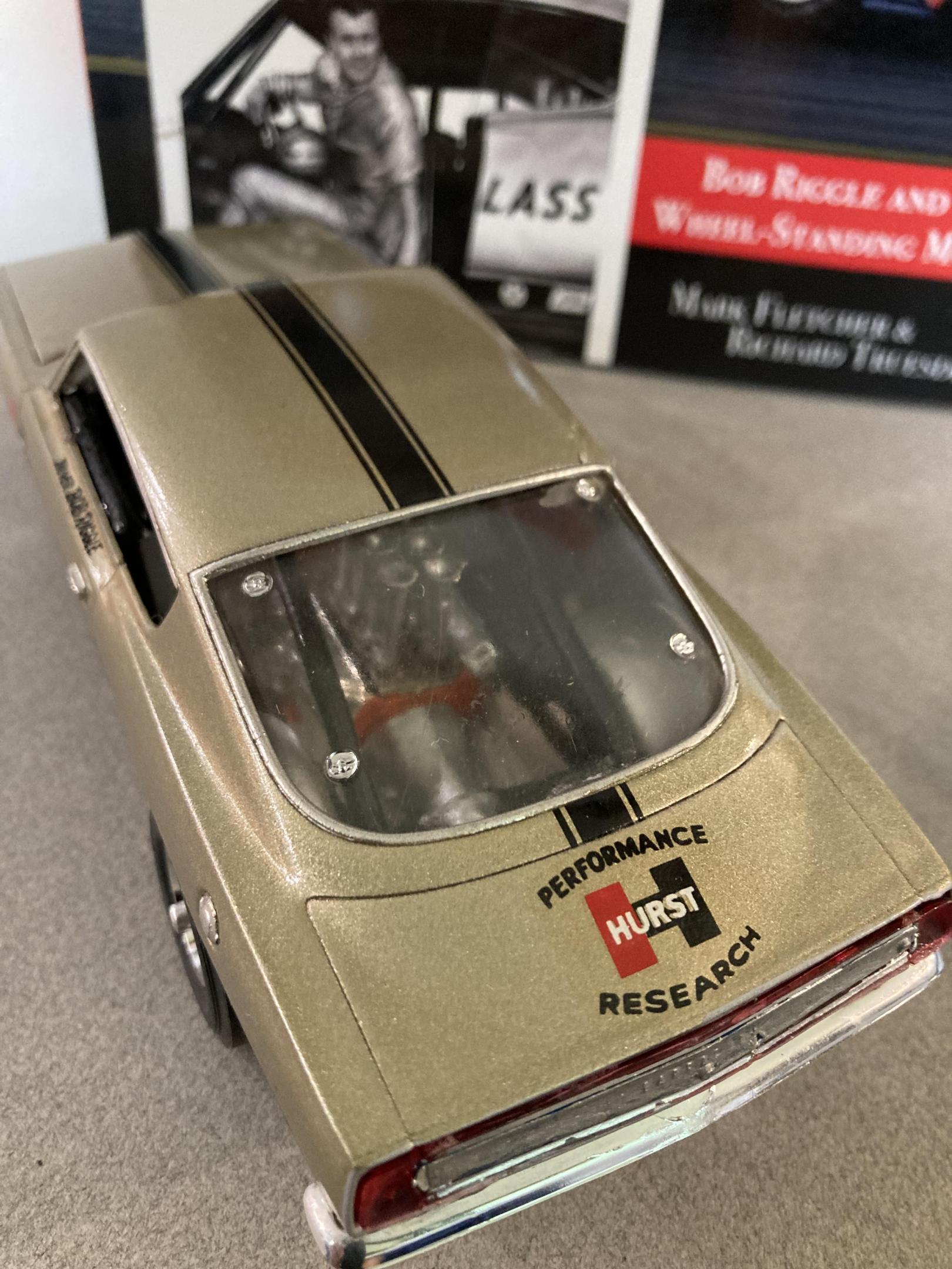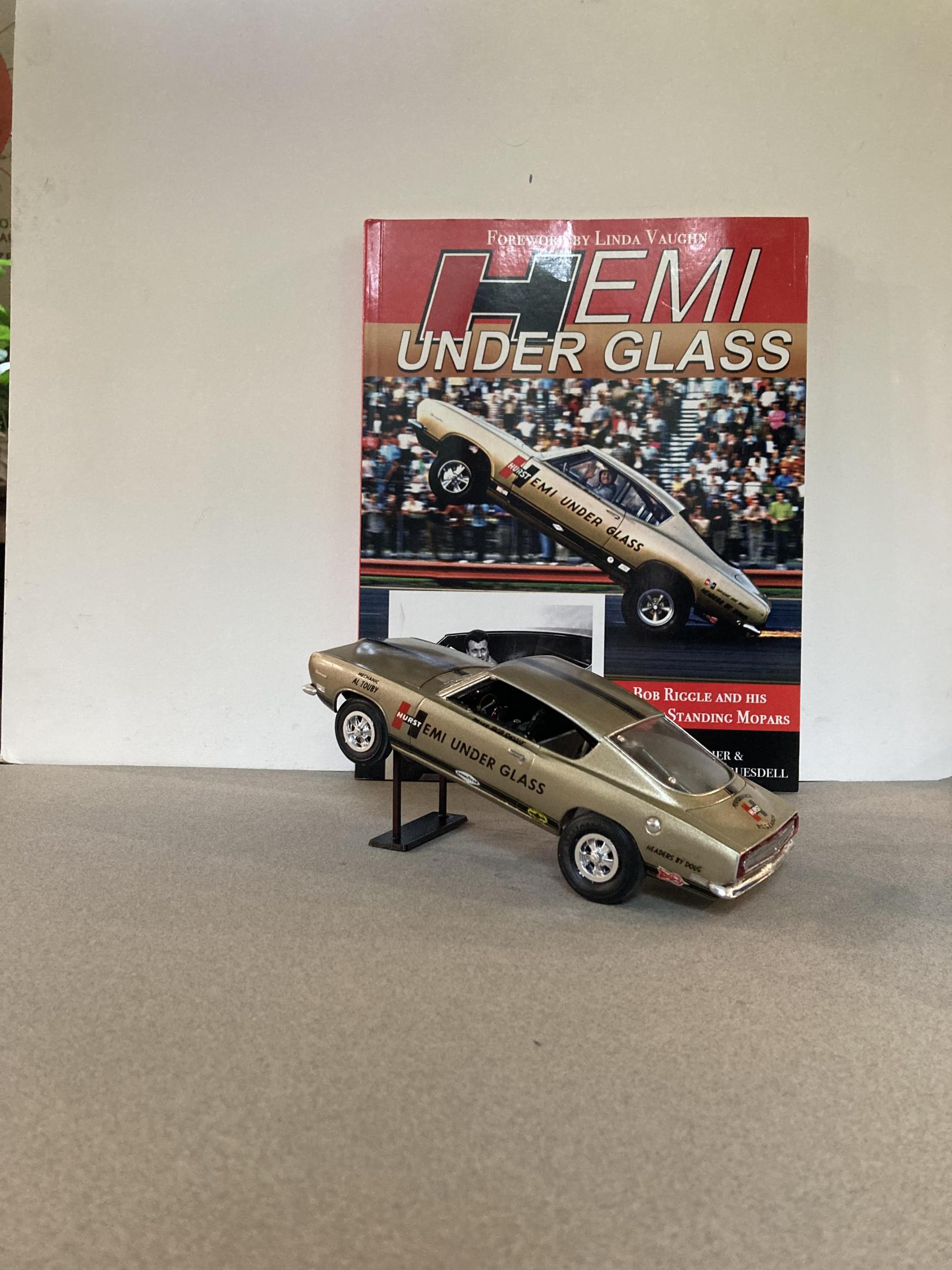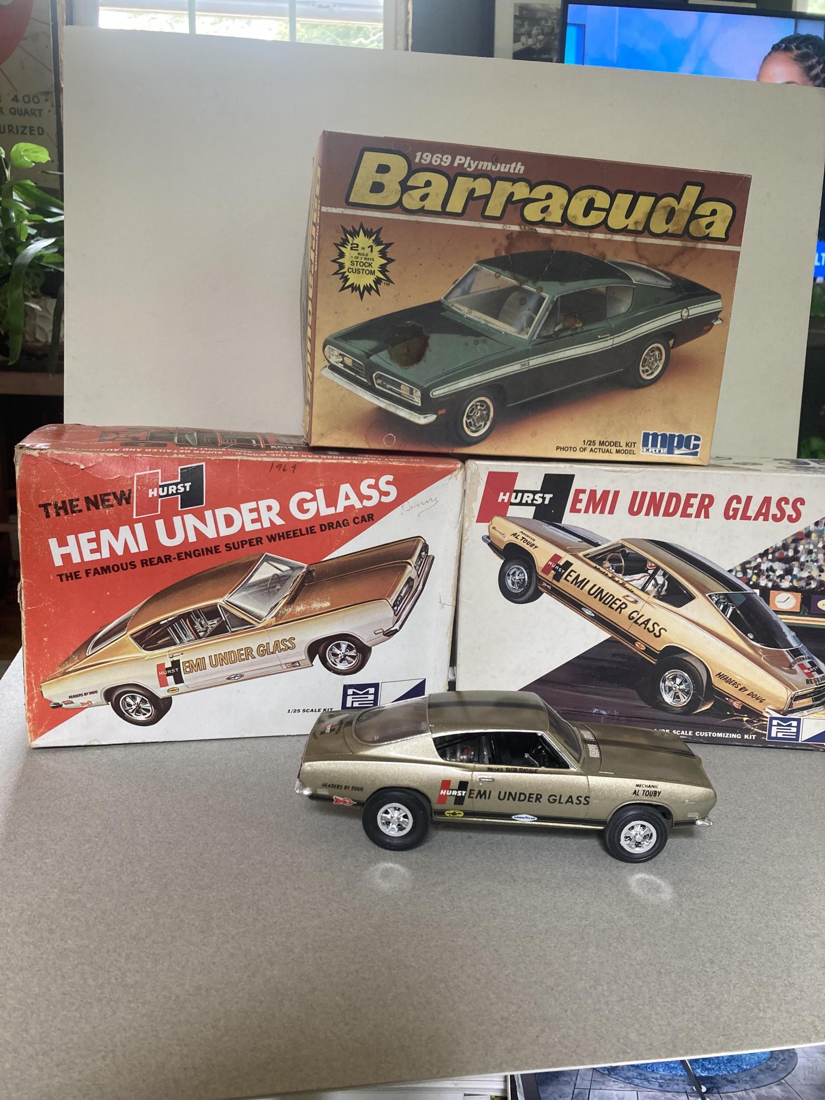 I started building this something like 35 years ago. When mpc reissued the 1969 barracuda kit. I painted the body from this kit with testors champagne gold enamel topped with Fred cady decals. Both have been long discontinued. I started building a chassis from square stock , the 69 kit’s interior shell with the back part of the floor cut out , and some parts from the little red wagon kit. Then the project stalled. A couple of years ago I purchased a box of glue bomb hemi under glass parts the best part was the original 1969 box . Then last year I was able to purchase the even harder to find original 1968 box that included some more random pieces. I got my finished painted body out clear coated it then put together a chassis, and drivetrain of original hemi under glass parts. I was able to use the original back window glass from the original kit with the molded in hold down pins. I’m really happy with how it looks. Until next time thanks for looking, mike