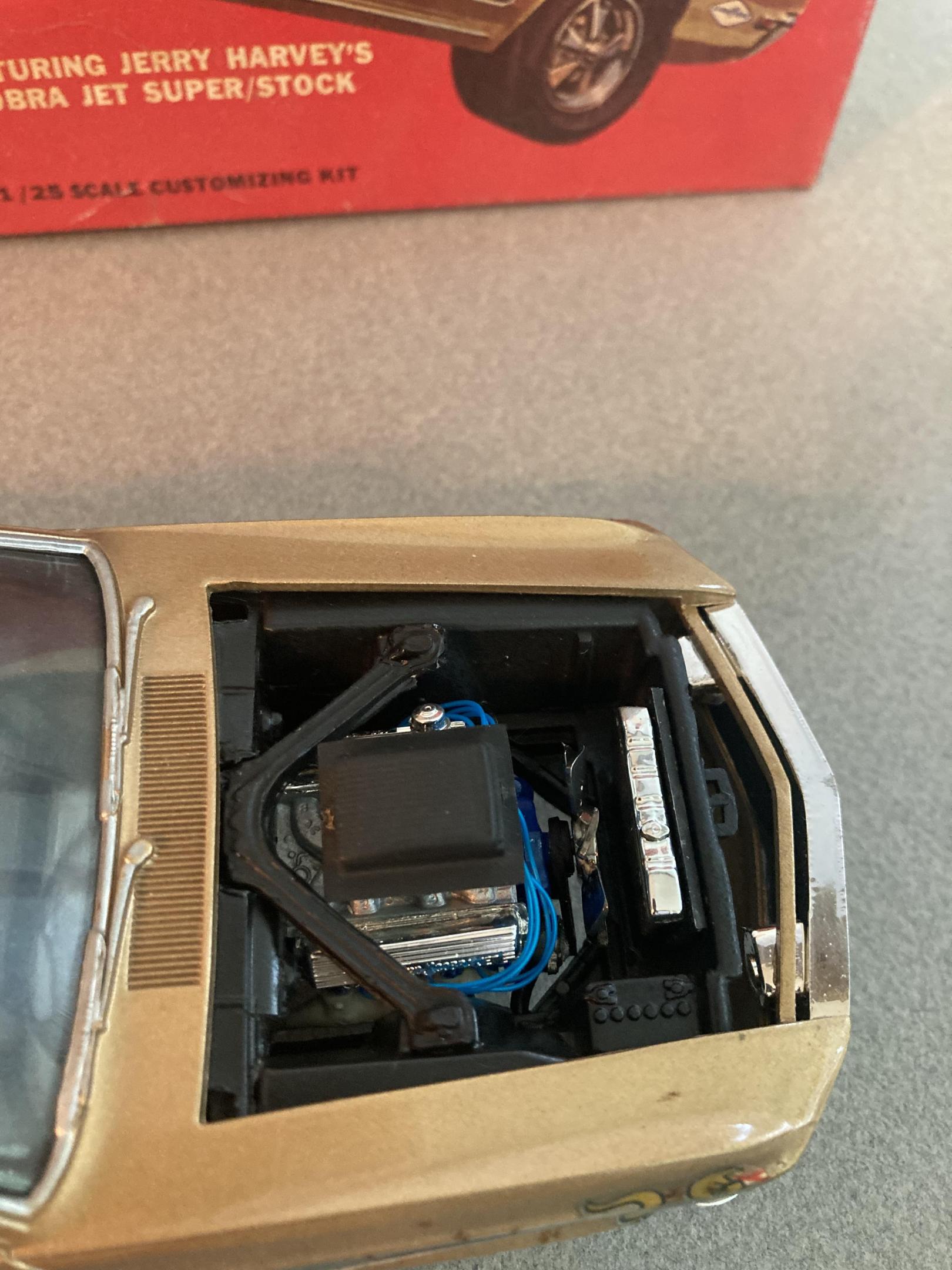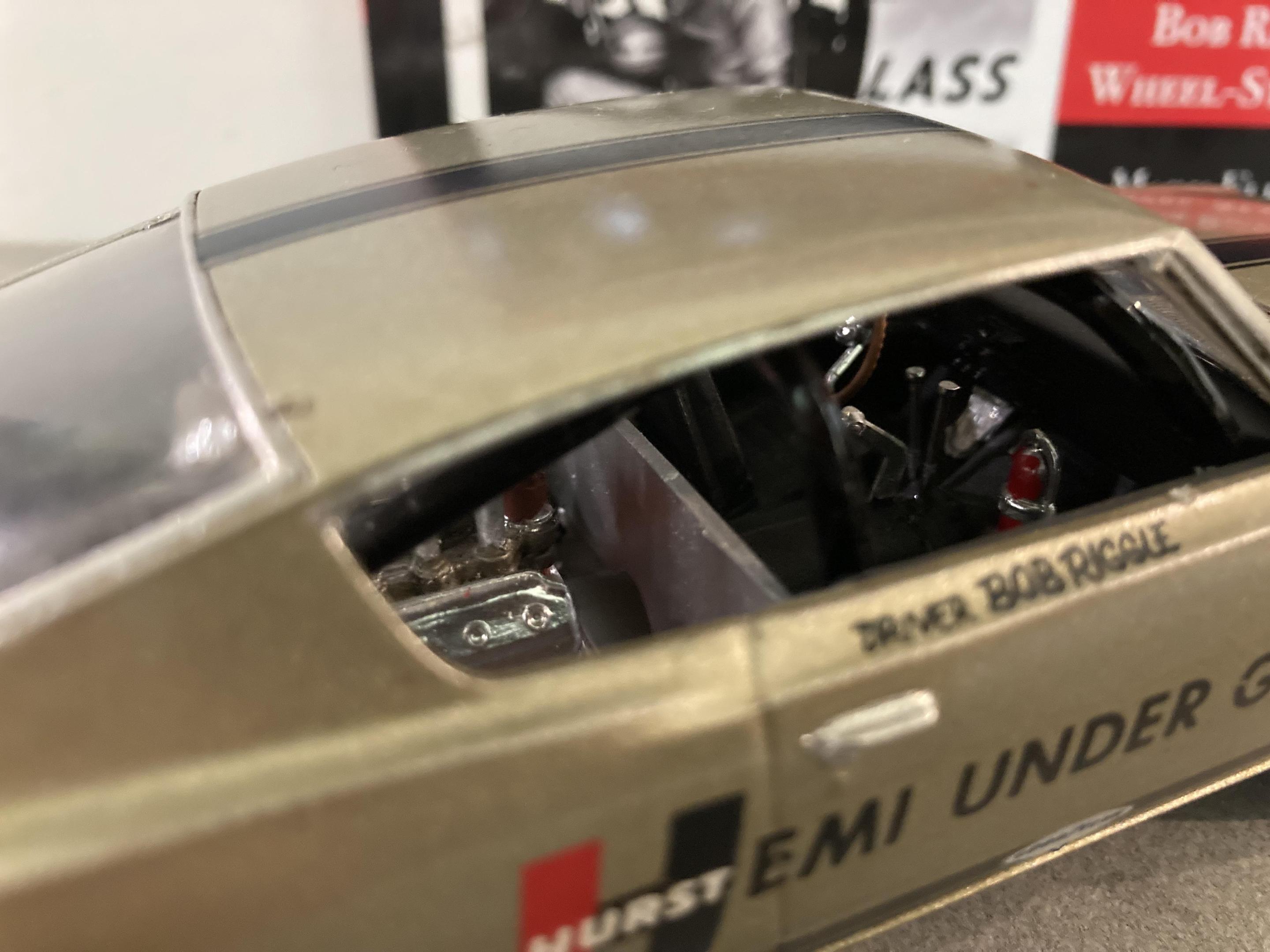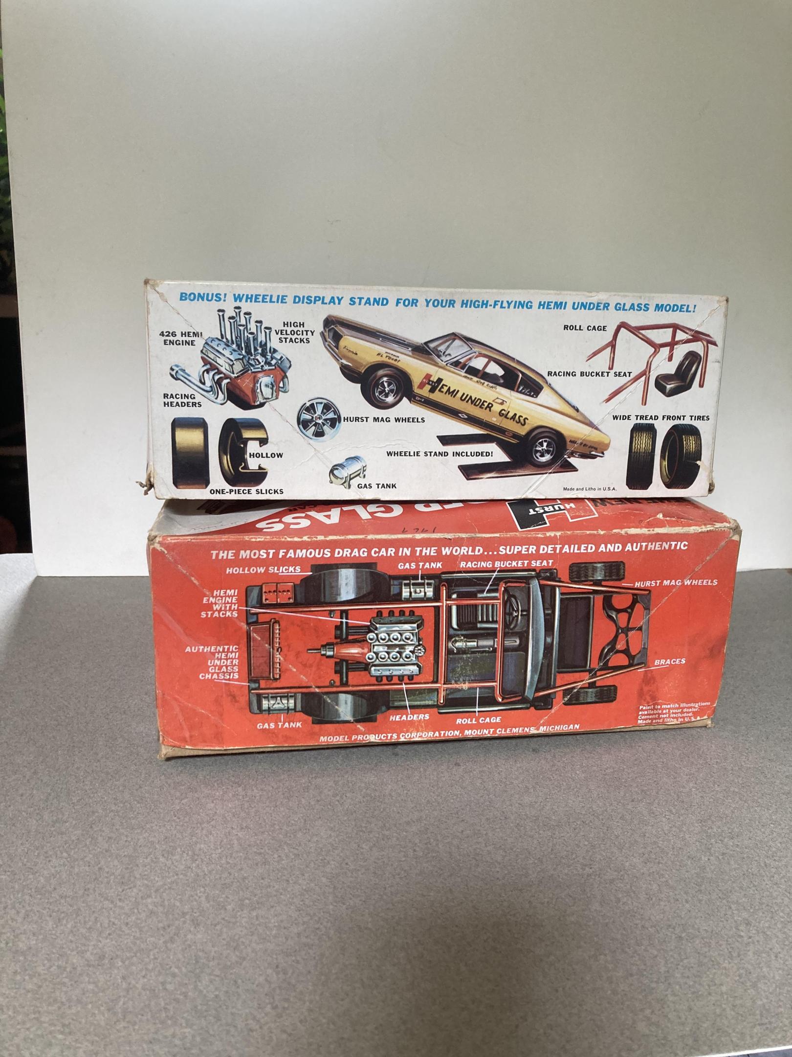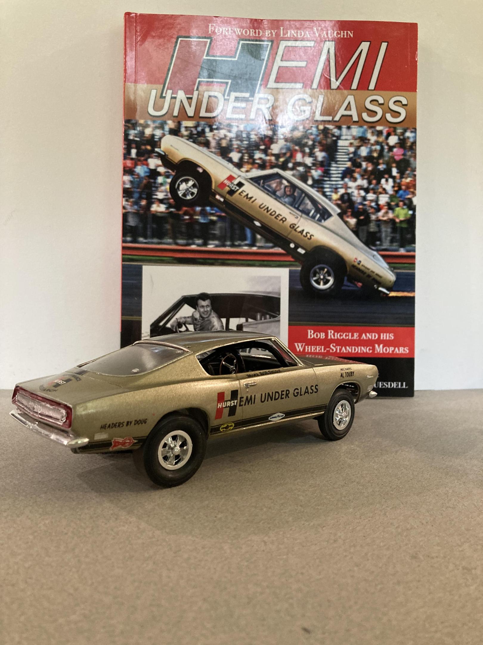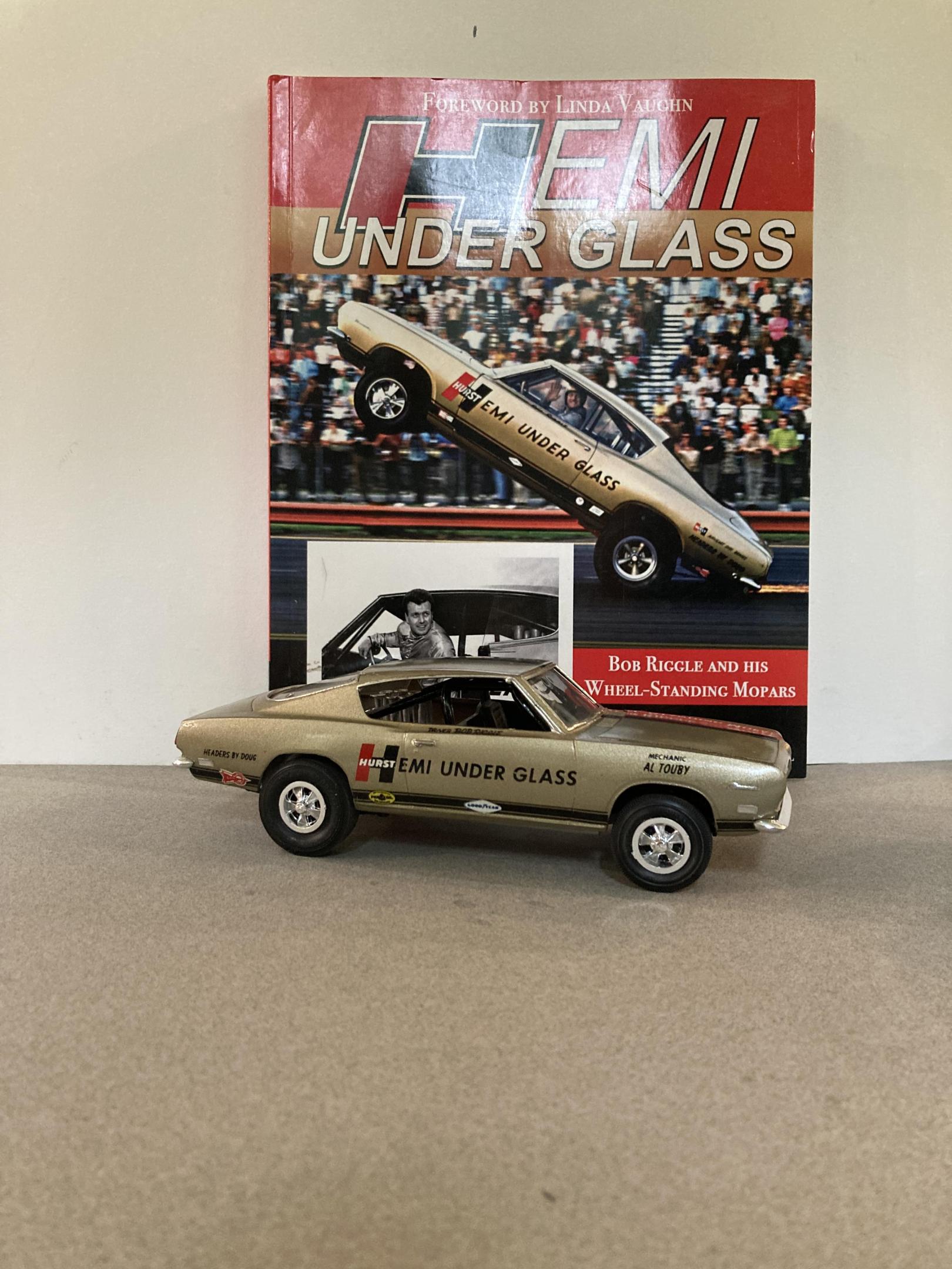 I started building this something like 35 years ago. When mpc reissued the 1969 barracuda kit. I painted the body from this kit with testors champagne gold enamel topped with Fred cady decals. Both have been long discontinued. I started building a chassis from square stock , the 69 kit’s interior shell with the back part of the floor cut out , and some parts from the little red wagon kit. Then the project stalled. A couple of years ago I purchased a box of glue bomb hemi under glass parts the best part was the original 1969 box . Then last year I was able to purchase the even harder to find original 1968 box that included some more random pieces. I got my finished painted body out clear coated it then put together a chassis, and drivetrain of original hemi under glass parts. I was able to use the original back window glass from the original kit with the molded in hold down pins. I’m really happy with how it looks. Until next time thanks for looking, mike