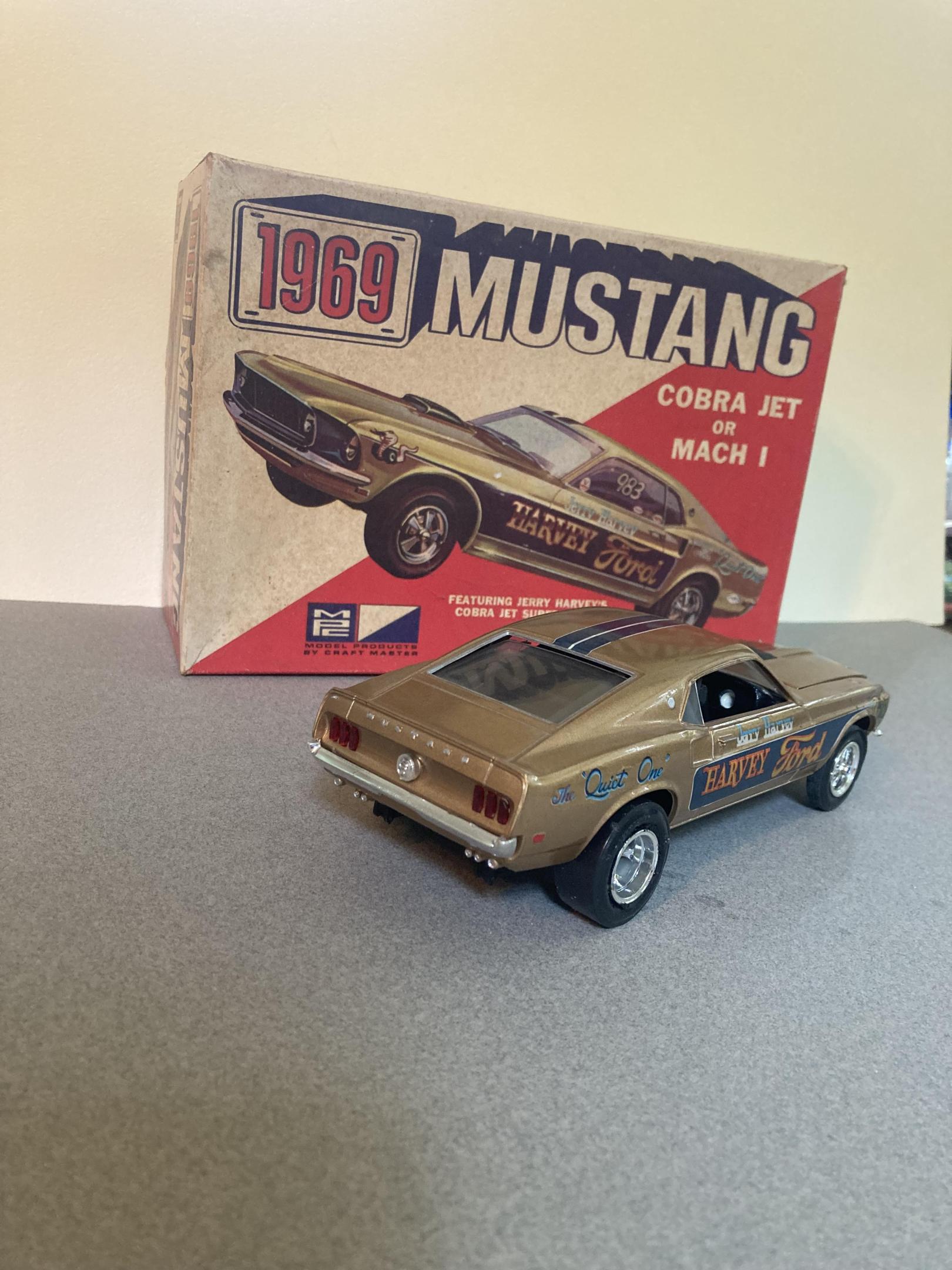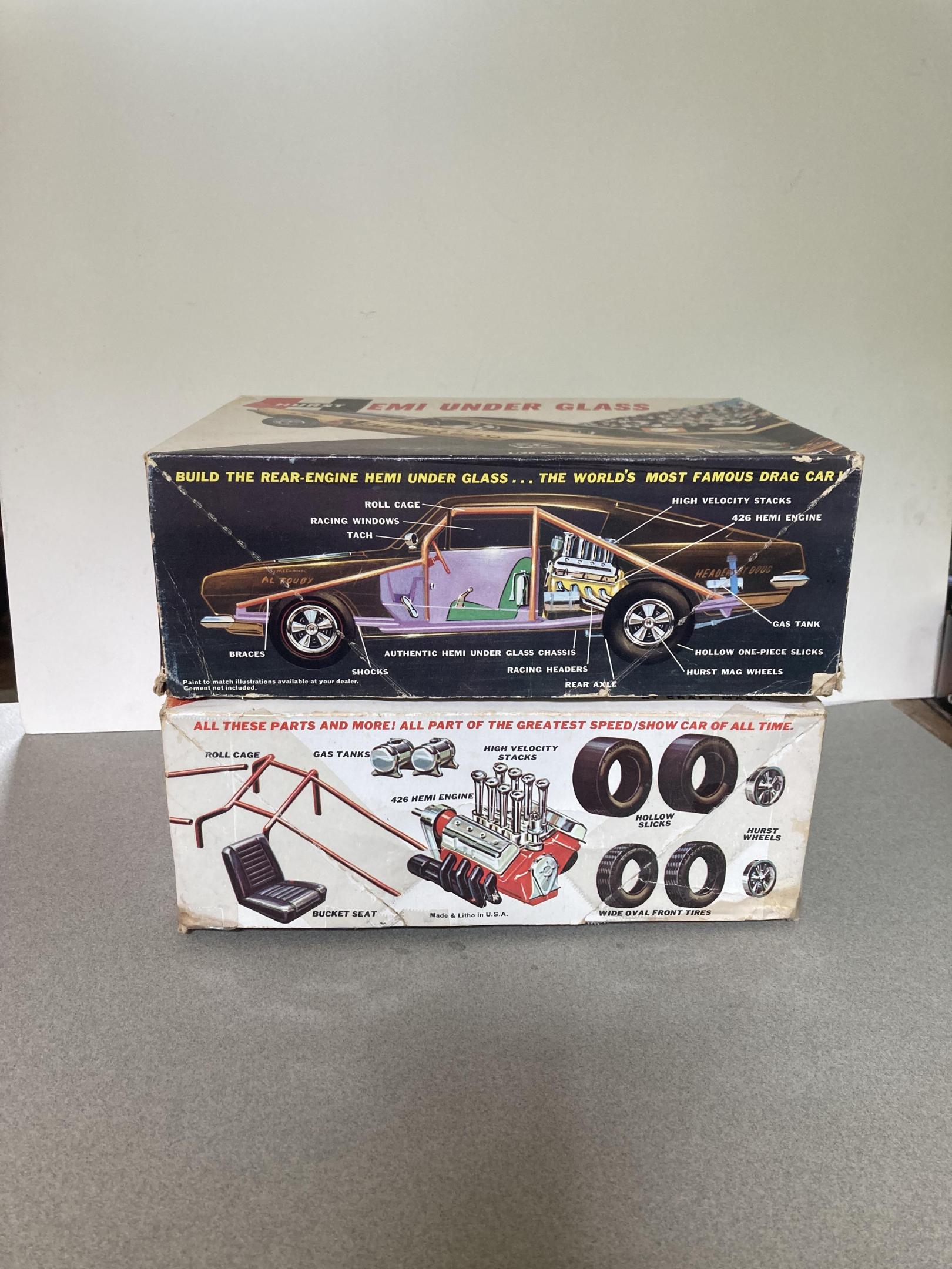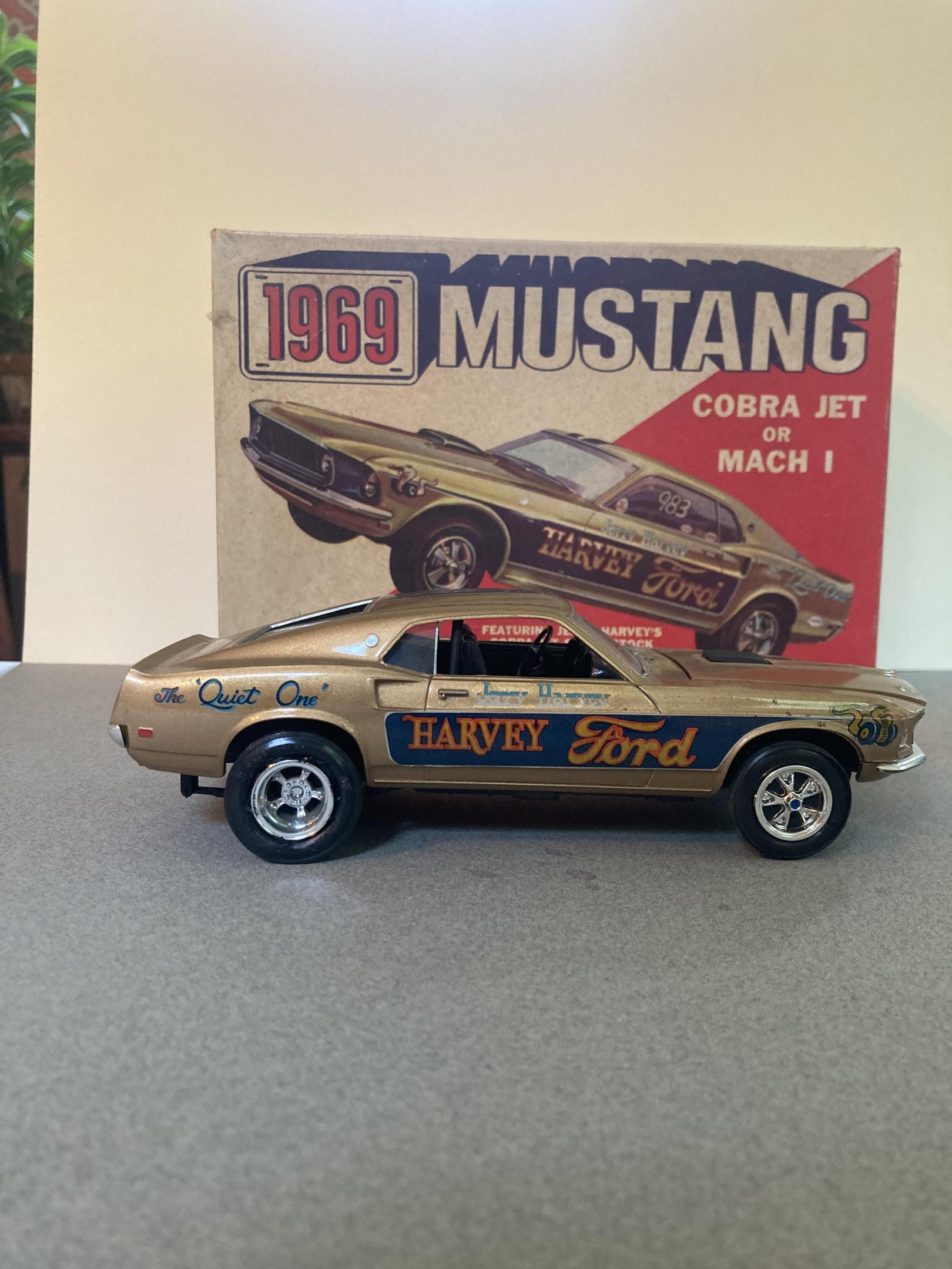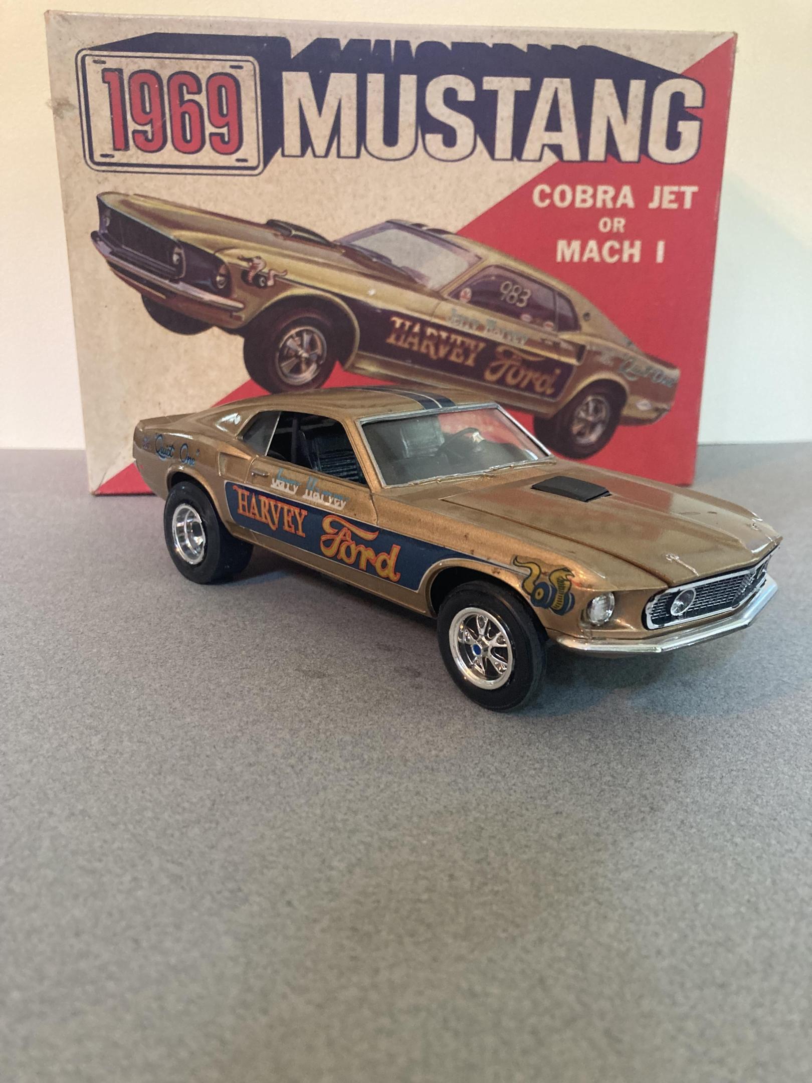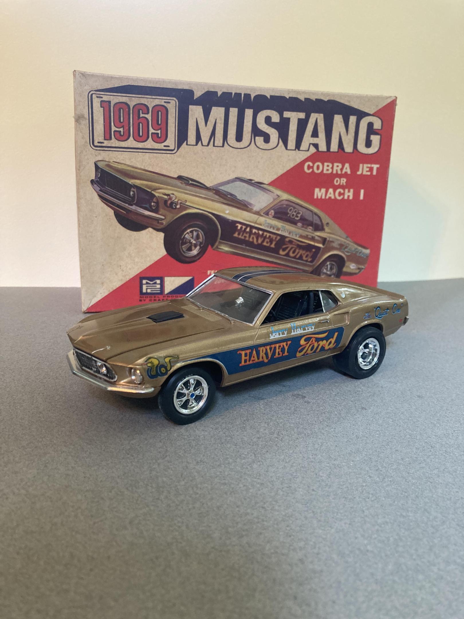 I started building this something like 35 years ago. When mpc reissued the 1969 barracuda kit. I painted the body from this kit with testors champagne gold enamel topped with Fred cady decals. Both have been long discontinued. I started building a chassis from square stock , the 69 kit’s interior shell with the back part of the floor cut out , and some parts from the little red wagon kit. Then the project stalled. A couple of years ago I purchased a box of glue bomb hemi under glass parts the best part was the original 1969 box . Then last year I was able to purchase the even harder to find original 1968 box that included some more random pieces. I got my finished painted body out clear coated it then put together a chassis, and drivetrain of original hemi under glass parts. I was able to use the original back window glass from the original kit with the molded in hold down pins. I’m really happy with how it looks. Until next time thanks for looking, mike