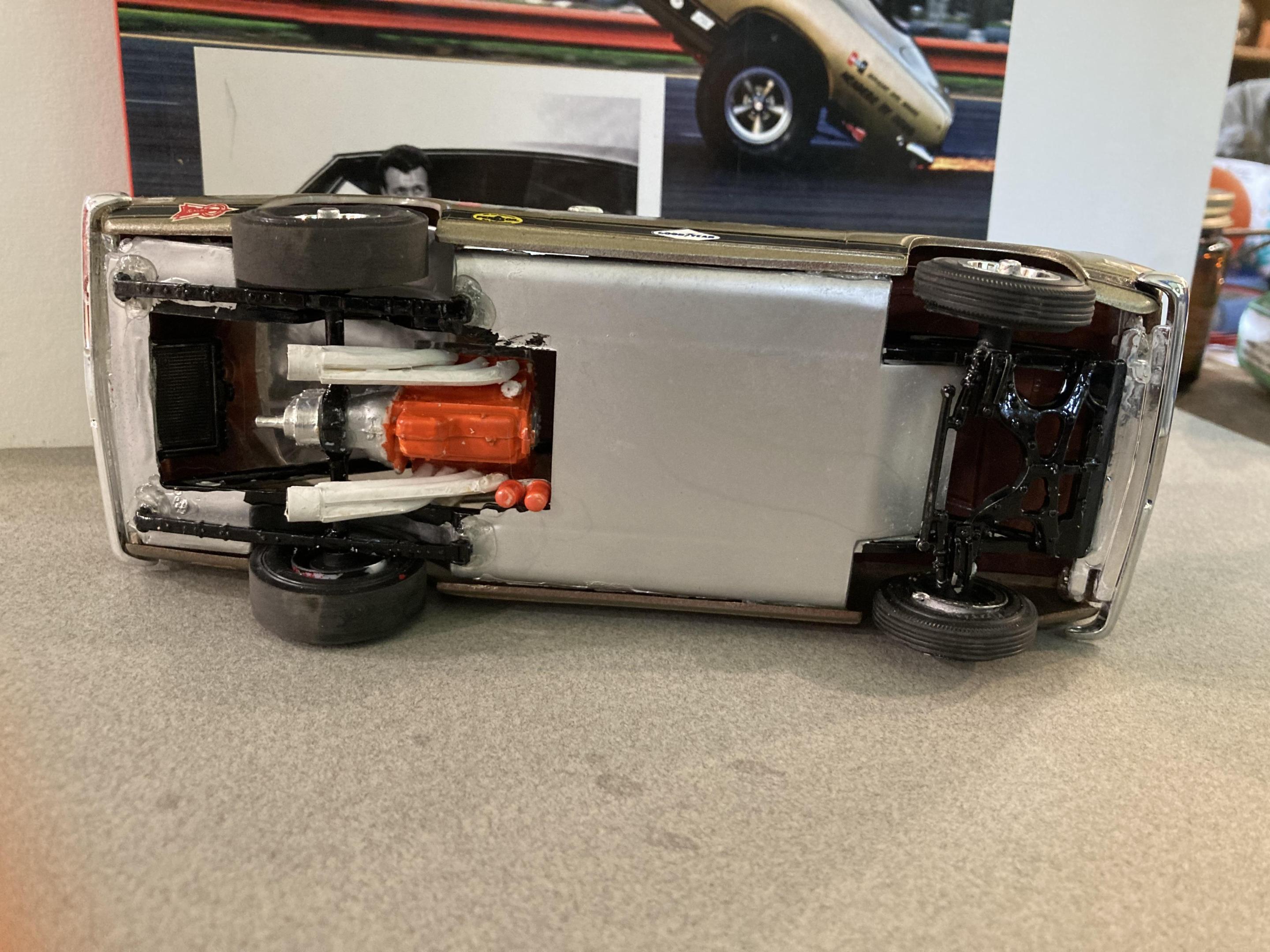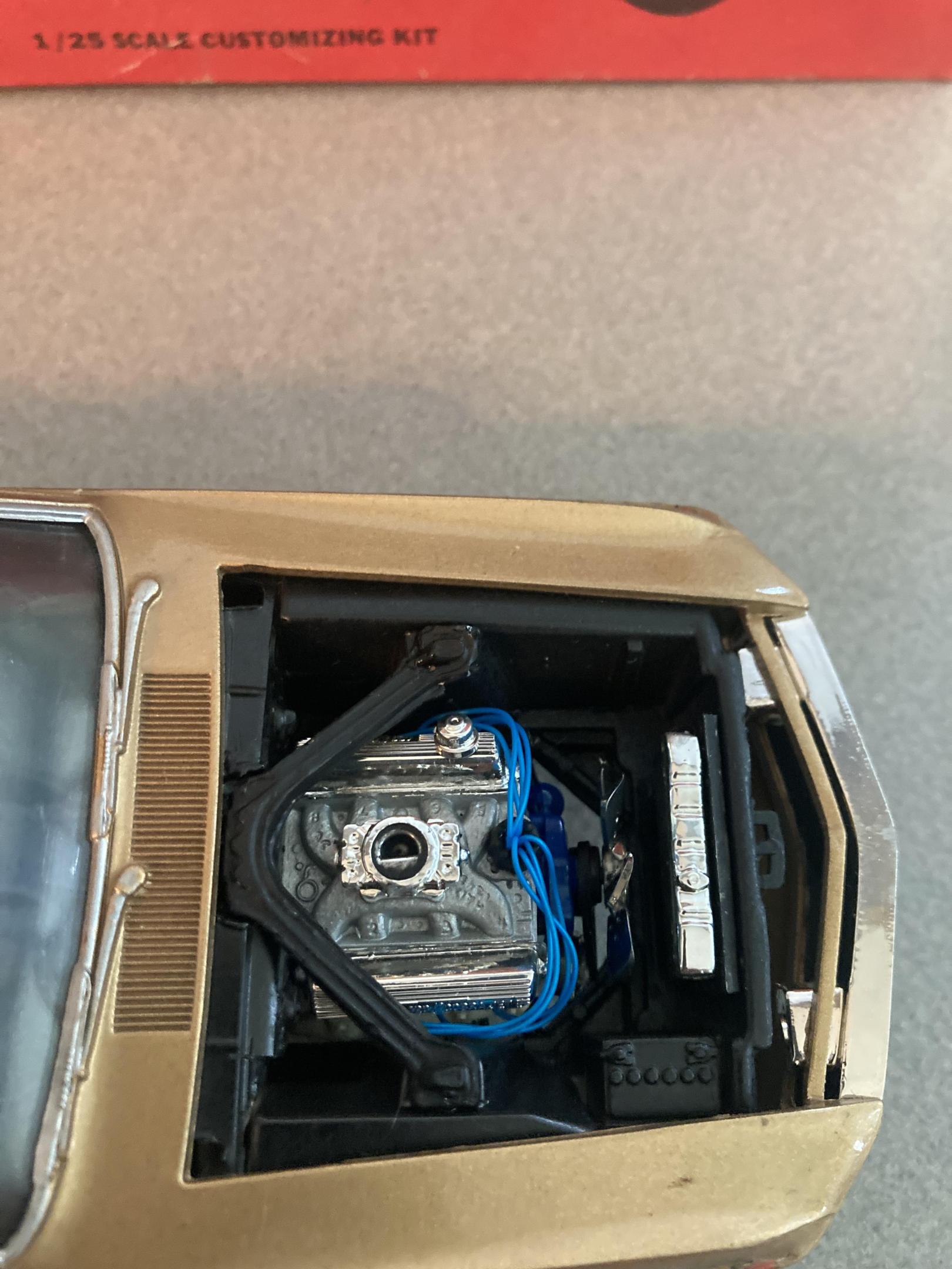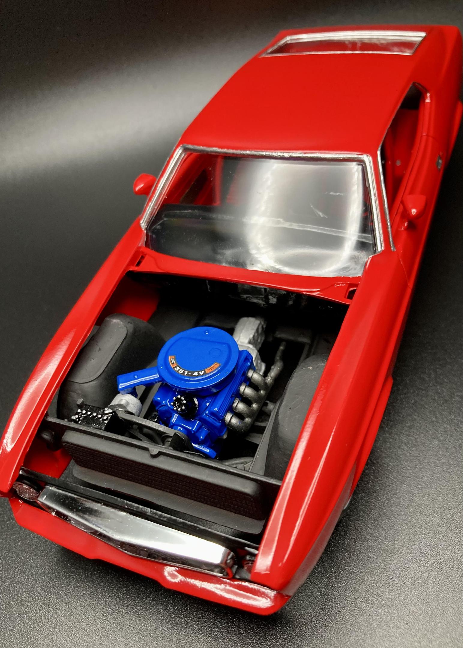 Welp, it took me a little bit to finish this kit but I finally got it done and... I'm quite pleased with the result. This car had a couple paint issues mainly because it was the first car I airbrushed but I finally got them settled out, the color is testors red metallic flake with DupliColor filler primer and decanted Rustoleum enamel clear (only way I could spray it without it lifting the paint). There are not many things in the terms of modifications on this car. Really the only thing was the intake, where I shortened the carb mounting plate because originally they were too far apart, and parts box carbs/ air cleaners were added. The cool thing is when I told my grandfather that I picked this up from the LHS he said he built this kit back in the 70s as a kid. I didn't know that and thought it was pretty cool. I also happened to have some of his surviving models, low and behold, I HAVE HIS ORIGINAL BUILD UP! I was so happy and almost emedietly started building my kit. Oh and don't ask where the passengers side tail light went, I swear I don't know (6 tail light mod) Photo of his original build up. The back portion of the interior felt quite bare so I decided to add the racing fuel tank that comes with the kit. Of course it's my standard to at least do spark plug wires on each model. I decided to experiment with fuel lines to, turned out pretty well I think. It was a blast building this kit and was a pretty good learning opportunity for me. The struggles were worth it and I definitely learned how to avoid them. I guess now I clean off the bench and start another kit, what do you say fellas? Thanks for looking and I always appreciate your comments and feedback! Elliot