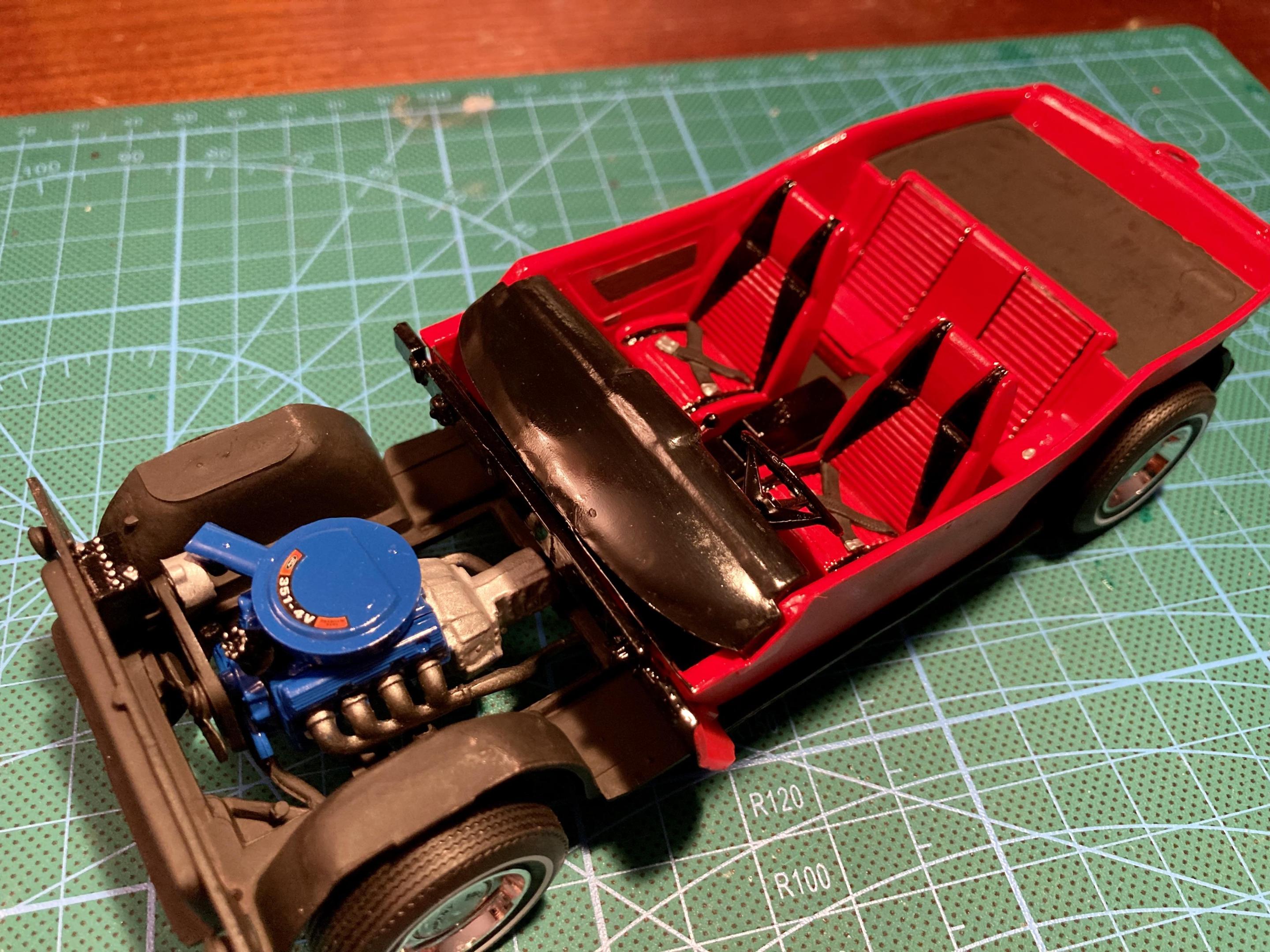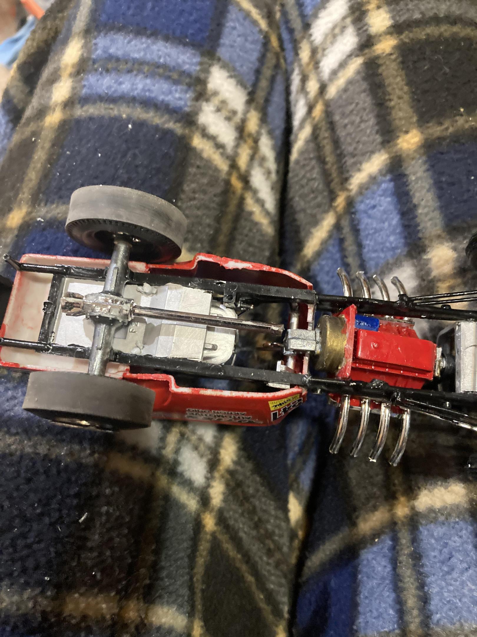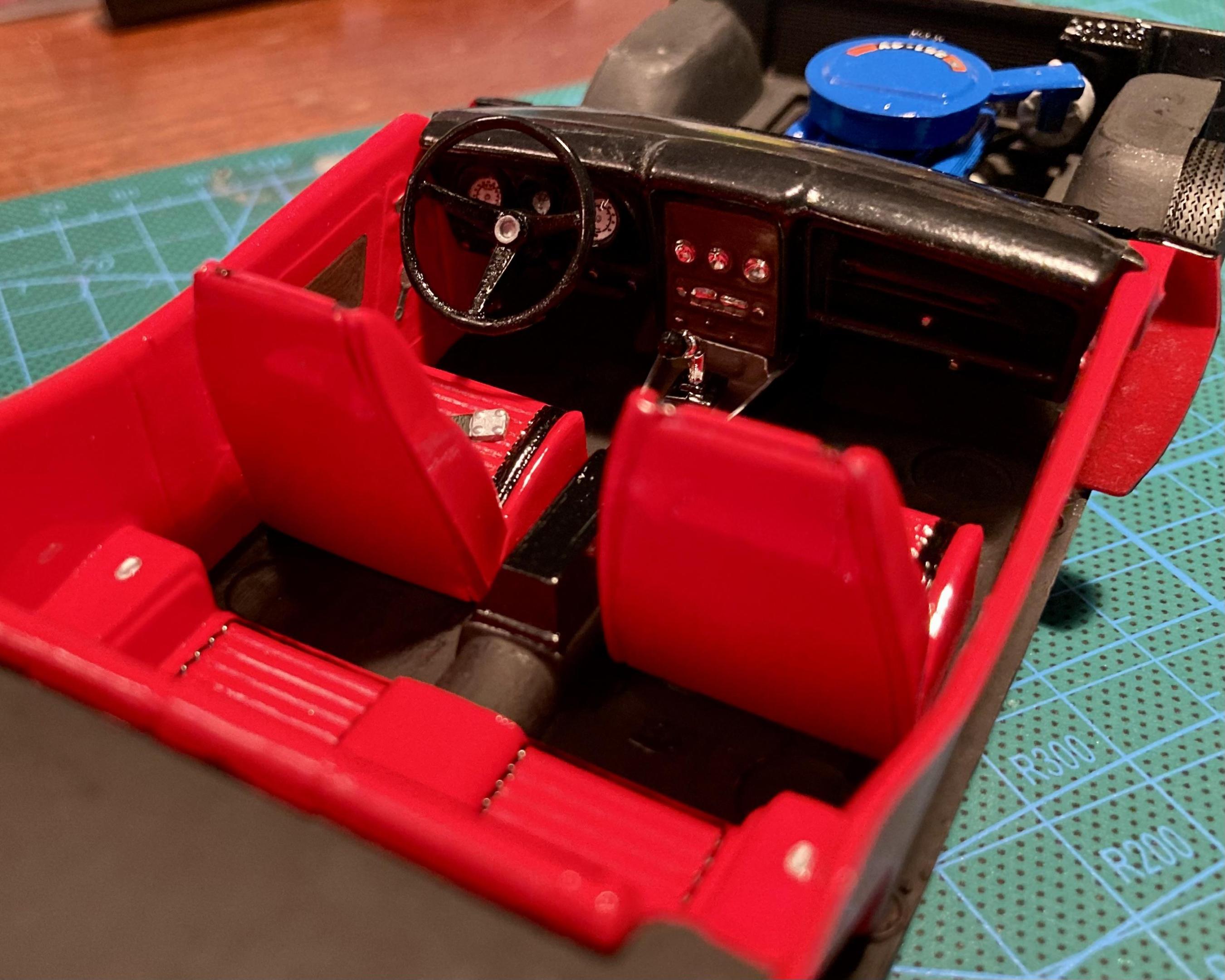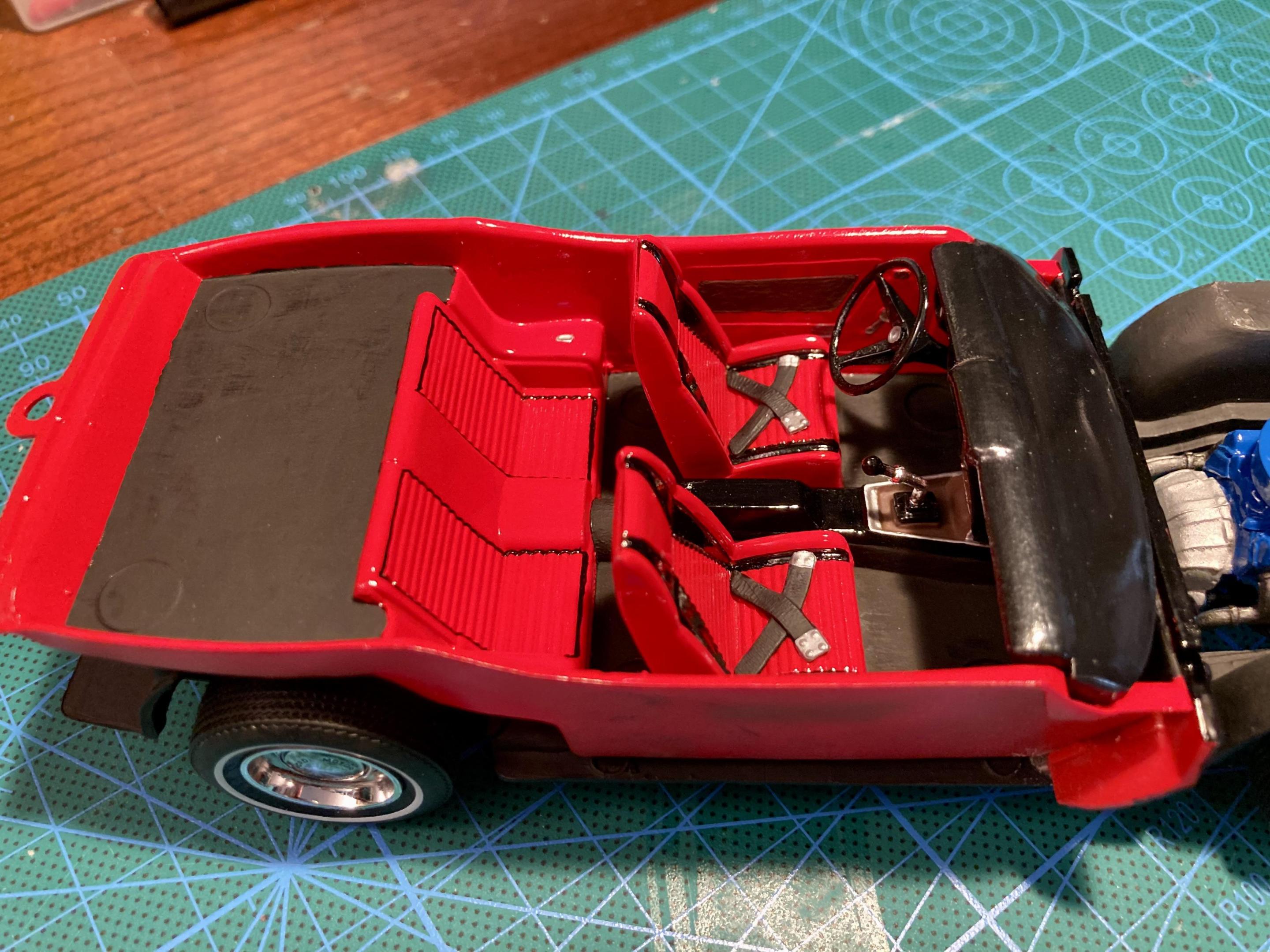 Welp, it took me a little bit to finish this kit but I finally got it done and... I'm quite pleased with the result. This car had a couple paint issues mainly because it was the first car I airbrushed but I finally got them settled out, the color is testors red metallic flake with DupliColor filler primer and decanted Rustoleum enamel clear (only way I could spray it without it lifting the paint). There are not many things in the terms of modifications on this car. Really the only thing was the intake, where I shortened the carb mounting plate because originally they were too far apart, and parts box carbs/ air cleaners were added. The cool thing is when I told my grandfather that I picked this up from the LHS he said he built this kit back in the 70s as a kid. I didn't know that and thought it was pretty cool. I also happened to have some of his surviving models, low and behold, I HAVE HIS ORIGINAL BUILD UP! I was so happy and almost emedietly started building my kit. Oh and don't ask where the passengers side tail light went, I swear I don't know (6 tail light mod) Photo of his original build up. The back portion of the interior felt quite bare so I decided to add the racing fuel tank that comes with the kit. Of course it's my standard to at least do spark plug wires on each model. I decided to experiment with fuel lines to, turned out pretty well I think. It was a blast building this kit and was a pretty good learning opportunity for me. The struggles were worth it and I definitely learned how to avoid them. I guess now I clean off the bench and start another kit, what do you say fellas? Thanks for looking and I always appreciate your comments and feedback! Elliot