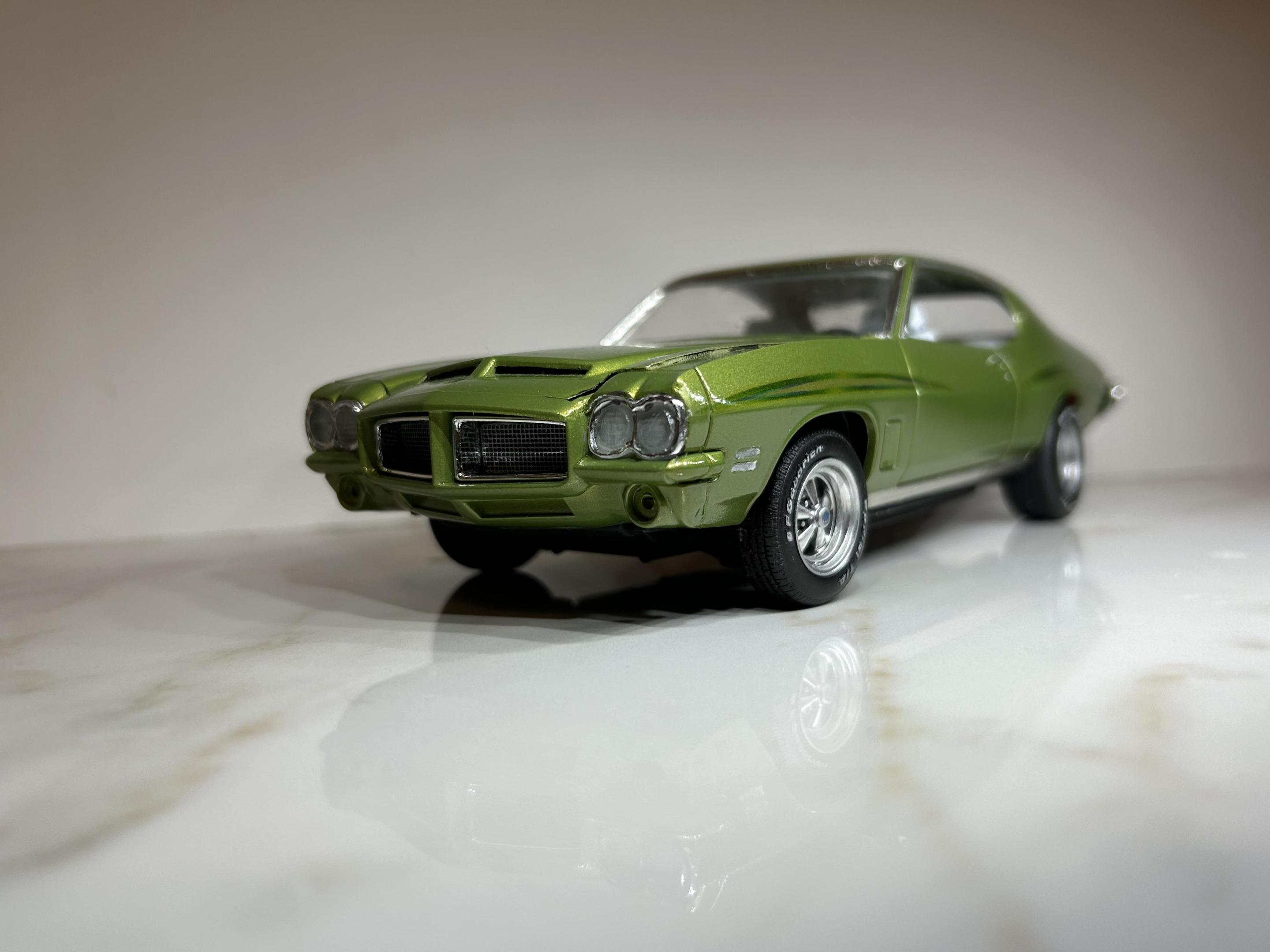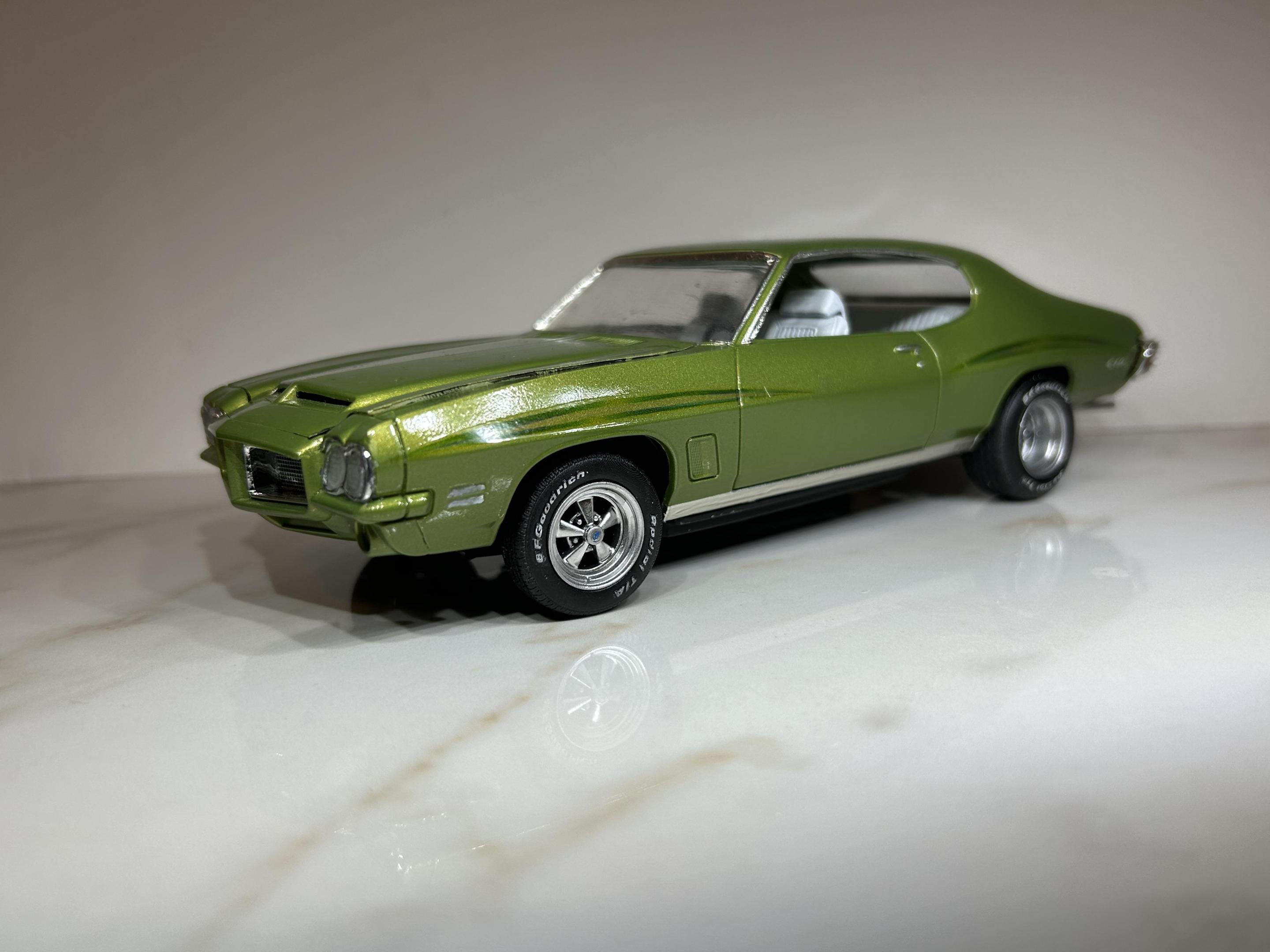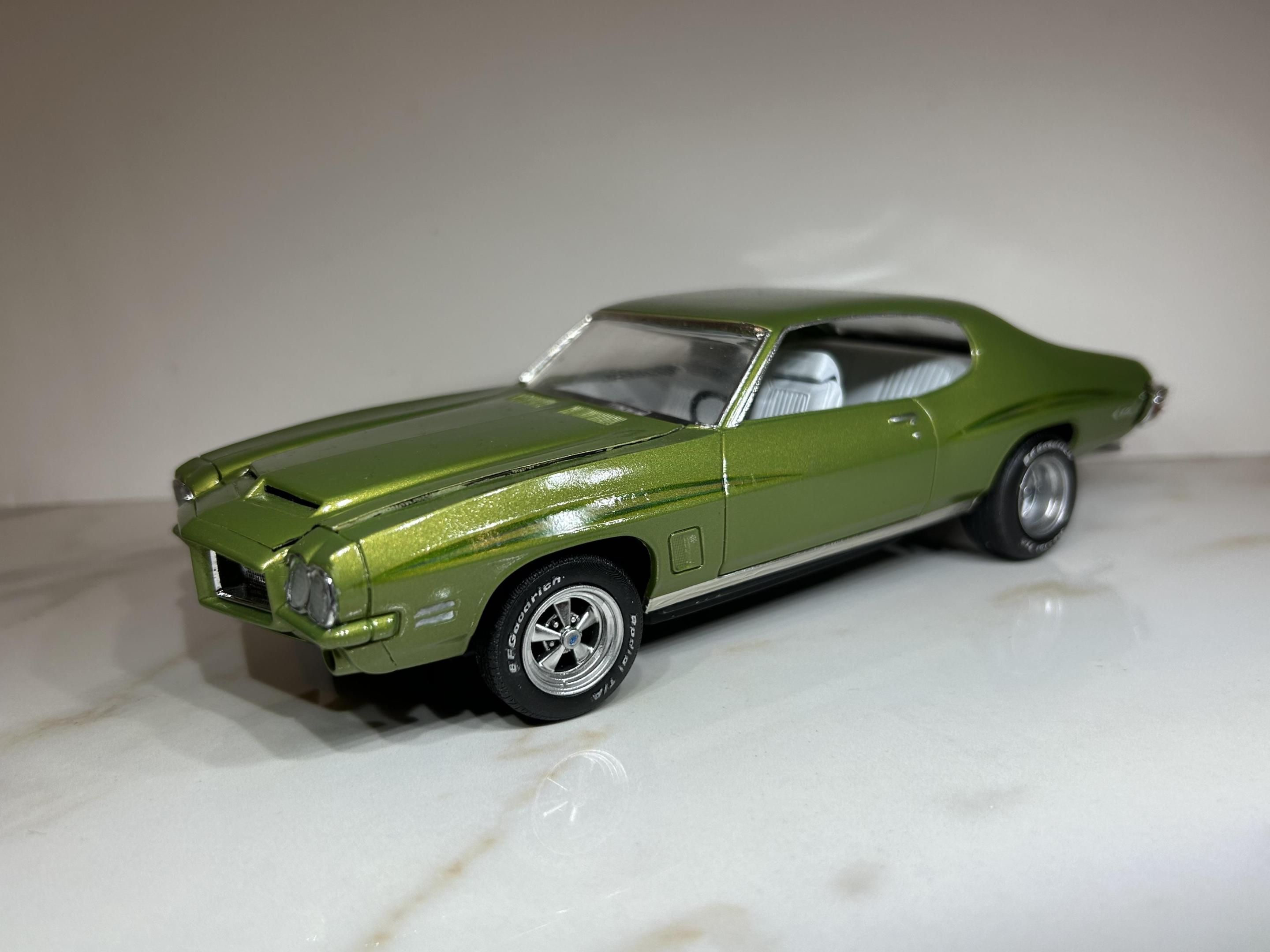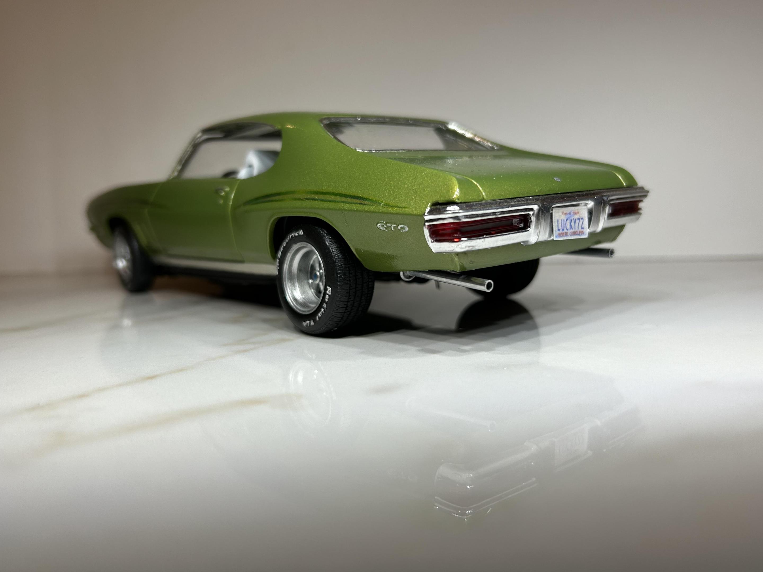 Sometimes you have to challenge yourself. Now, MPC and AMT get a lot of hate, but they have some of THE BEST subjects for builds. Despite some lack of some items needed to complete them easily out of the box, they can be really good fun projects. This was the case for this MPC 1972 GTO. The main issue I had with this kit was lack of a proper detailed chassis. So what did I do? I got a spare 69 Olds 442 chassis out and remedied the ailments of the GTO. I LOVE this build because it reminds me of something my brother would have done in the old days. Iceman Collections Cragars, the Revell 66 GTO 389, and my wife’s “Judge-Like” stripes make it one of my favorites to just look at on my display for long periods of time. Here’s some pictures…