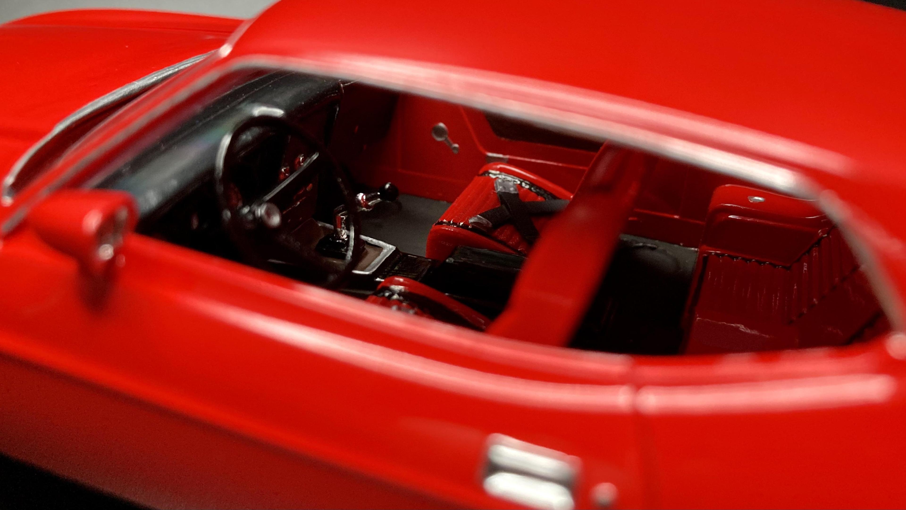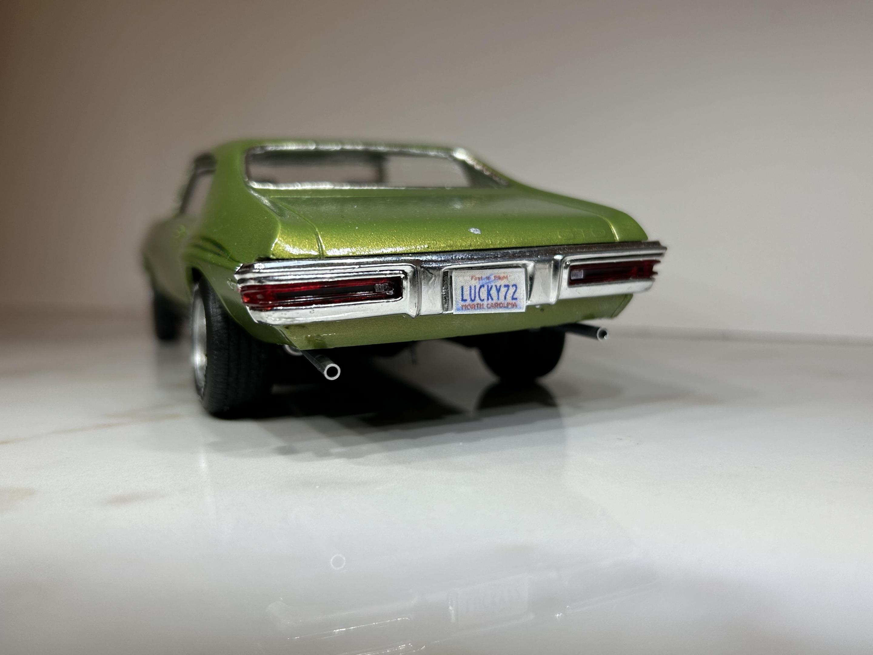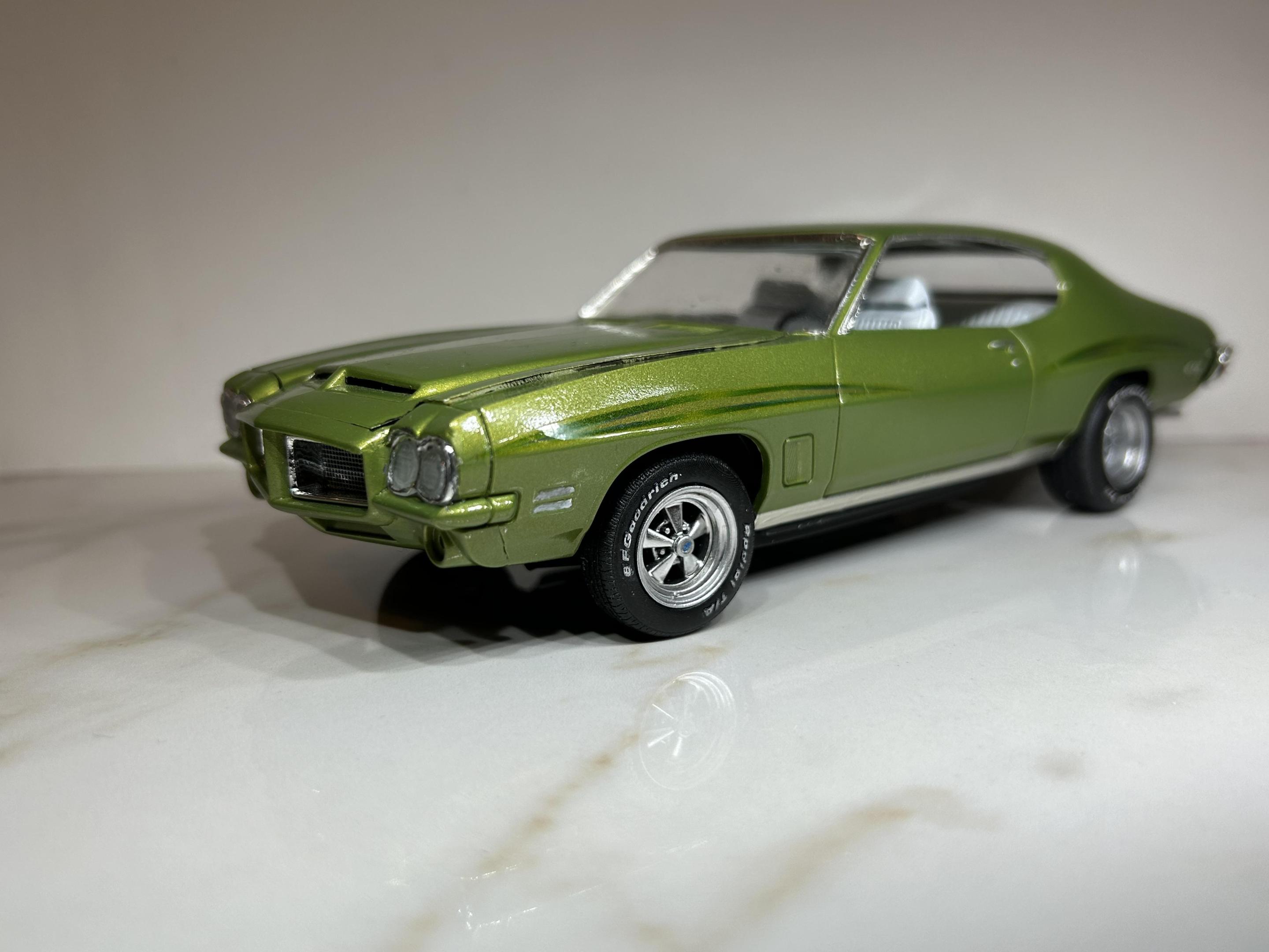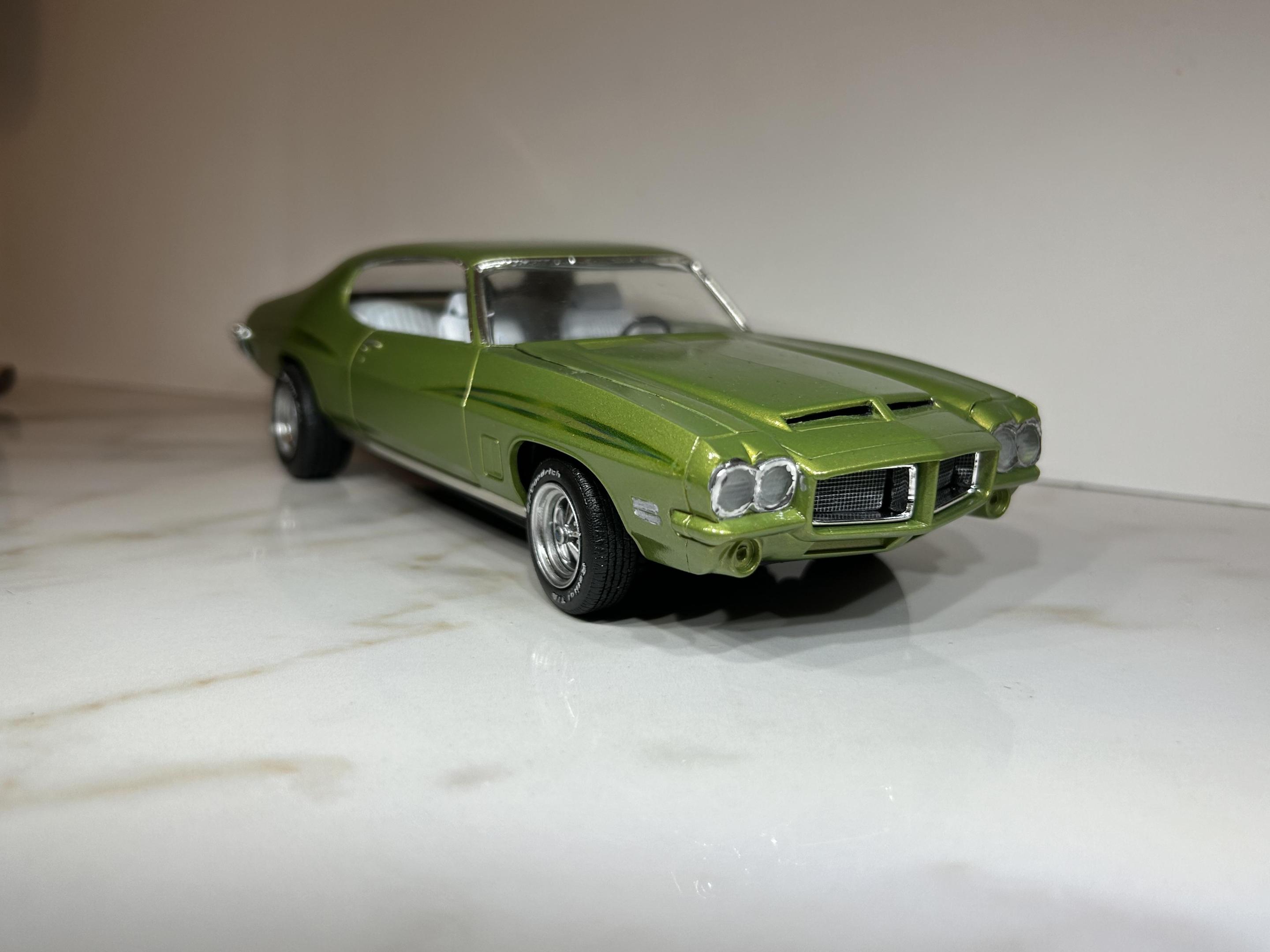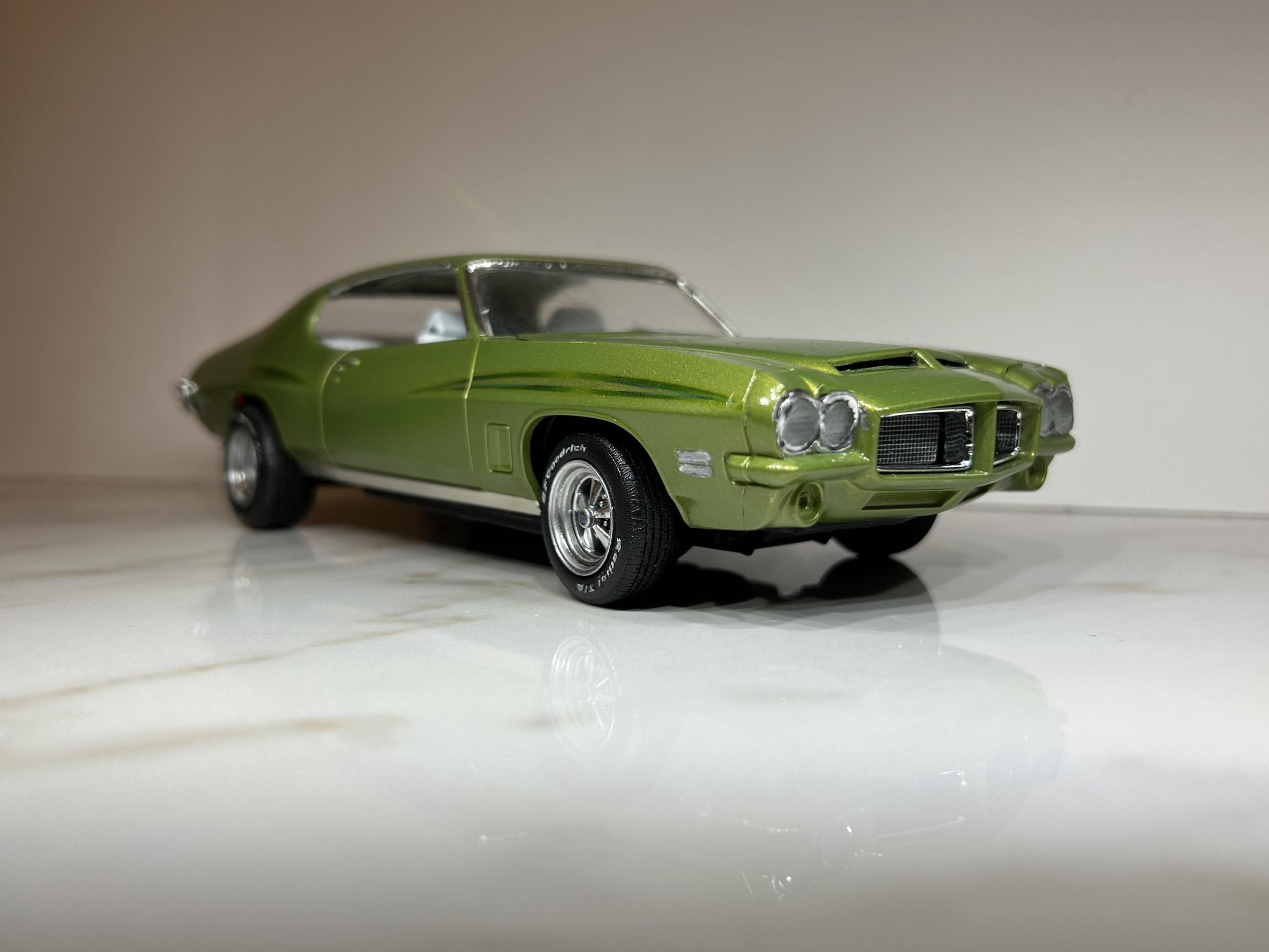 Sometimes you have to challenge yourself. Now, MPC and AMT get a lot of hate, but they have some of THE BEST subjects for builds. Despite some lack of some items needed to complete them easily out of the box, they can be really good fun projects. This was the case for this MPC 1972 GTO. The main issue I had with this kit was lack of a proper detailed chassis. So what did I do? I got a spare 69 Olds 442 chassis out and remedied the ailments of the GTO. I LOVE this build because it reminds me of something my brother would have done in the old days. Iceman Collections Cragars, the Revell 66 GTO 389, and my wife’s “Judge-Like” stripes make it one of my favorites to just look at on my display for long periods of time. Here’s some pictures…