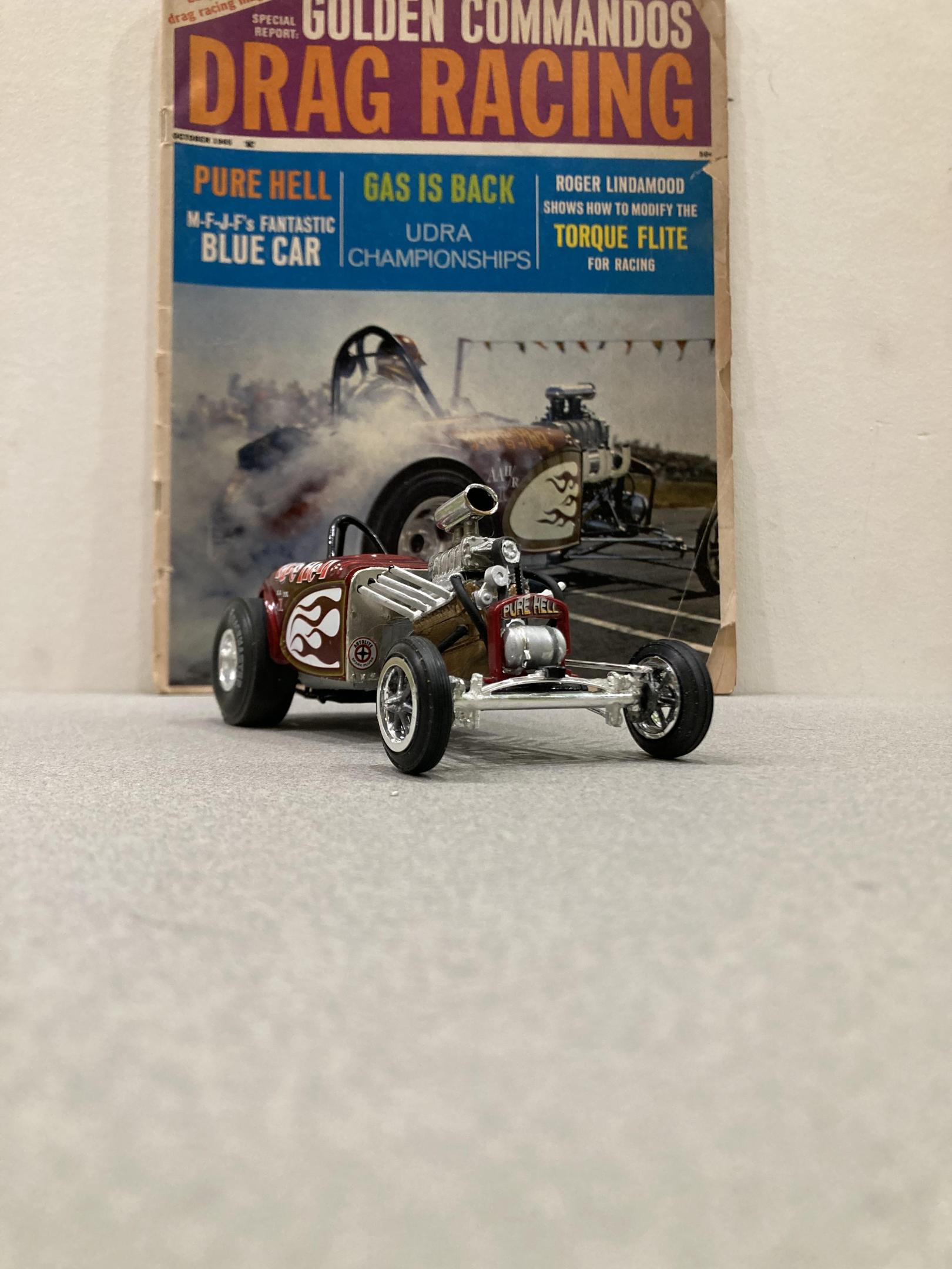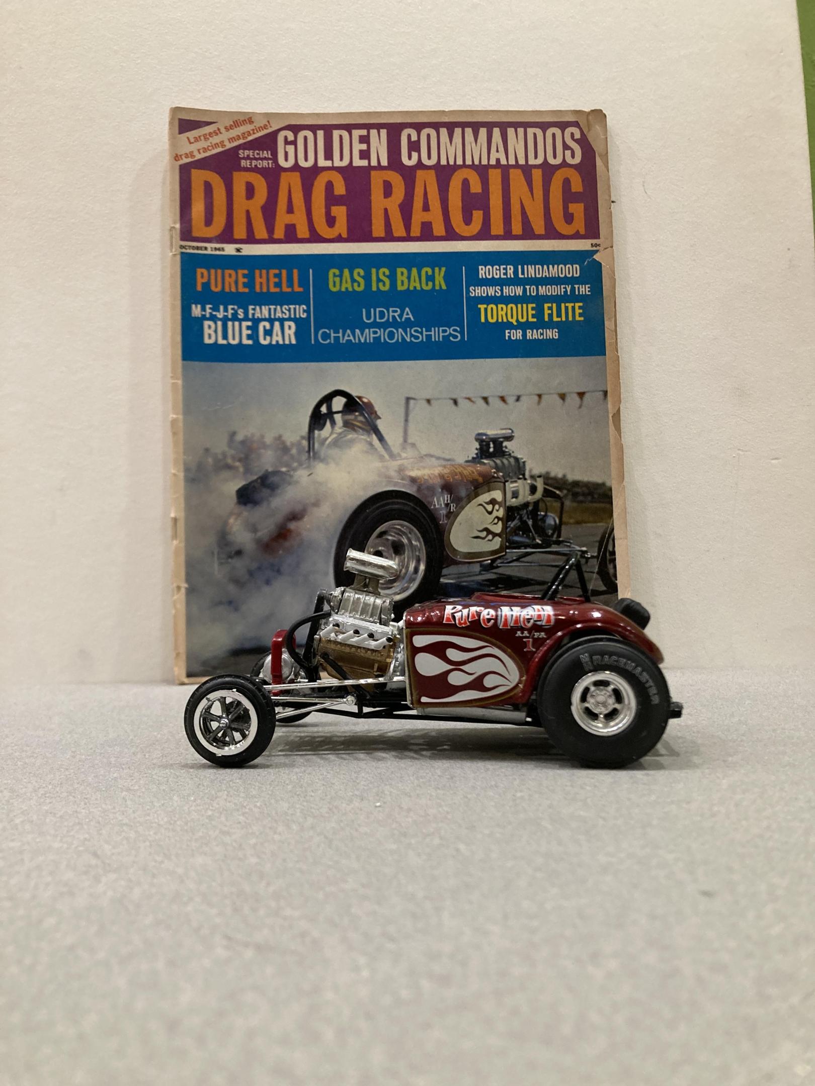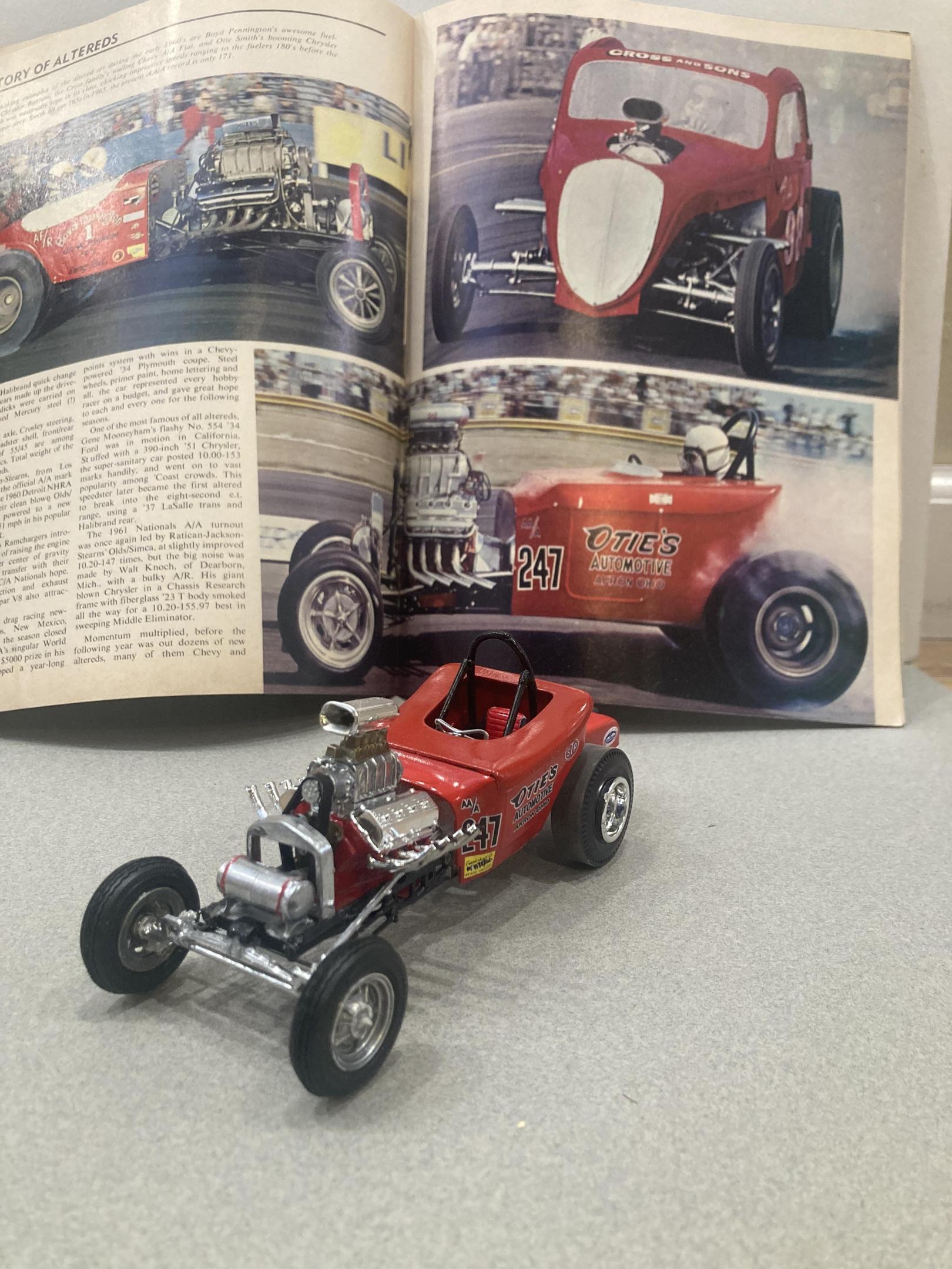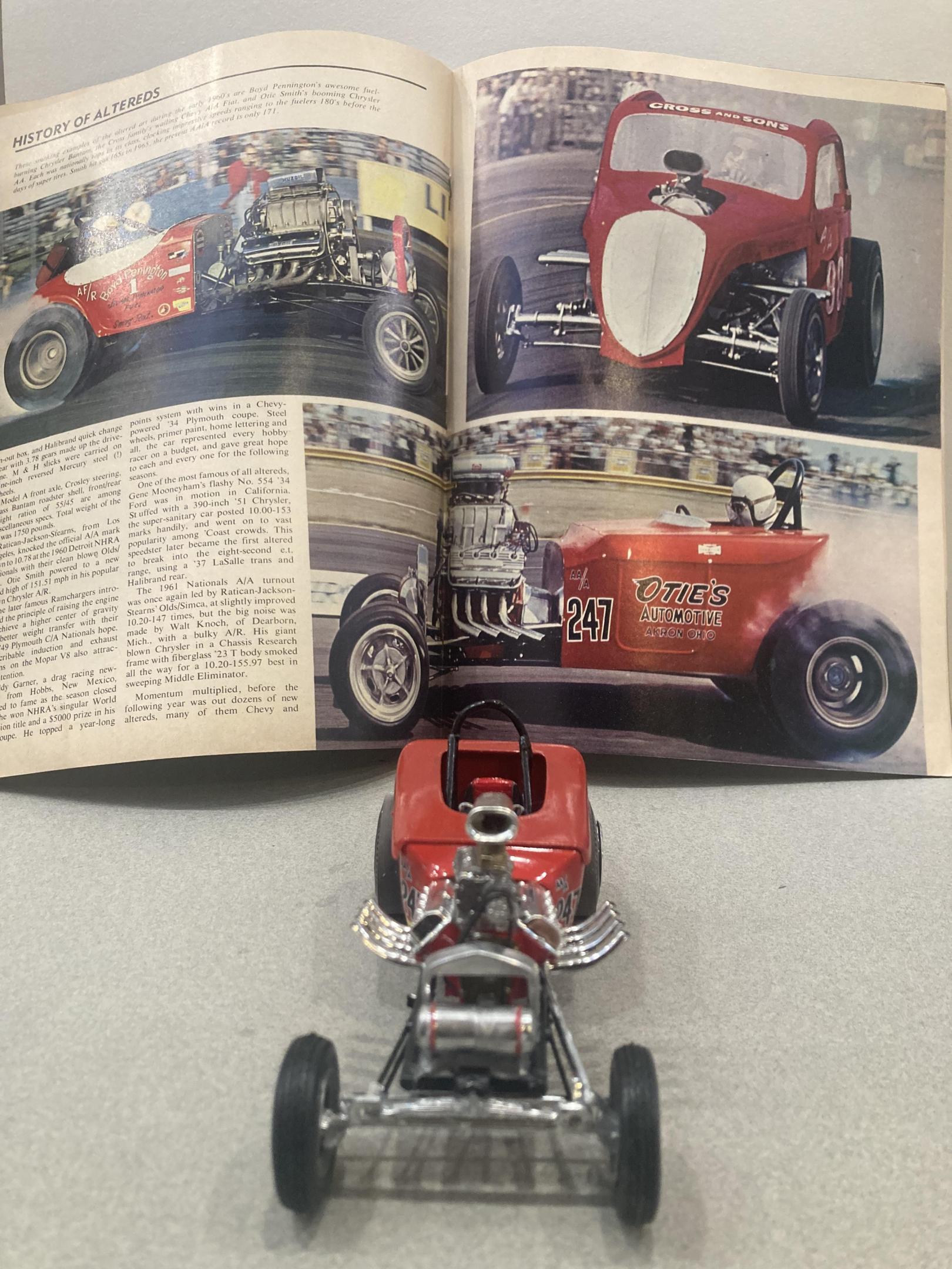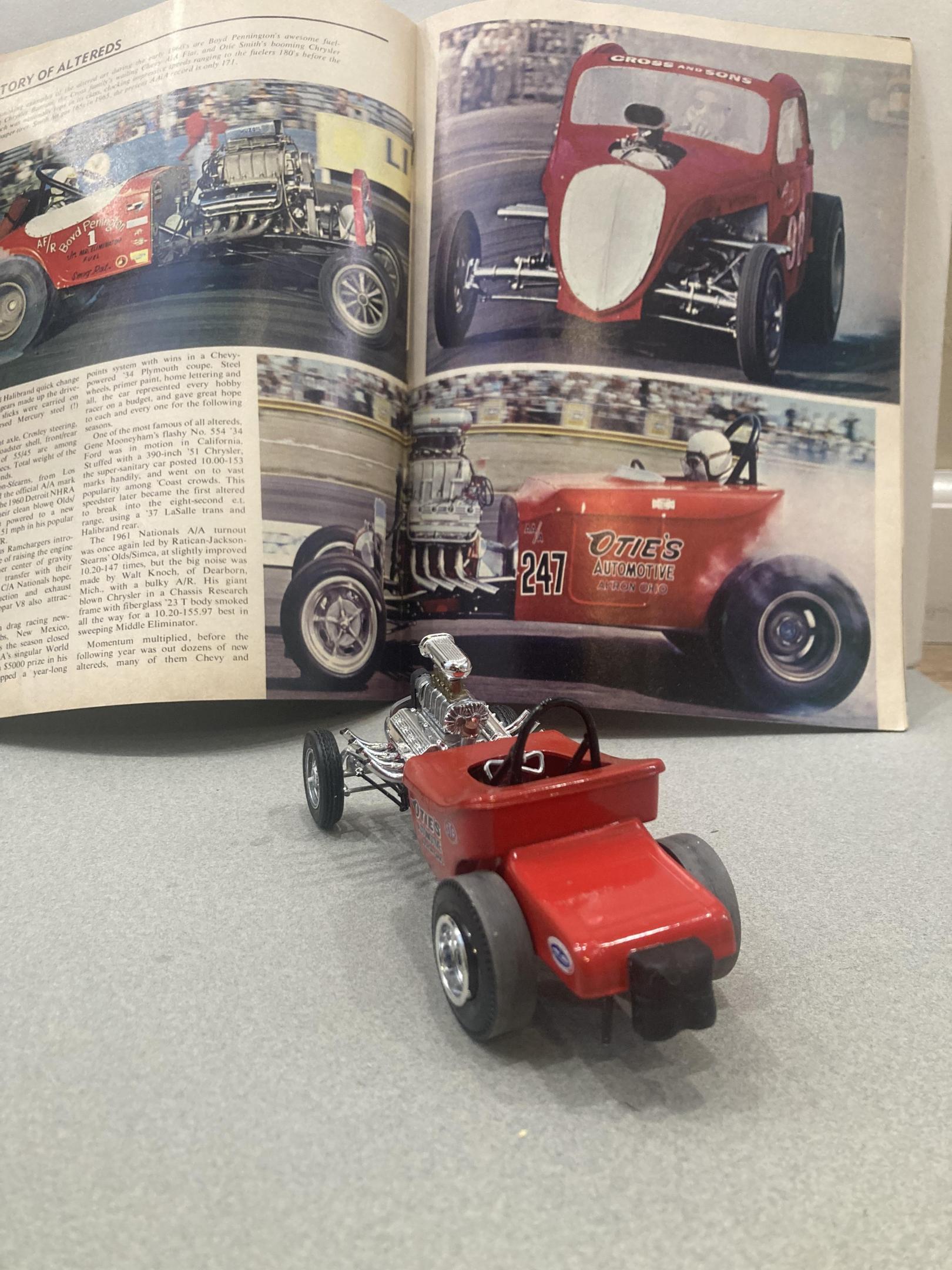 This is constructed from a mix of parts starting with the AMT T body parts pack. The frame is a combination of the double dragster fiat for the back half with front half of the single engine dragster frame. The front axle and spring are left overs from the Atlantis fiat. The roll bar hoop is made of 0.80 styrene rod. The 392 hemi is from the MPC bantam blast kit the headers are actually the hemi injector tubes from a couple of double dragster kits. The rear wheels are some left overs from the AMT 40 Willy’s kit with AMT pie crust slicks. The front wheels are from the MPC Winged Express warped with some spare AMT hollow Firestone supremes . The red paint on the bucket is Testors red enamel with wet look clear. The Tuanna cover is painted with a Krylon red to get a slight contrast. The decals are available from Chris Walsh . I did add the NHRA , and the welded strokers crankshaft decals from a random Slixx sheet. The reference photo is from an early 70’s issue of DRAG RACING USA. Until next time thanks for looking. Mike