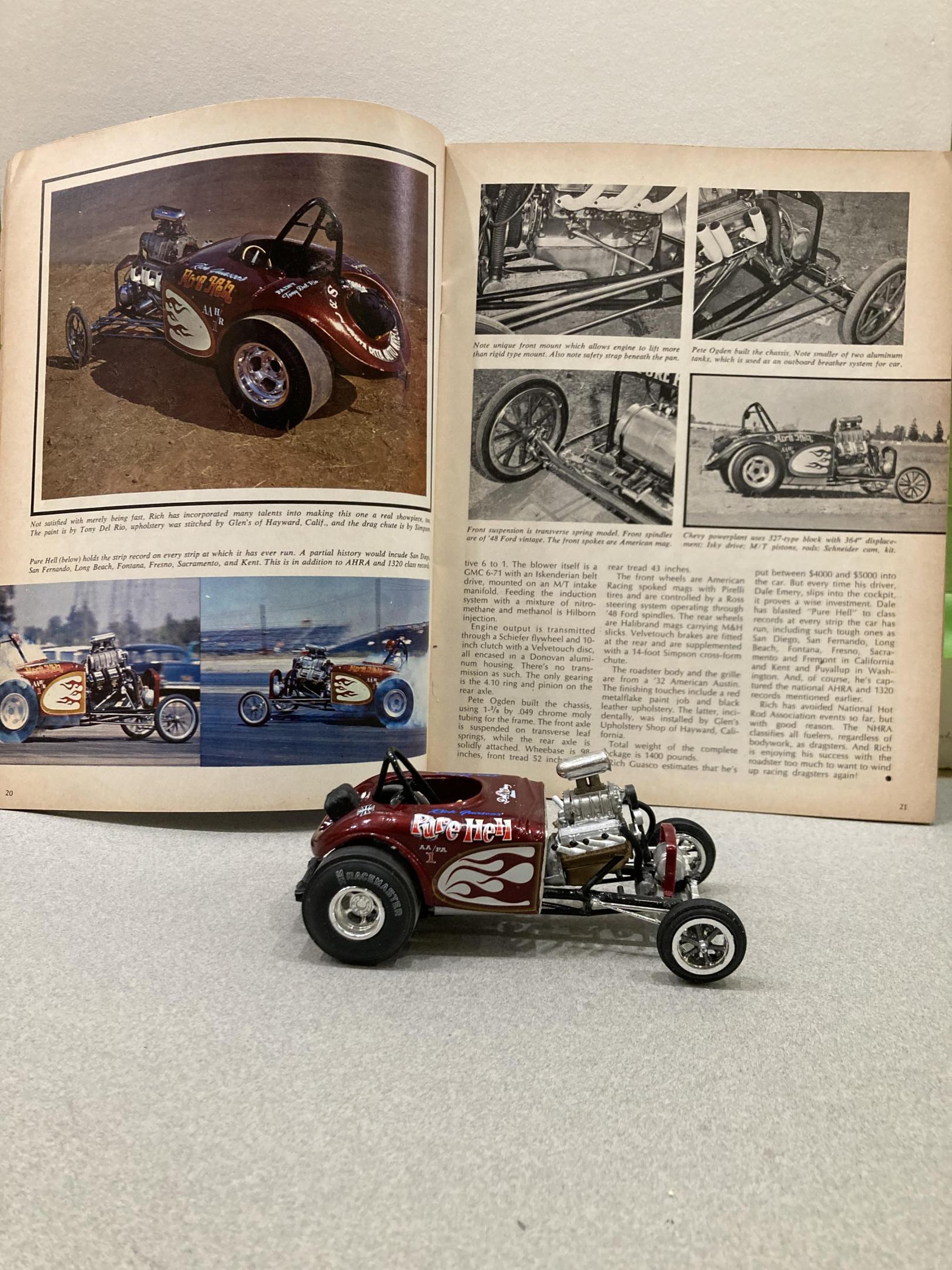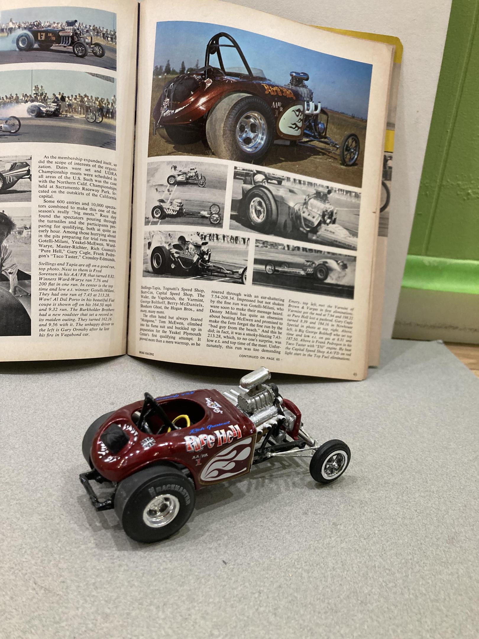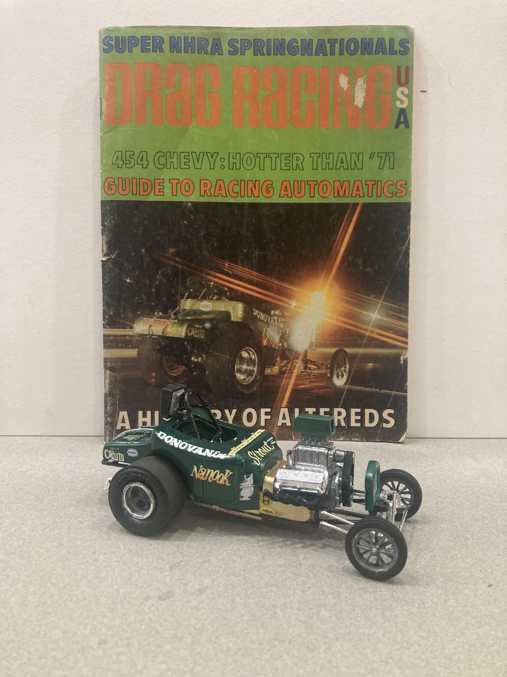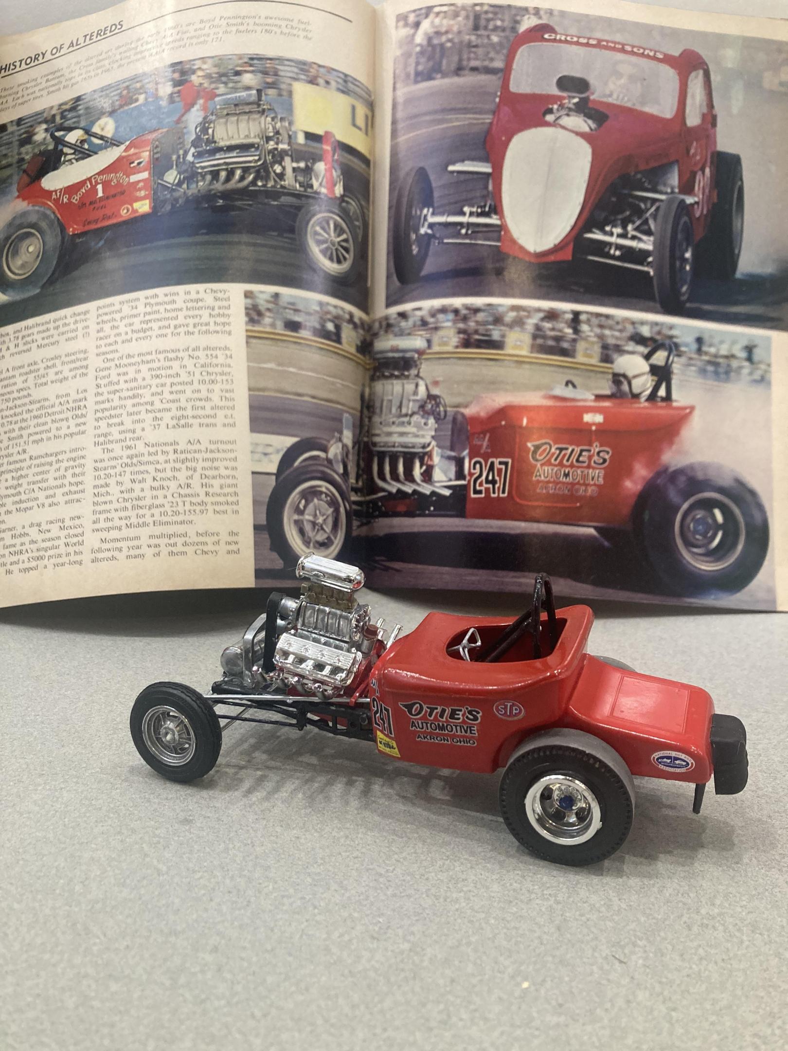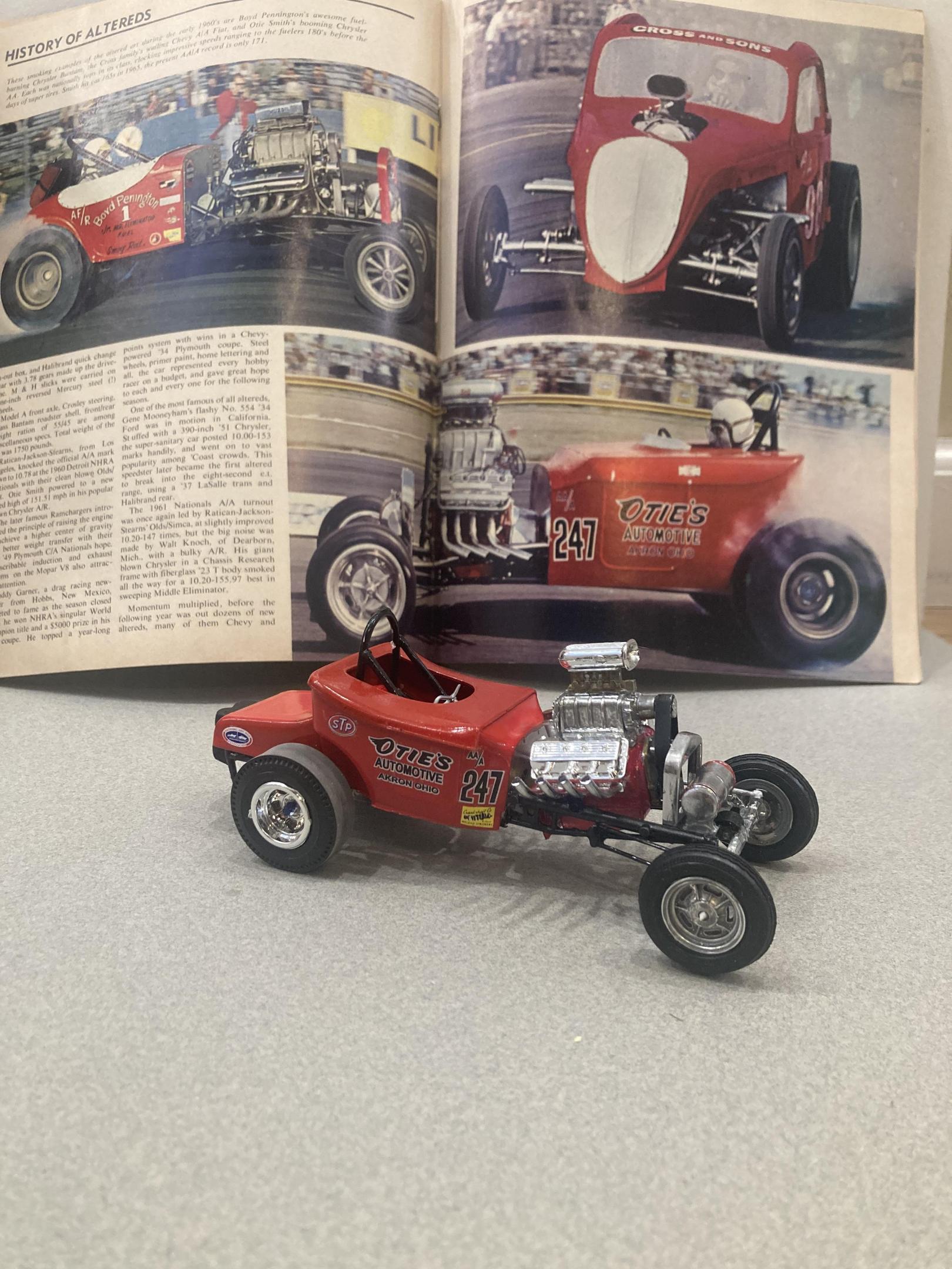 This is constructed from a mix of parts starting with the AMT T body parts pack. The frame is a combination of the double dragster fiat for the back half with front half of the single engine dragster frame. The front axle and spring are left overs from the Atlantis fiat. The roll bar hoop is made of 0.80 styrene rod. The 392 hemi is from the MPC bantam blast kit the headers are actually the hemi injector tubes from a couple of double dragster kits. The rear wheels are some left overs from the AMT 40 Willy’s kit with AMT pie crust slicks. The front wheels are from the MPC Winged Express warped with some spare AMT hollow Firestone supremes . The red paint on the bucket is Testors red enamel with wet look clear. The Tuanna cover is painted with a Krylon red to get a slight contrast. The decals are available from Chris Walsh . I did add the NHRA , and the welded strokers crankshaft decals from a random Slixx sheet. The reference photo is from an early 70’s issue of DRAG RACING USA. Until next time thanks for looking. Mike