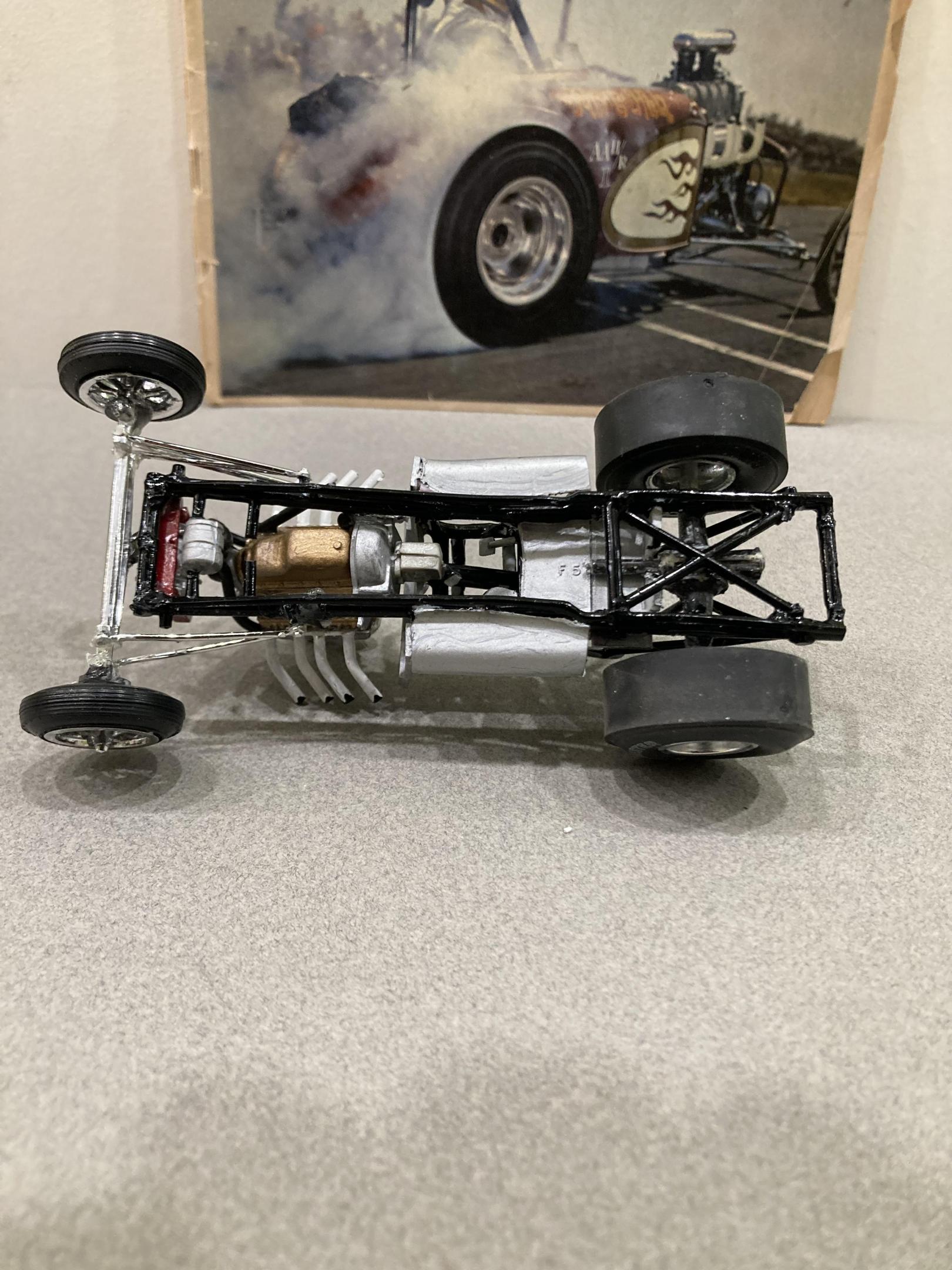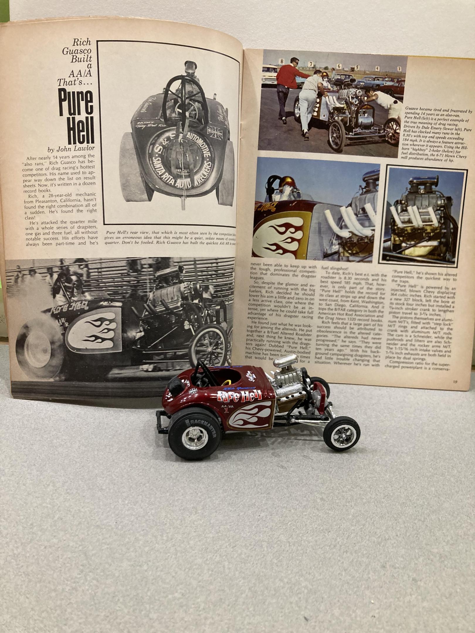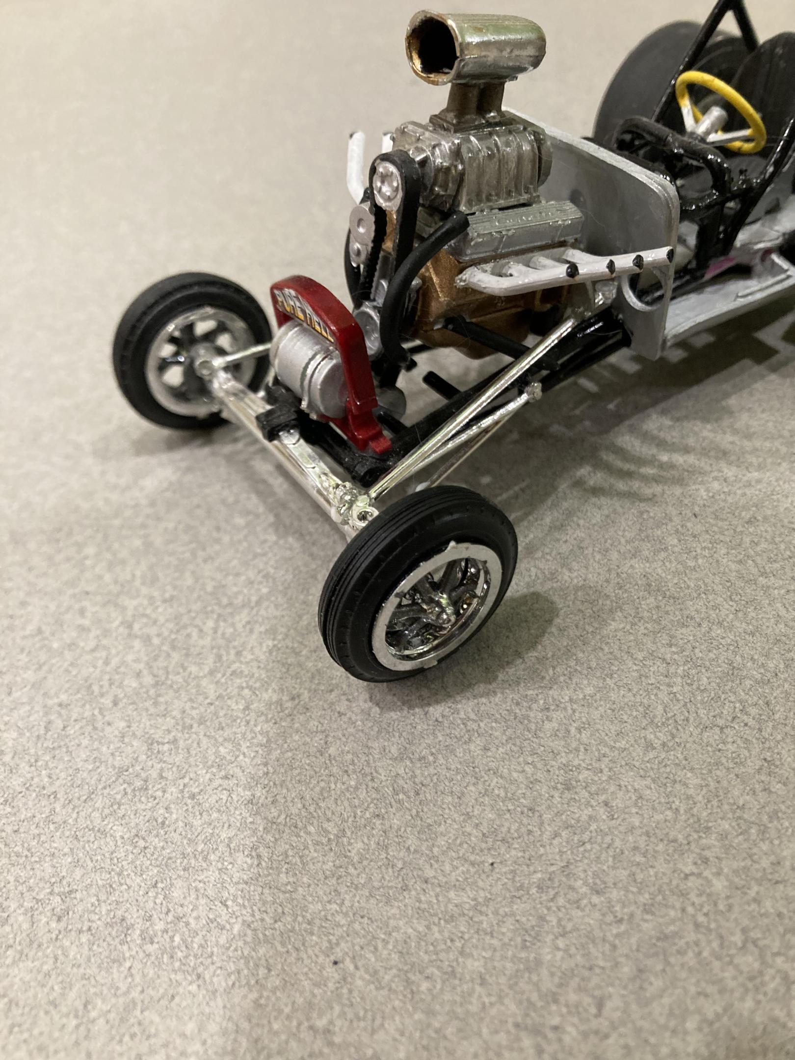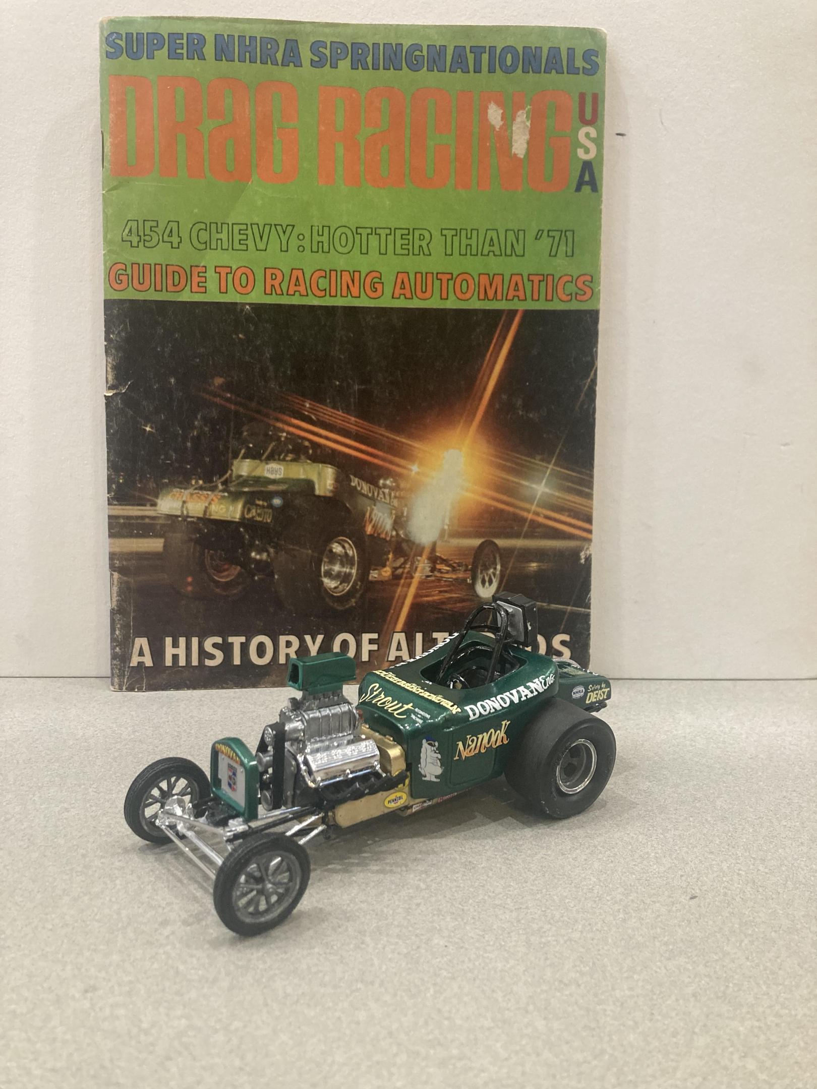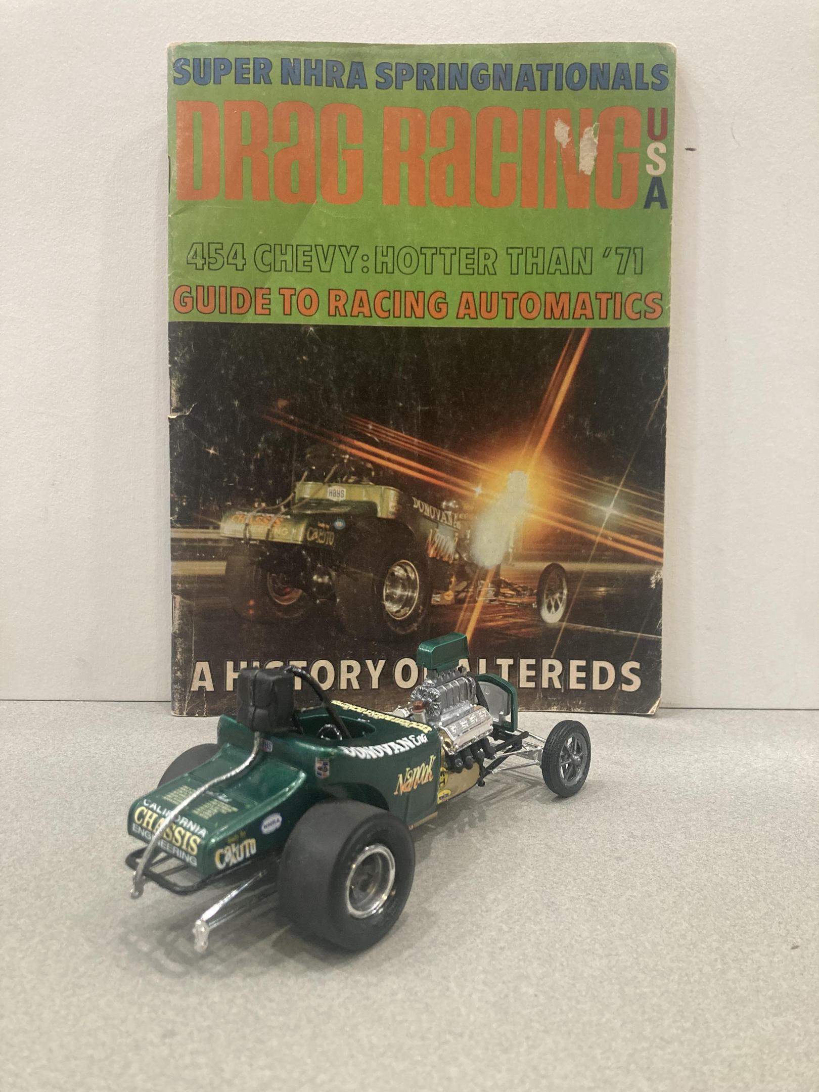 This is constructed from a mix of parts starting with the AMT T body parts pack. The frame is a combination of the double dragster fiat for the back half with front half of the single engine dragster frame. The front axle and spring are left overs from the Atlantis fiat. The roll bar hoop is made of 0.80 styrene rod. The 392 hemi is from the MPC bantam blast kit the headers are actually the hemi injector tubes from a couple of double dragster kits. The rear wheels are some left overs from the AMT 40 Willy’s kit with AMT pie crust slicks. The front wheels are from the MPC Winged Express warped with some spare AMT hollow Firestone supremes . The red paint on the bucket is Testors red enamel with wet look clear. The Tuanna cover is painted with a Krylon red to get a slight contrast. The decals are available from Chris Walsh . I did add the NHRA , and the welded strokers crankshaft decals from a random Slixx sheet. The reference photo is from an early 70’s issue of DRAG RACING USA. Until next time thanks for looking. Mike