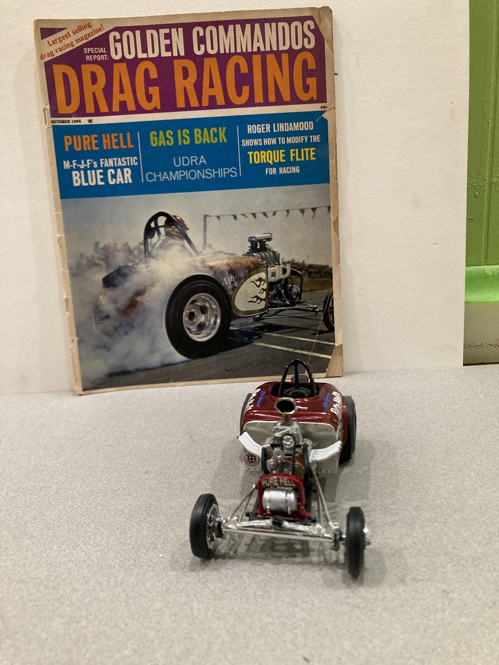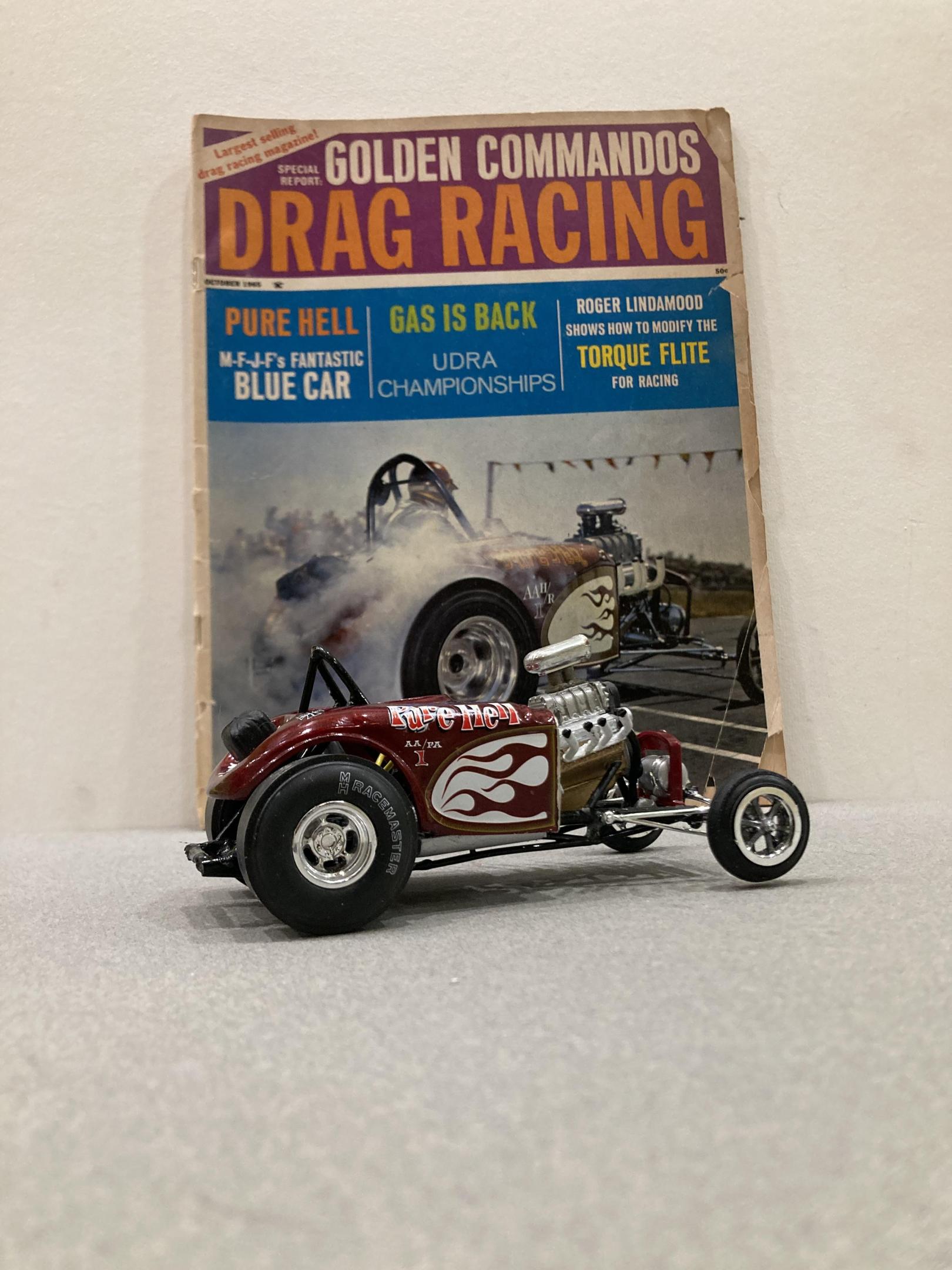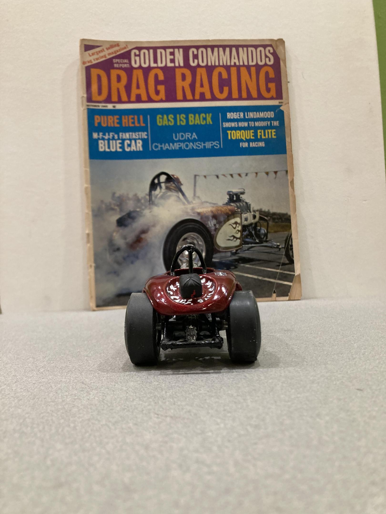 This one’s a combination of parts from The AMT double dragster and a body from the MPC bantam blast. The big slicks are from the AMT parts pack. The double dragster frame was modified to fit the bantam body shell. The long block is also double dragster with the blower pieces coming from my parts box. It’s painted with testors metallic red topped with slixx decals. This issue of DRAG RACING MAGAZINE has great reference photos with a good article about this car it also is a great reference for the GOLDEN COMMANDOS awb 65 Plymouth. Until next time thanks for looking . Mike