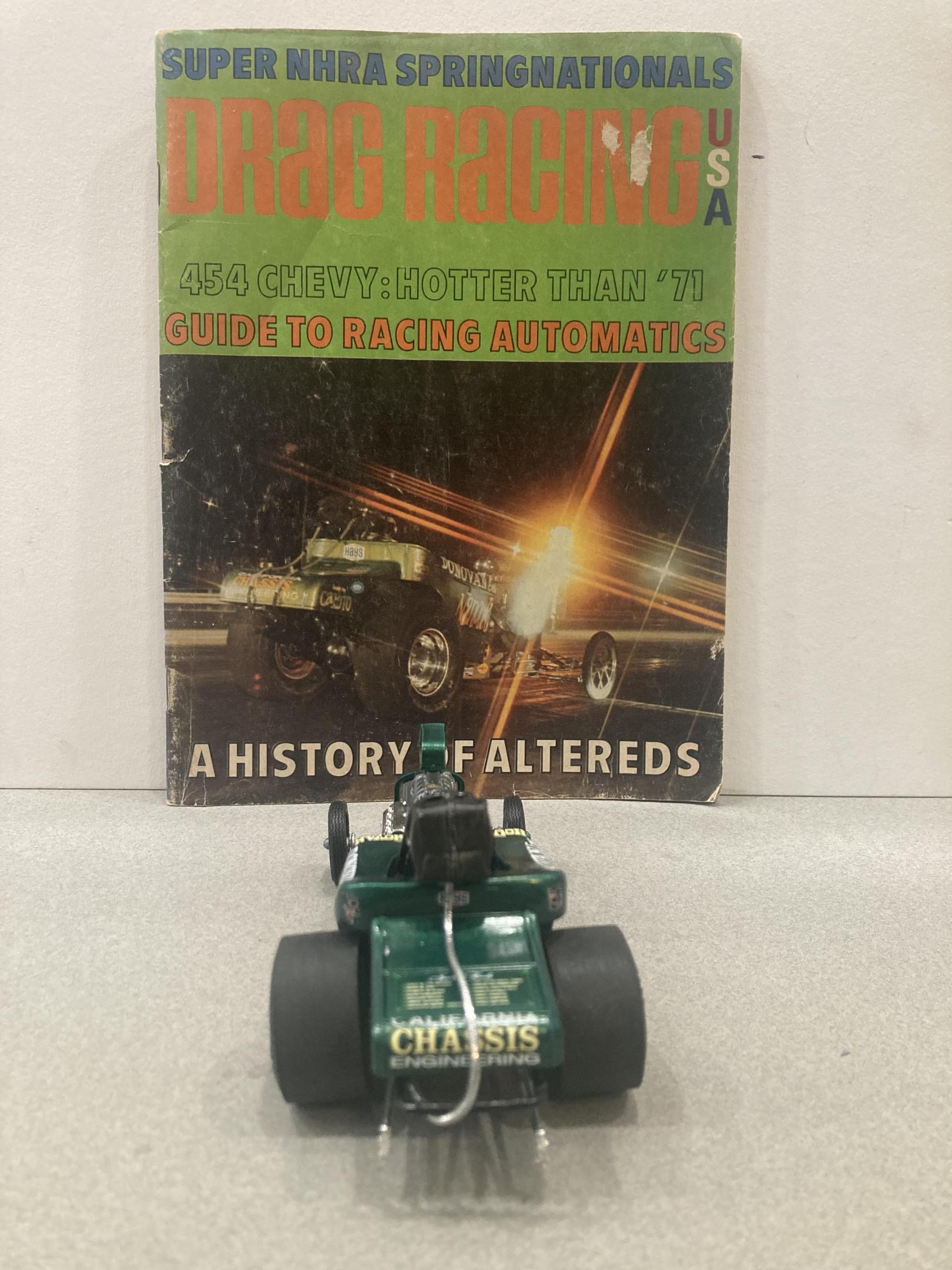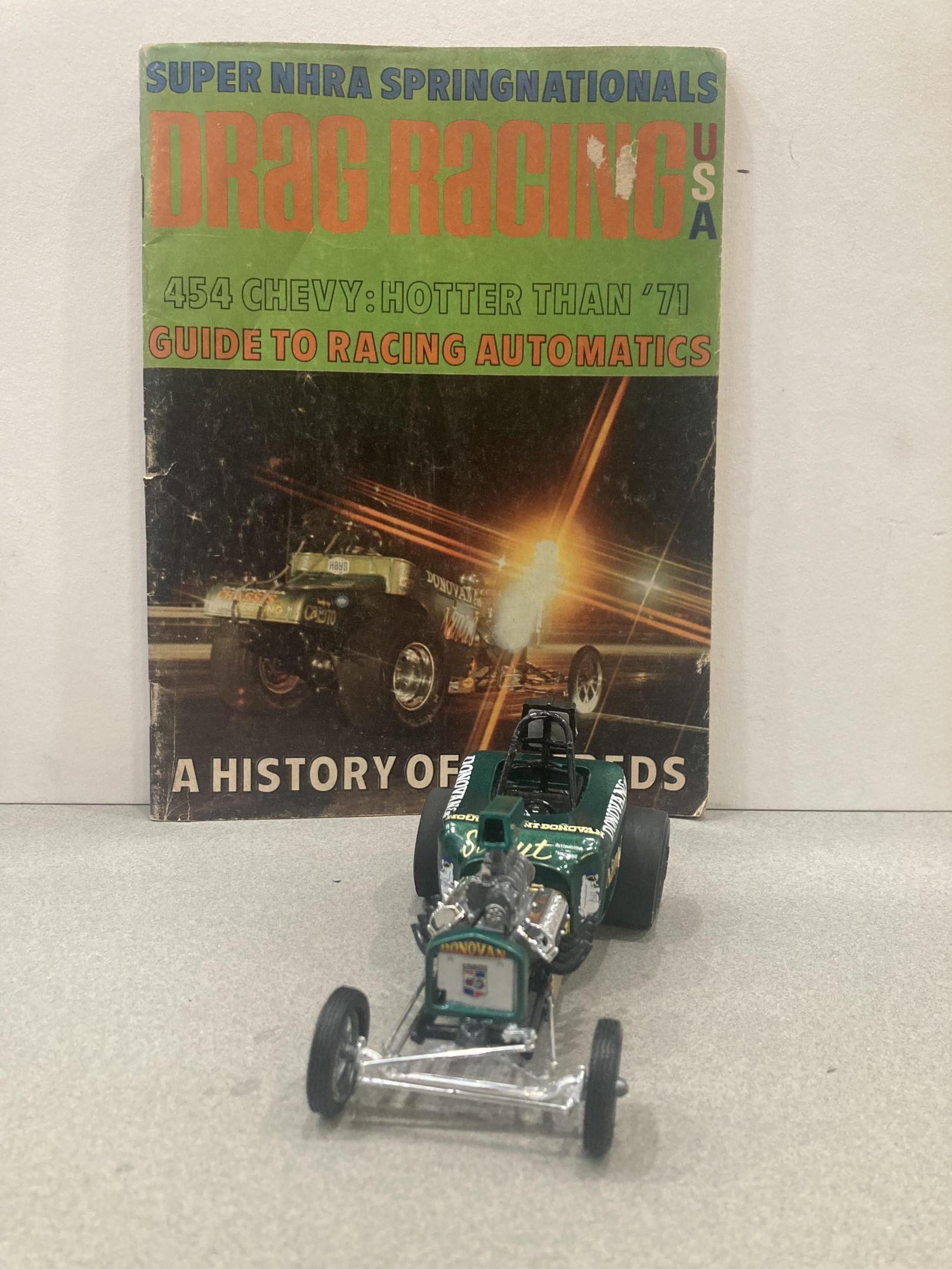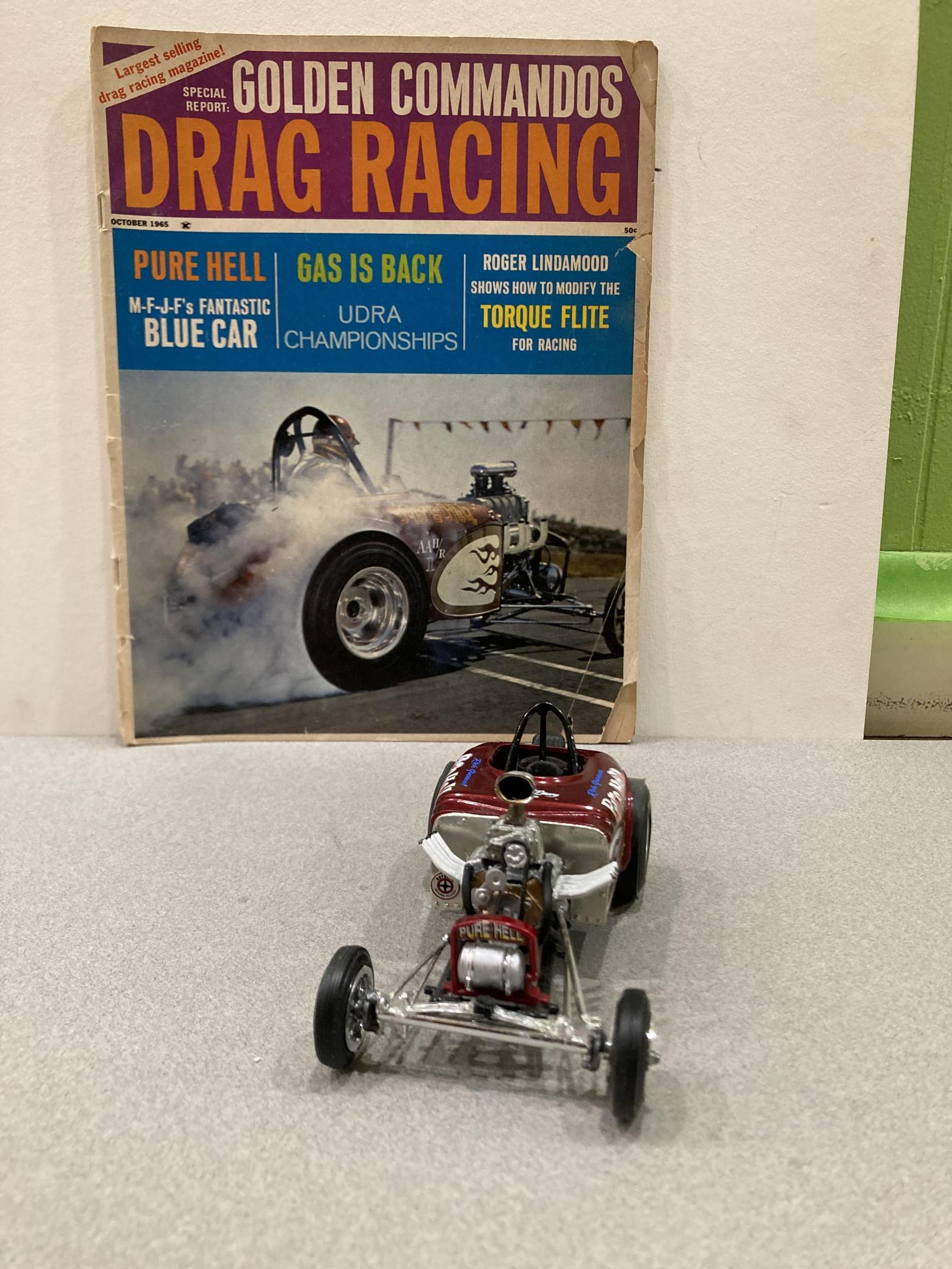 This one’s a combination of parts from The AMT double dragster and a body from the MPC bantam blast. The big slicks are from the AMT parts pack. The double dragster frame was modified to fit the bantam body shell. The long block is also double dragster with the blower pieces coming from my parts box. It’s painted with testors metallic red topped with slixx decals. This issue of DRAG RACING MAGAZINE has great reference photos with a good article about this car it also is a great reference for the GOLDEN COMMANDOS awb 65 Plymouth. Until next time thanks for looking . Mike